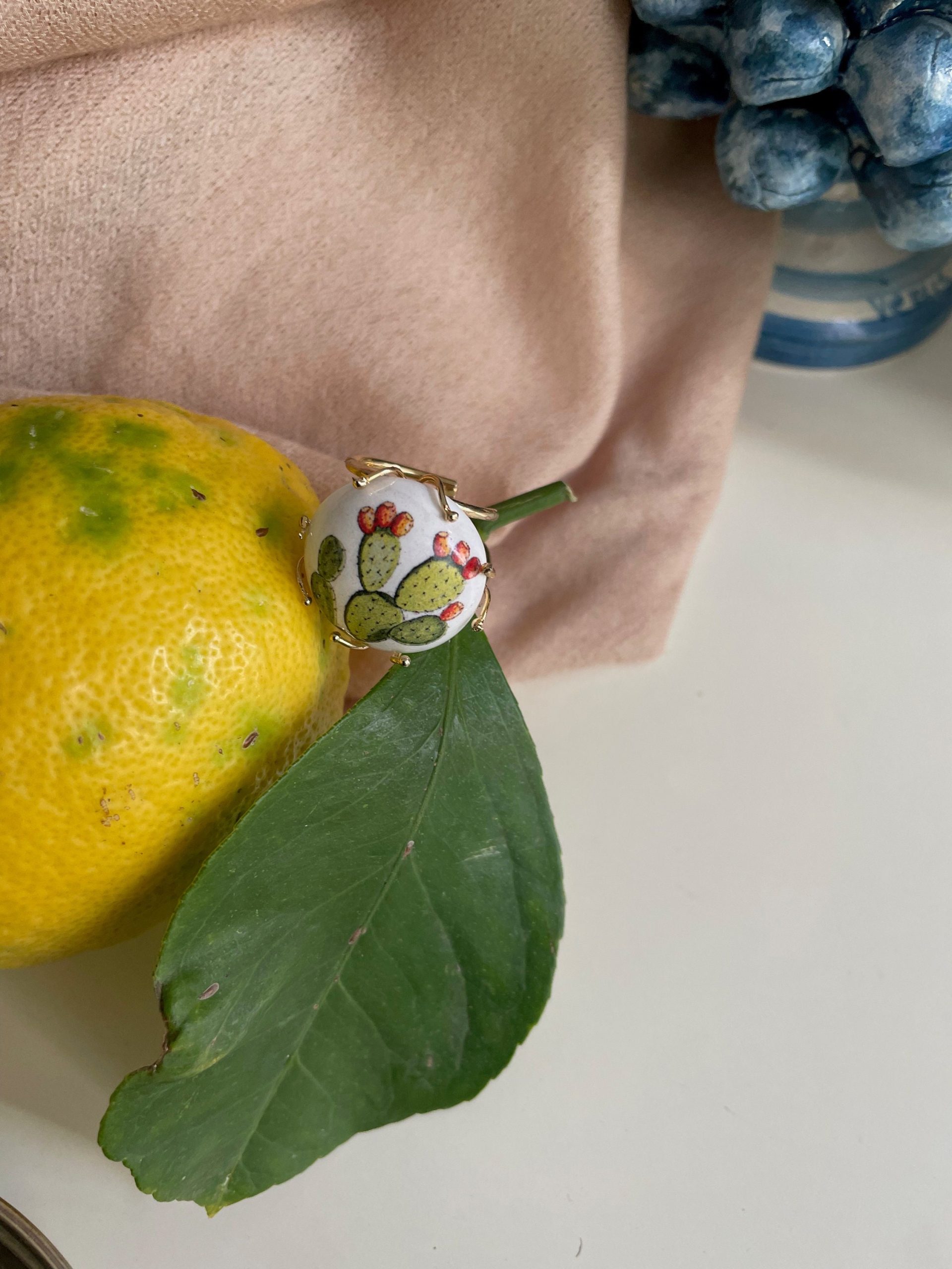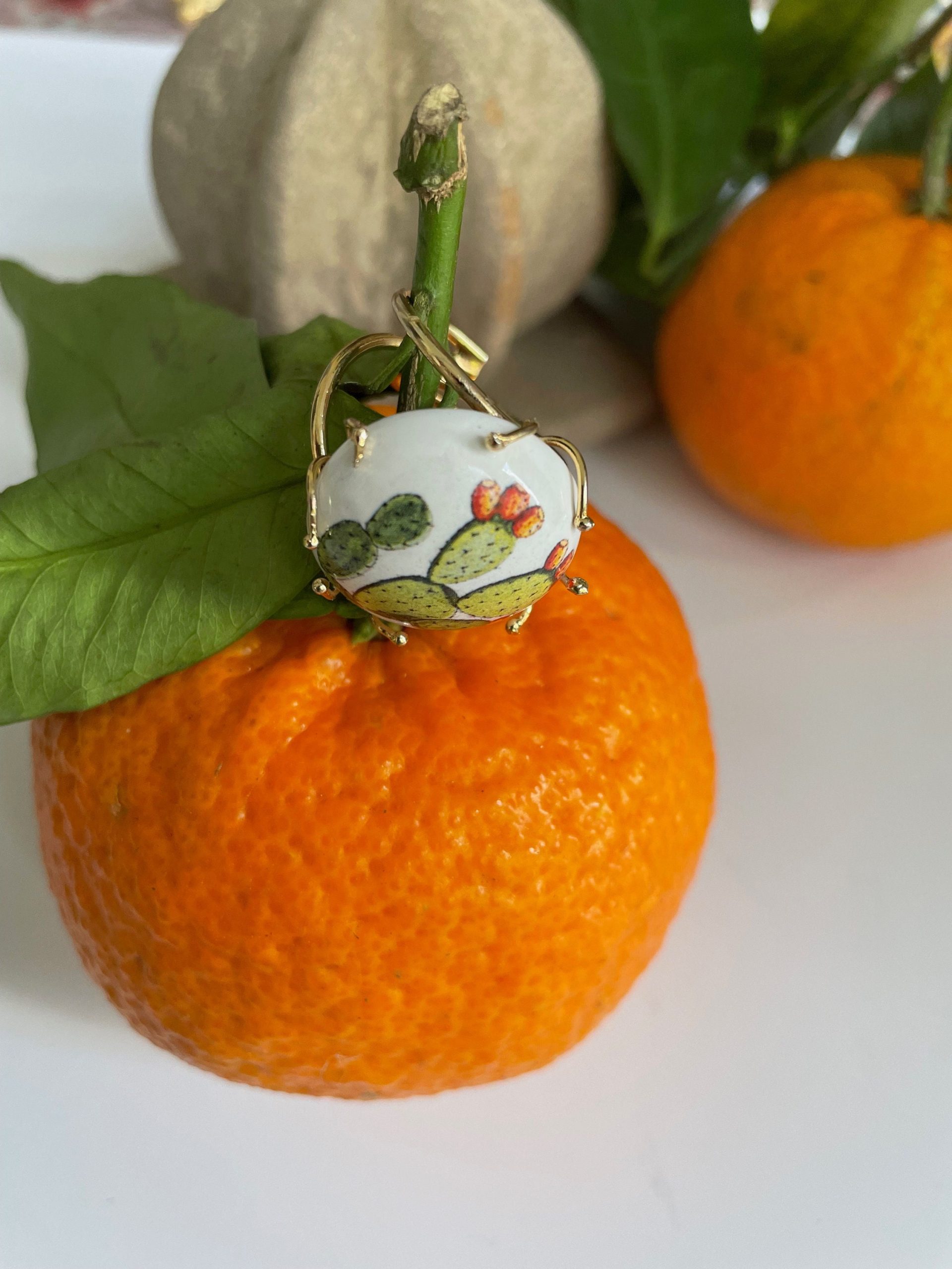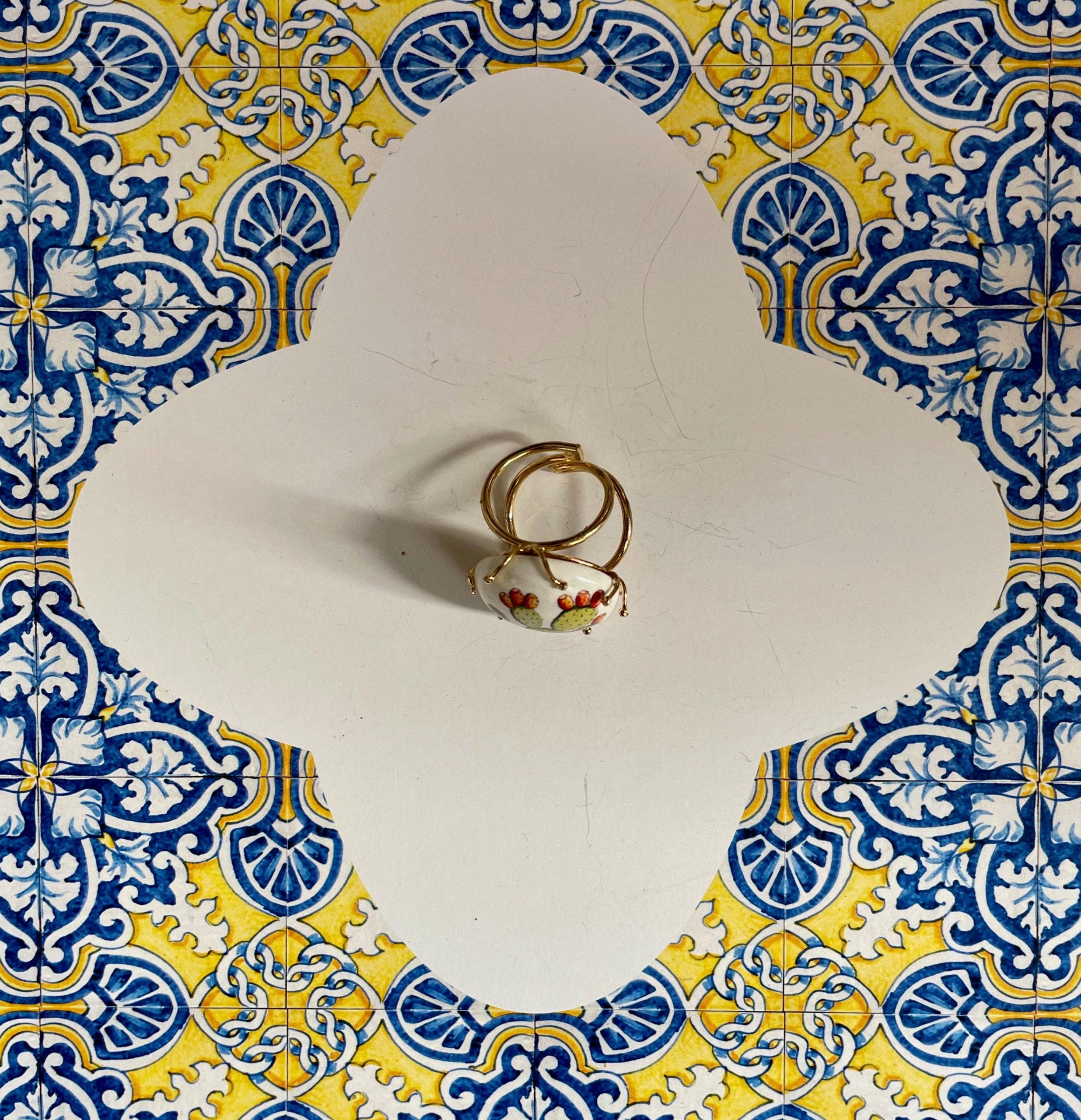 Composto da struttura in Argento 925, regolabile, e piastrella tonda e bombata in ceramica di Caltagirone, dipinta a mano, con motivo Fico d’India, simbolo della bellissima Sicilia!