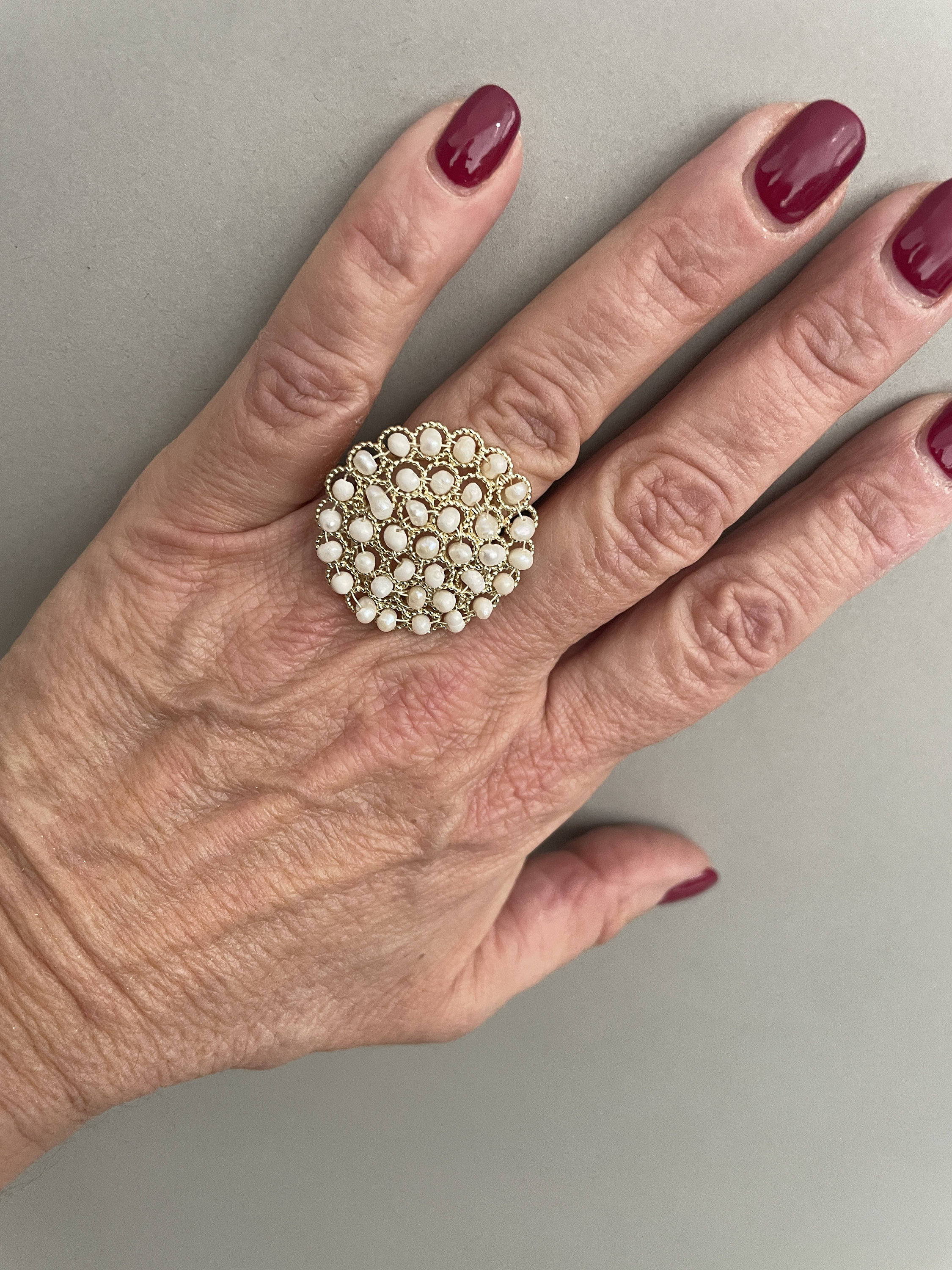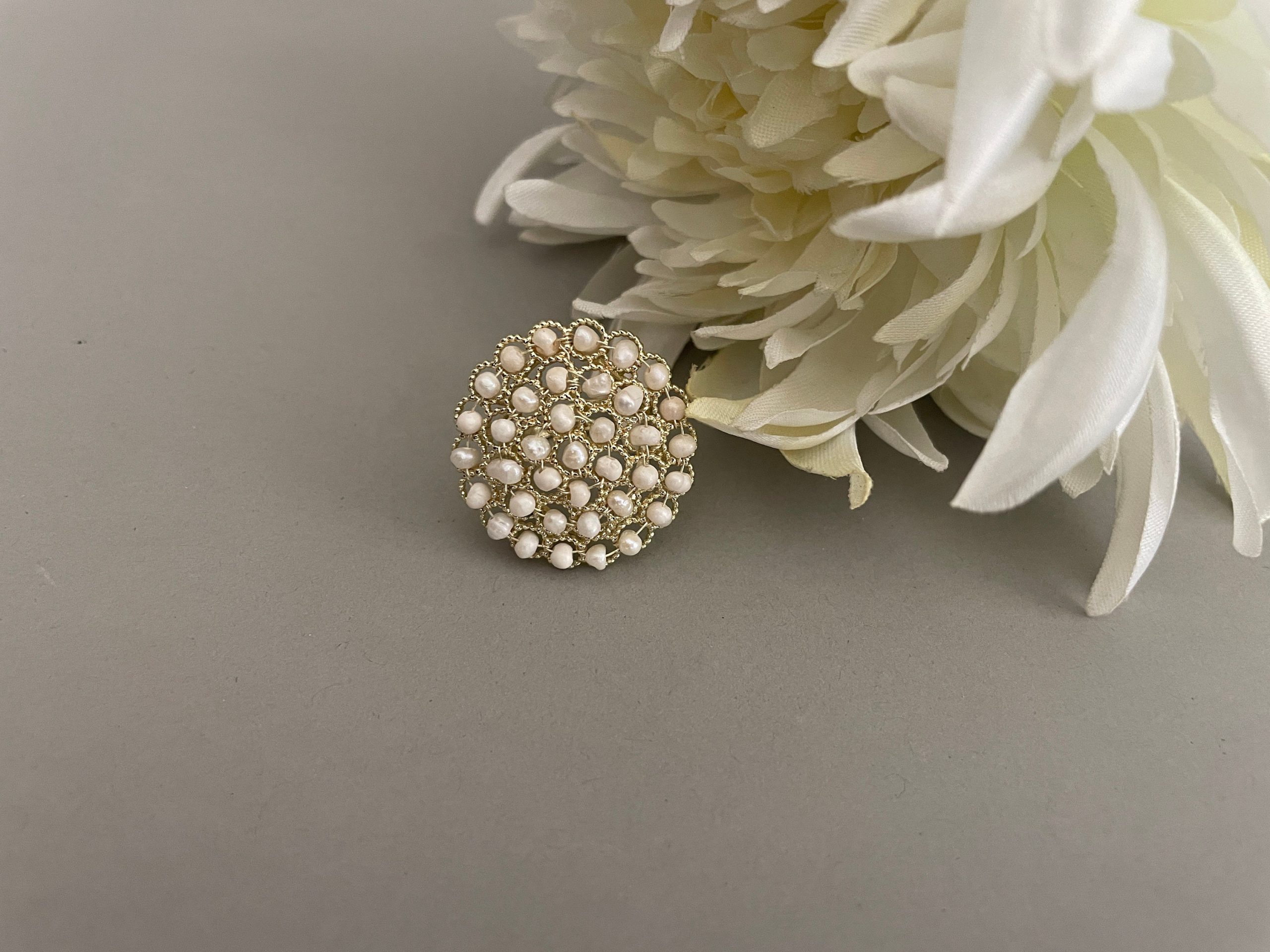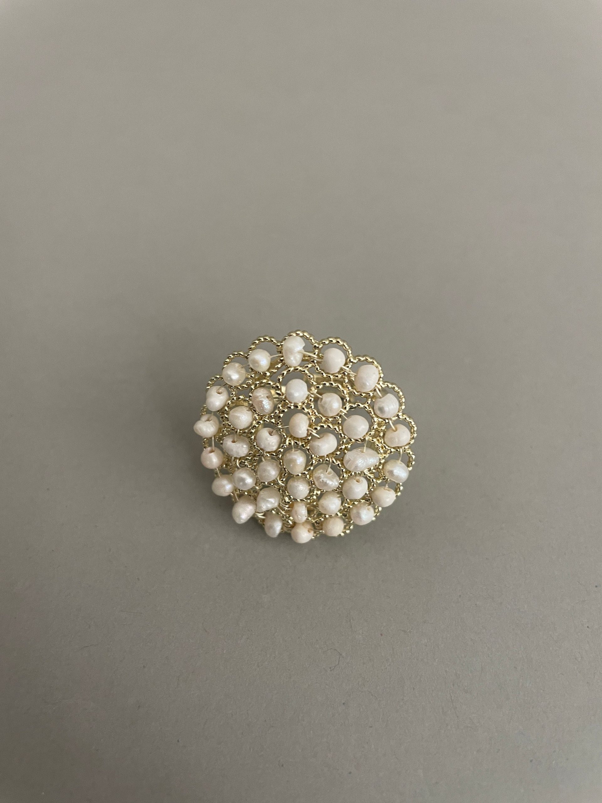 Una piastra tonda in filigrana di ottone dorato montata su una struttura di ottone dal sapore vintage e tempestata di piccole perle di fiume.