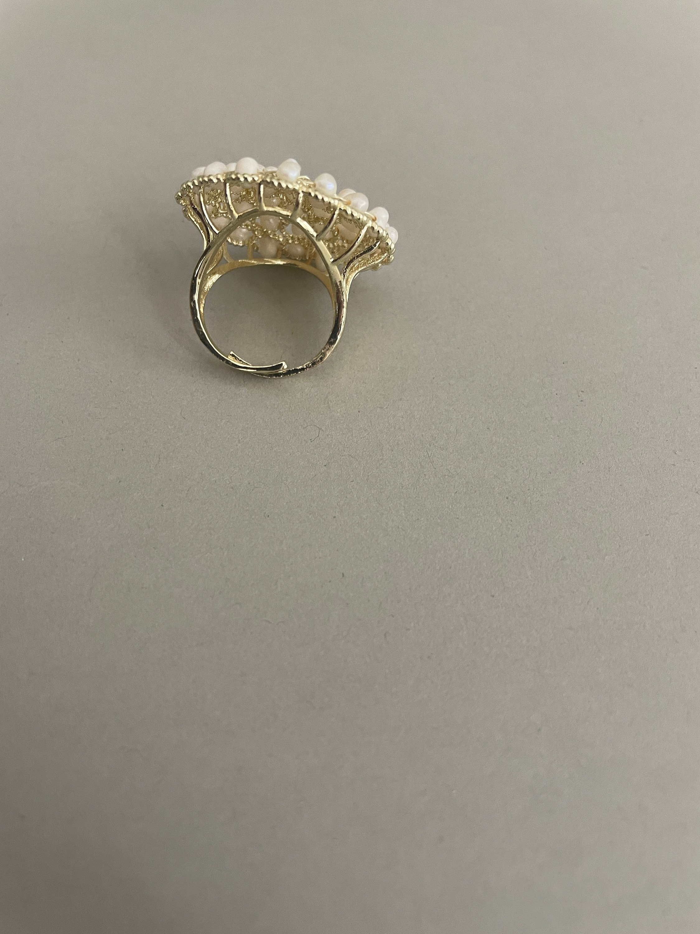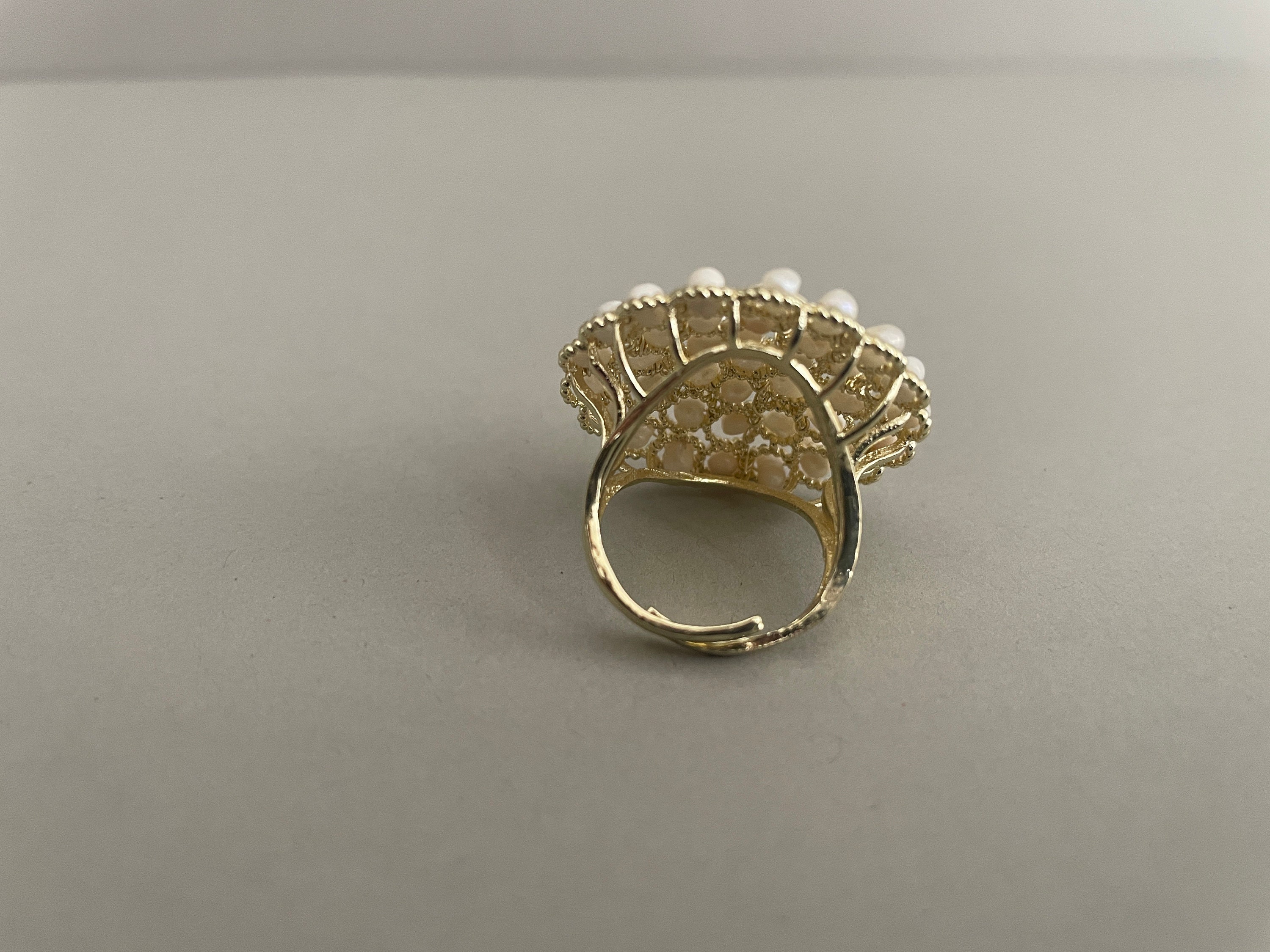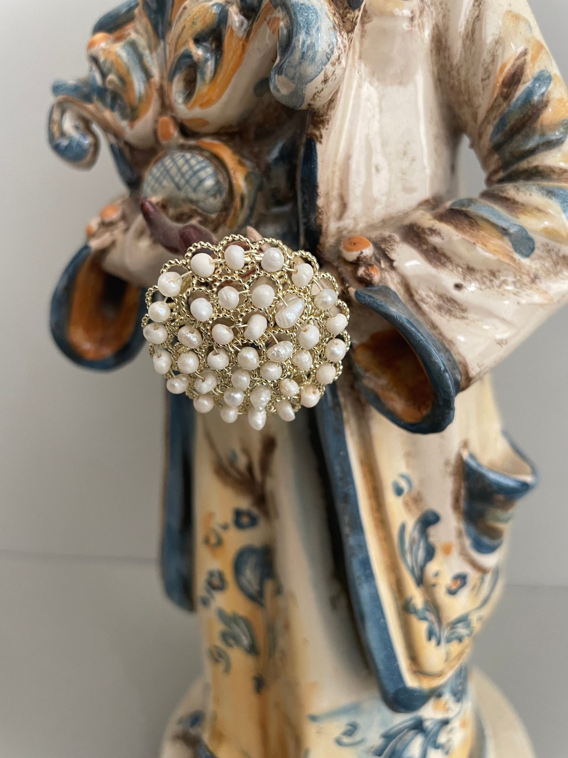 Una piastra tonda in filigrana di ottone dorato montata su una struttura di ottone dal sapore vintage e tempestata di piccole perle di fiume.