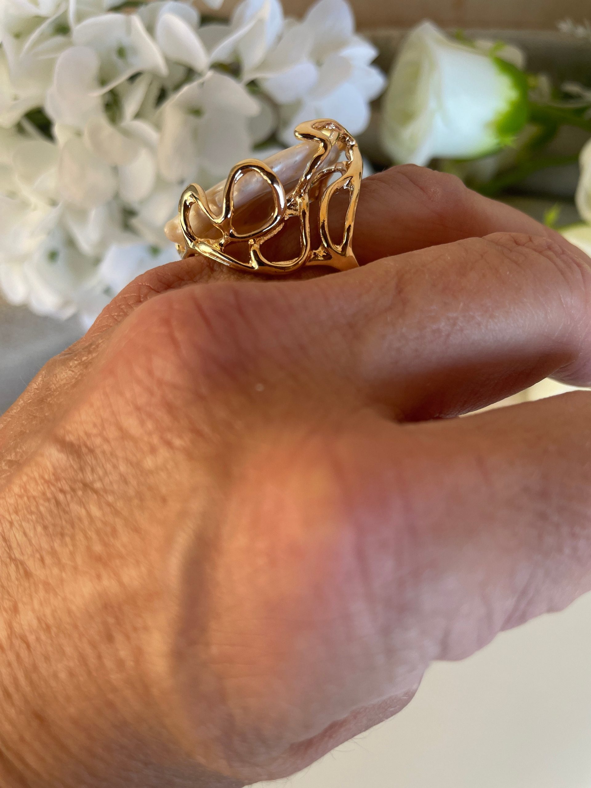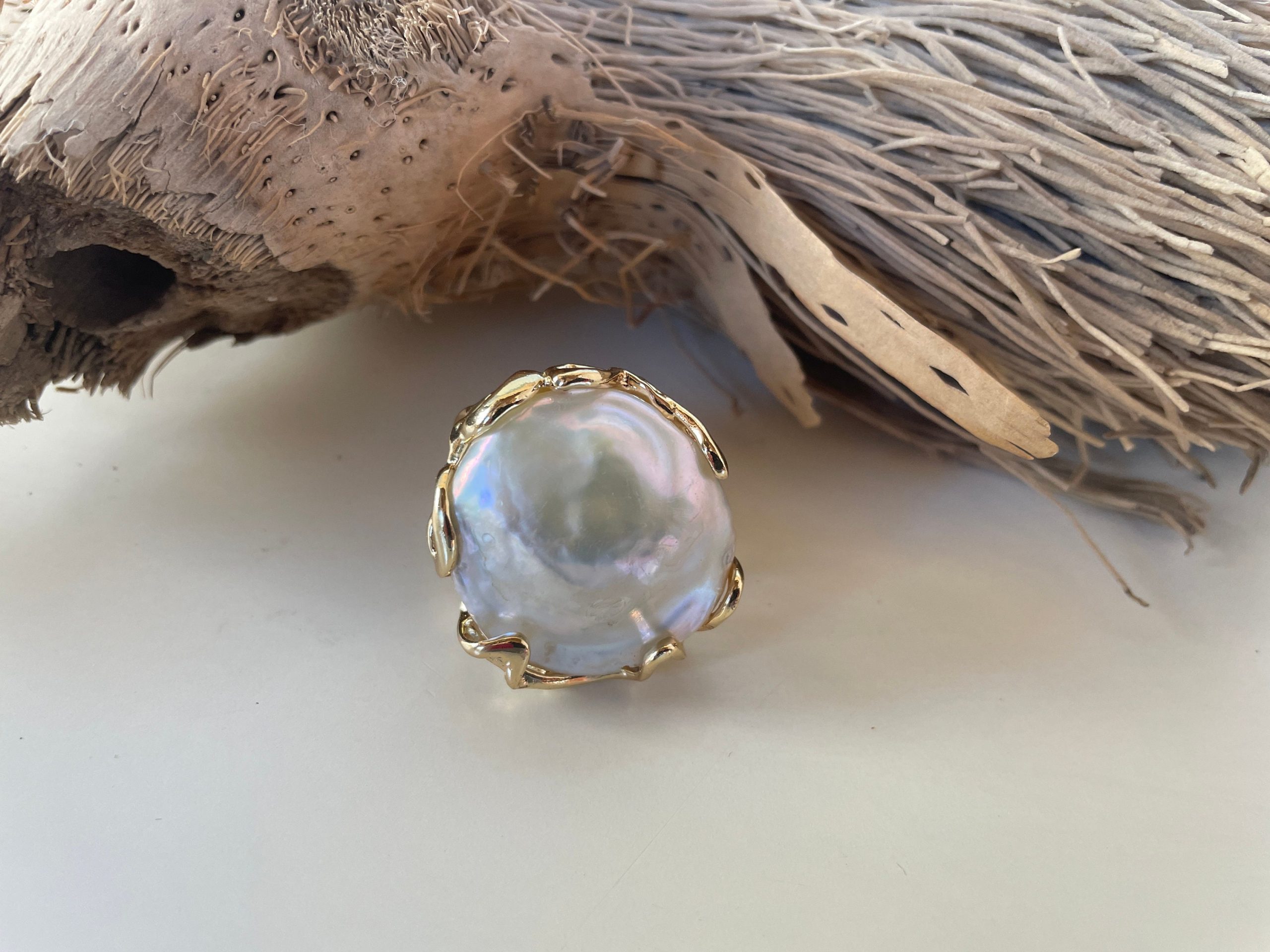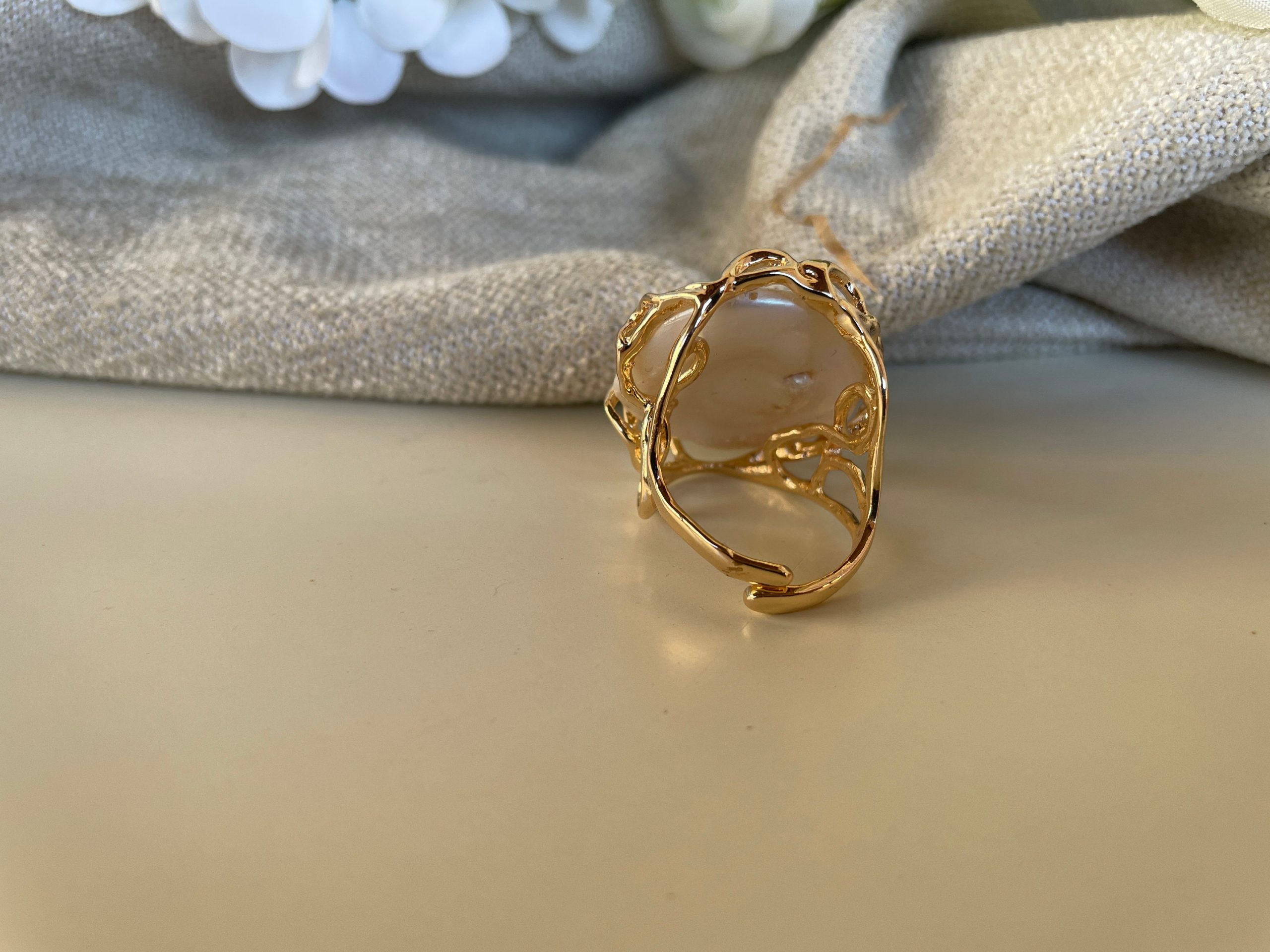 Una bella e solida struttura regolabile in ottone dorato all’interno della quale è incastonata una grande perla barocche naturale dalla forma tonda e piatta.