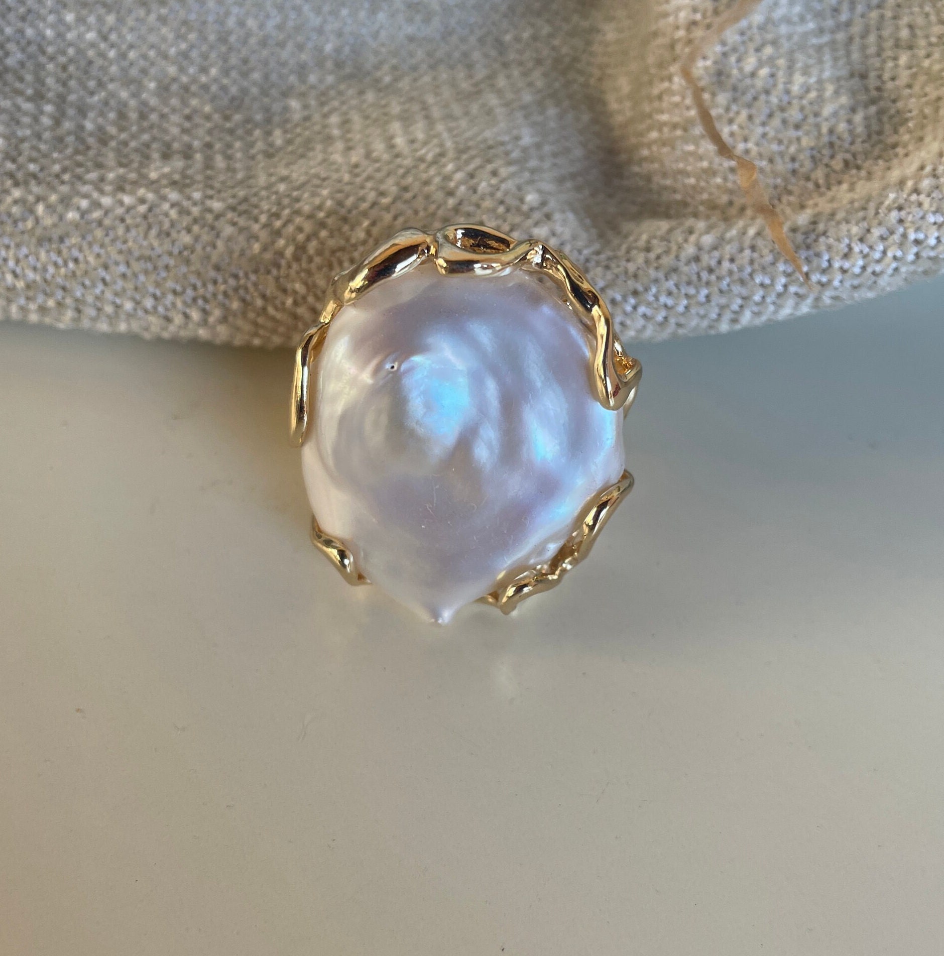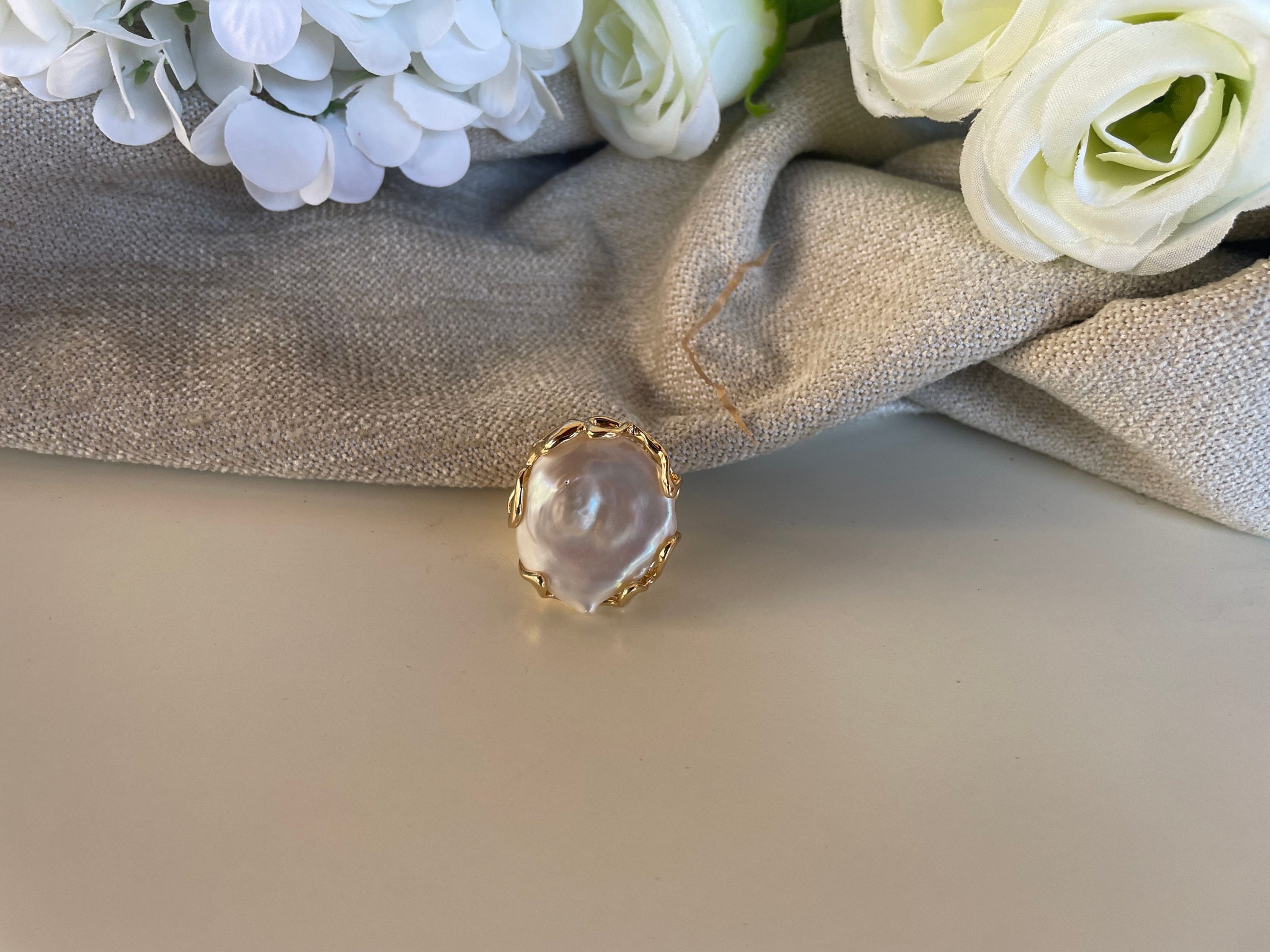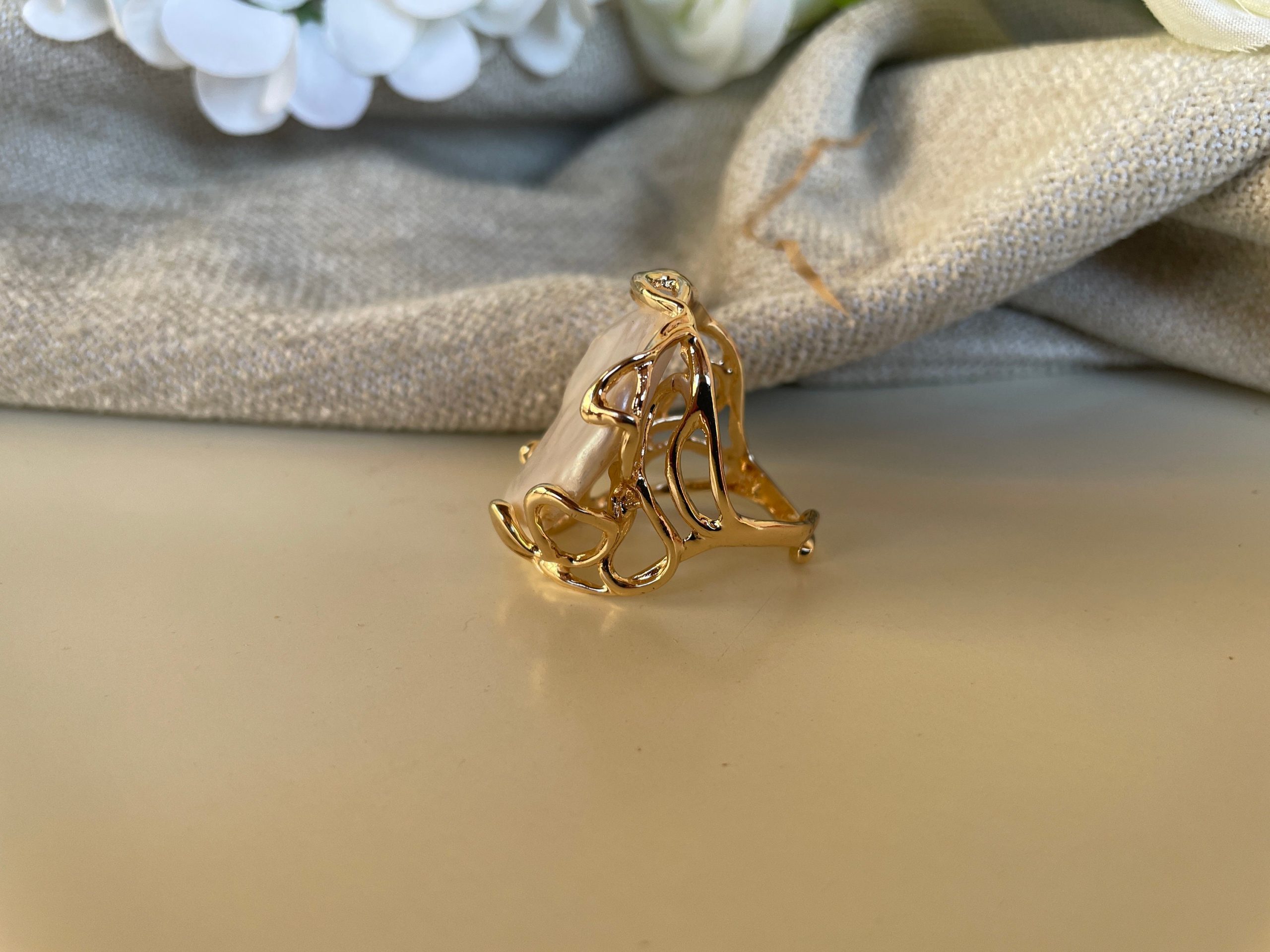 Una bella e solida struttura regolabile in ottone dorato all’interno della quale è incastonata una grande perla barocche naturale dalla forma tonda e piatta.