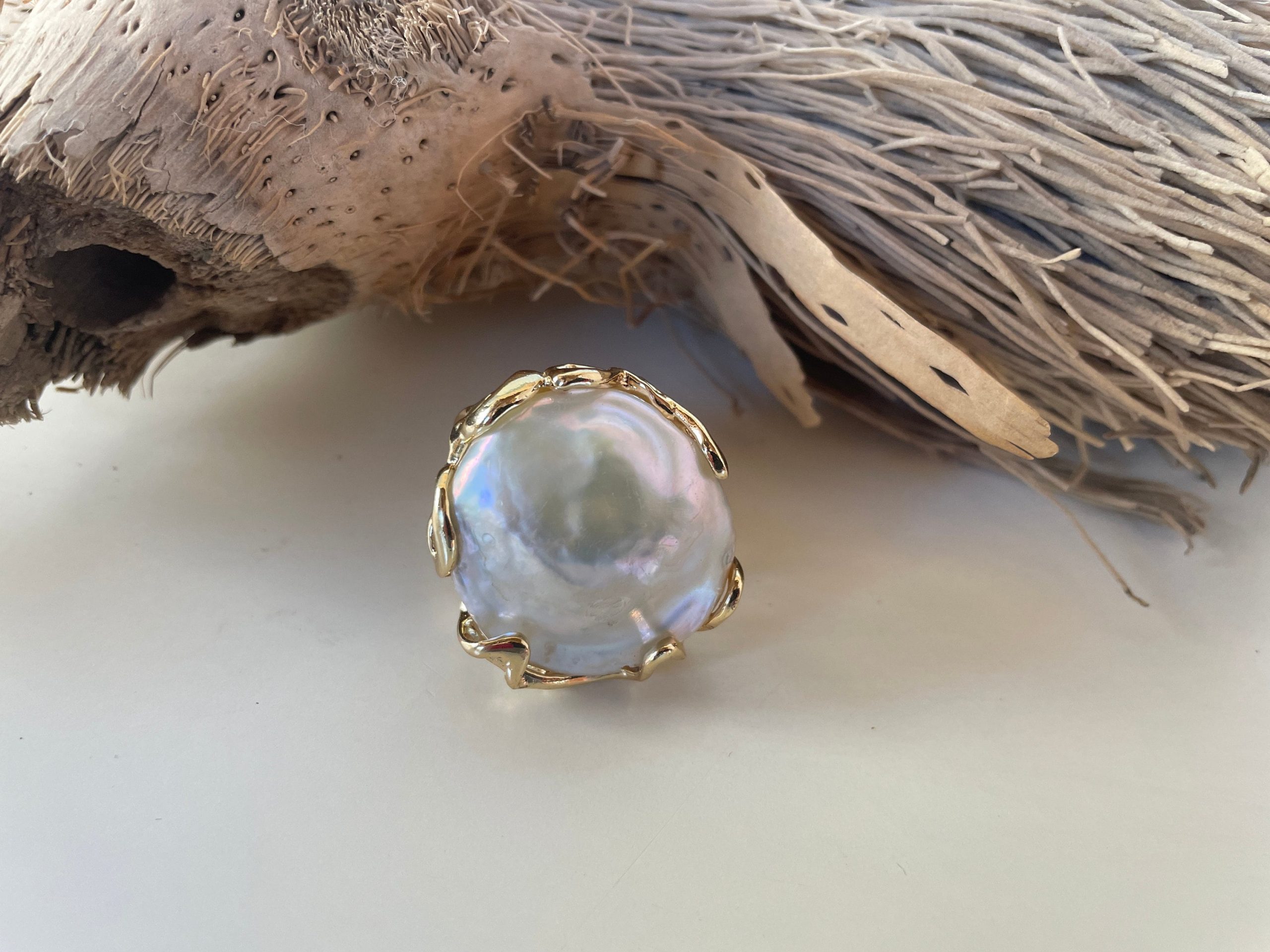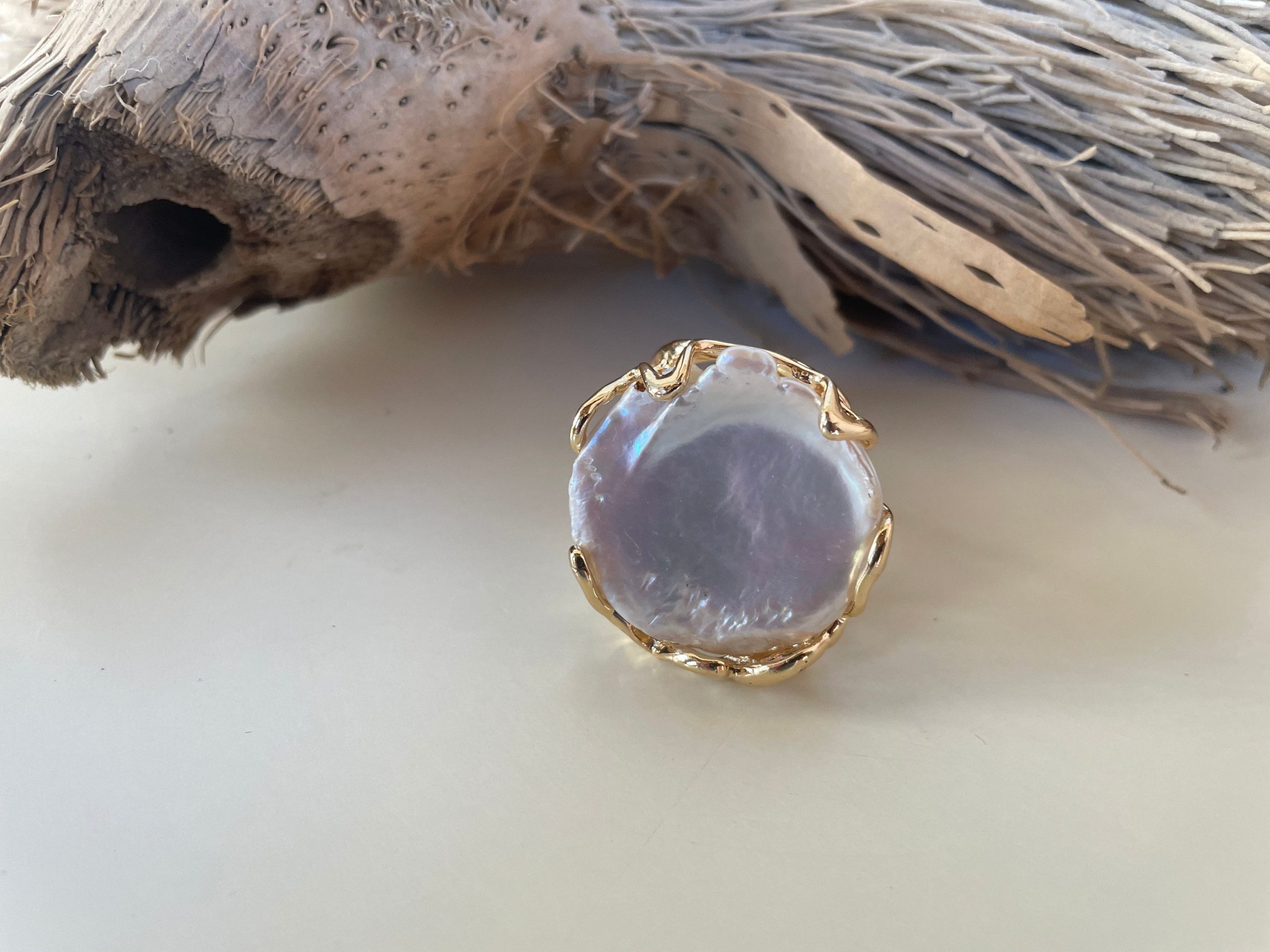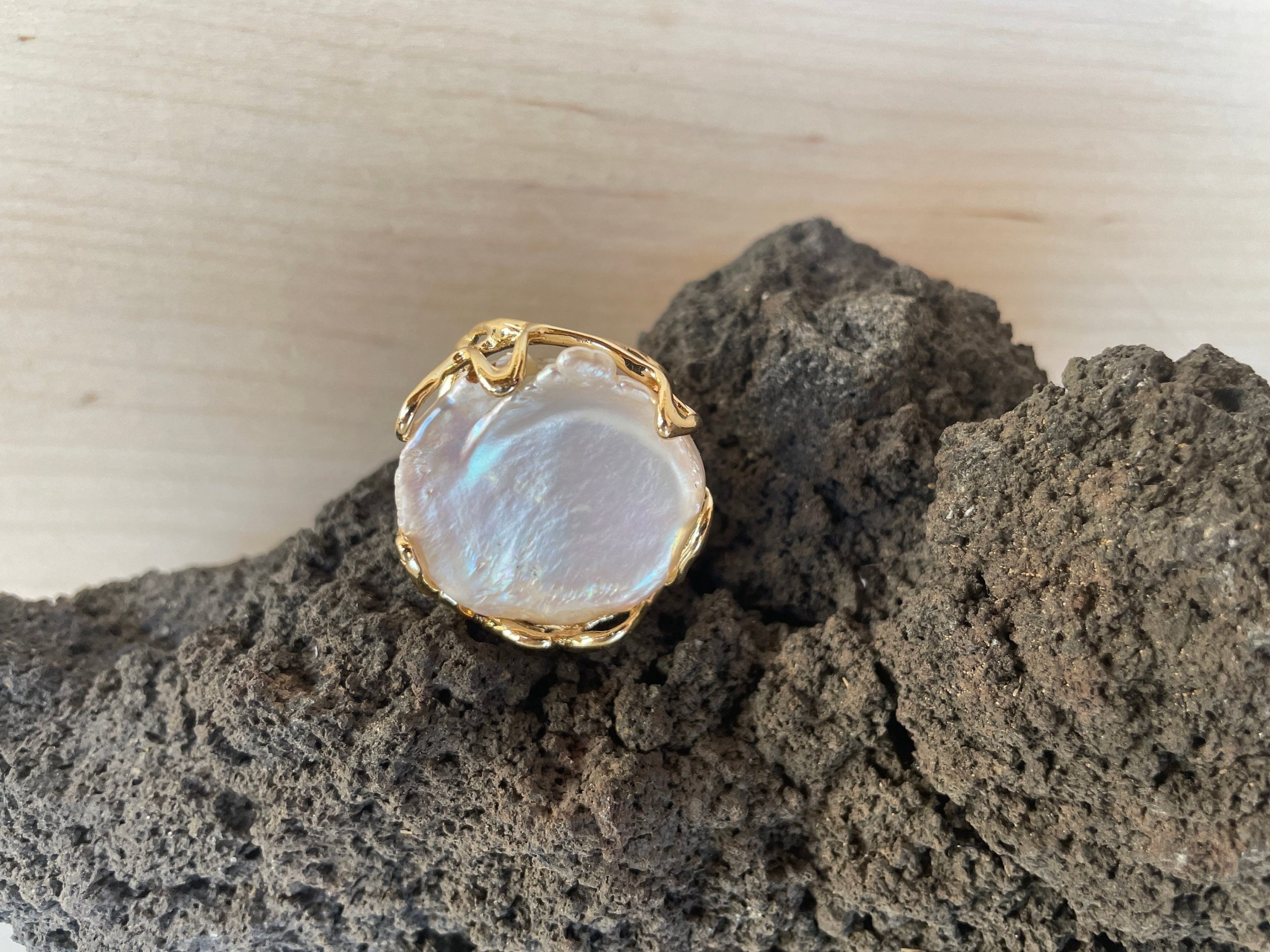 Anello maxi con grande perla barocca piatta e tonda, anello regolabile con struttura in ottone.