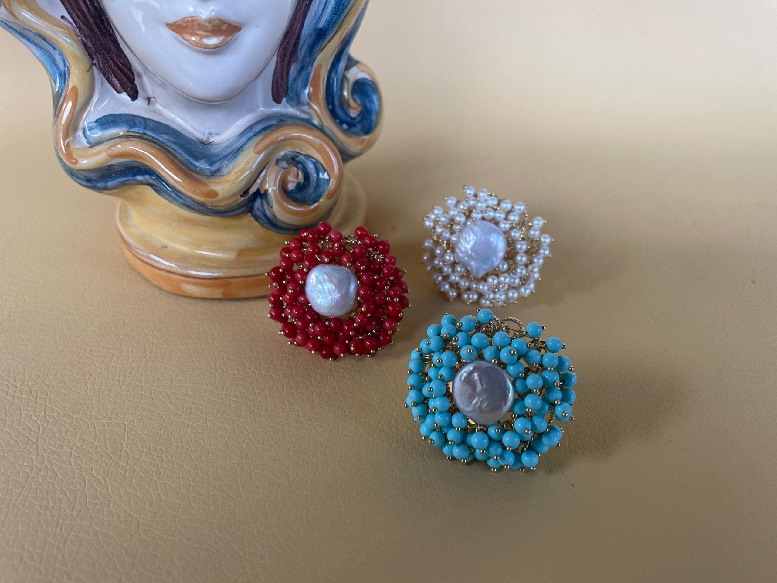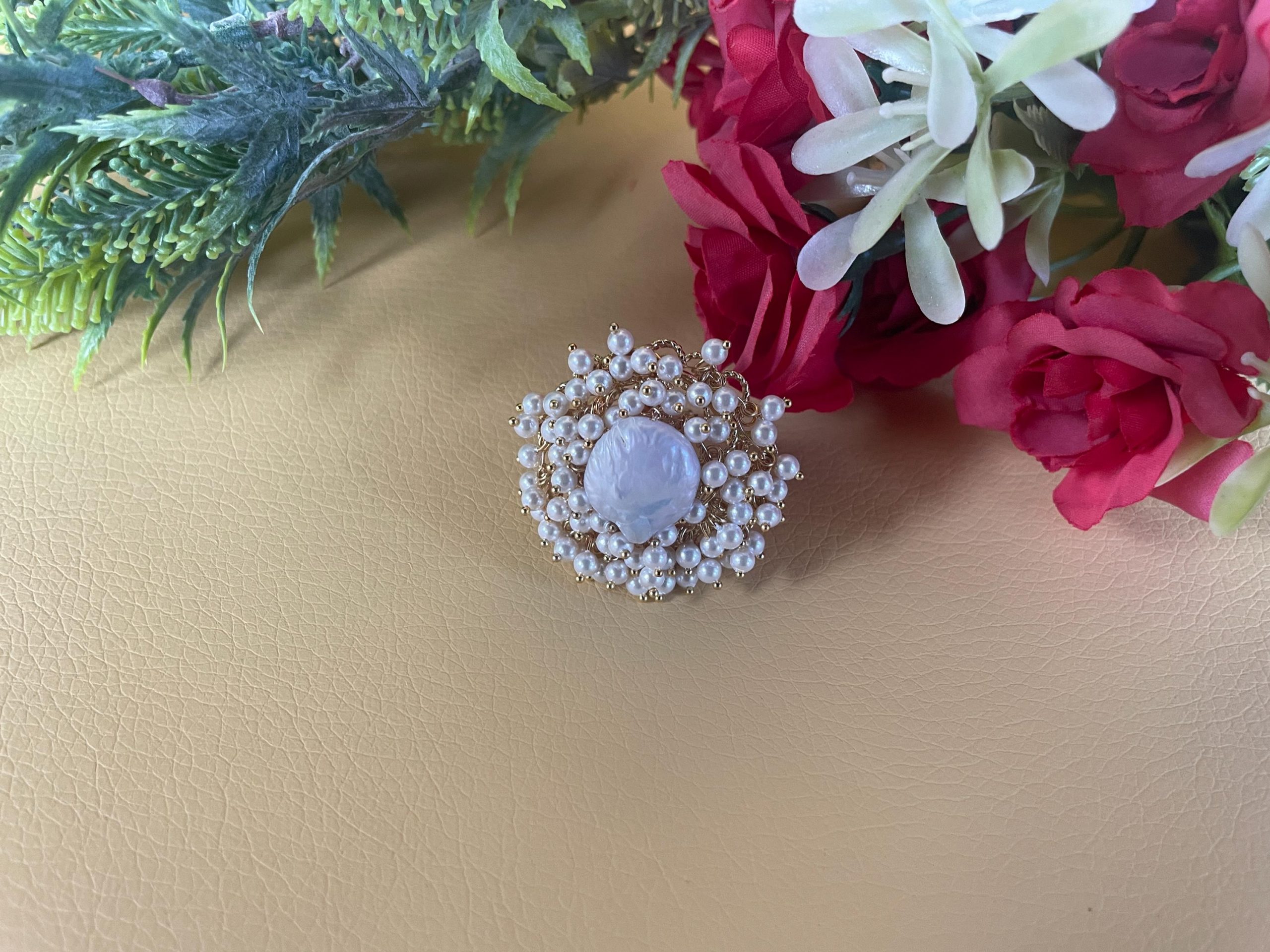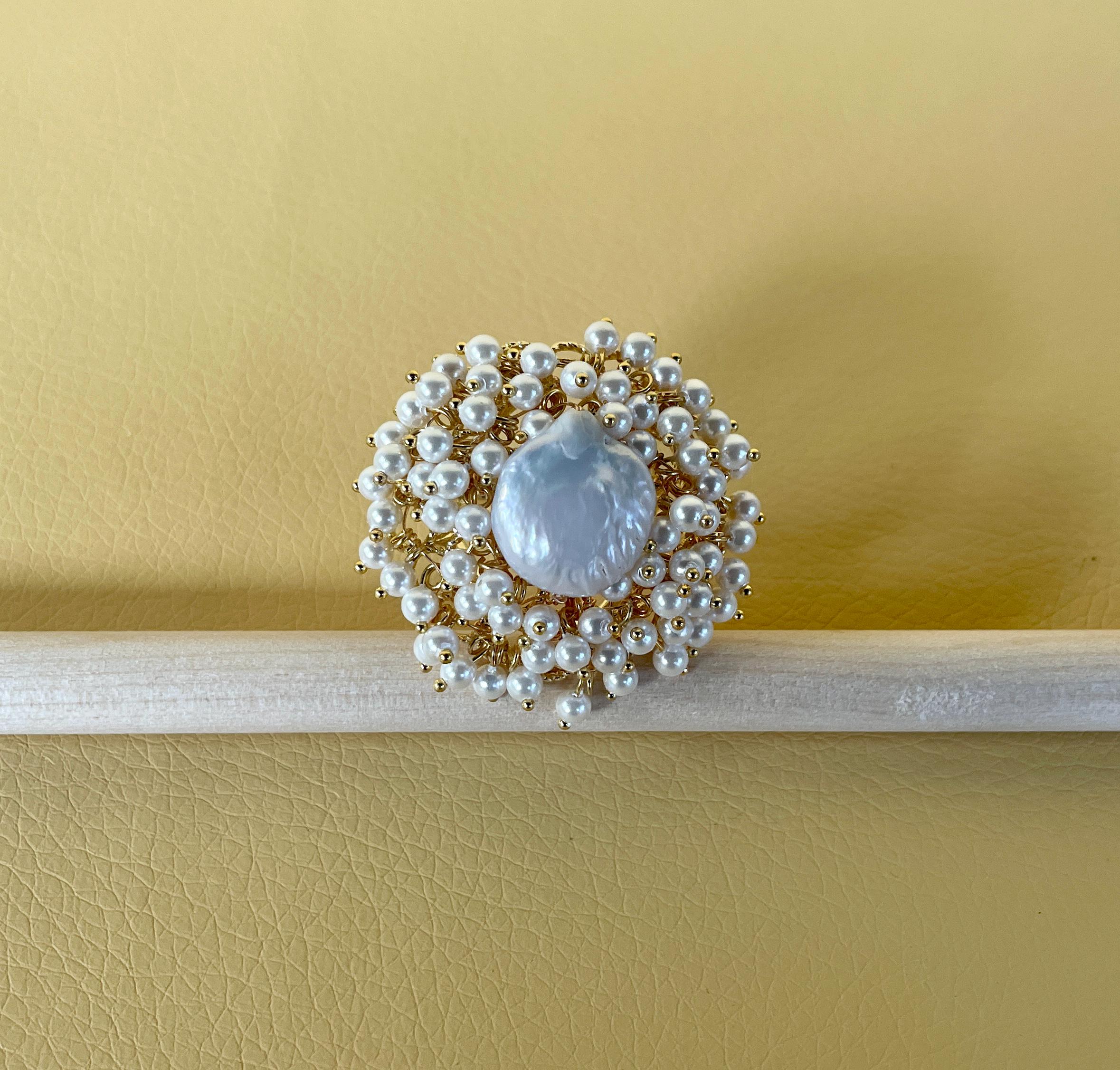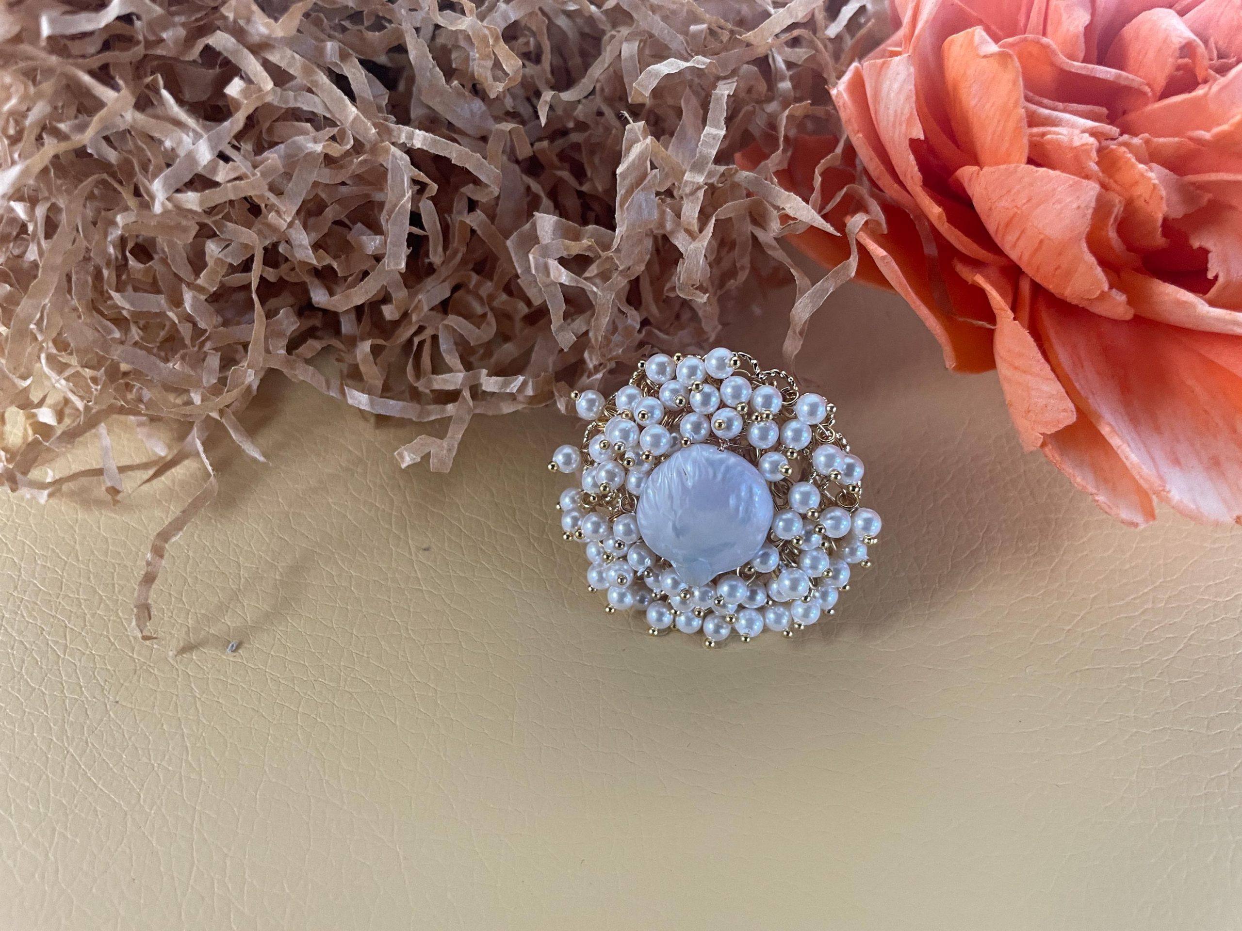 Su di essa vi è montata una perla naturale centrale a moneta intorno alla quale sono distribuite tante microperle bianche.