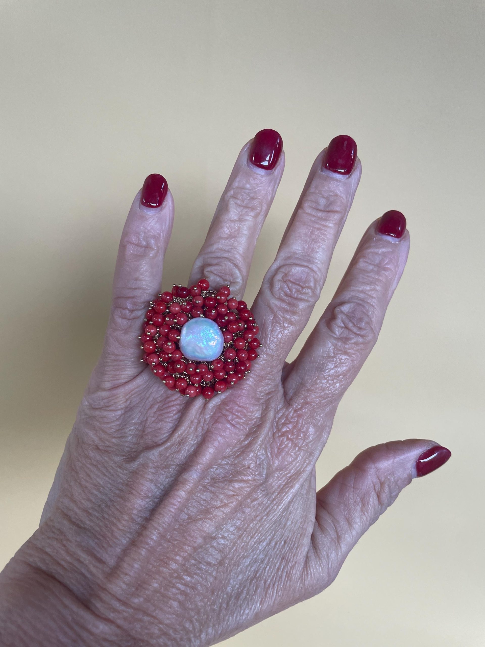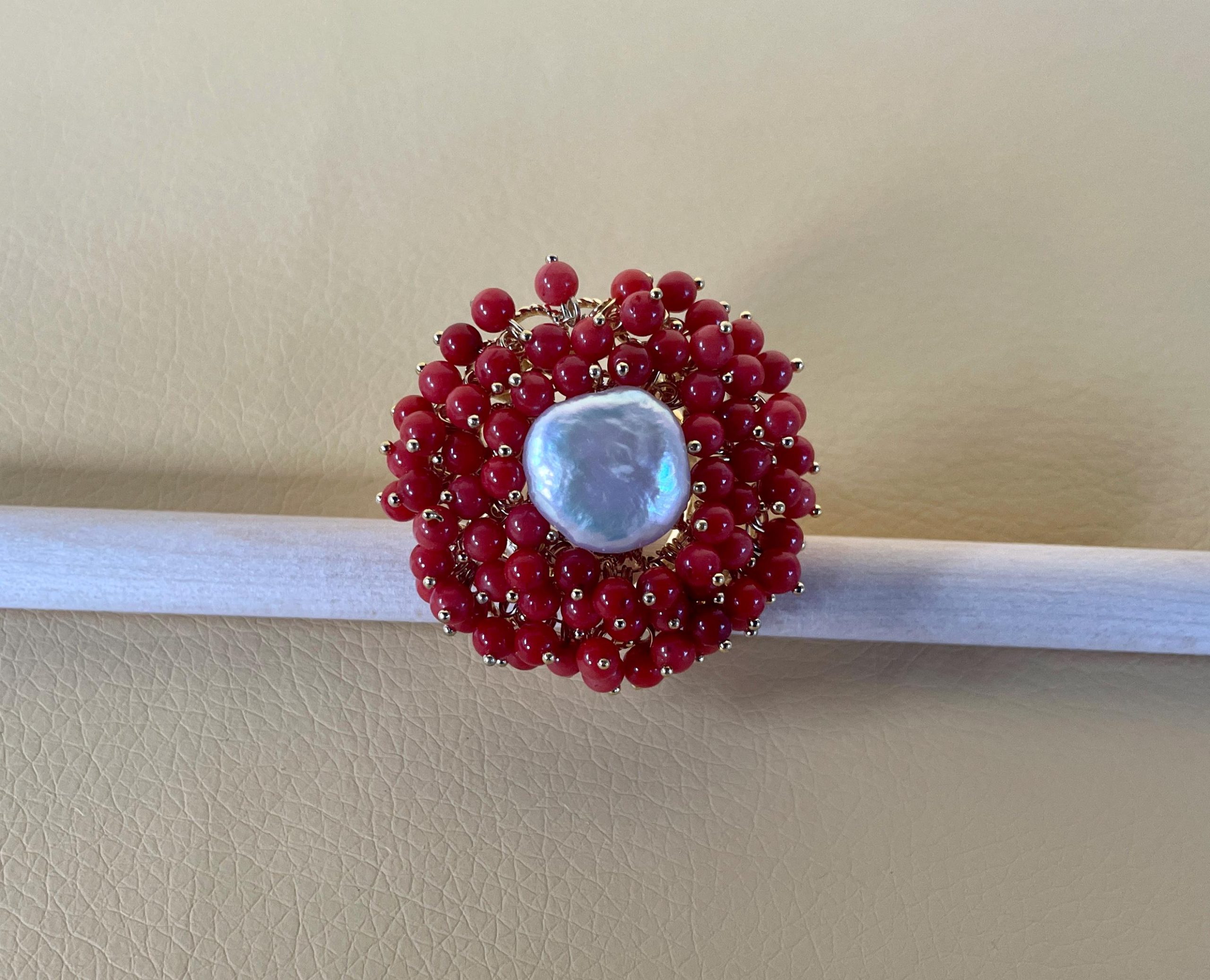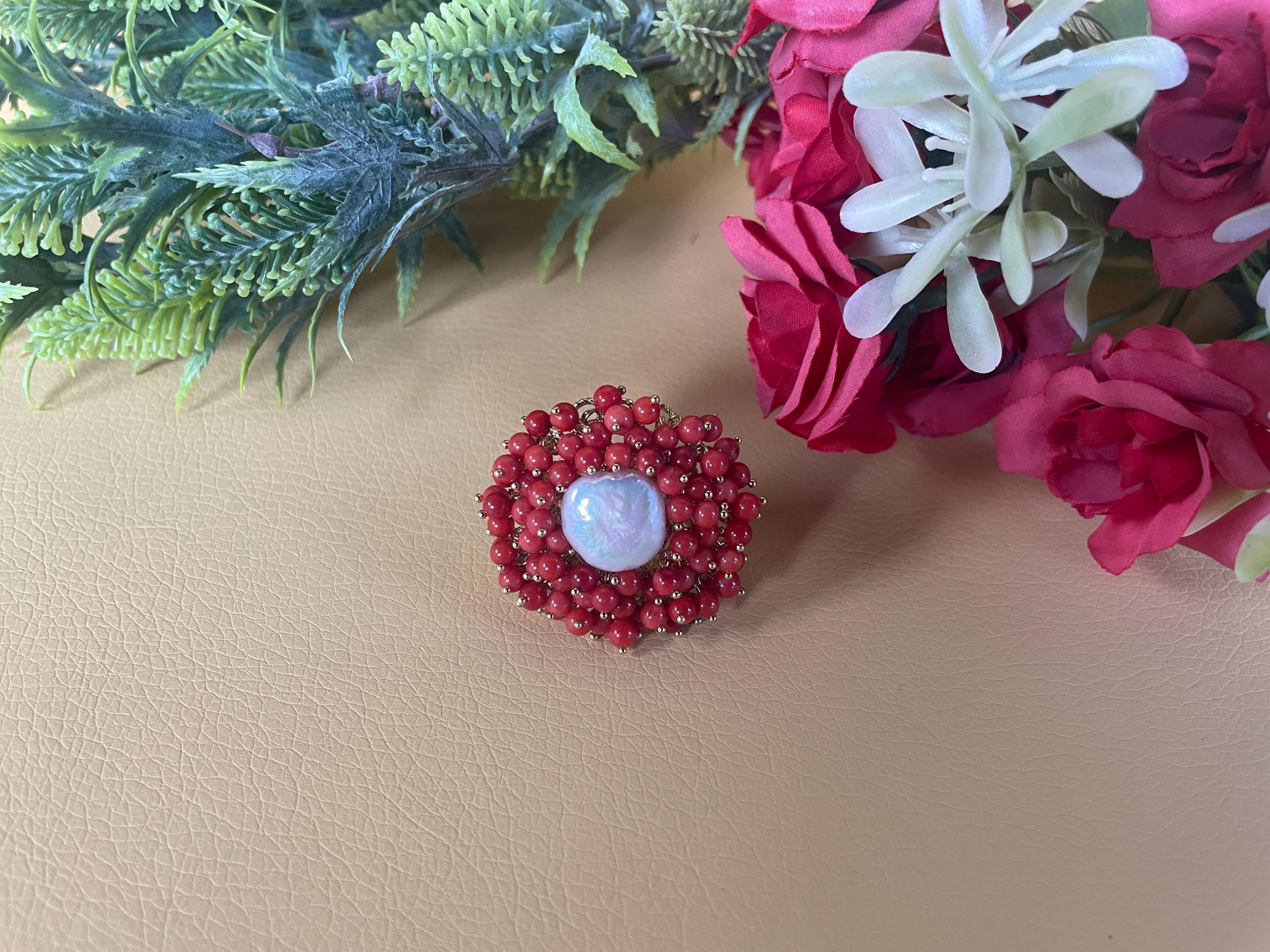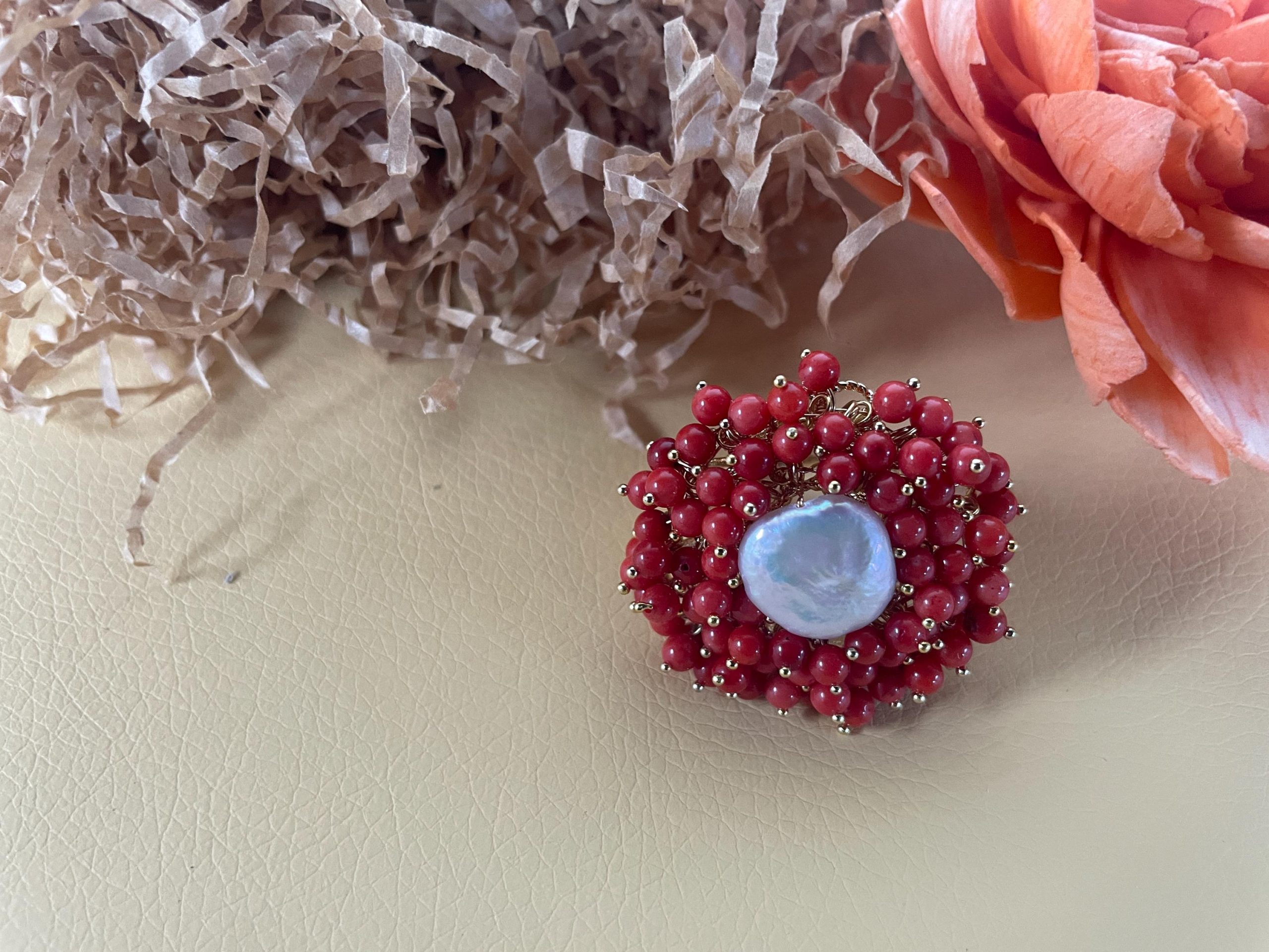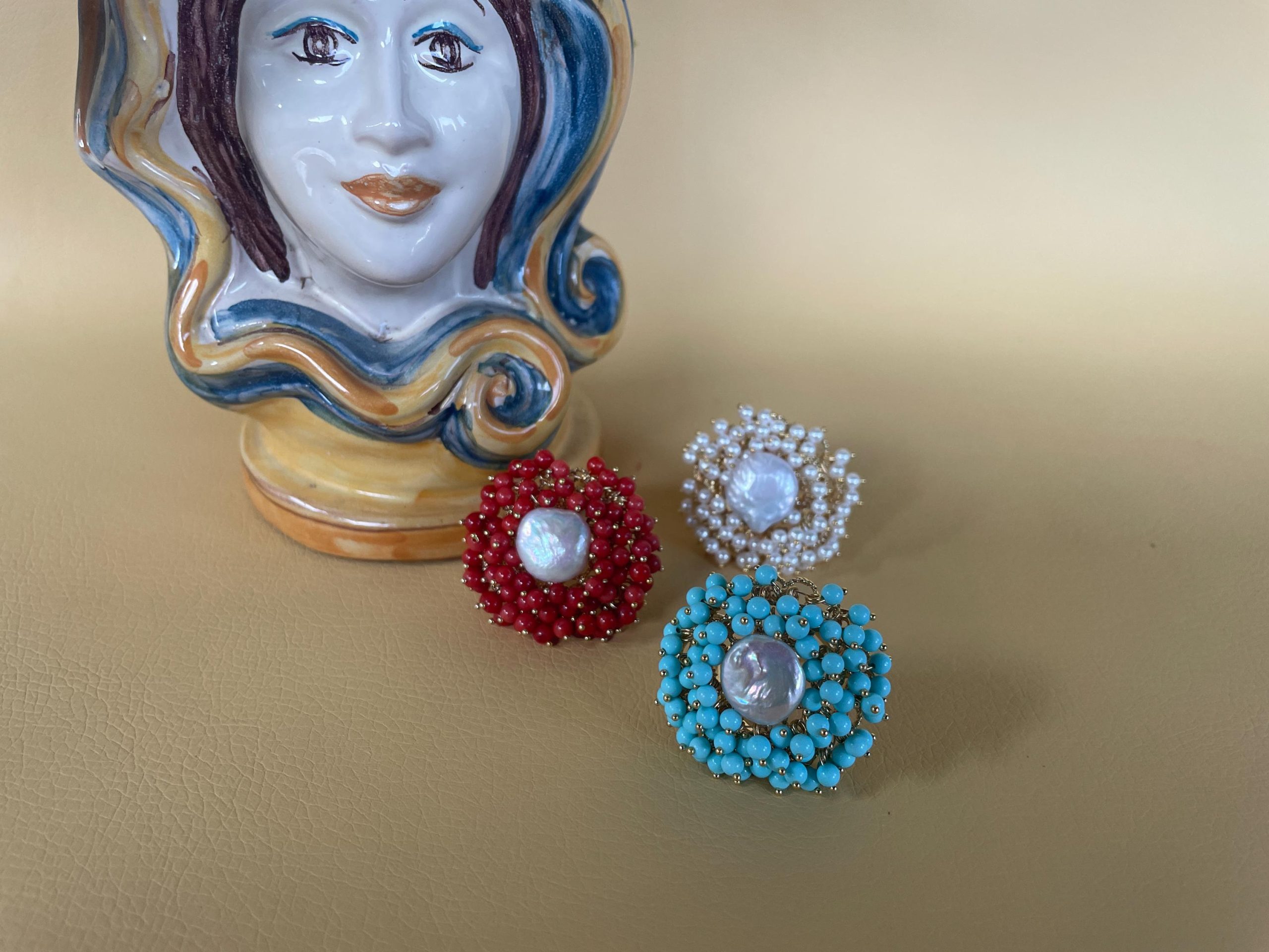 Su di essa vi è montata una perla naturale centrale a moneta intorno alla quale sono distribuite tante microperle di pasta di corallo rosso.