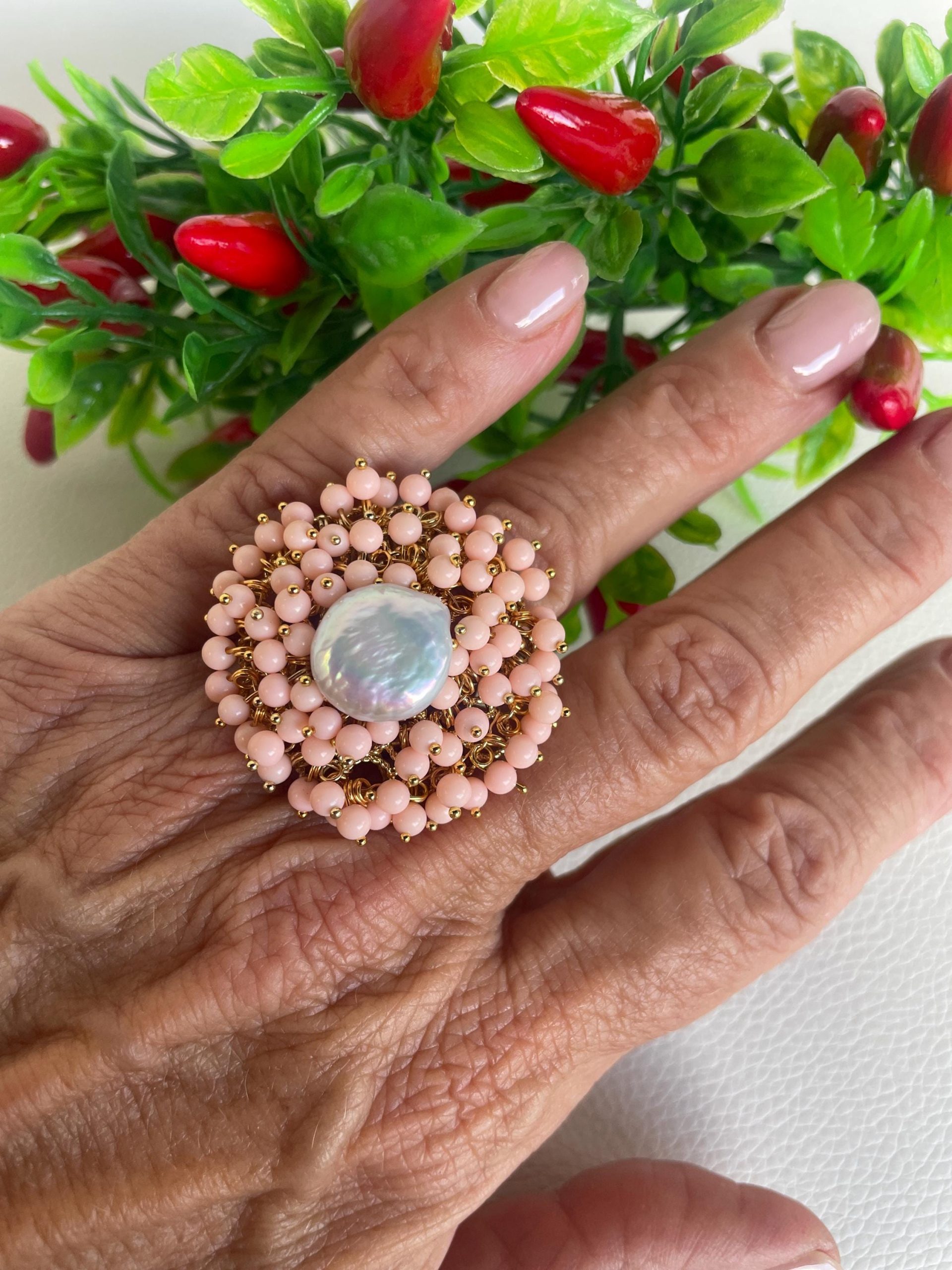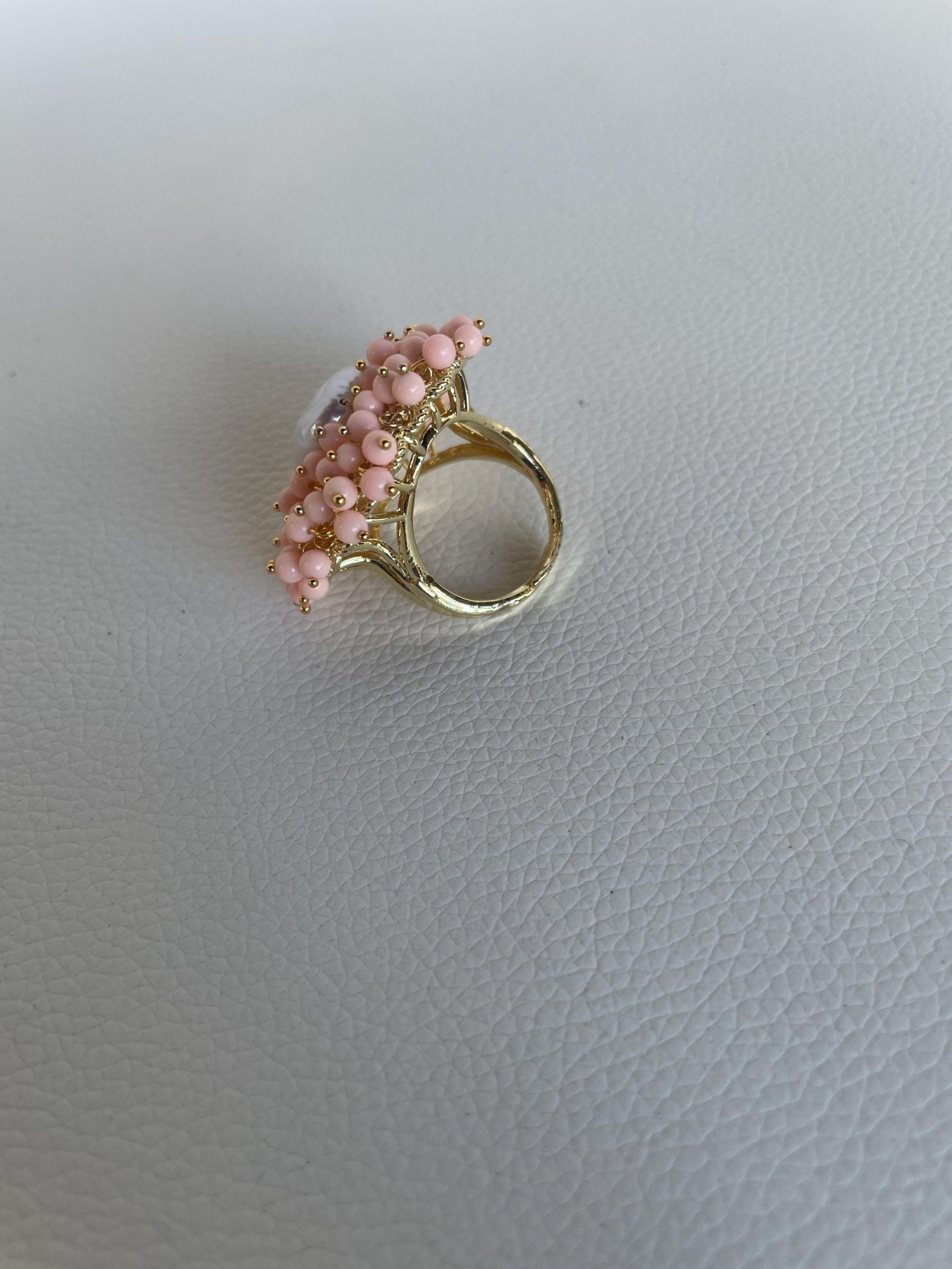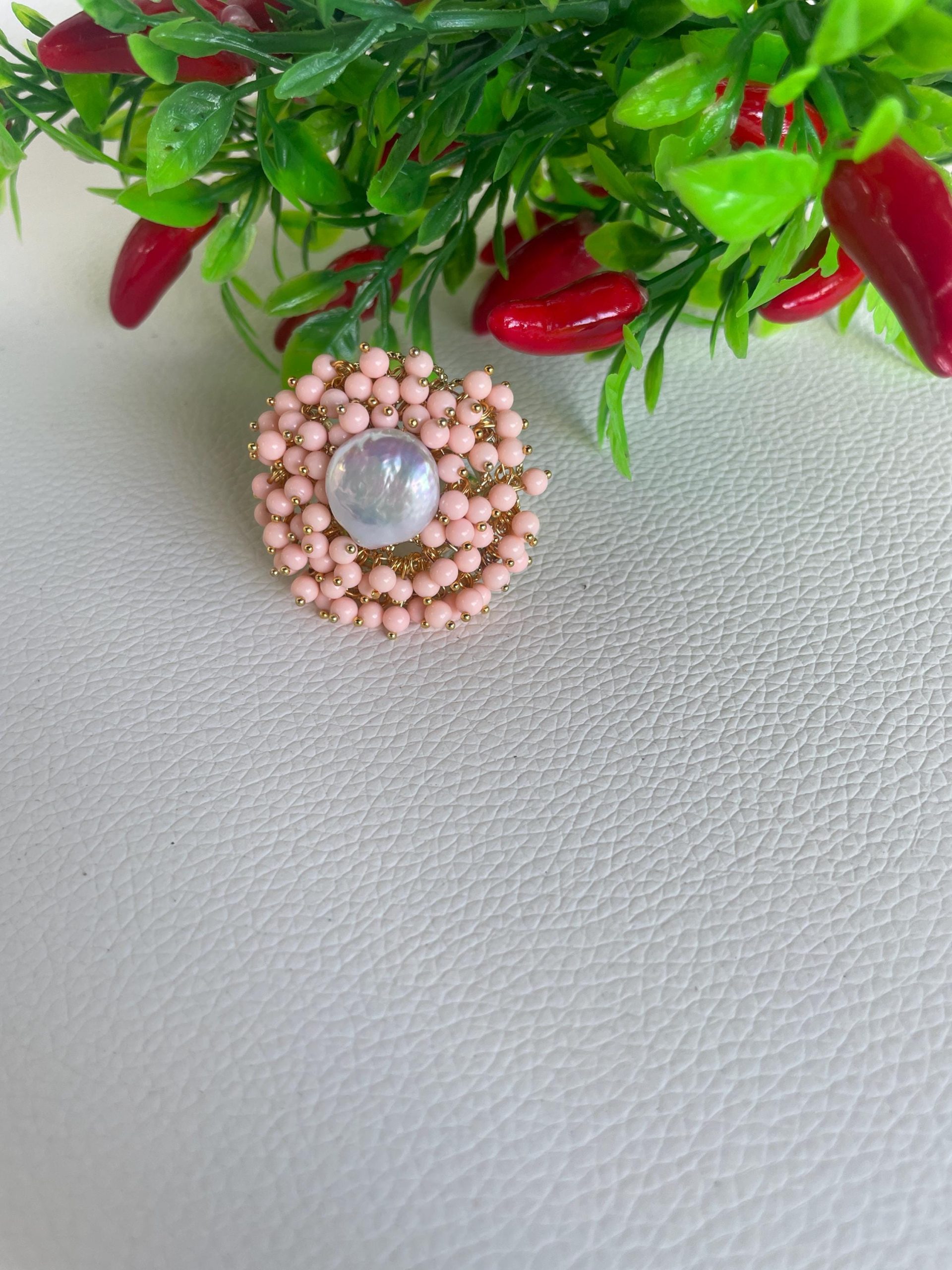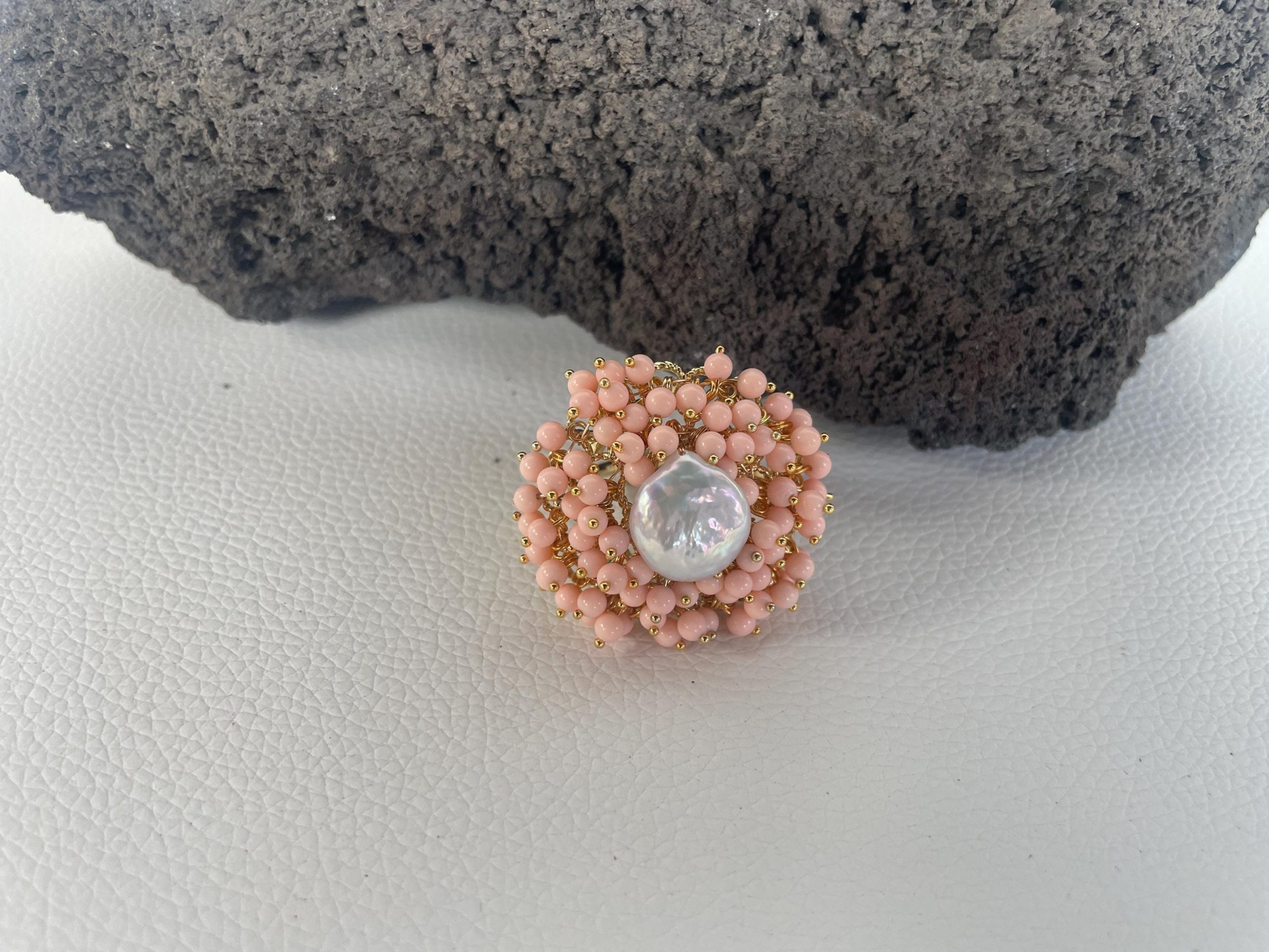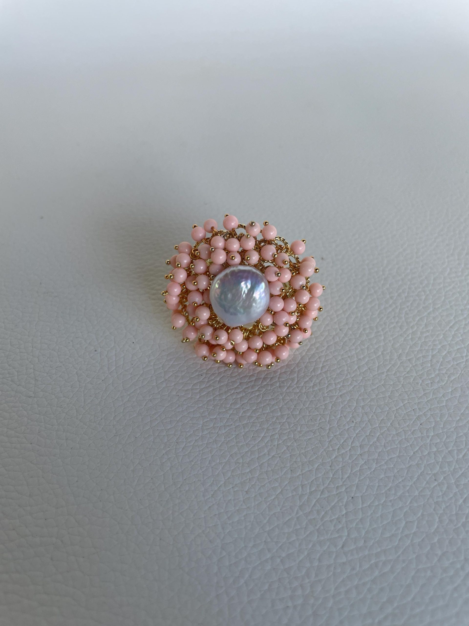 Su di essa vi è montata una perla naturale centrale a moneta intorno alla quale sono distribuite tante microperle di pasta di corallo rosa chiaro.