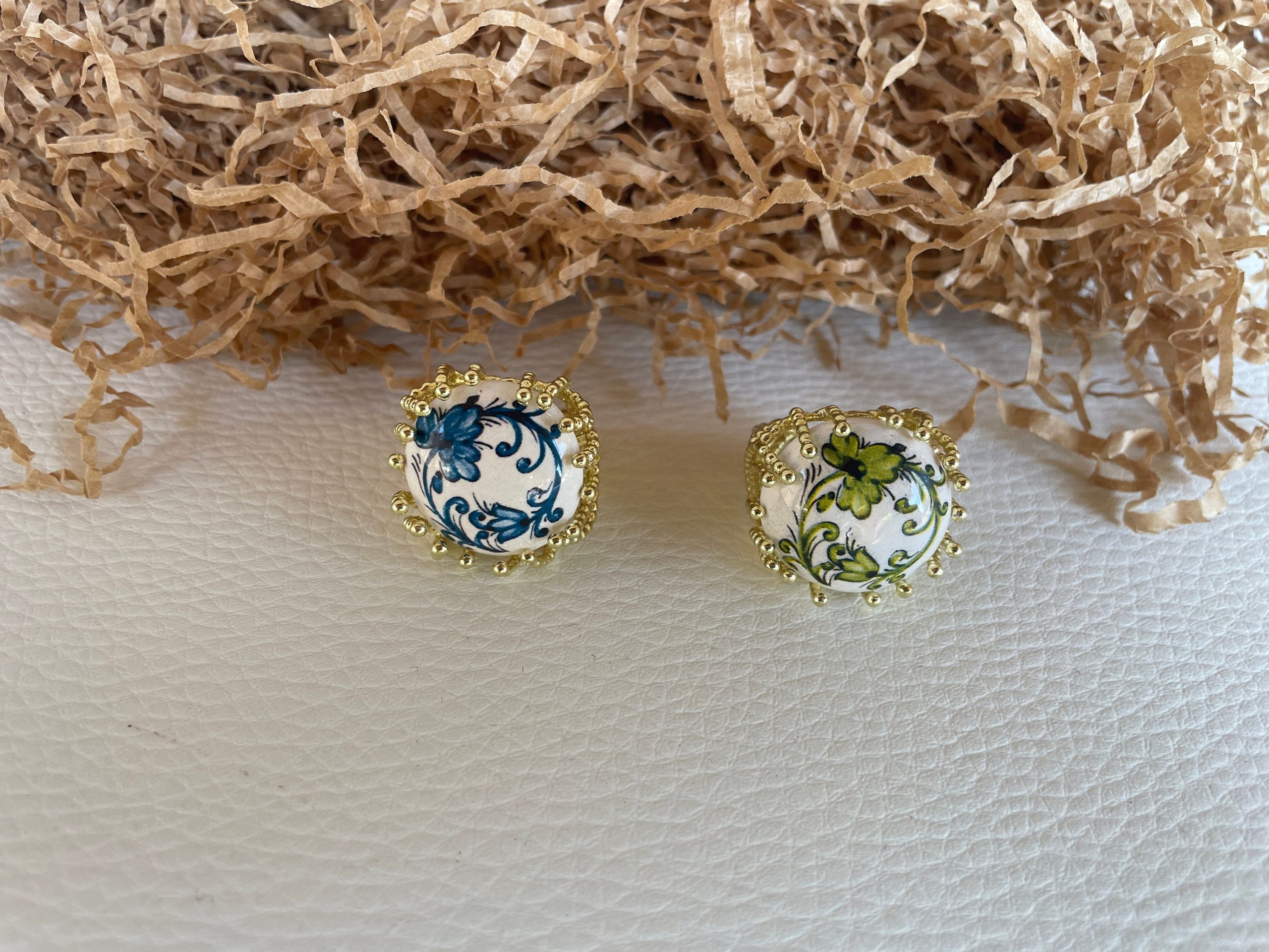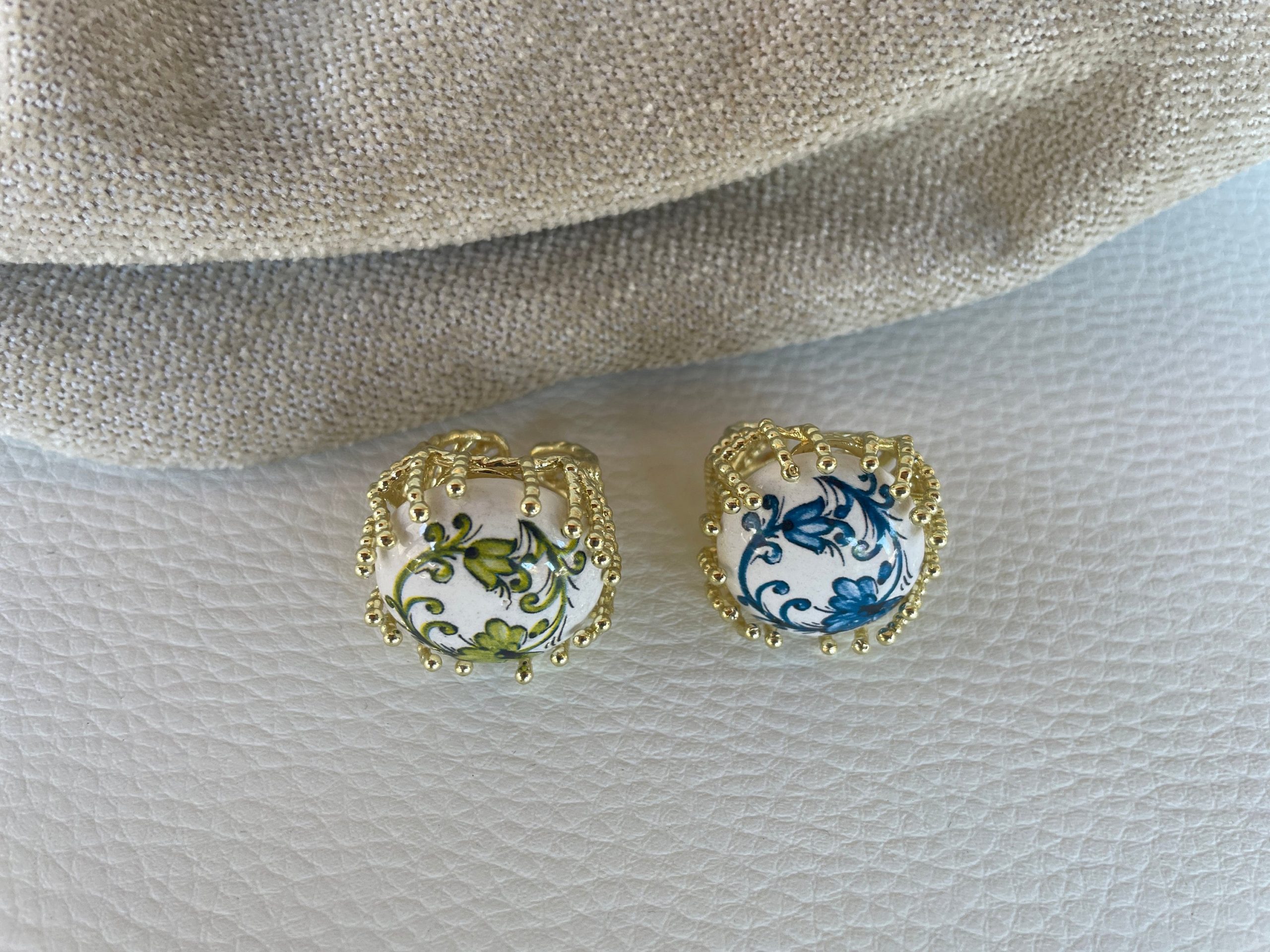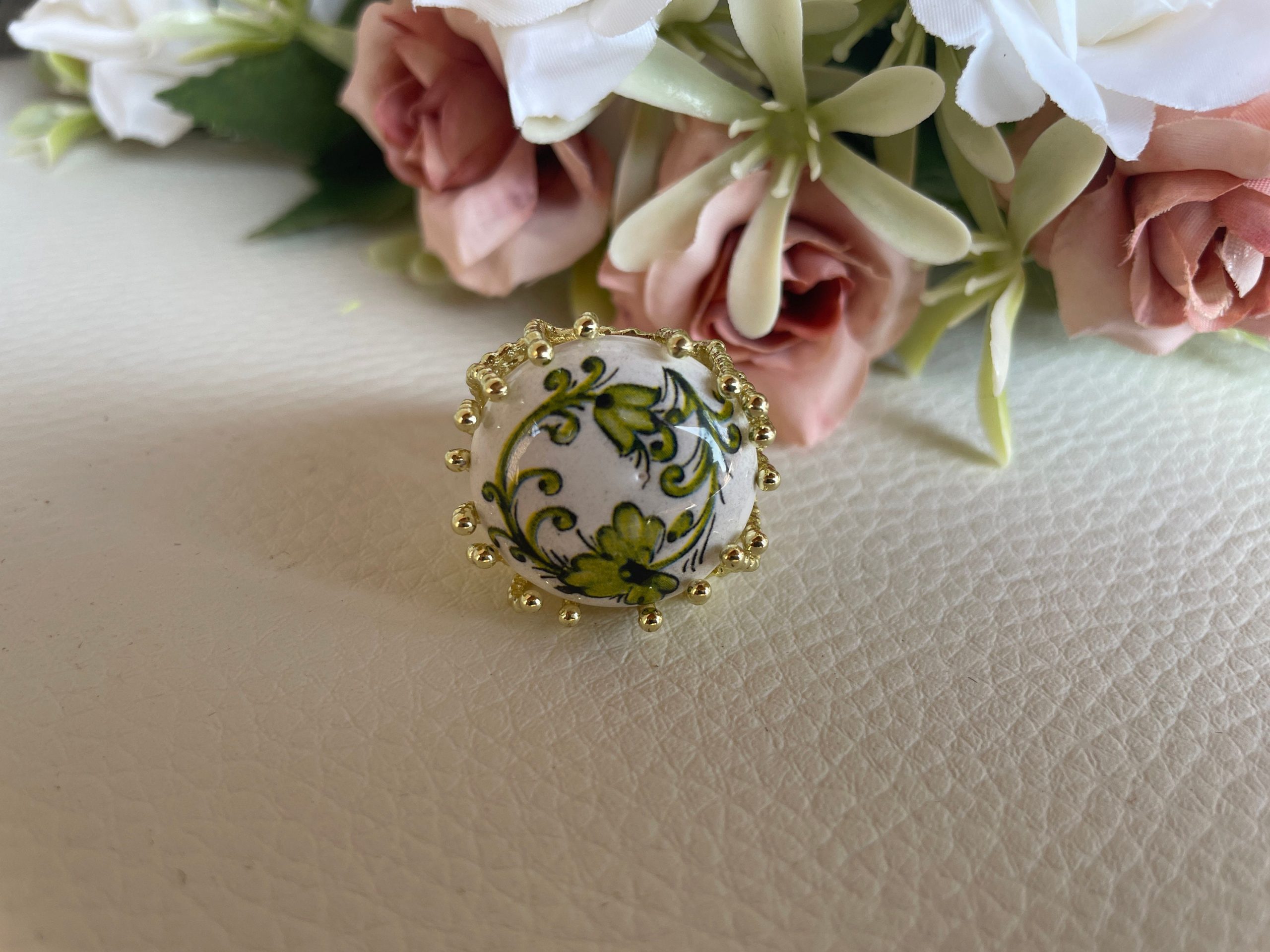 Anello regolabile con cabochon di ceramica di Caltagirone stampata in superficie con decori tipici della maiolica siciliana.