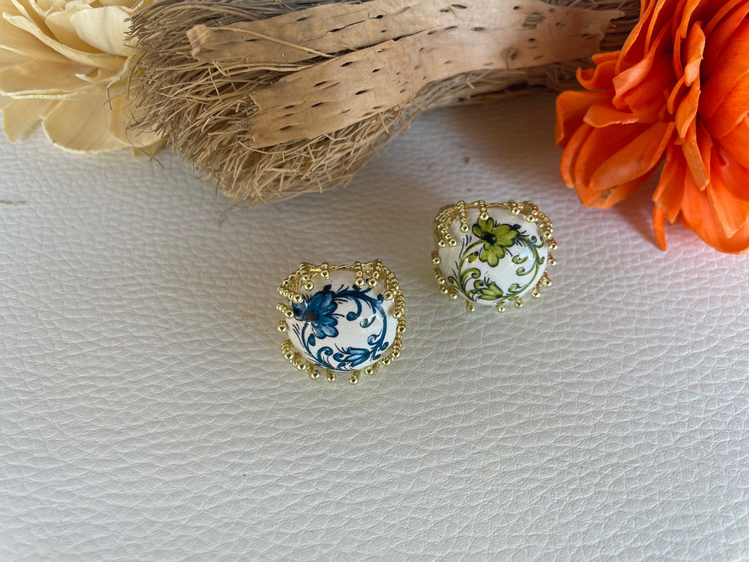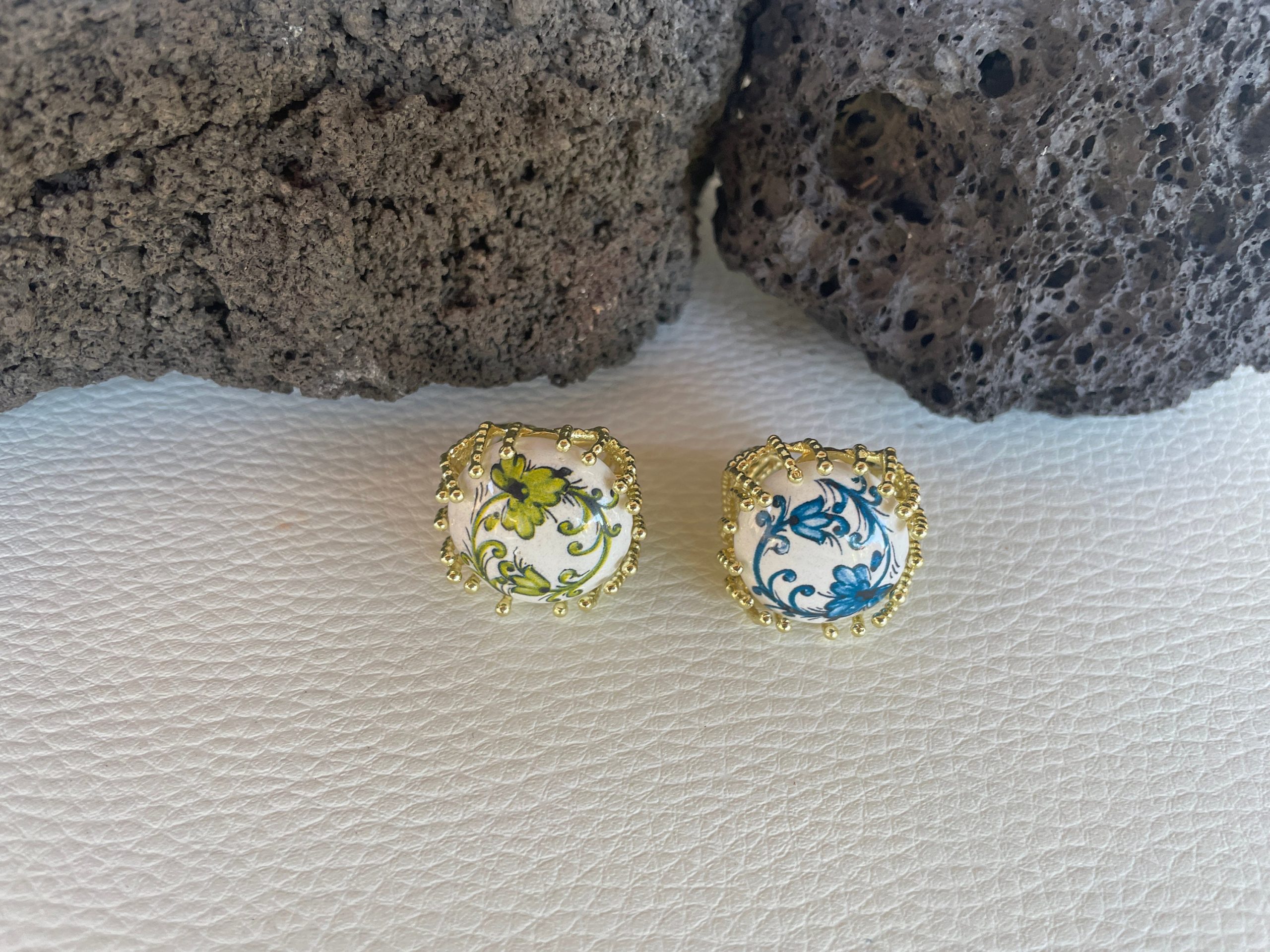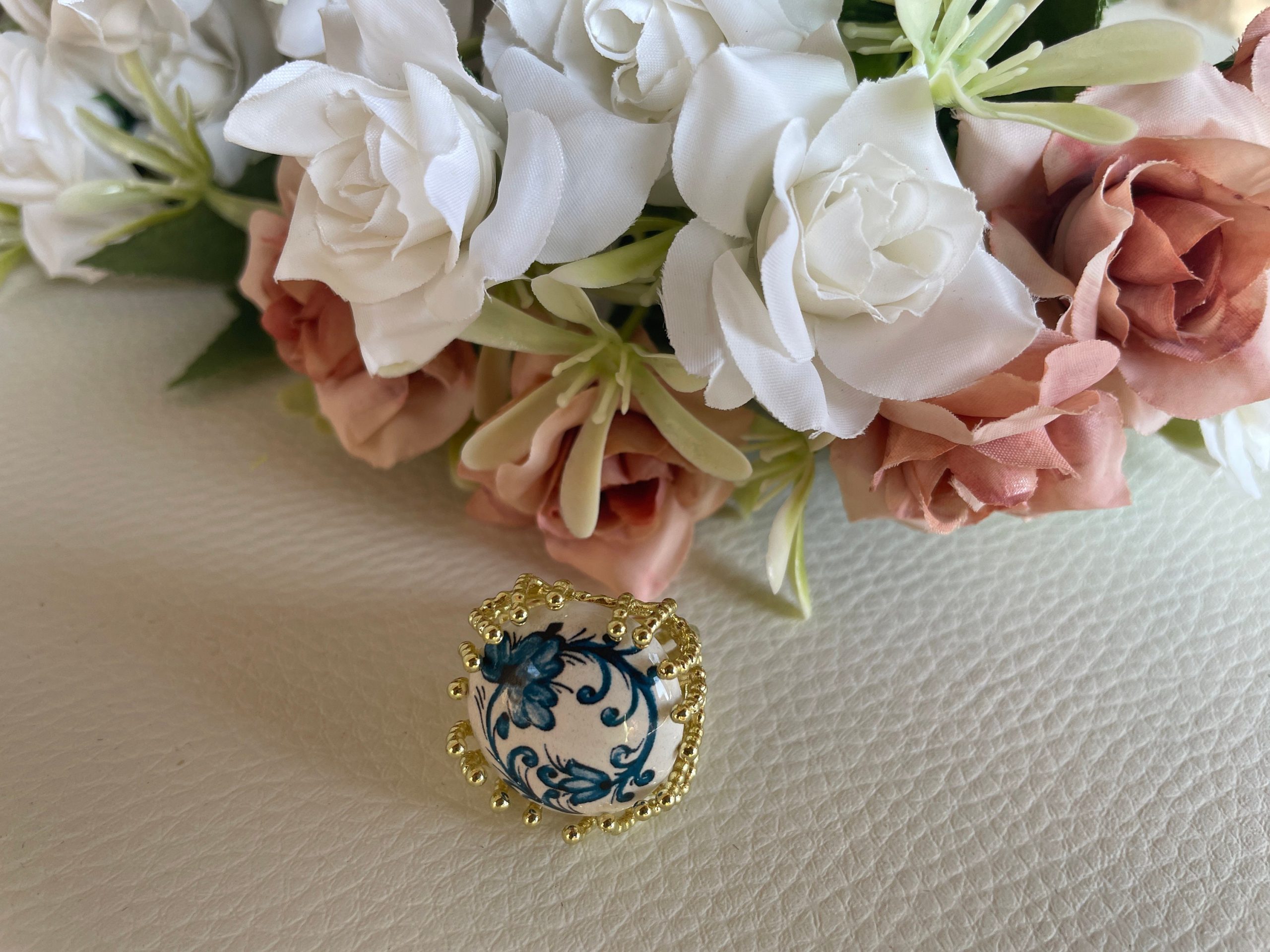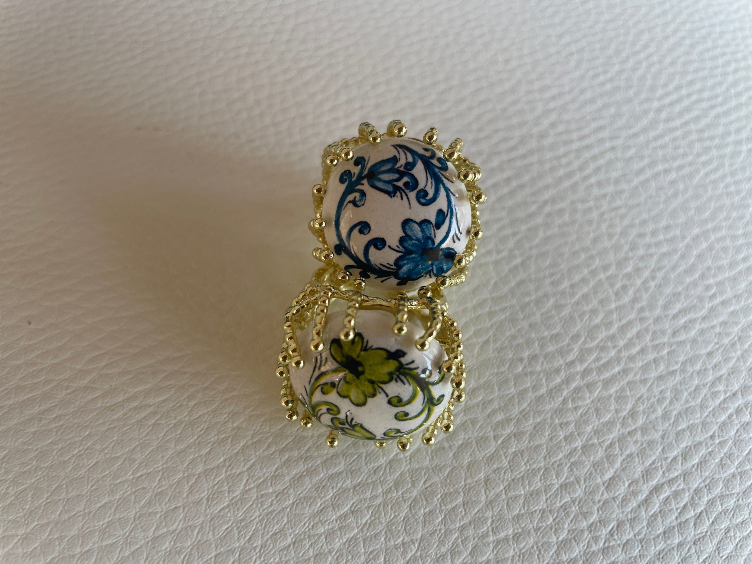 Anello regolabile con cabochon di ceramica di Caltagirone stampata in superficie con decori tipici della maiolica siciliana.