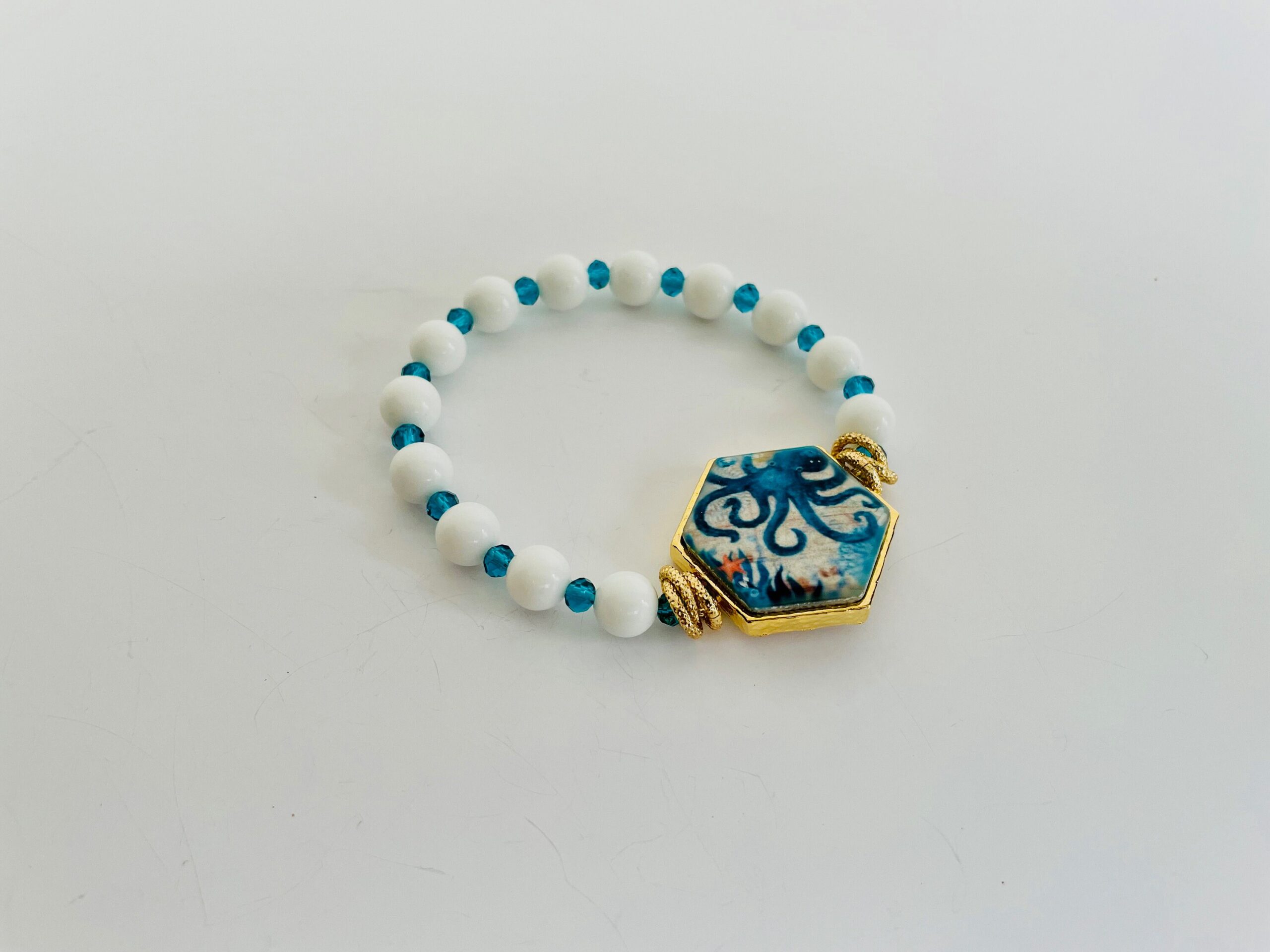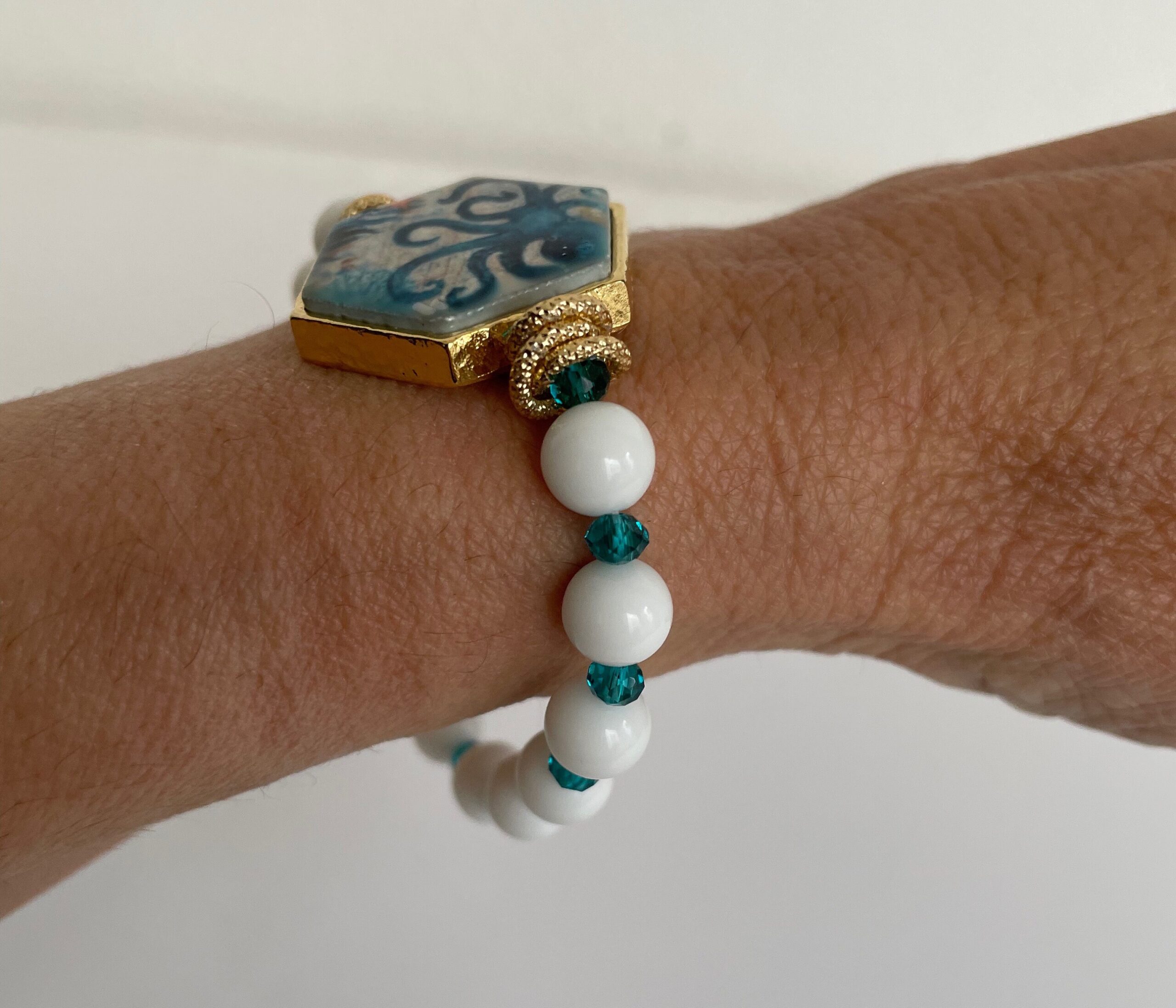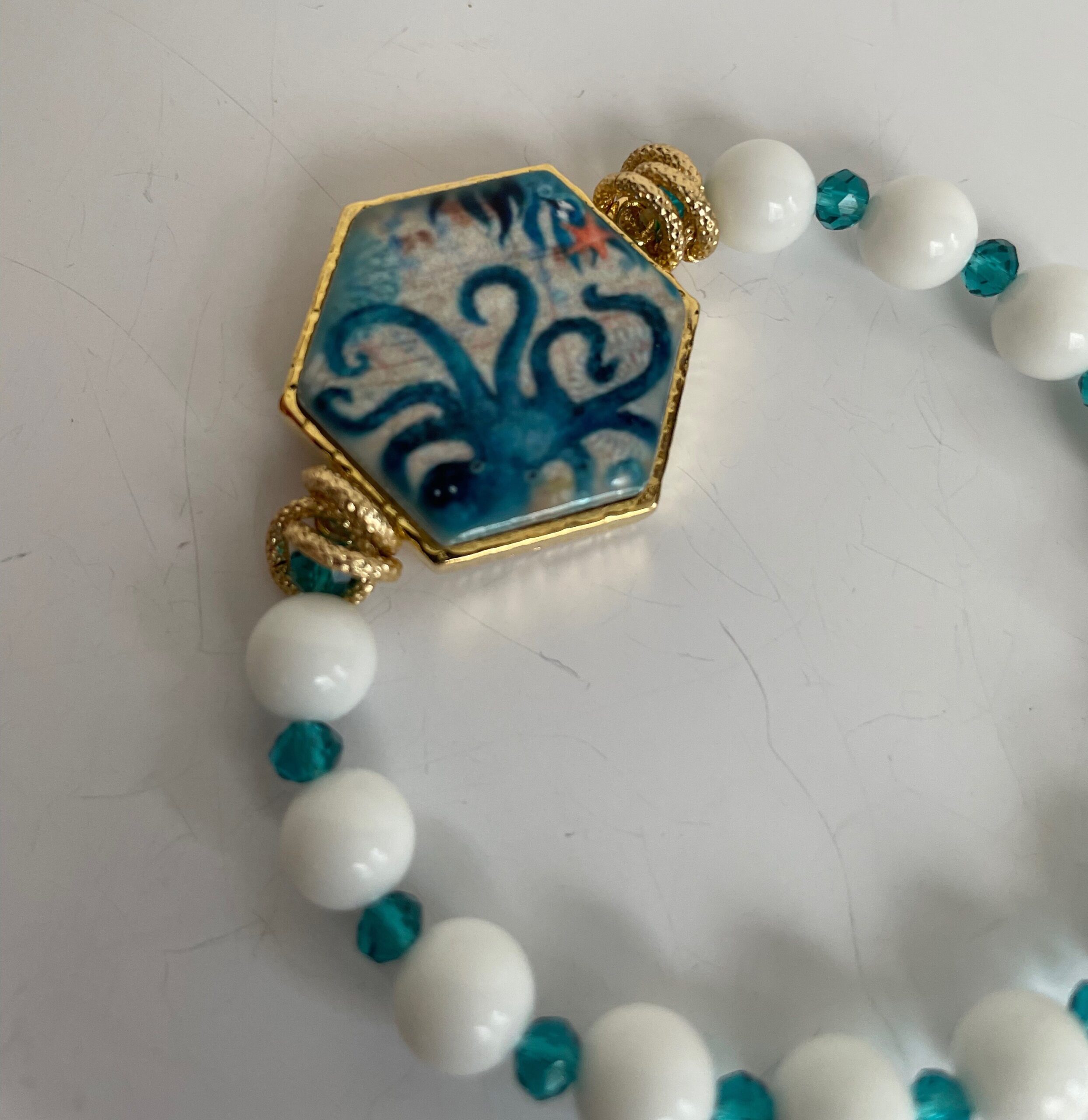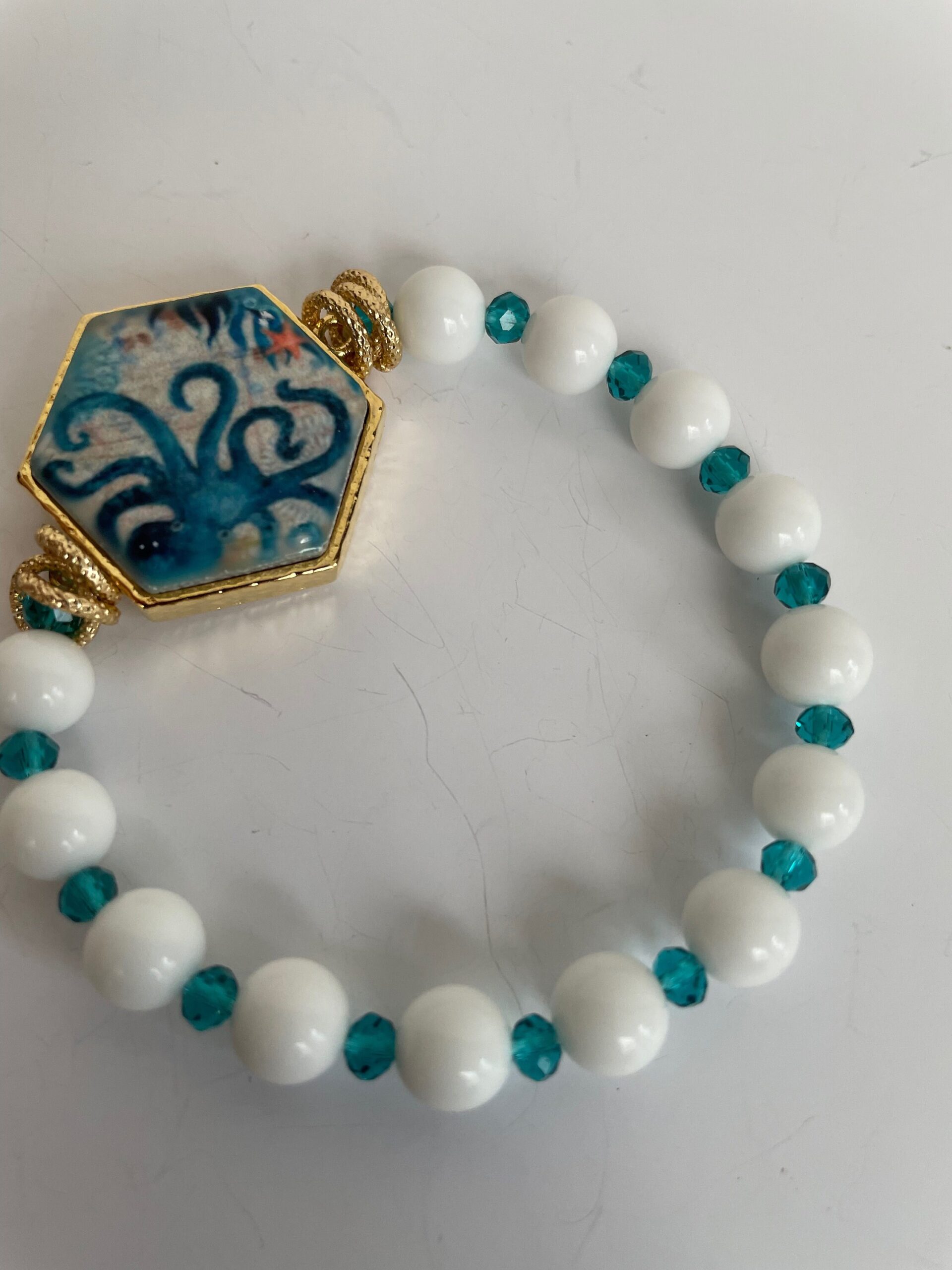 Una mattonella esagonale centrale di ceramica di Caltagirone arricchisce questo bracciale con il decoro di un polipo su ondo chiaro.