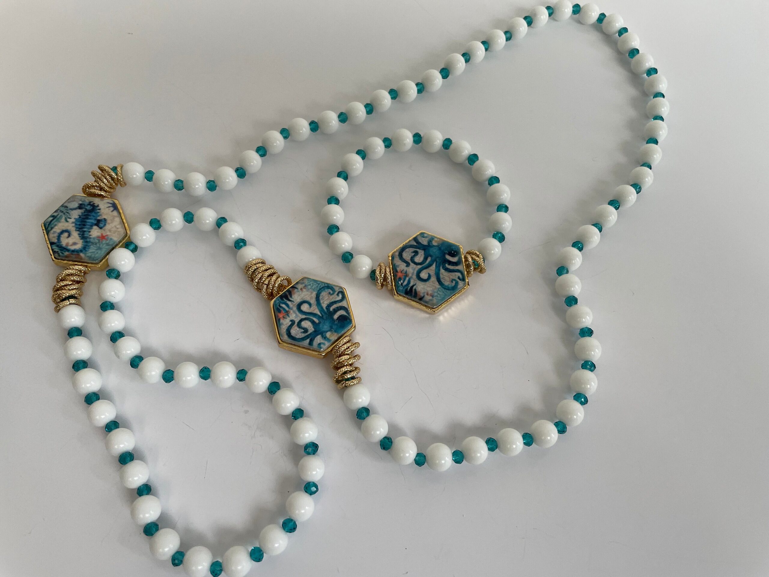 Realizzato con perle di Agata bianca alternate a piccole perle di cristallo turchese.