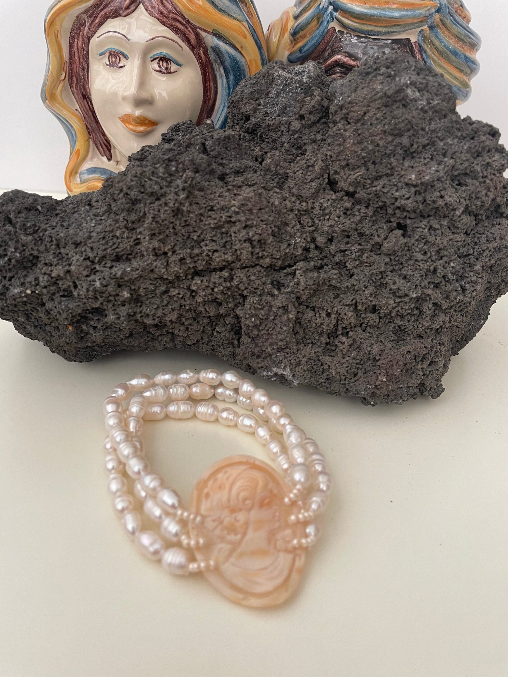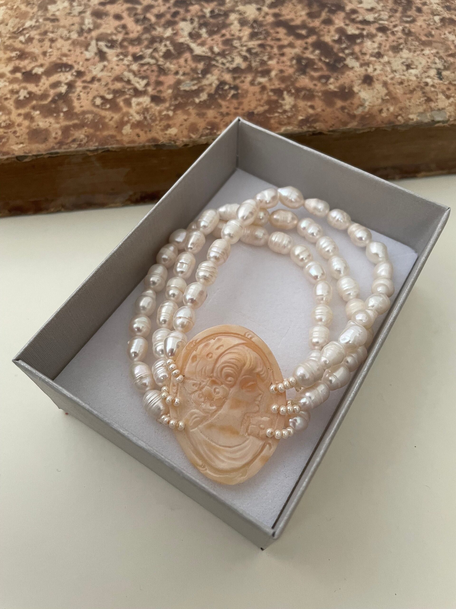 Composto da tre fili di perle di fiume e grande Cammeo centrale autentico di conchiglia sardonica, raffigurante il profilo di un volto femminile.