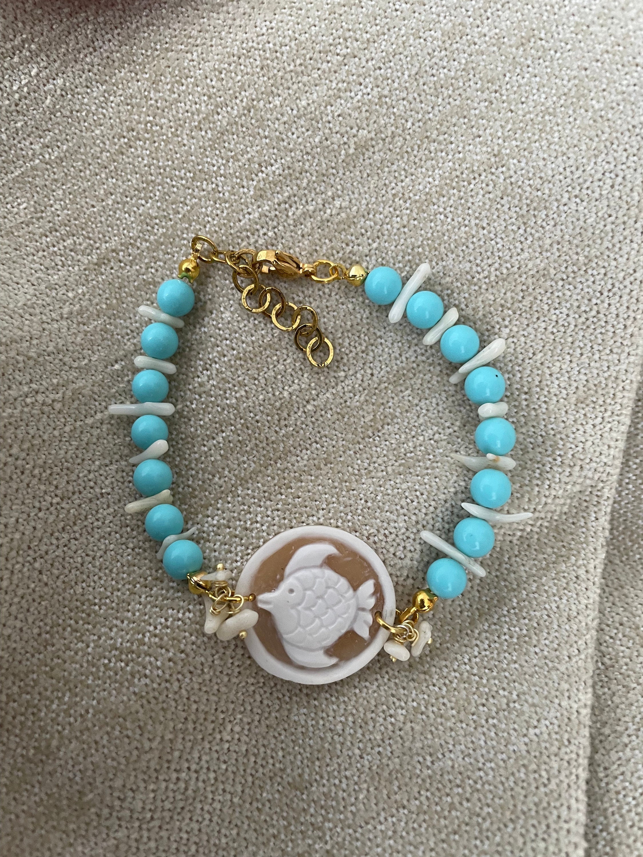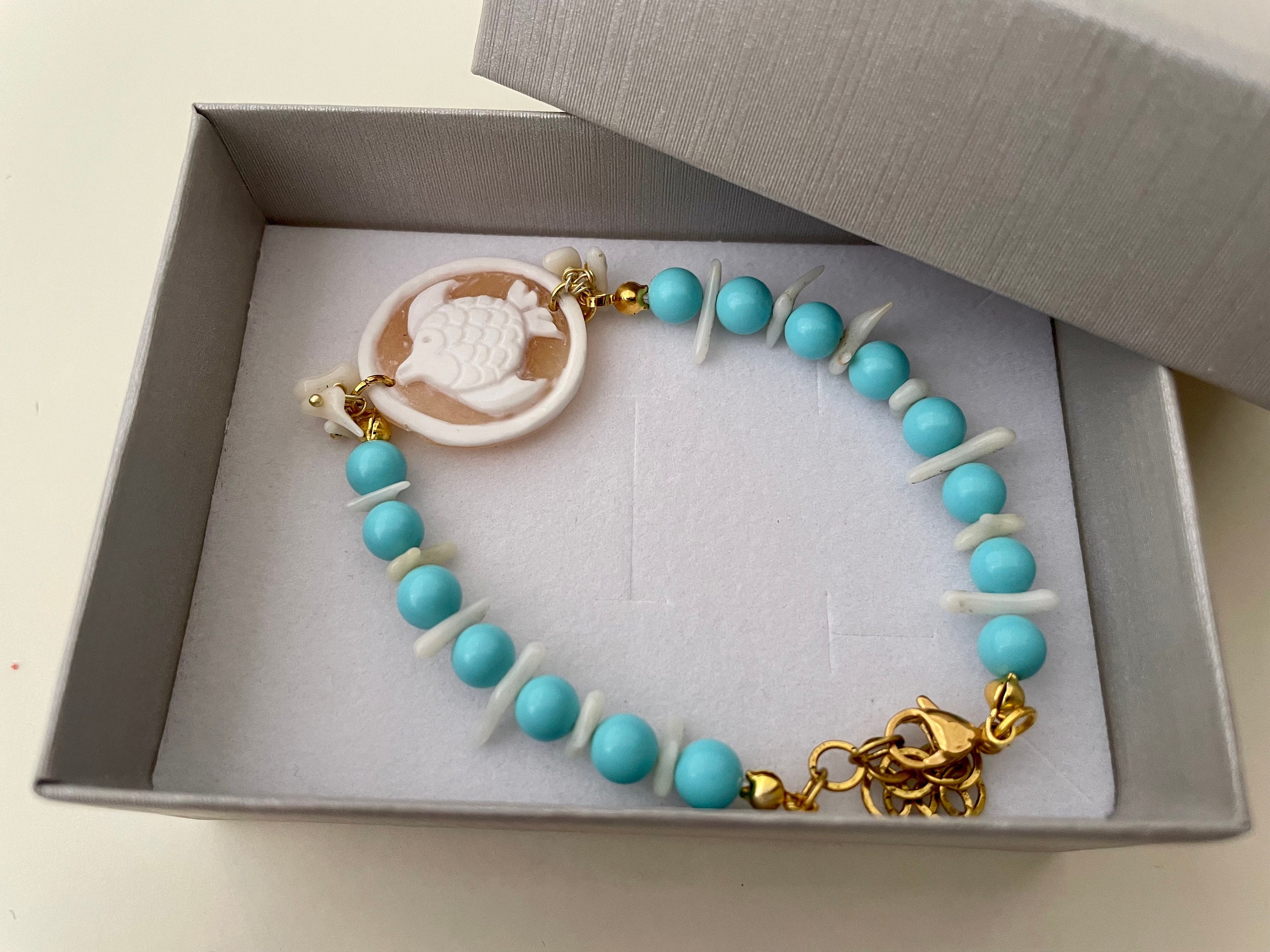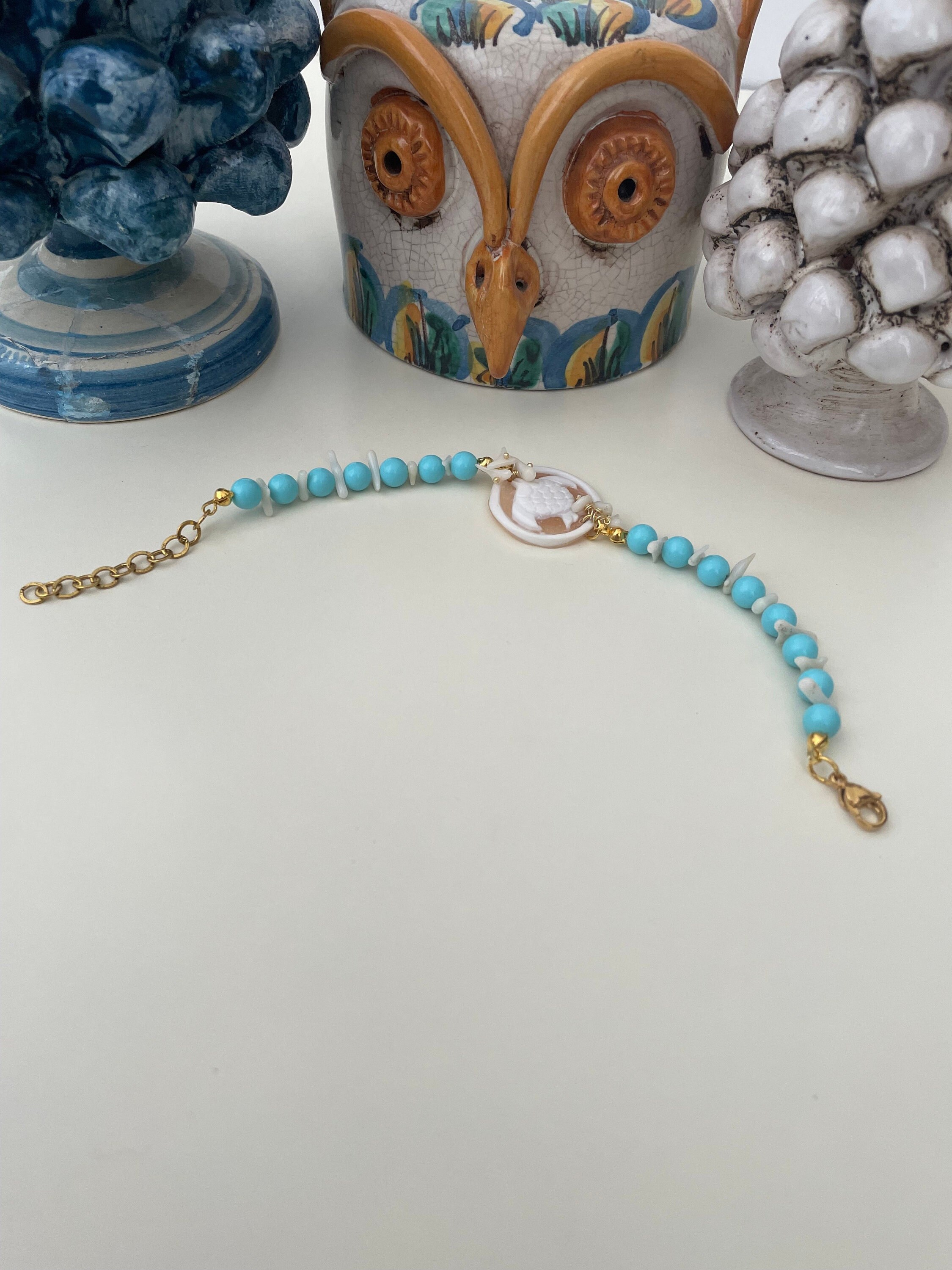 Composto da perle di pasta di turchese e chips di corallo bambù bianco.