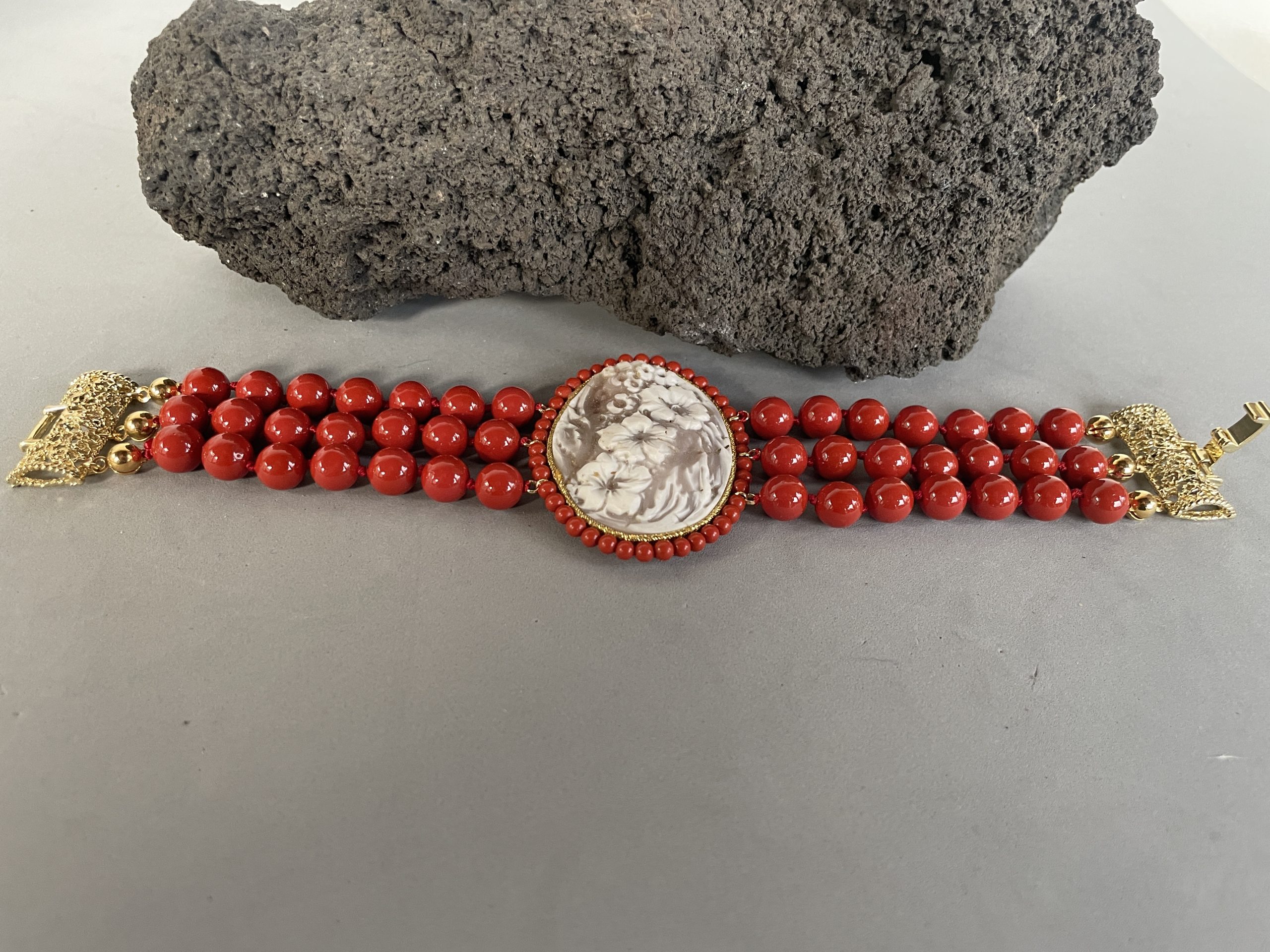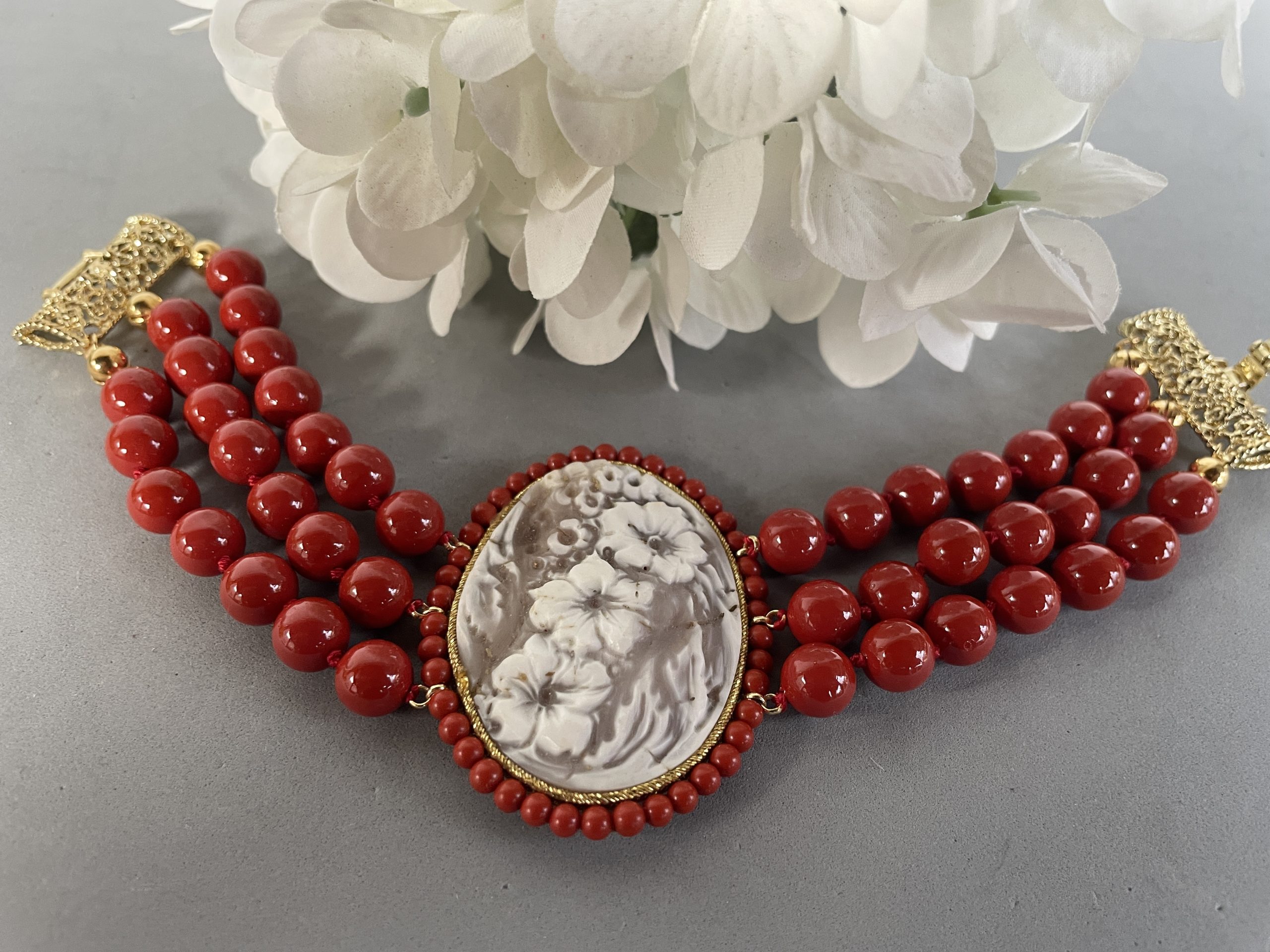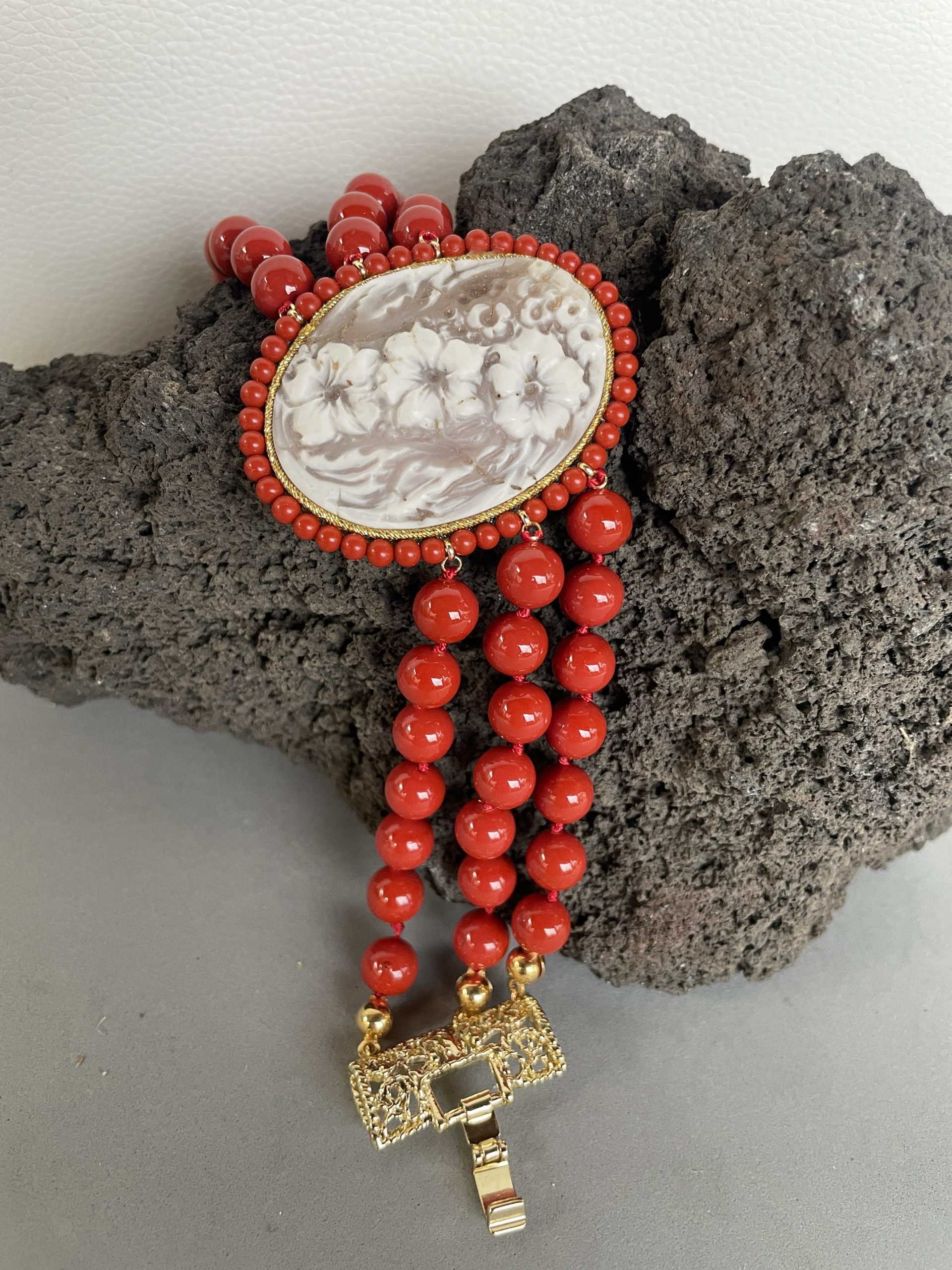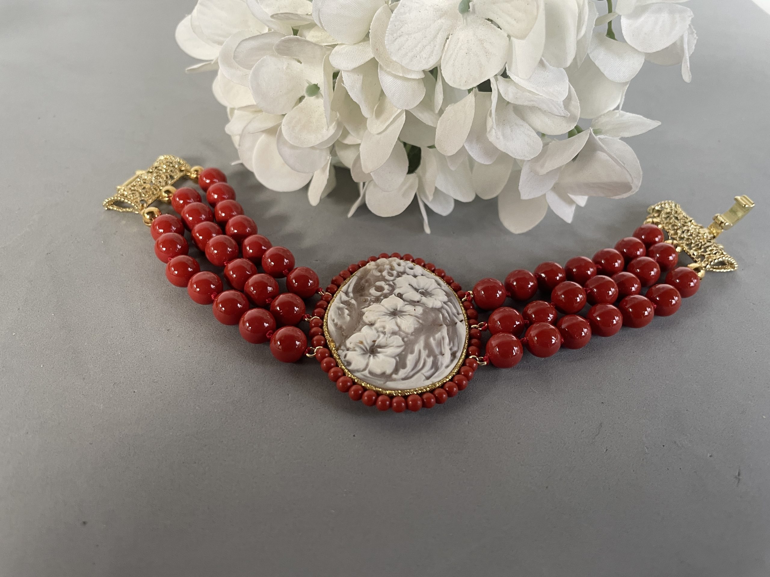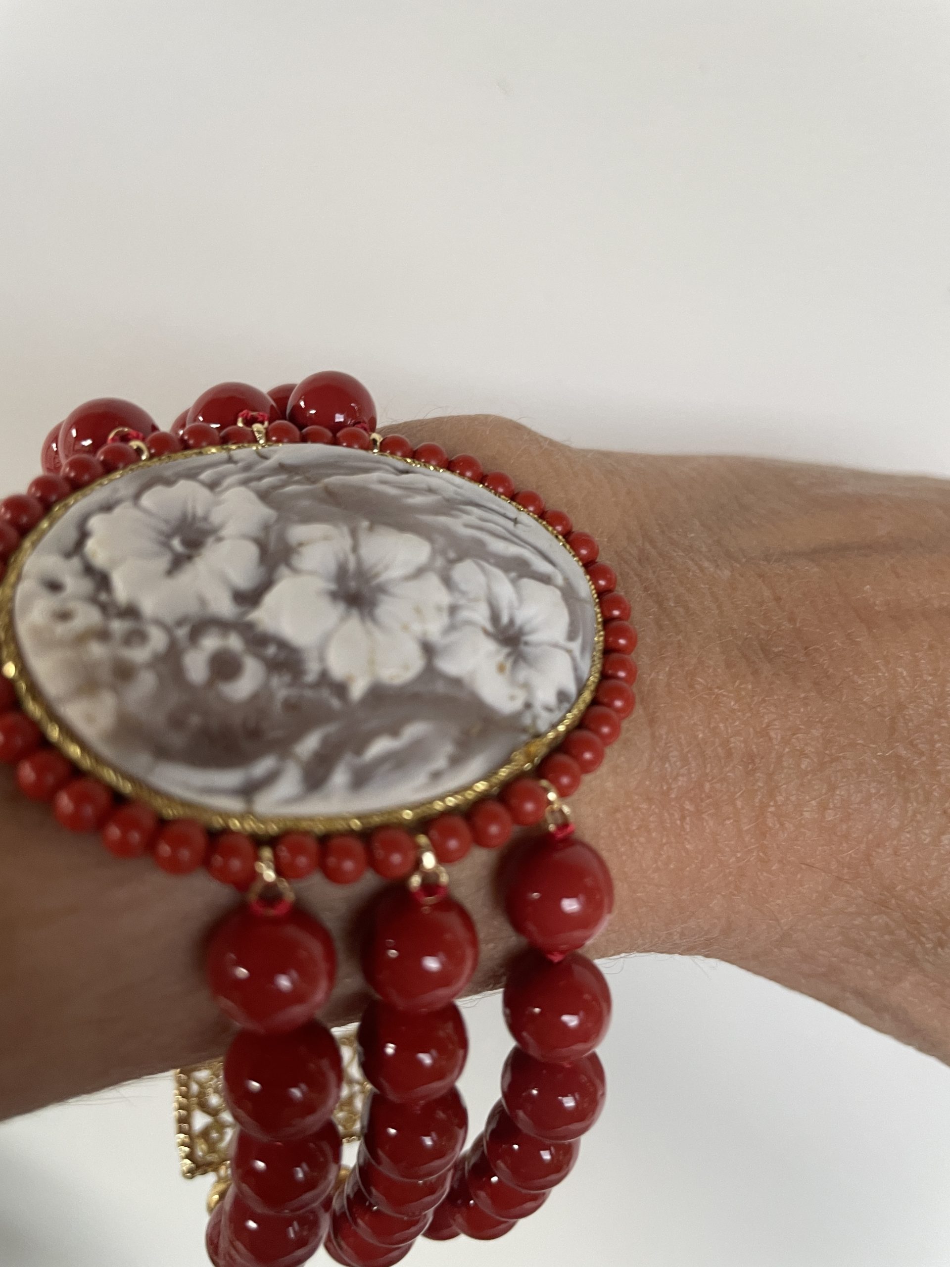Bracciale con Cammeo autentico, tre fili perle maiorca rosse e chiusura filigranata ottone oro.
