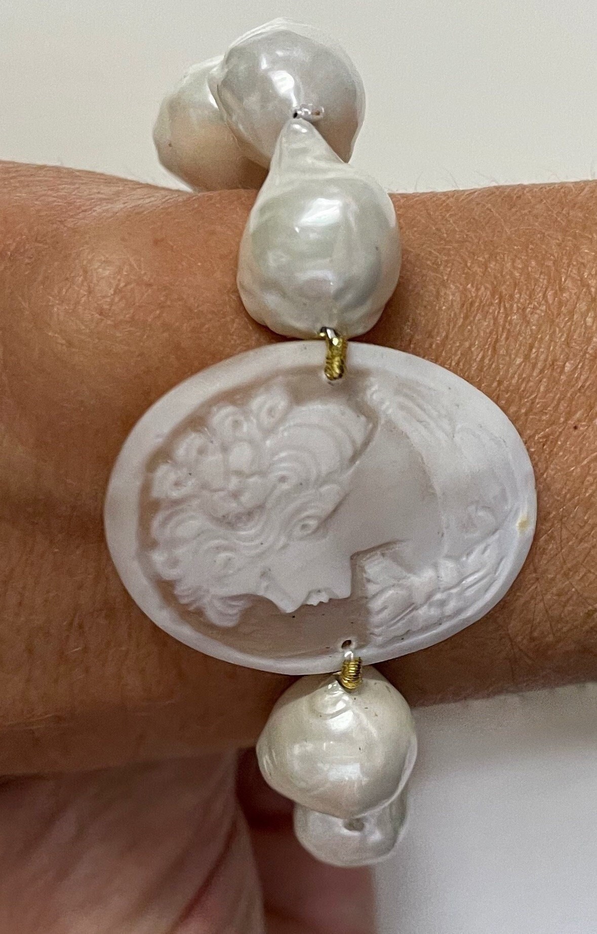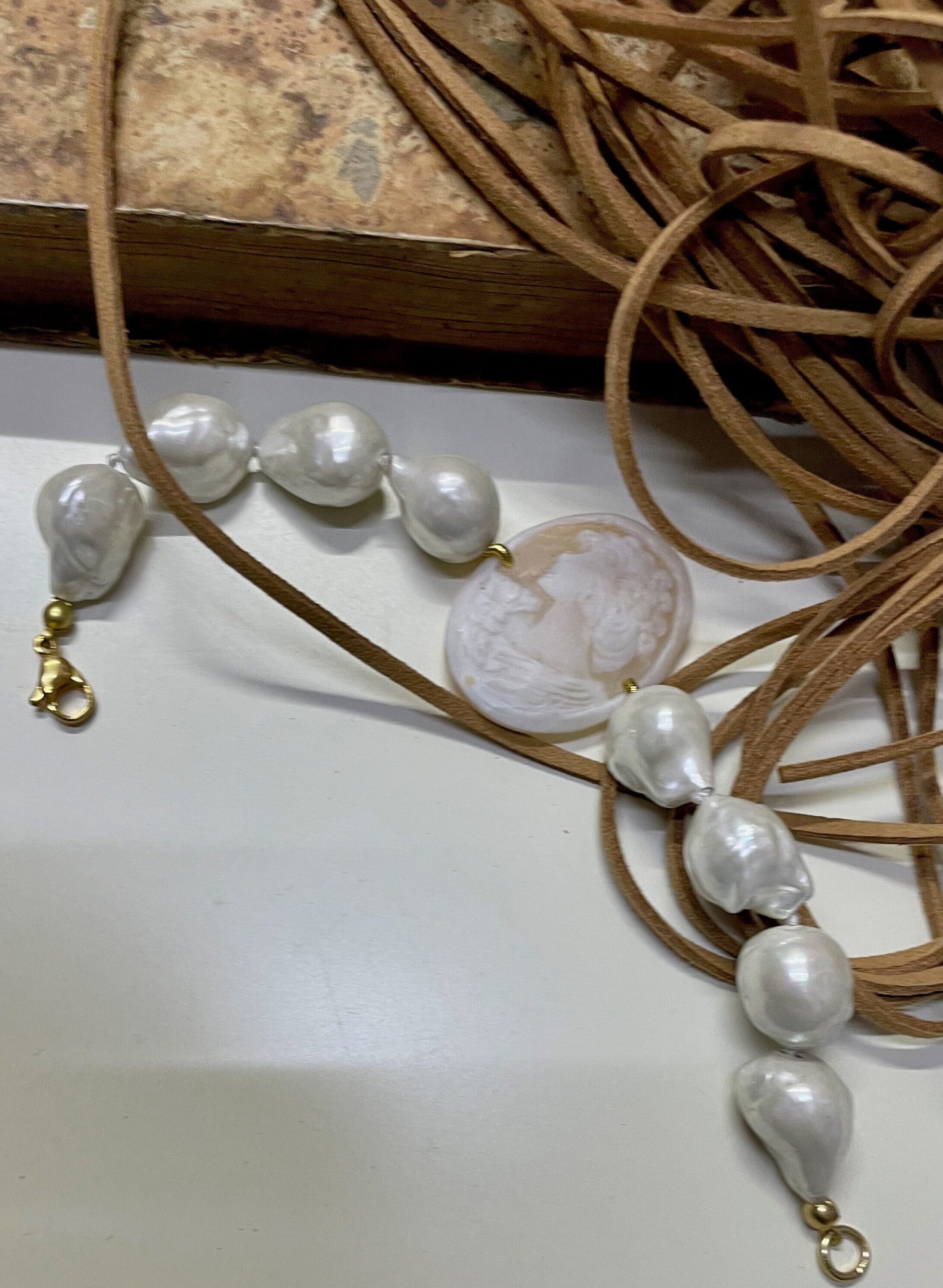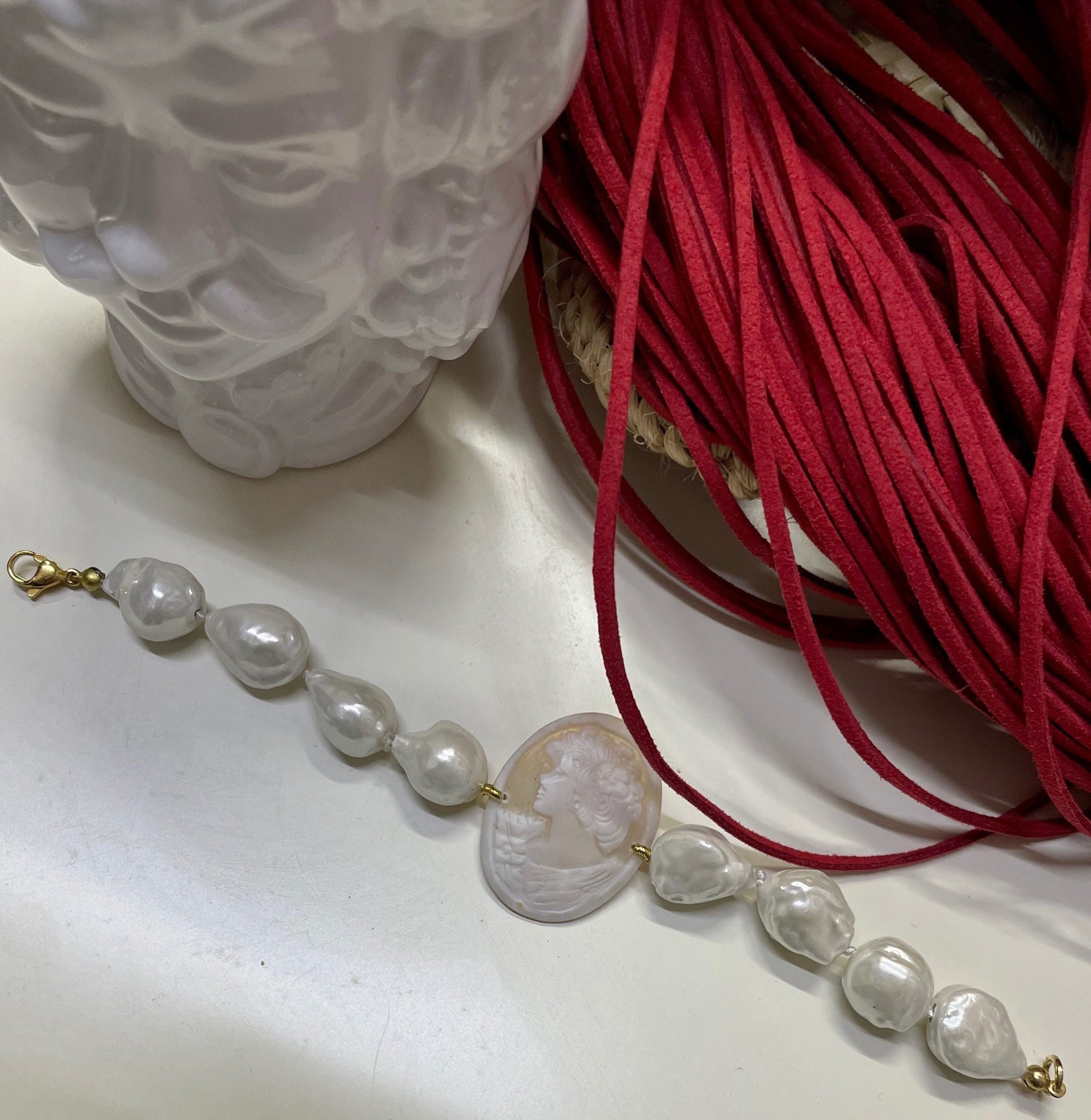 Realizzato con un filo di otto perle scaramazze, singolarmente annodate, e Cammeo centrale ovale di vera conchiglia sardonica.