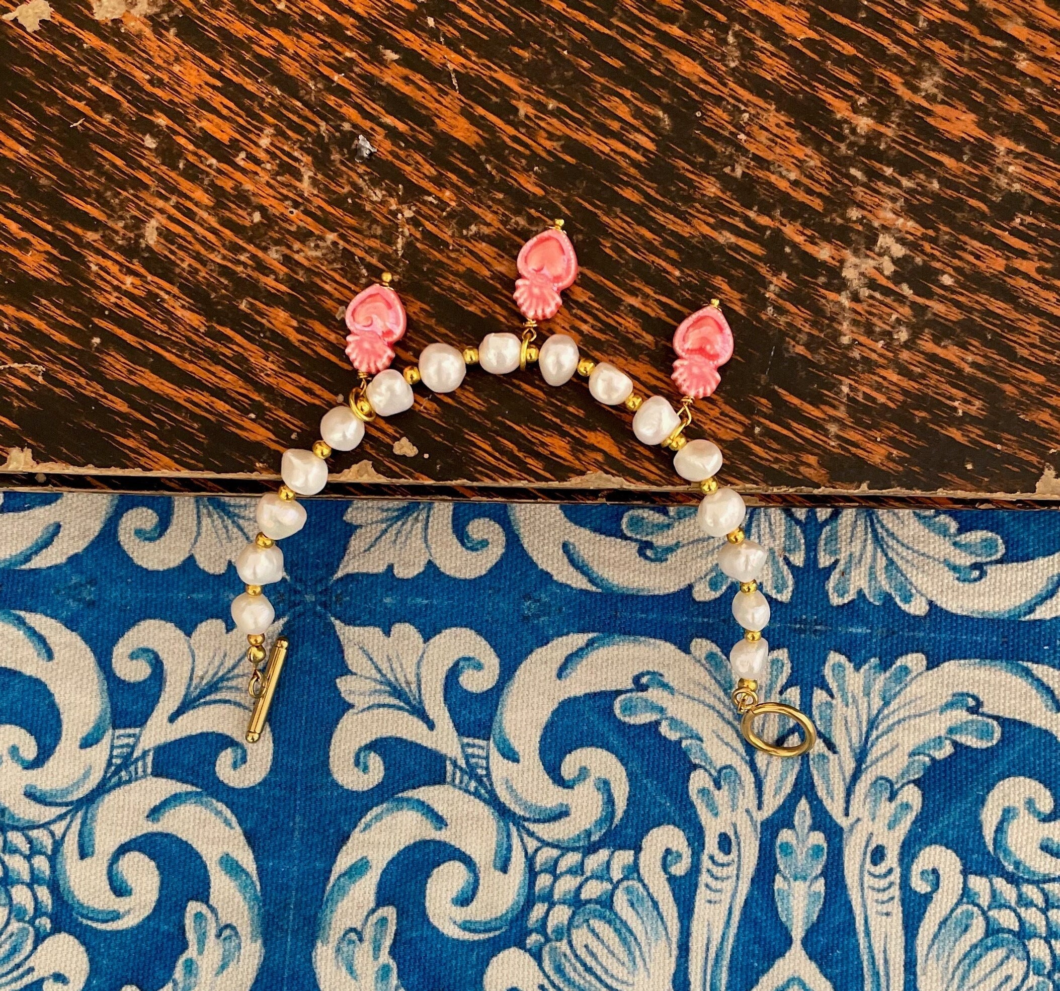Completano l’accessorio tre charms in ceramica rosa rappresentanti cuori.