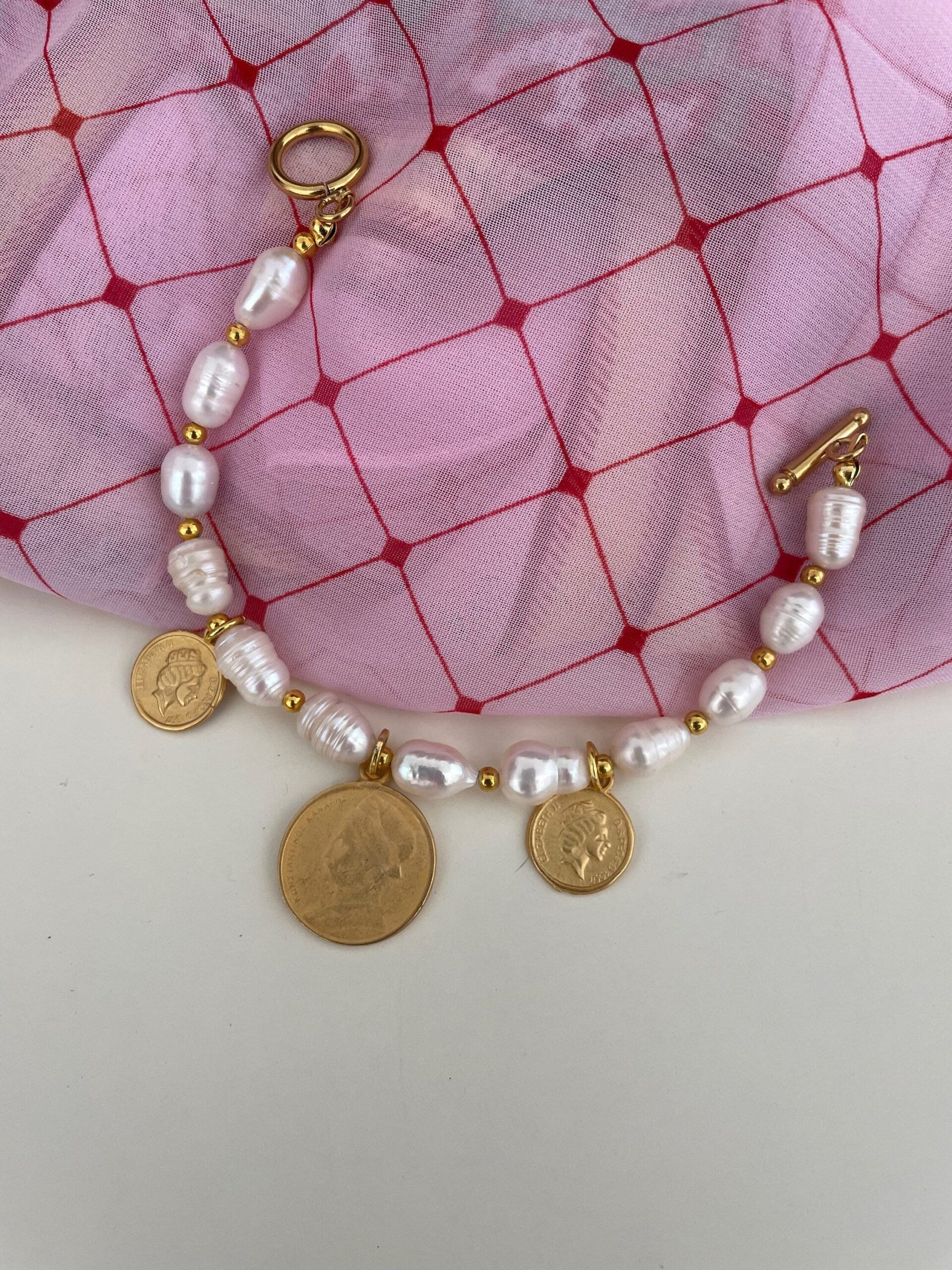 Bracciale con filo di perle di fiume e perline dorate e charms assortiti.