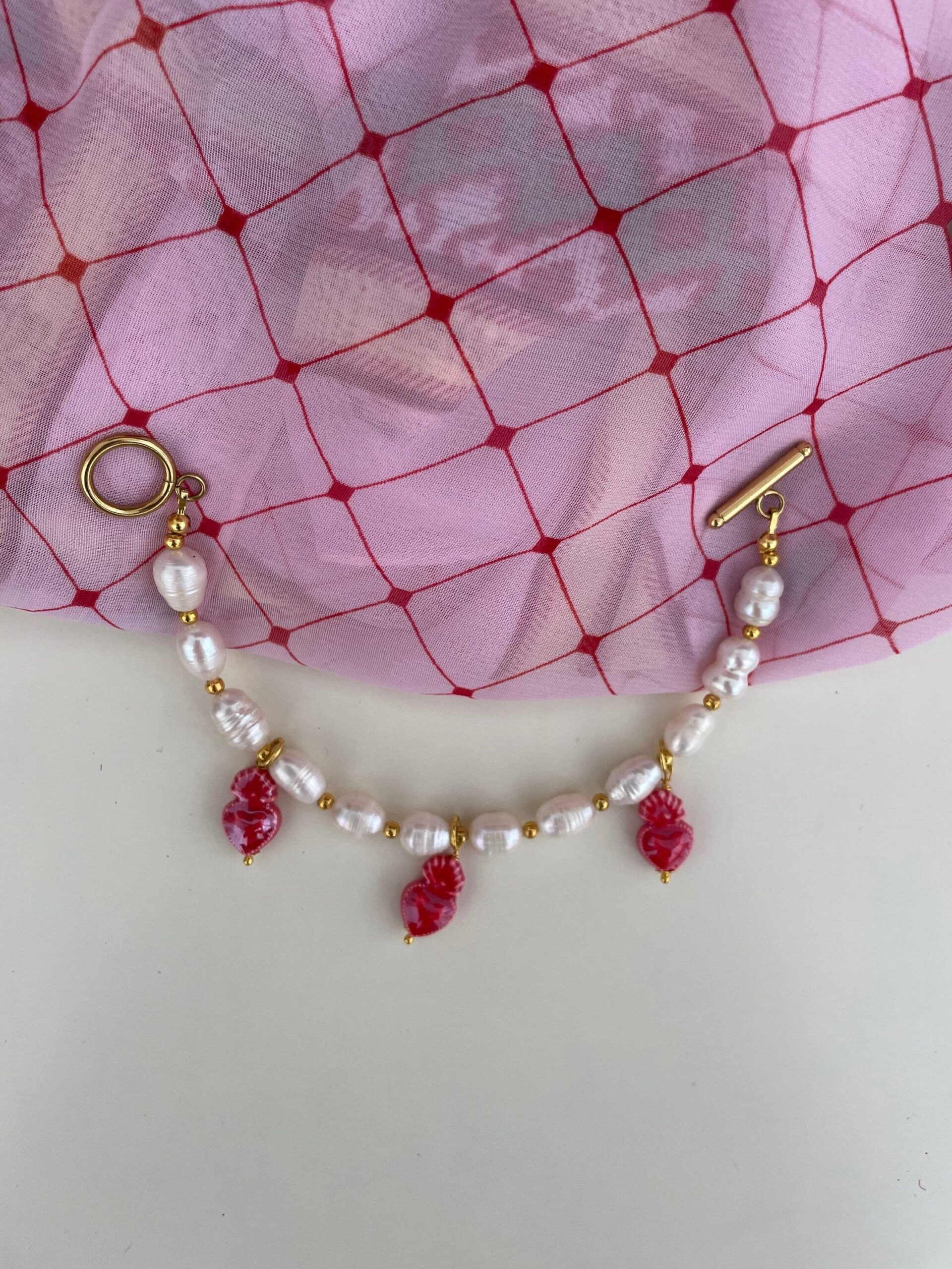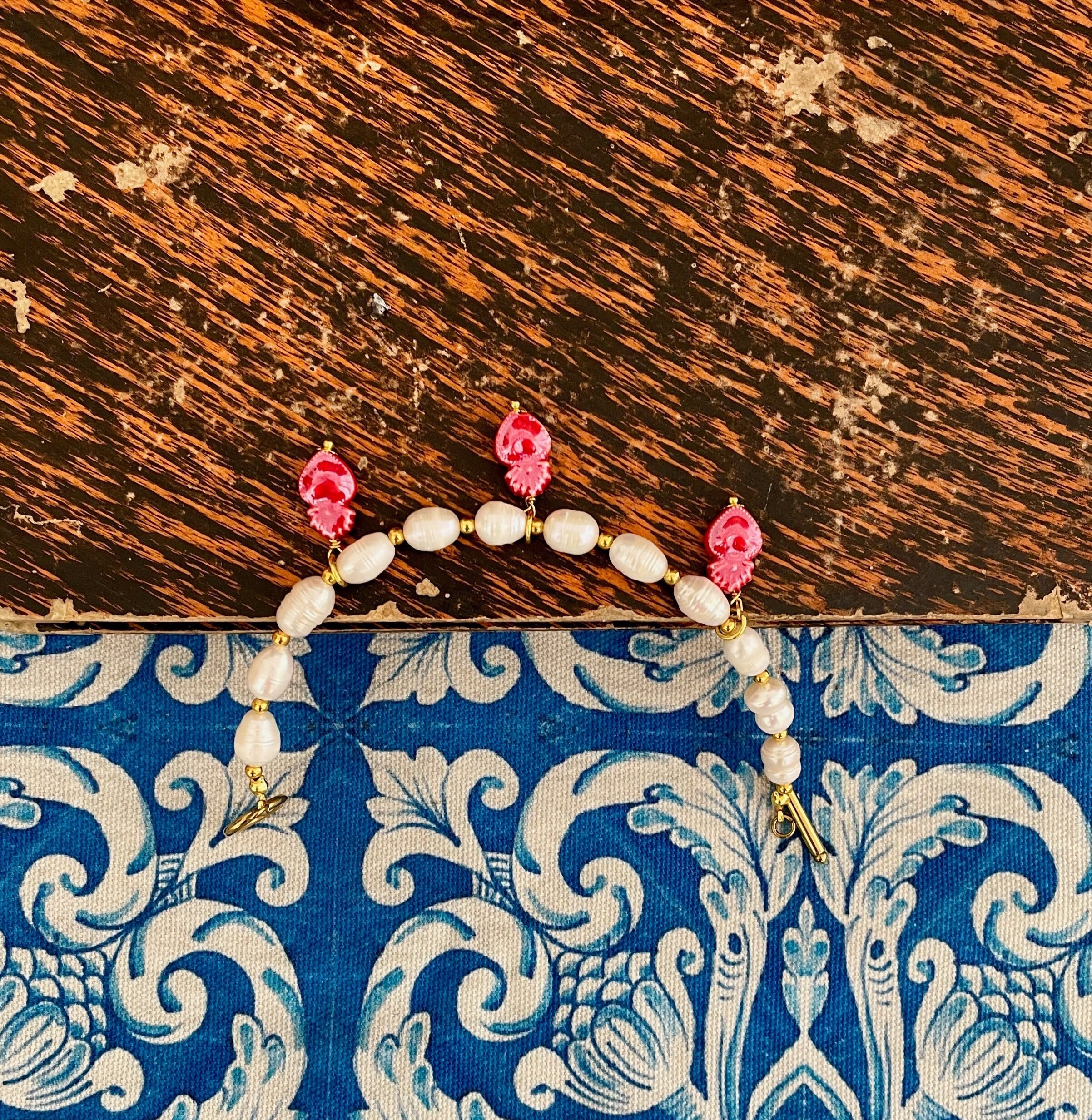 Completano l’accessorio tre charms in ceramica rosso fragola raffiguranti cuori.