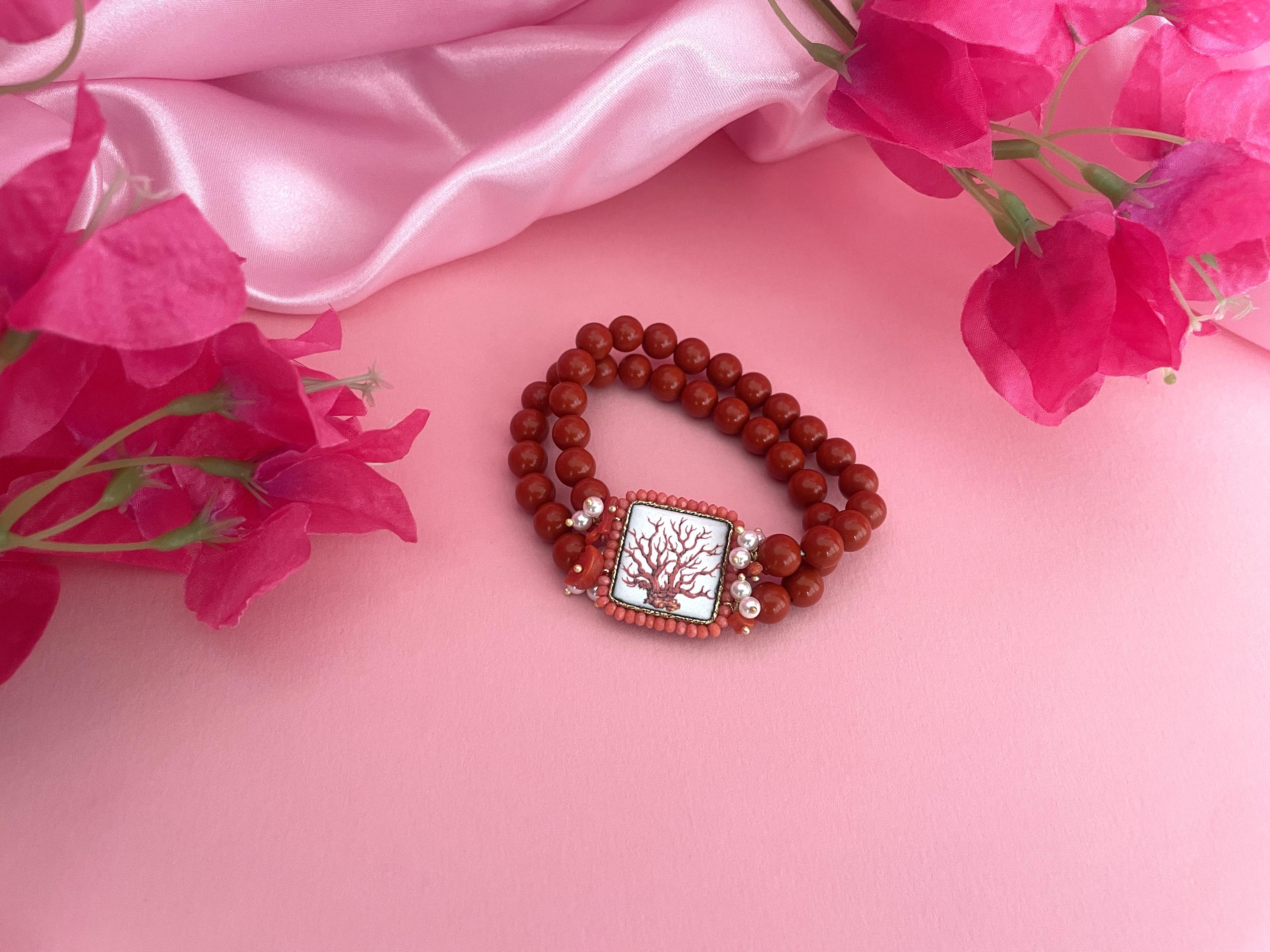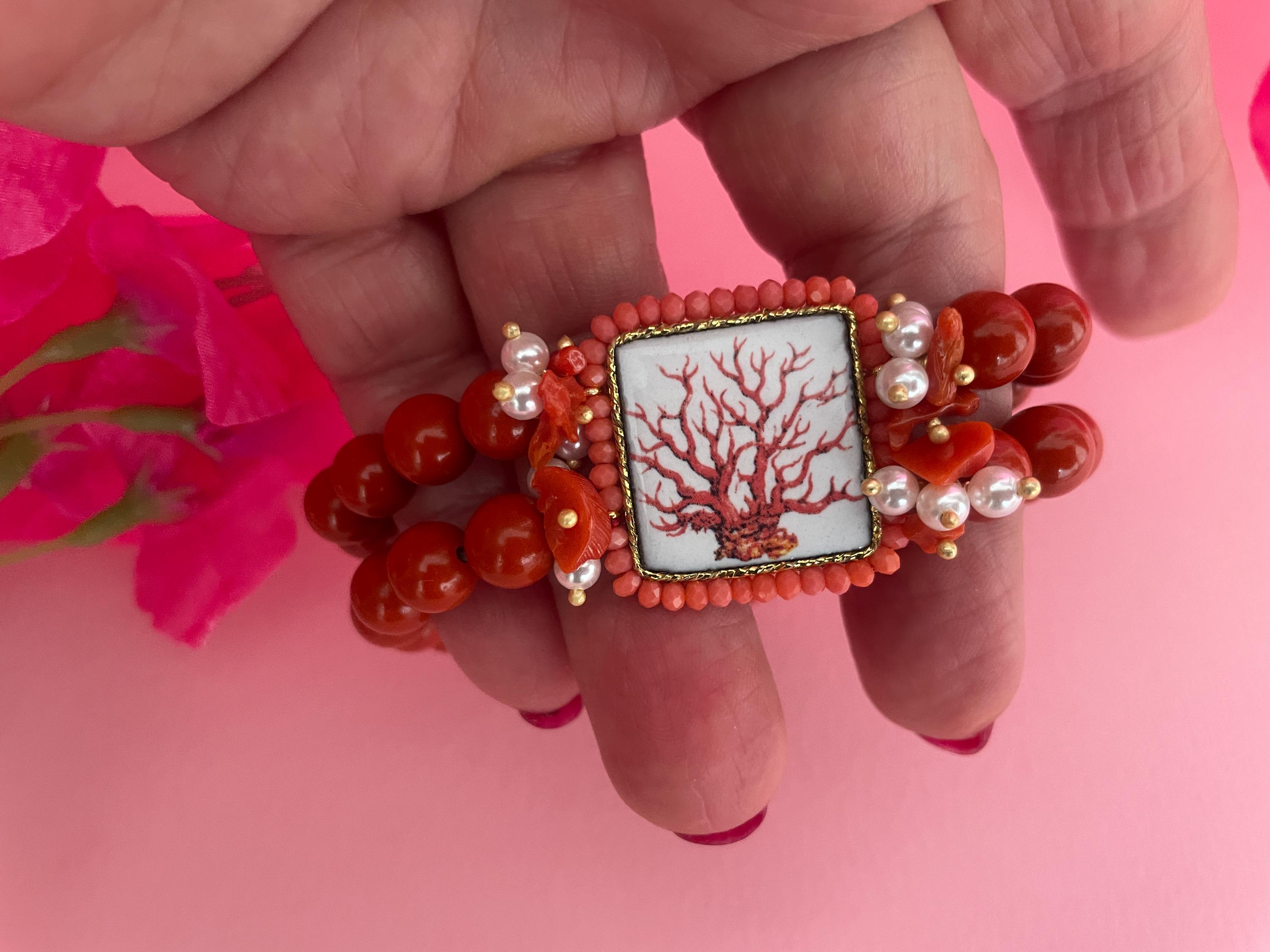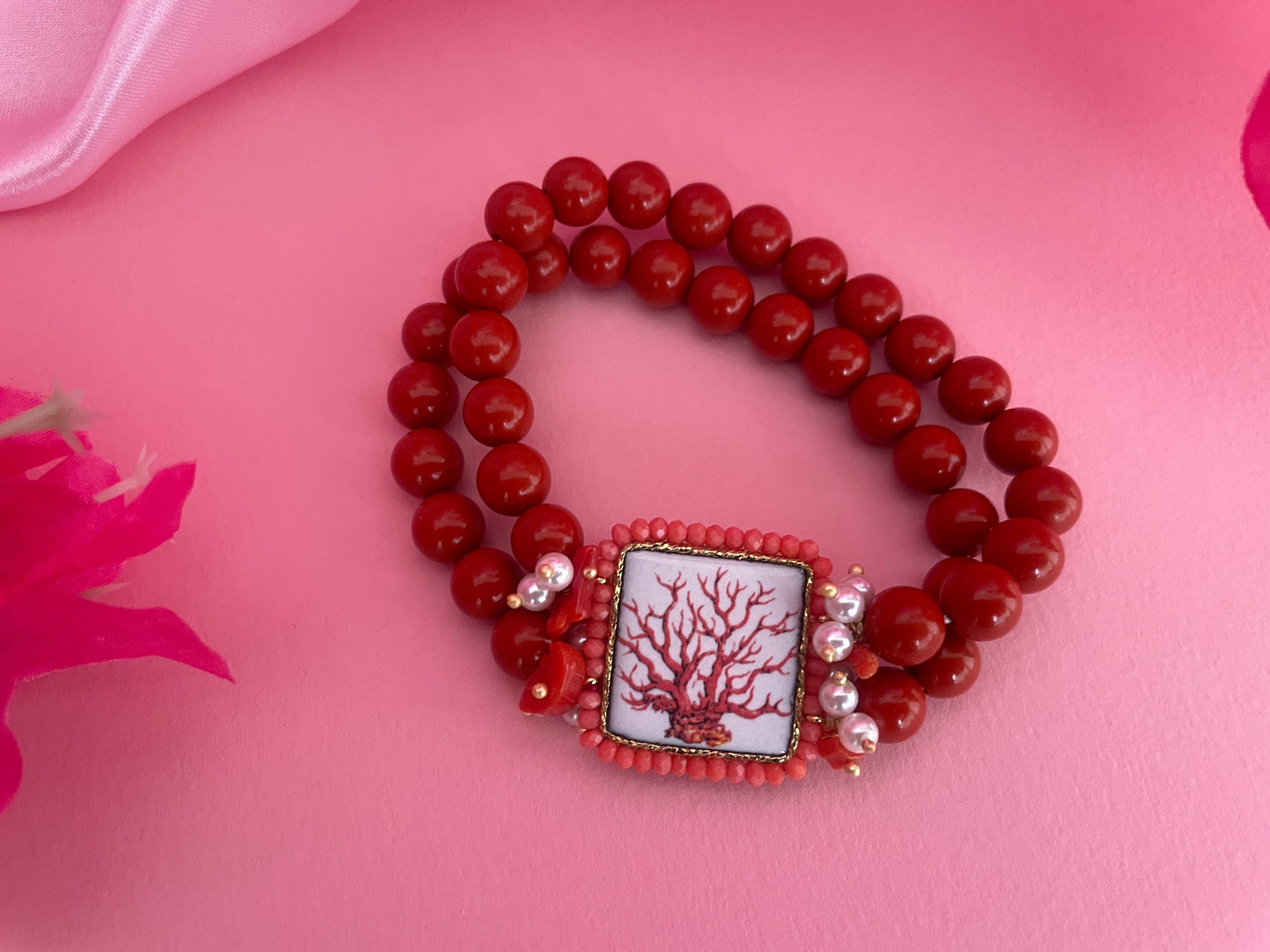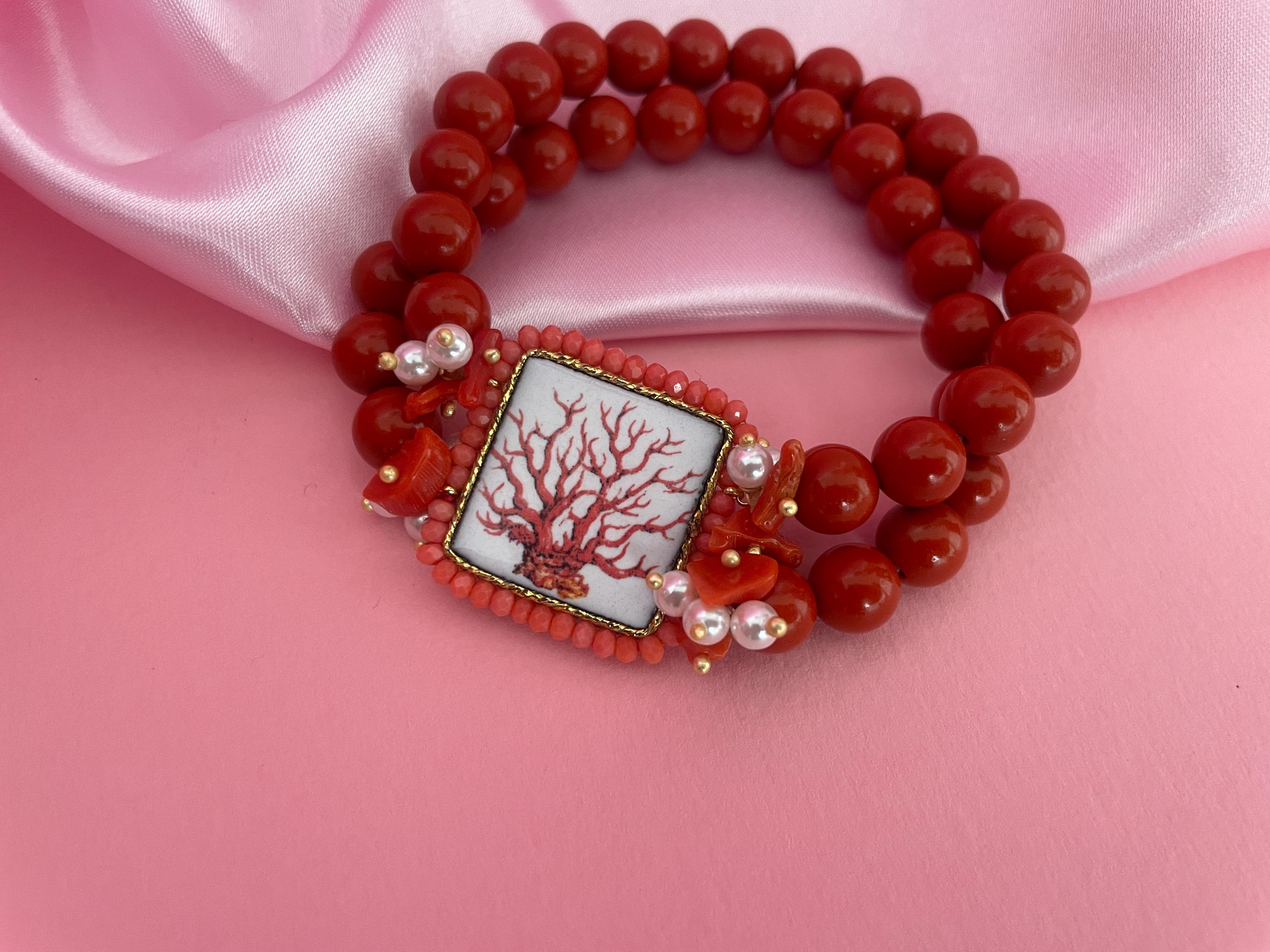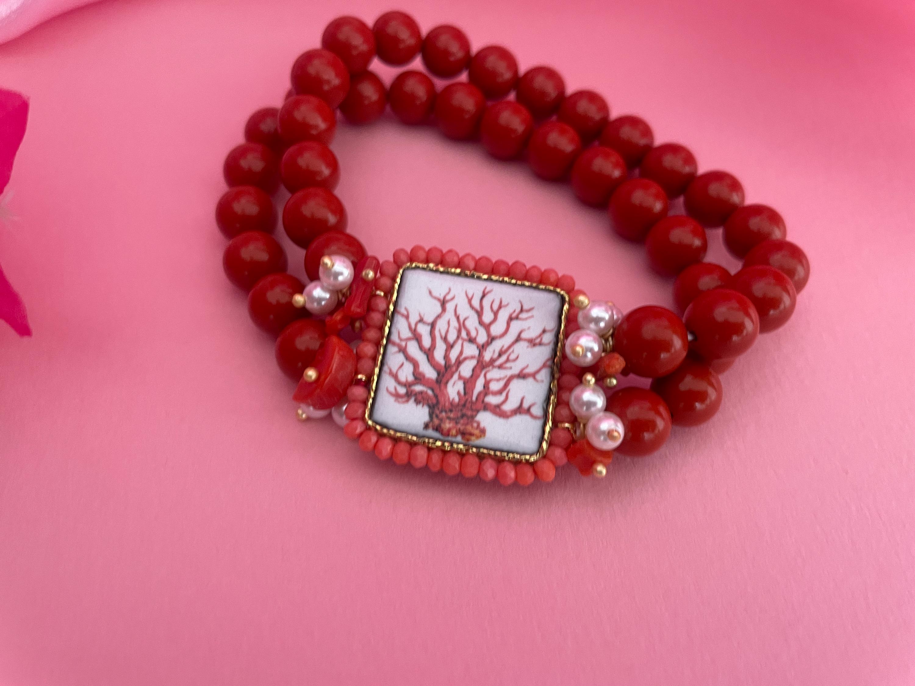 Realizzato con due fili di perle Maiorca rosse e mattonella in ceramica di Caltagirone, su base lavica.