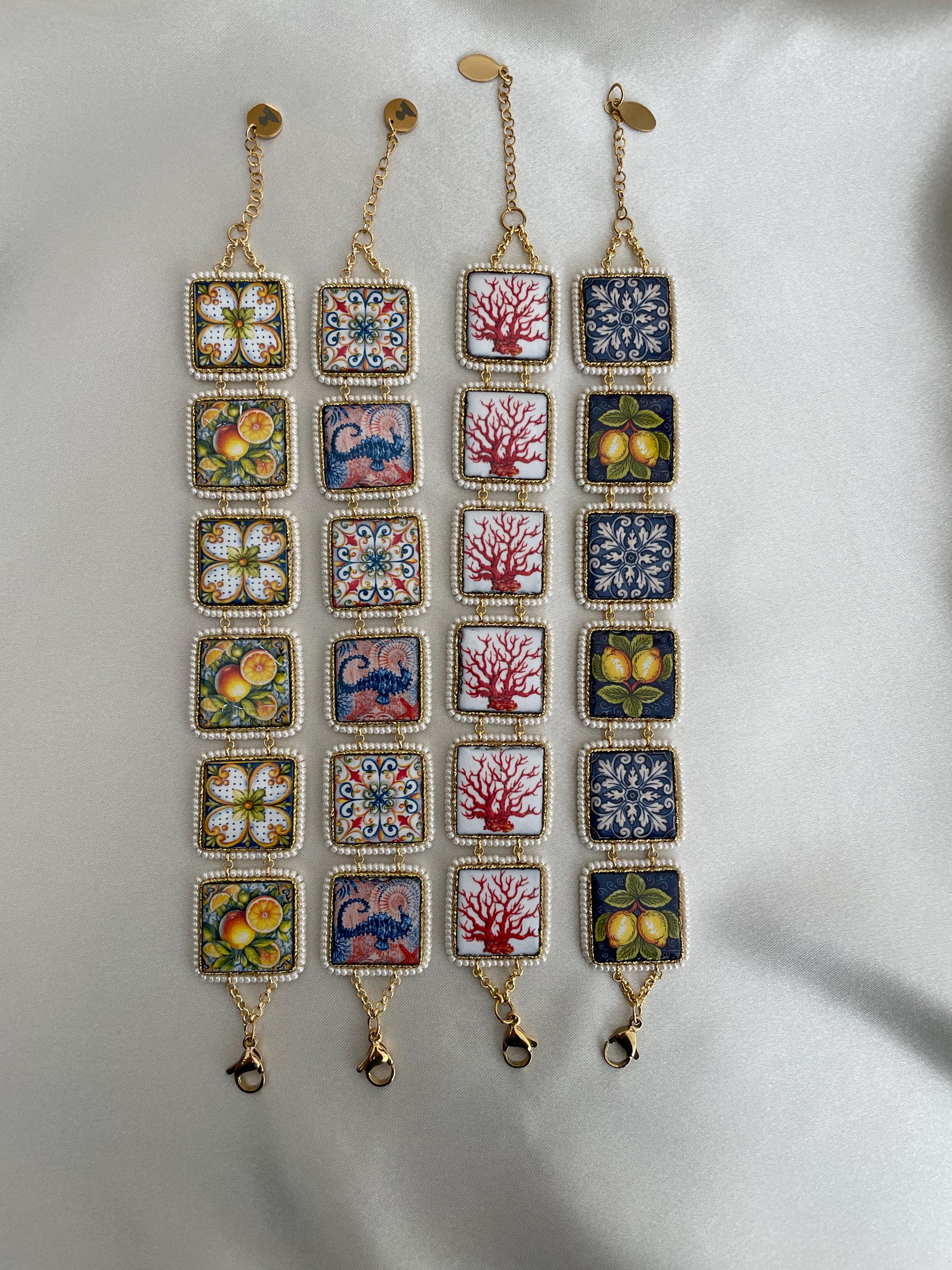 Bracciale con mattonelle, Bracciale siciliano con mattonelle ceramica di Caltagirone, fantasia maiolica siciliana, varie fantasie.