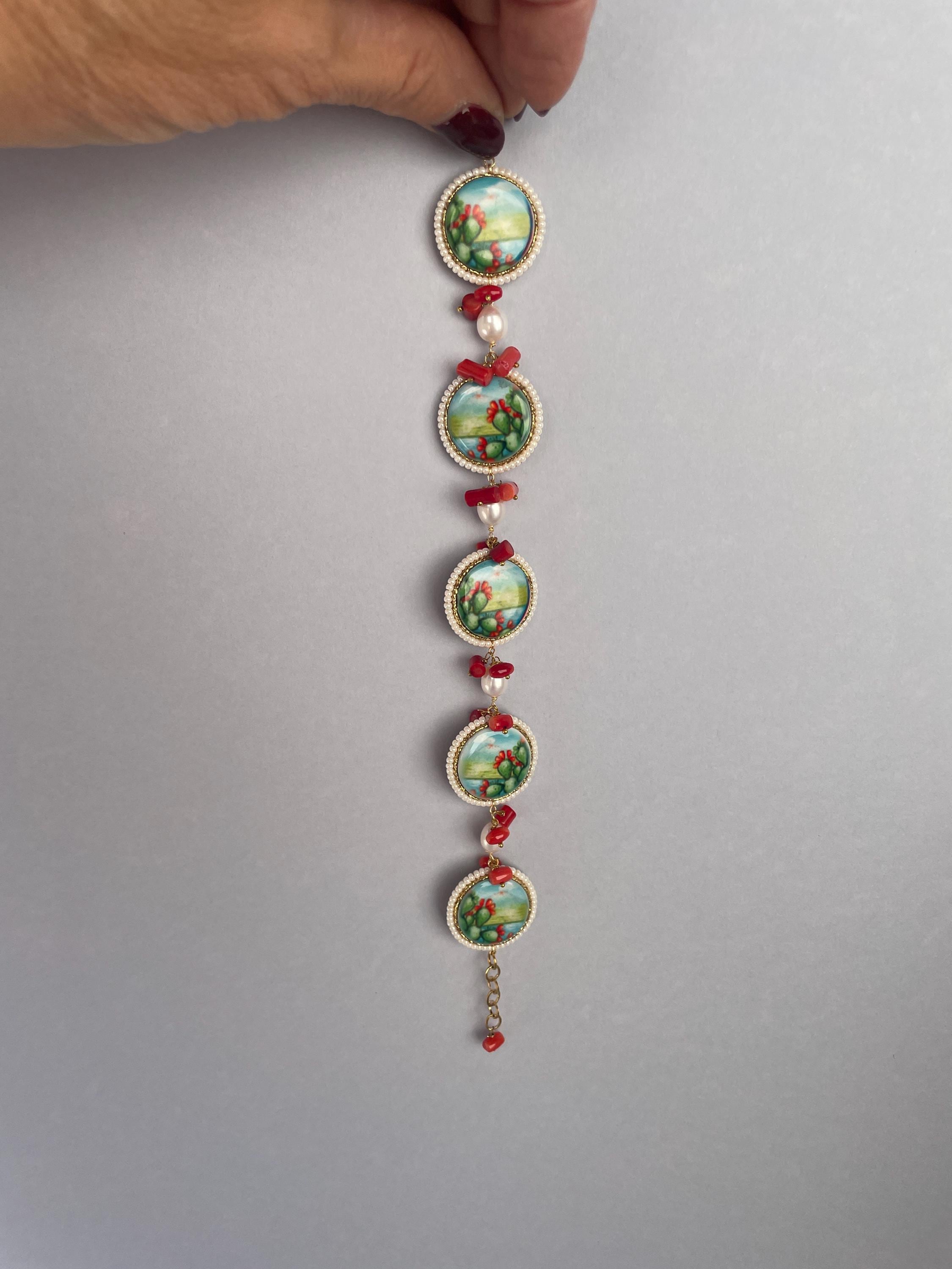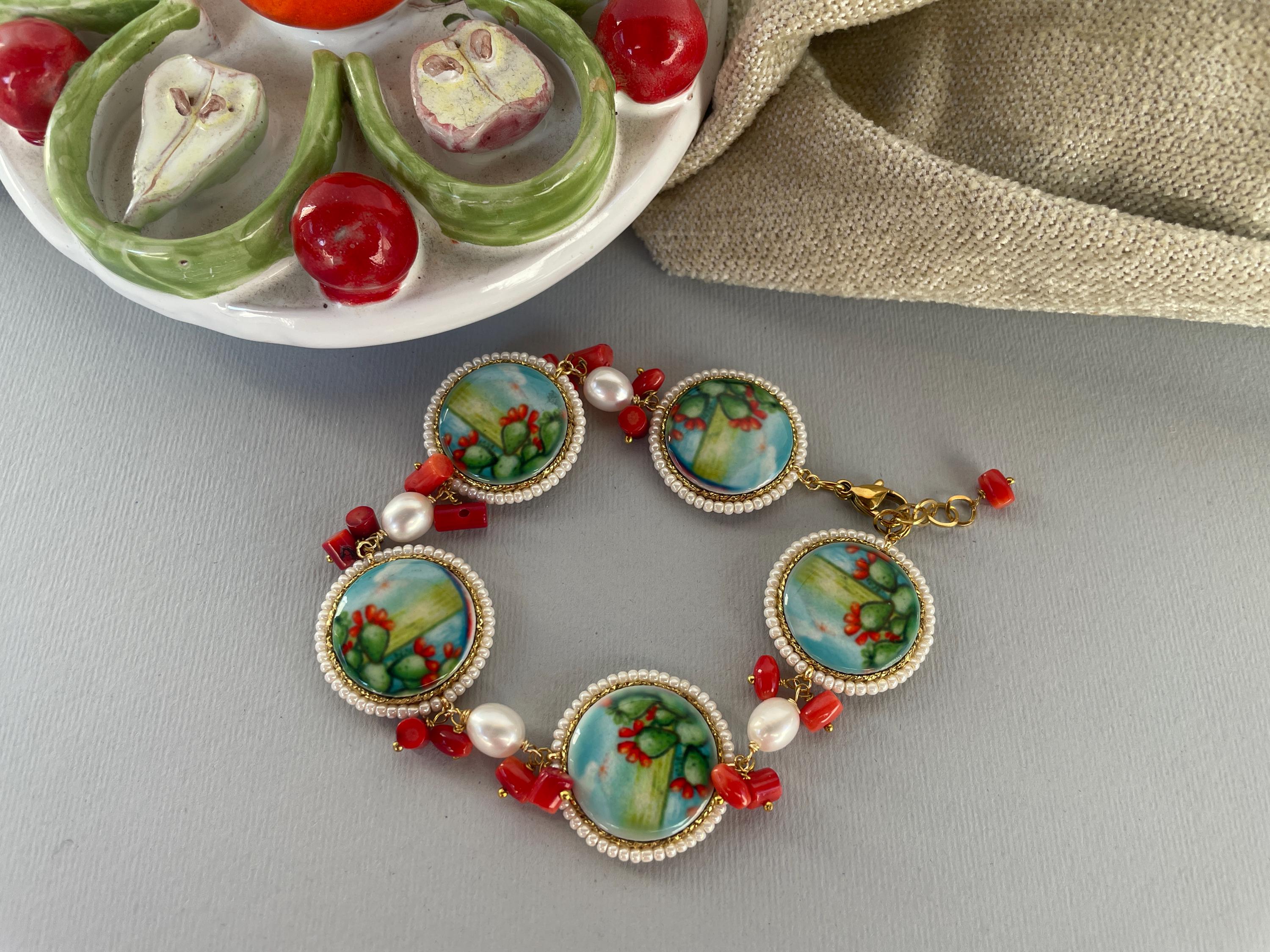 Realizzato con 5 mattonelle tonde di Caltagirone stampate in superficie a tema di Fichi d’India. Ogni mattonella è incorniciata da un filo di microperle di fiume.