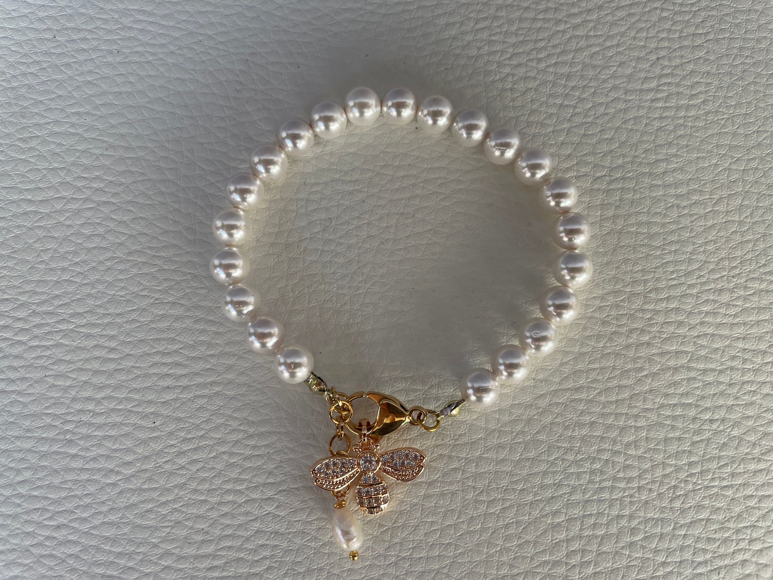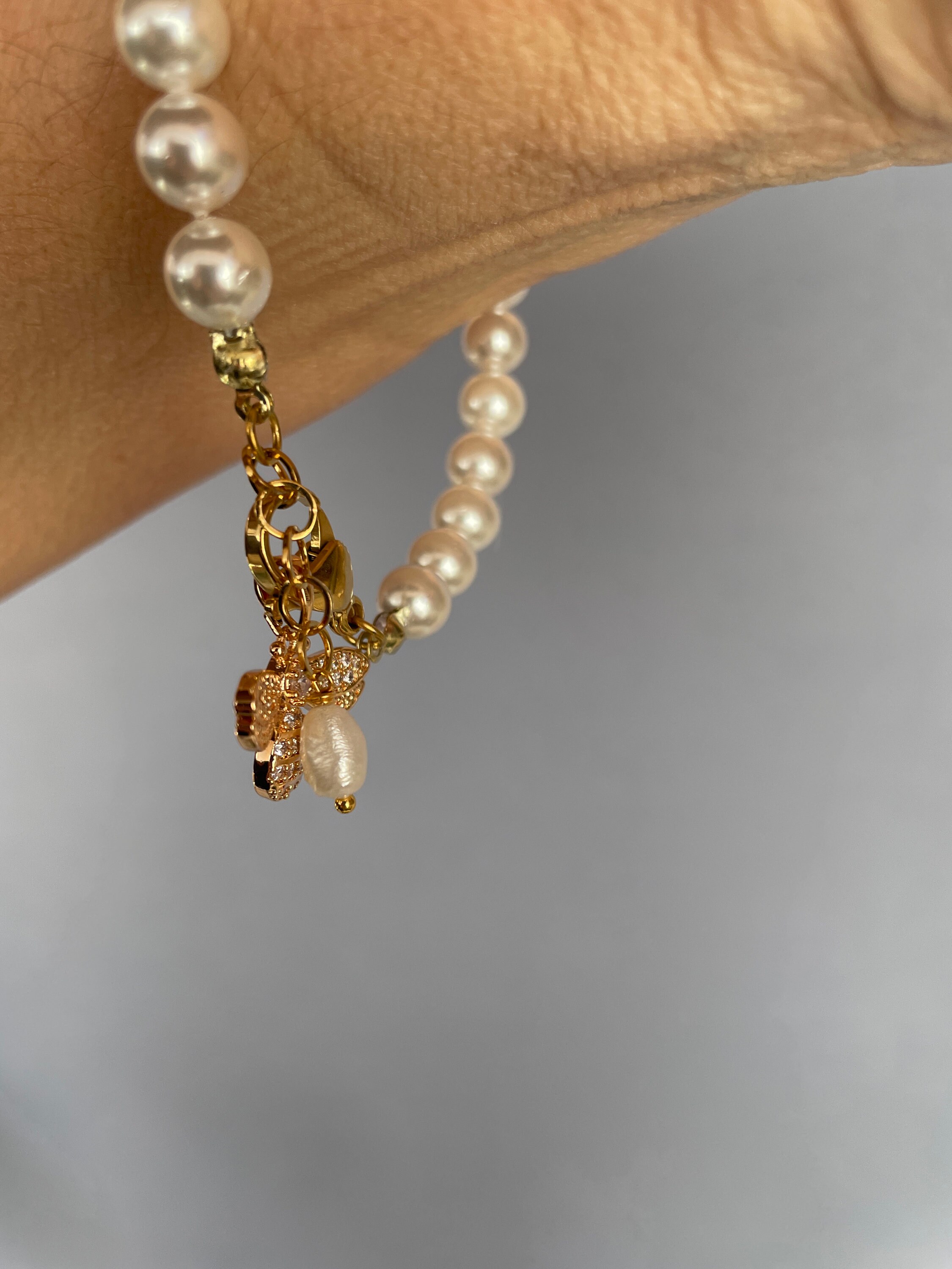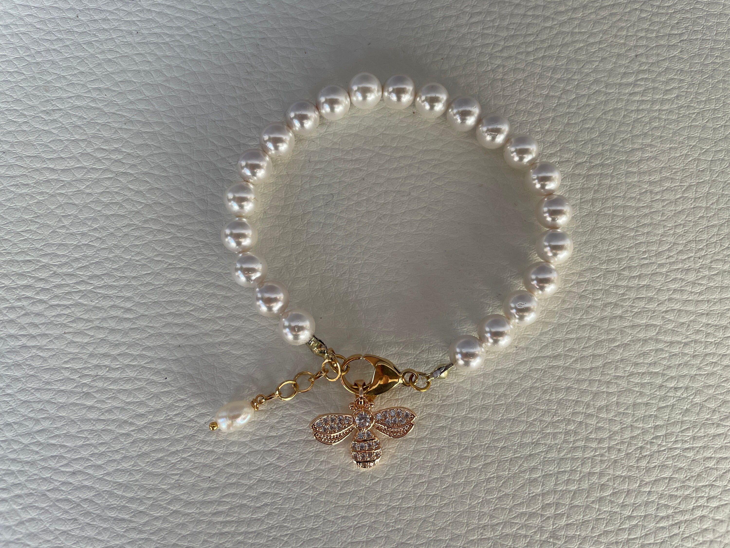 Bracciale di perle con ciondolo in acciaio inossidabile, placcato oro 14k.