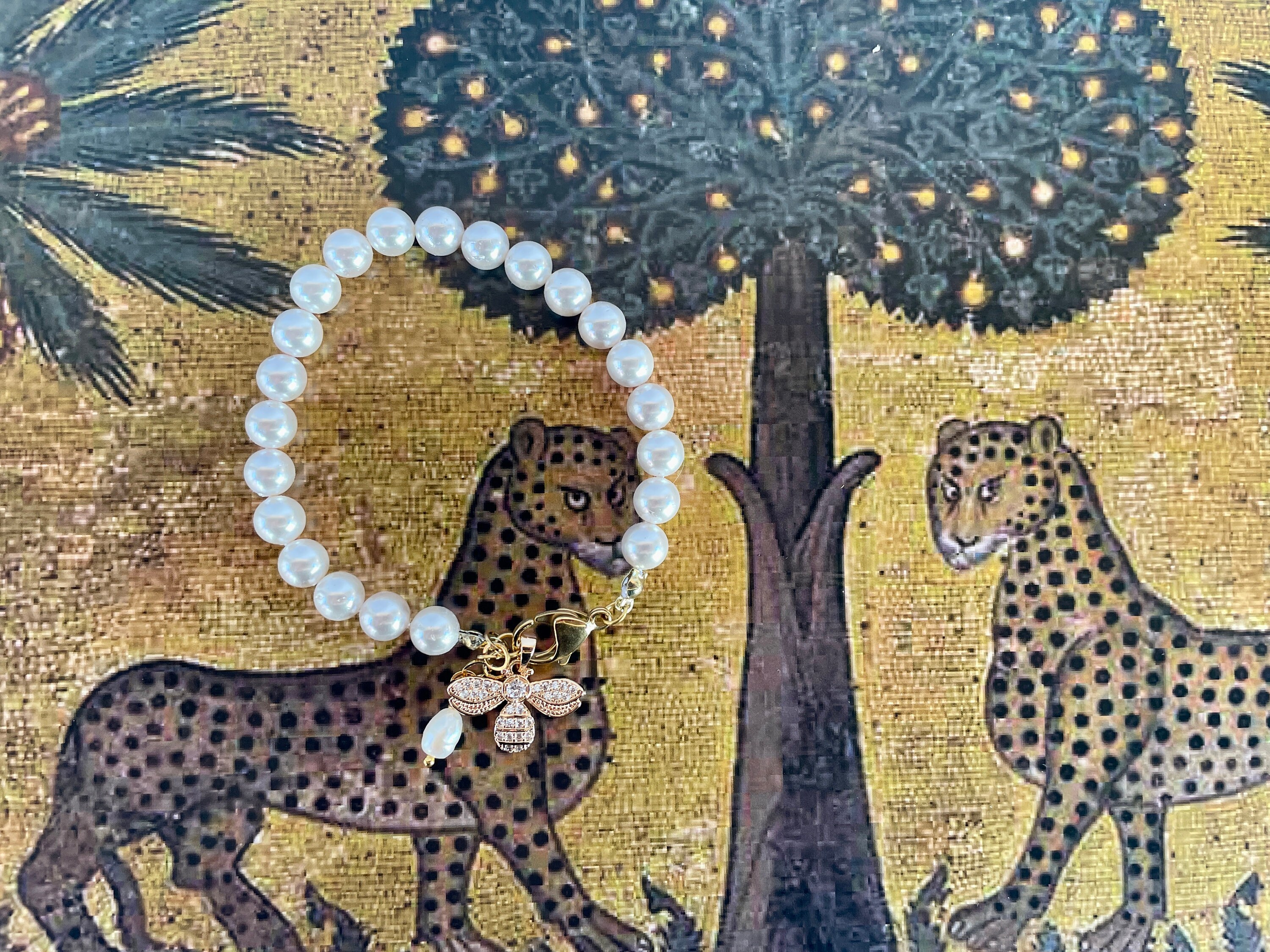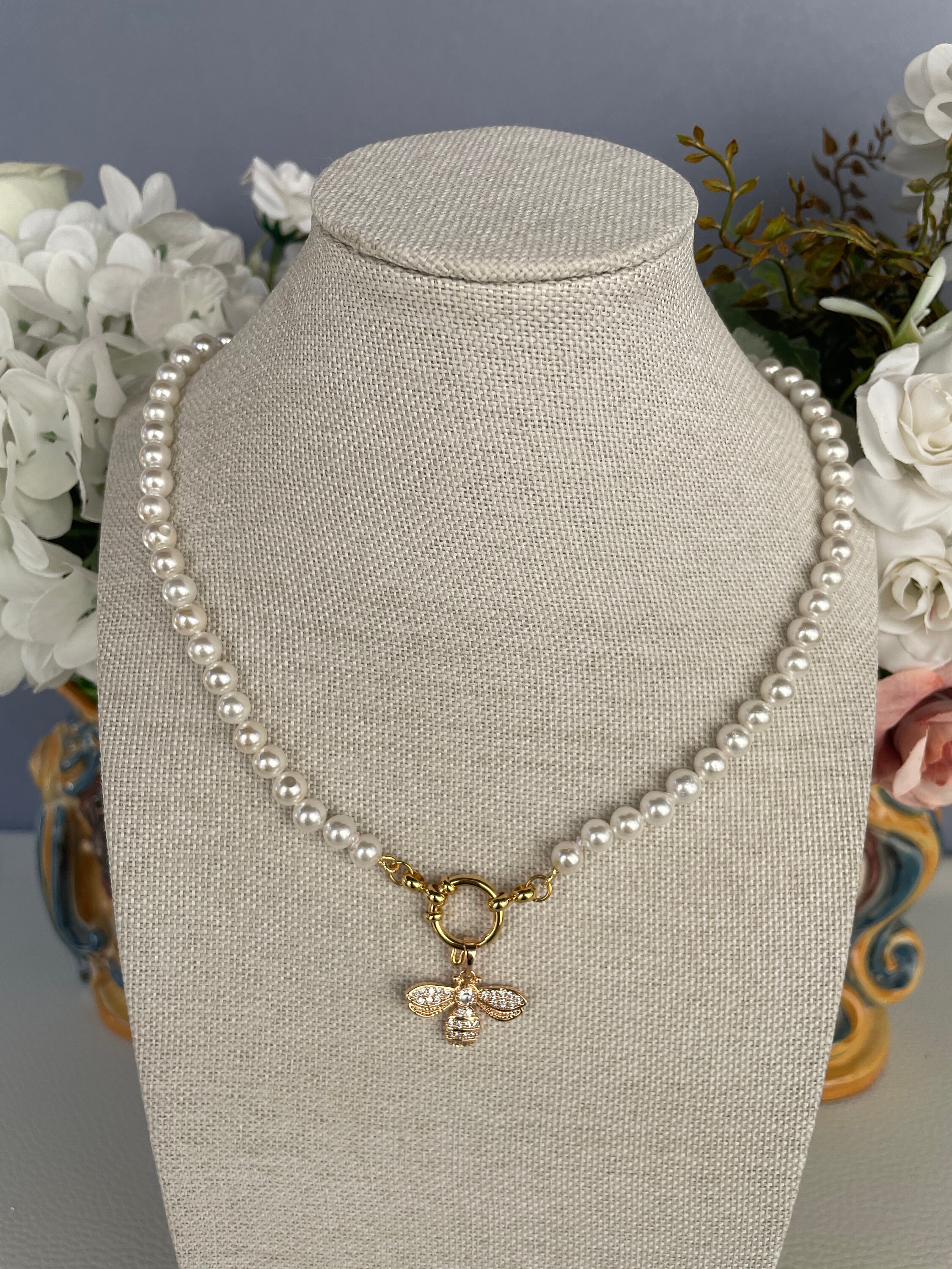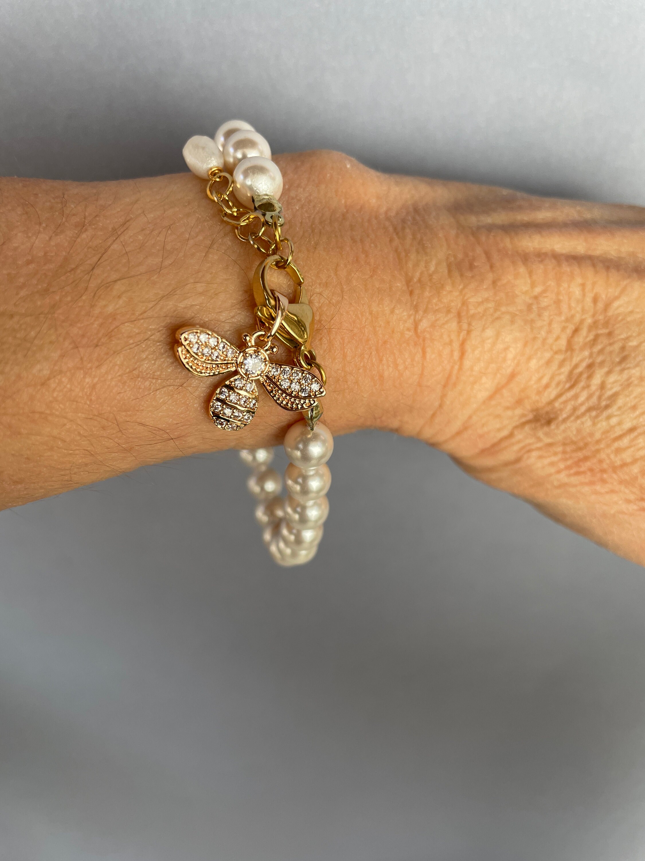 Bracciale di perle con ciondolo in acciaio inossidabile, placcato oro 14k.
