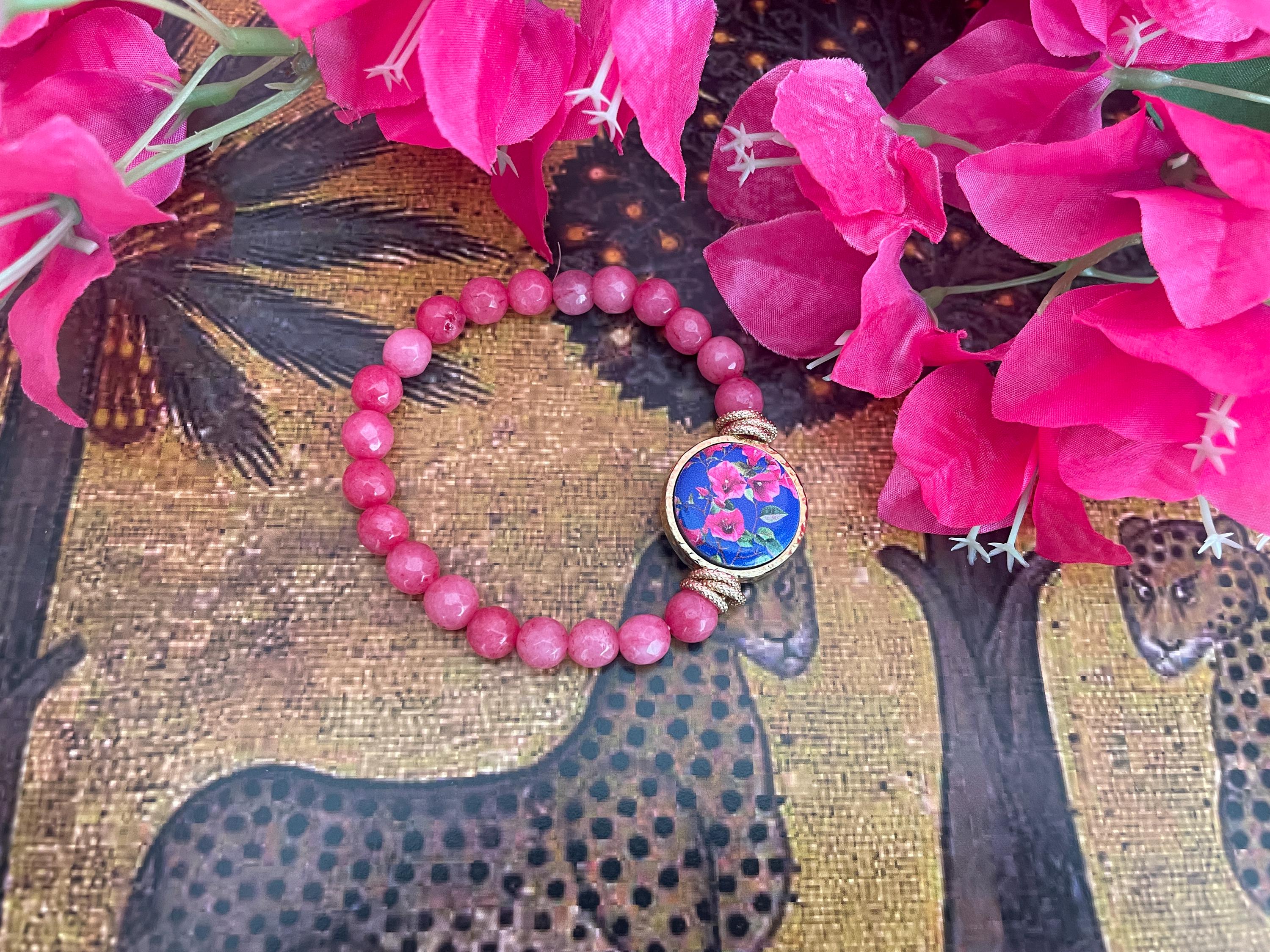 ️Delizioso bracciale elastico con filo di perle di Agata rosa, mattonella tonda di ceramica di Caltagirone, stampata in superficie a motivo Bouganvillea rosa su fondo viola.