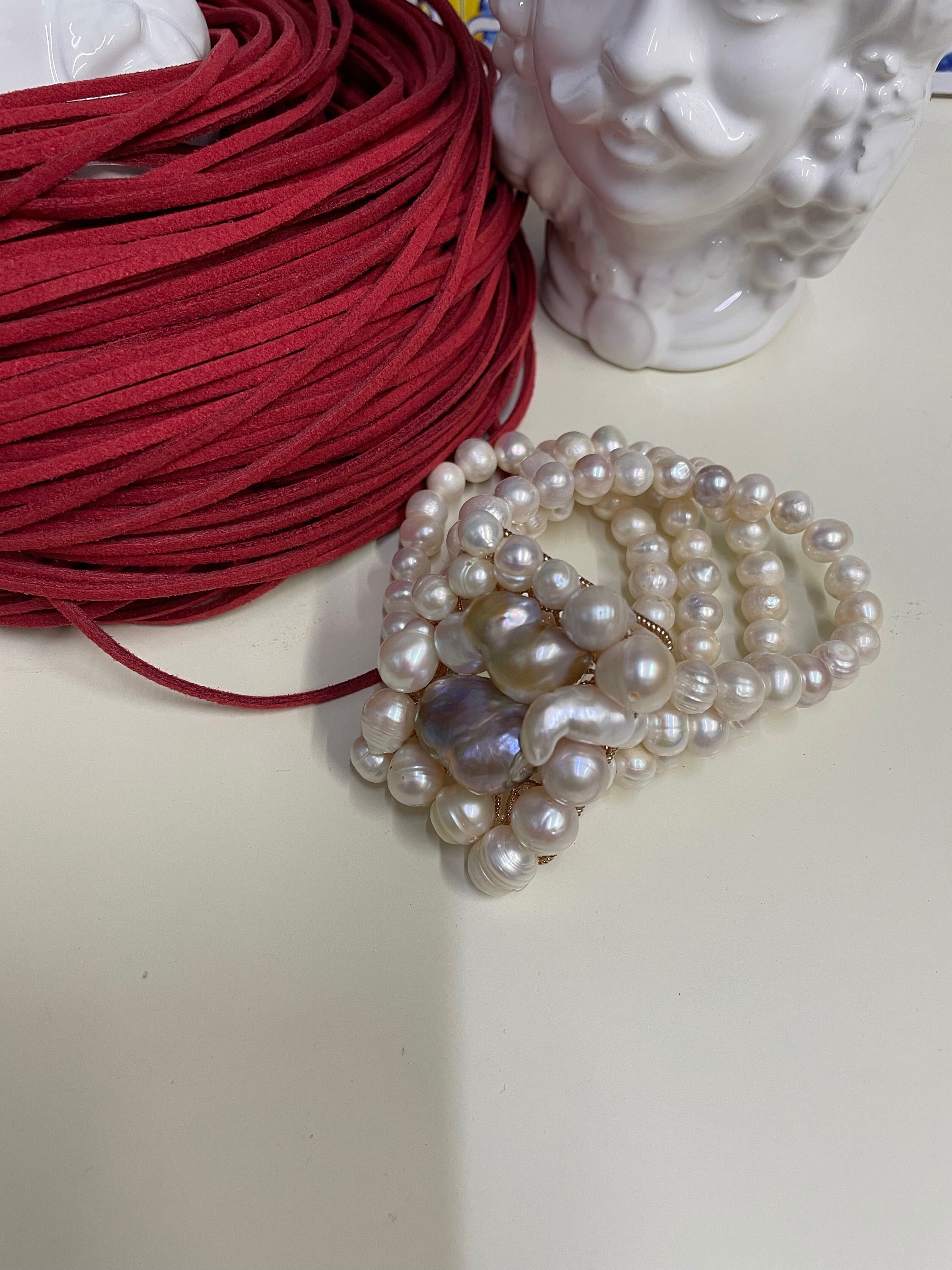 Composto da quattro fili di perle barocche e piastra di ottone su cui sono montate perle barocche irregolari e barocche ovali.