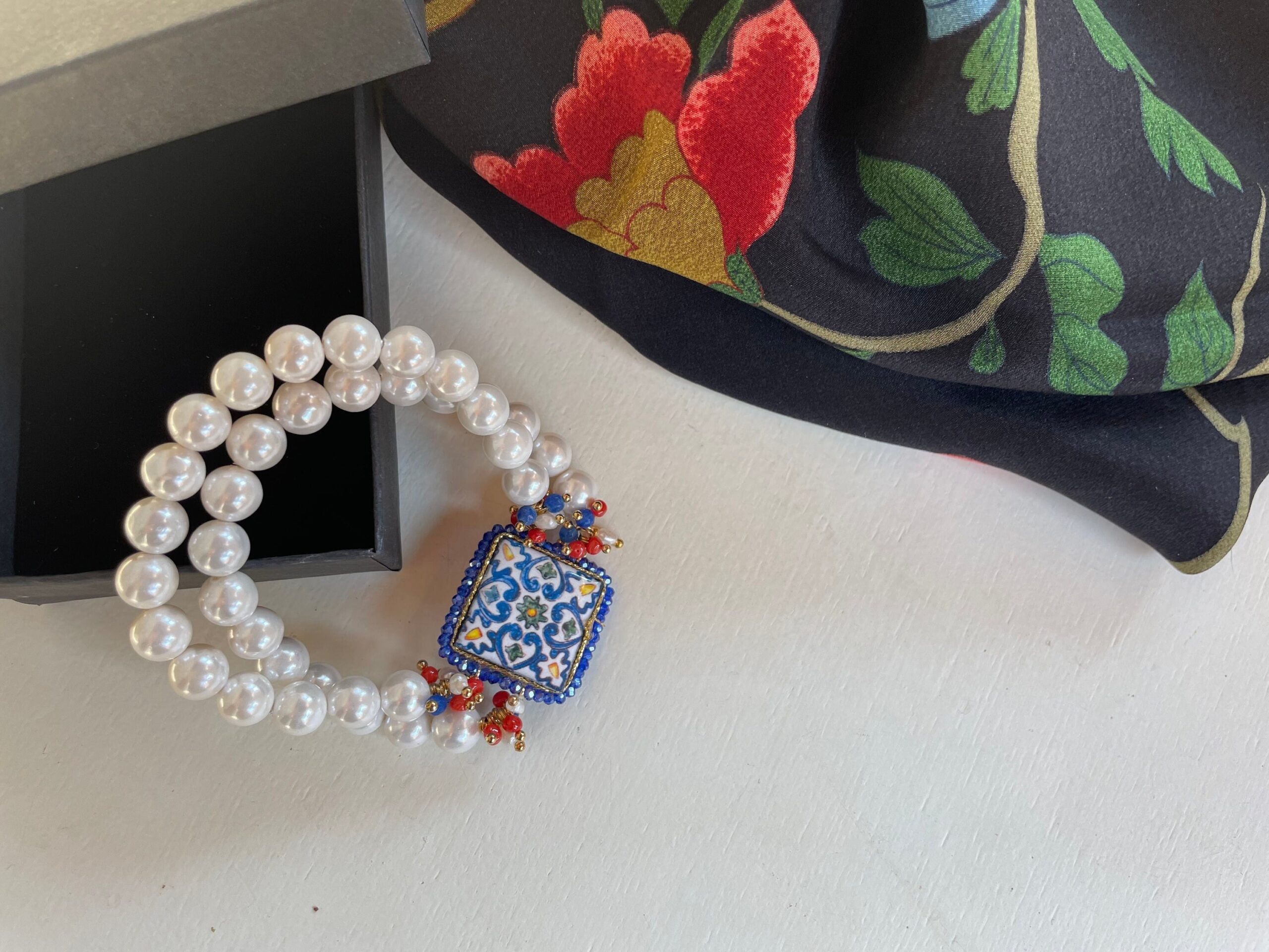 Realizzato con due fili di perle Maiorca e mattonella in ceramica di Caltagirone, su base lavica.
