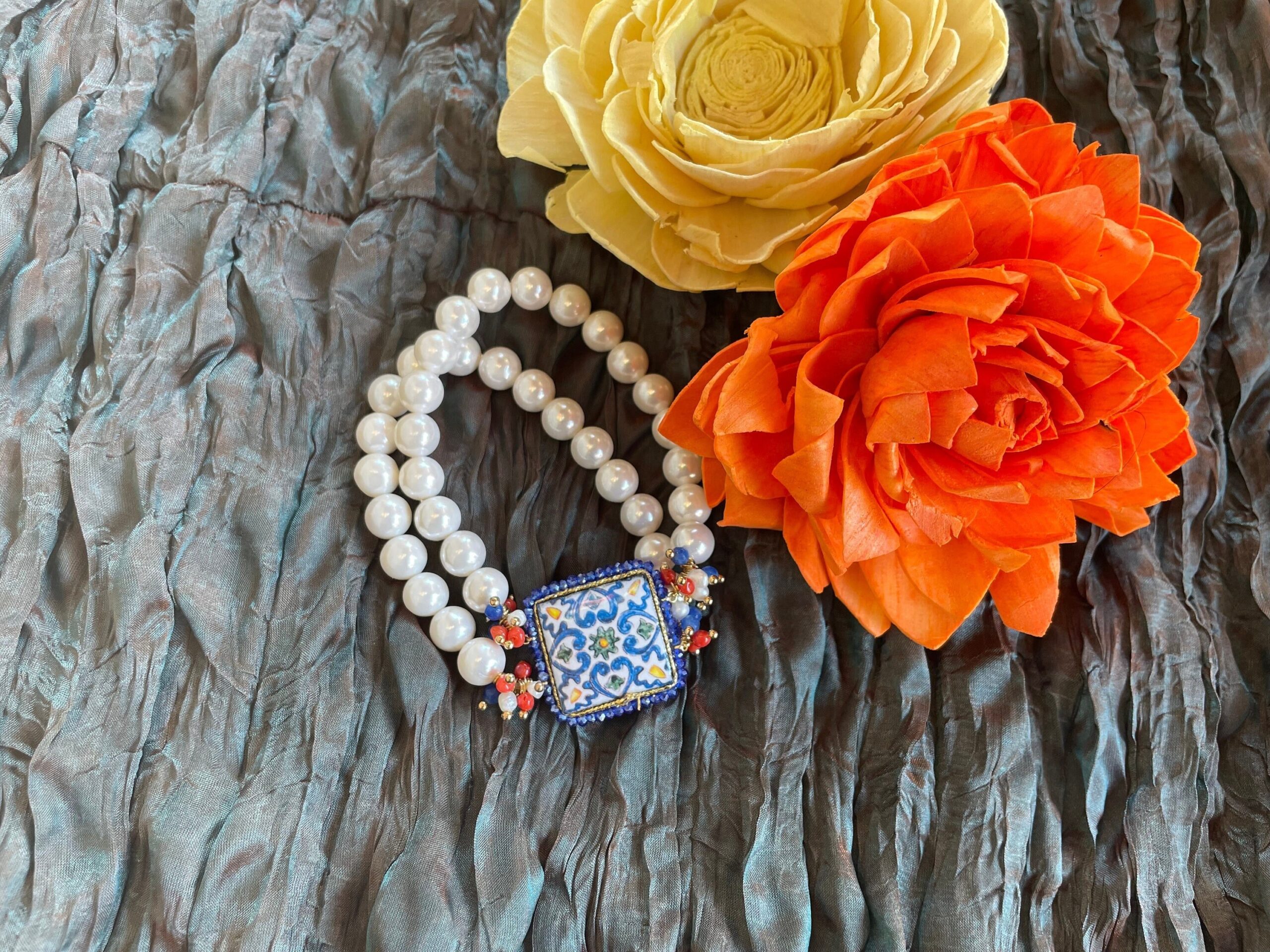 La mattonella, stampata in superficie, raffigura motivi tipici della maiolica siciliana ed è incorniciata da filo di microperle di fiume.
