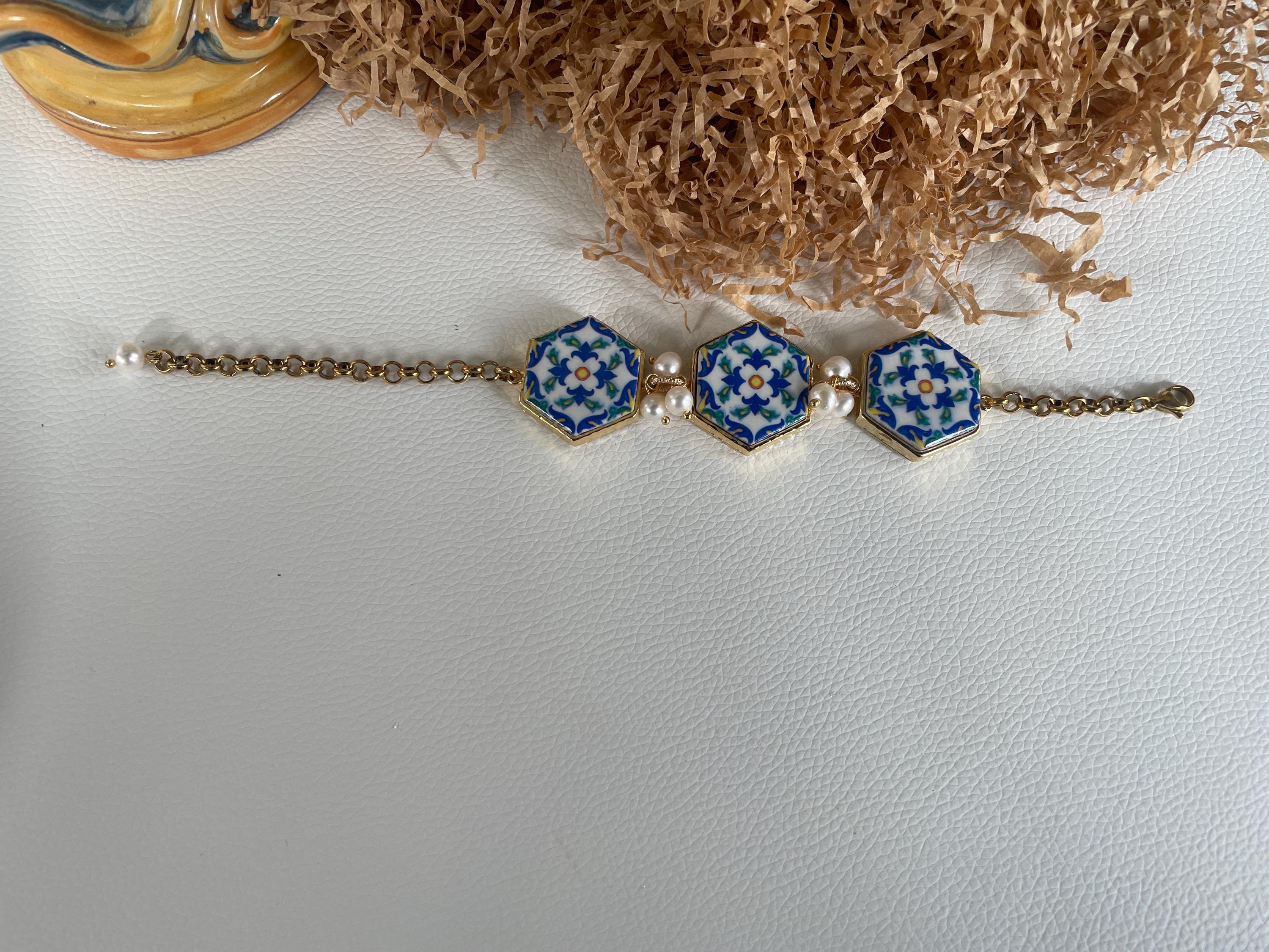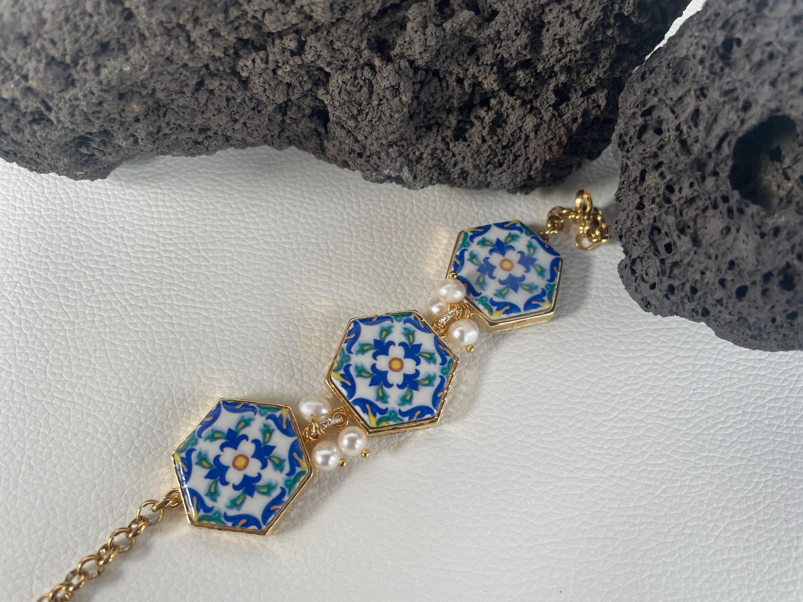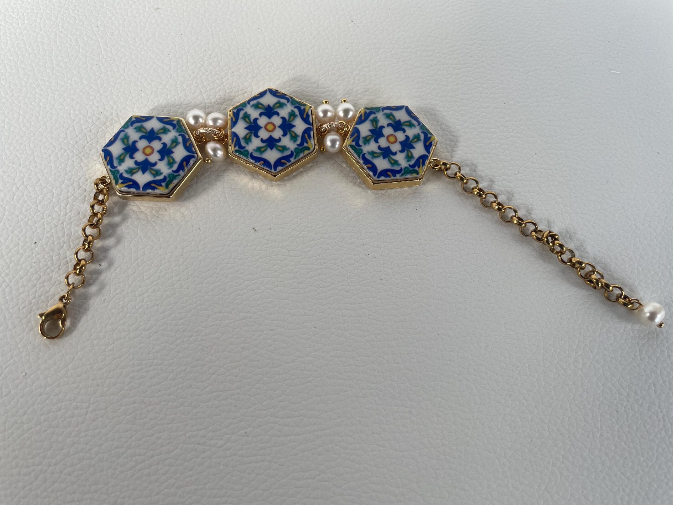 Ogni mattonella è incastonata su una base di ottone lucido e fra una mattonella e l’altra tre perle di fiume.