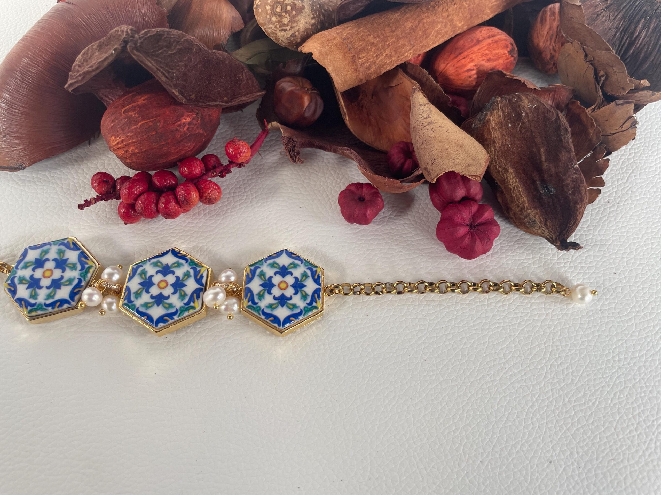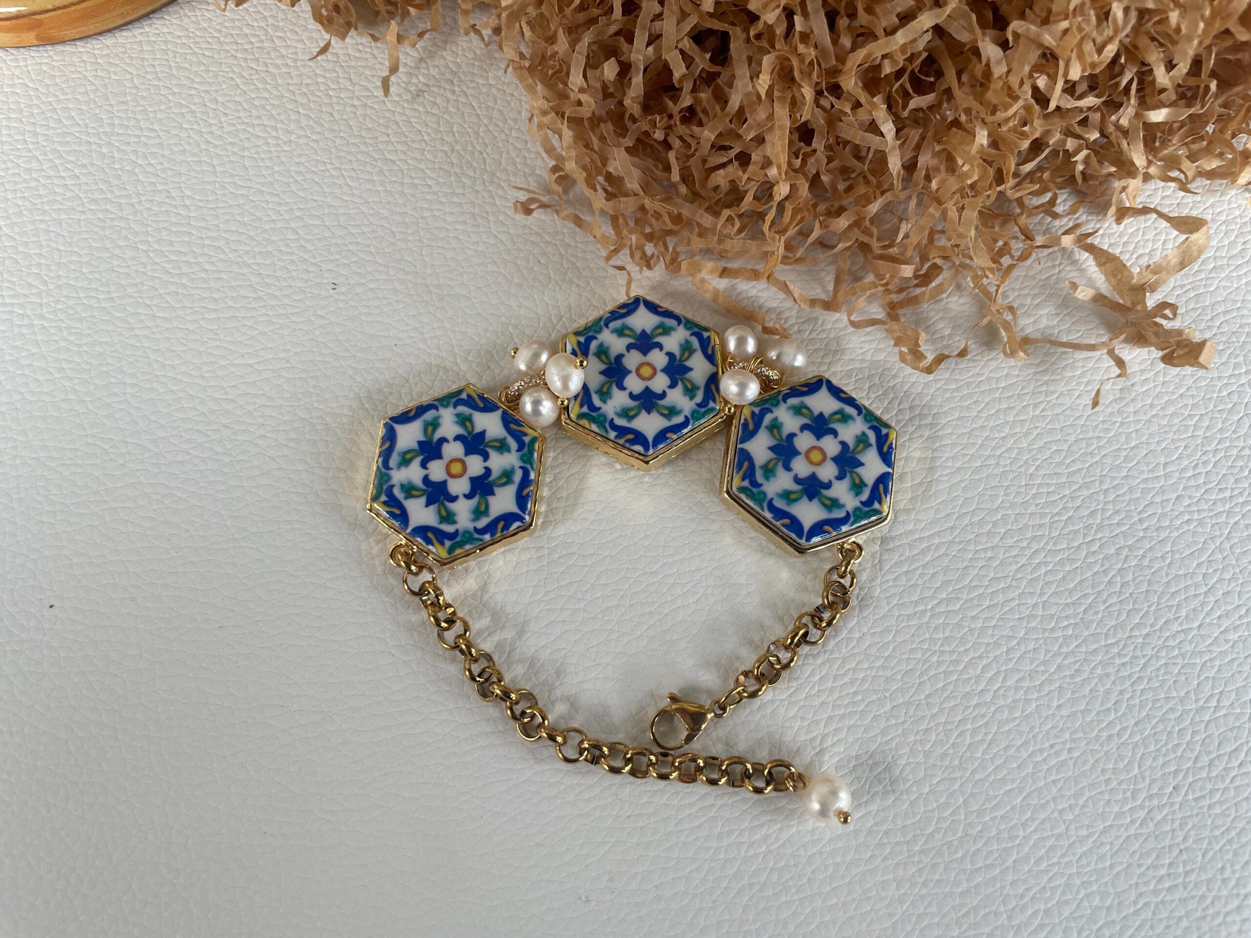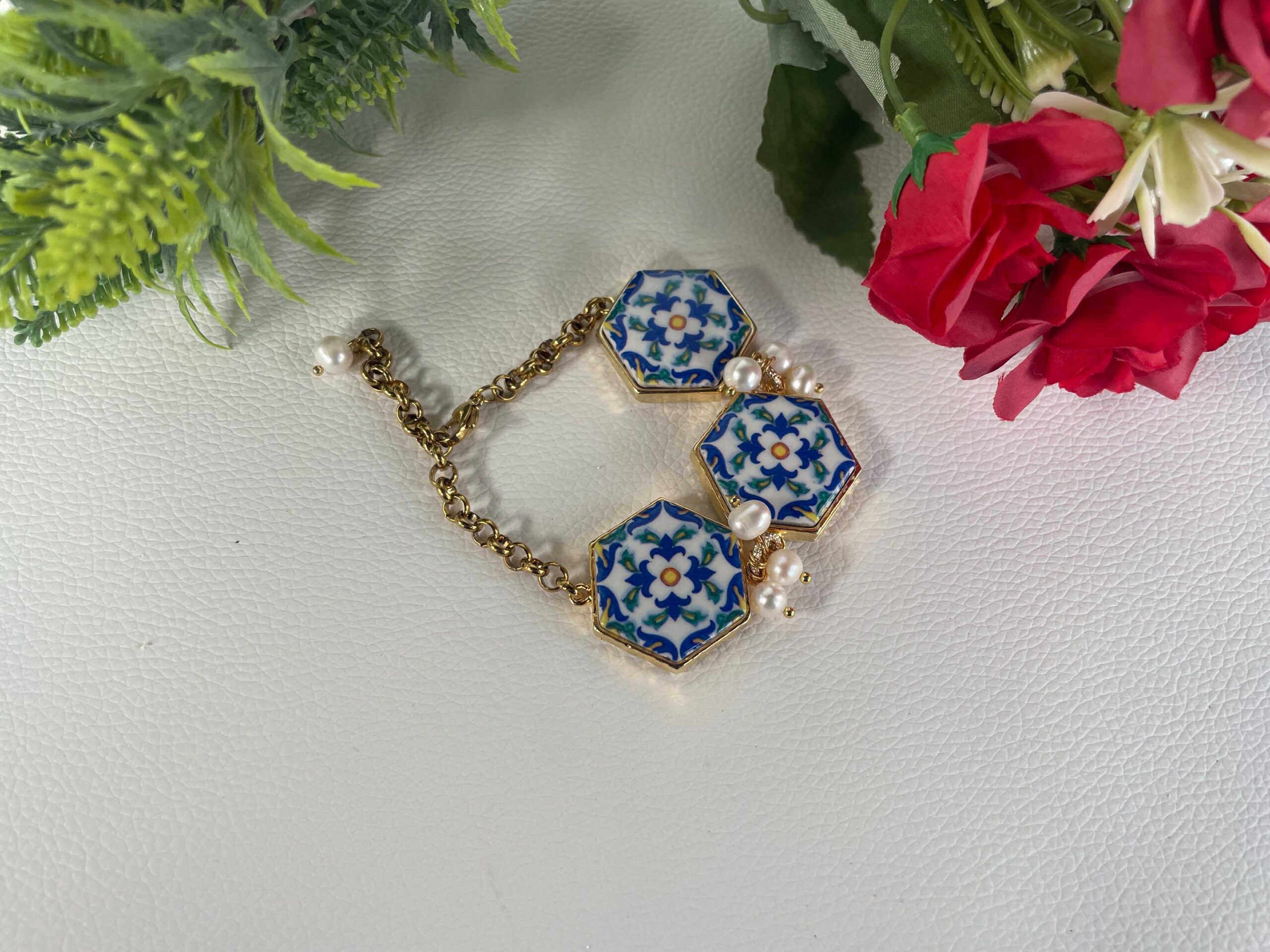 Ogni mattonella è incastonata su una base di ottone lucido e fra una mattonella e l’altra tre perle di fiume.
