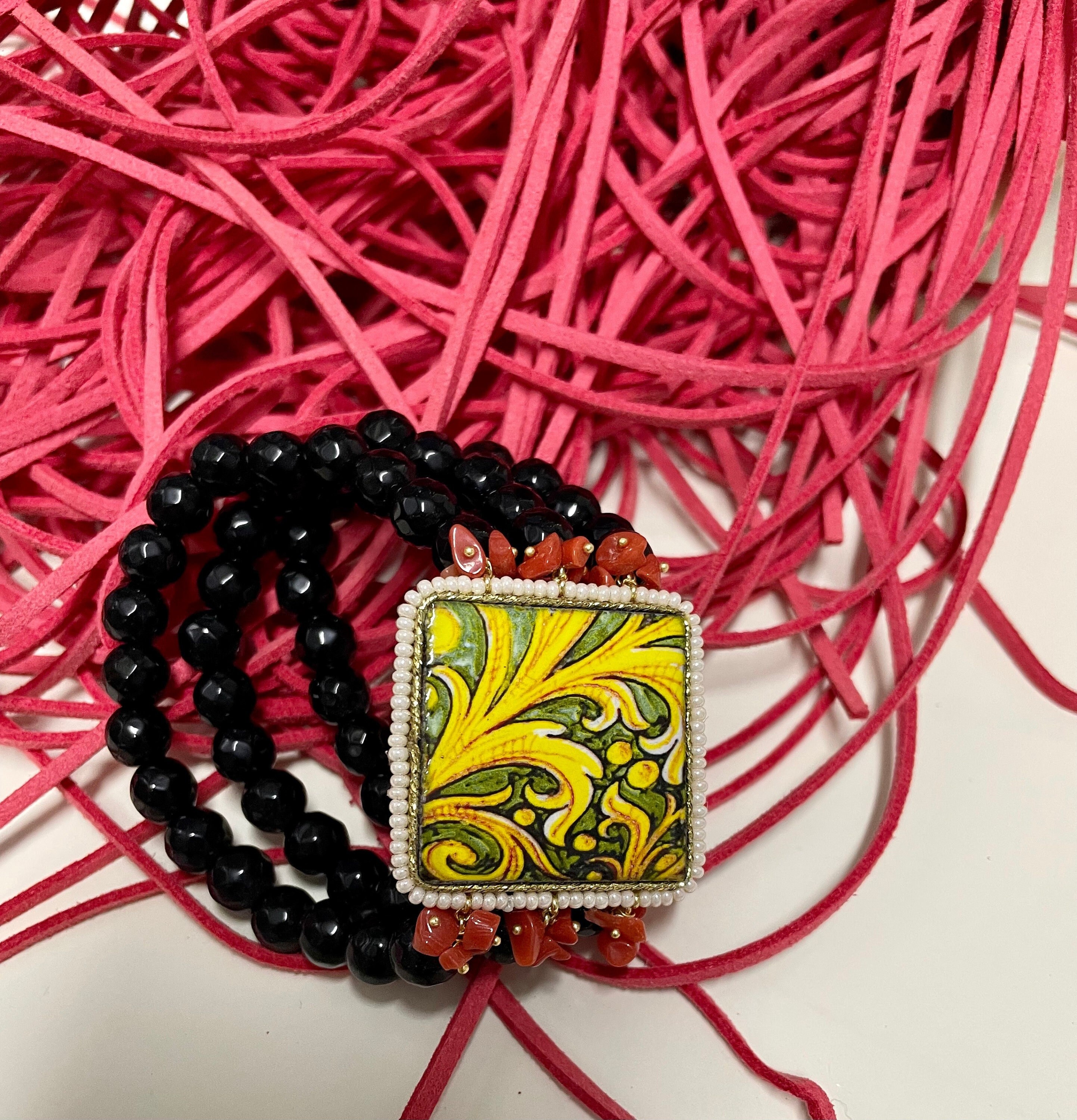 Realizzato con tre fili di perle di onice, mattonella in ceramica di Caltagirone, stampata in superficie, a motivo floreale e chips di corallo rosso.