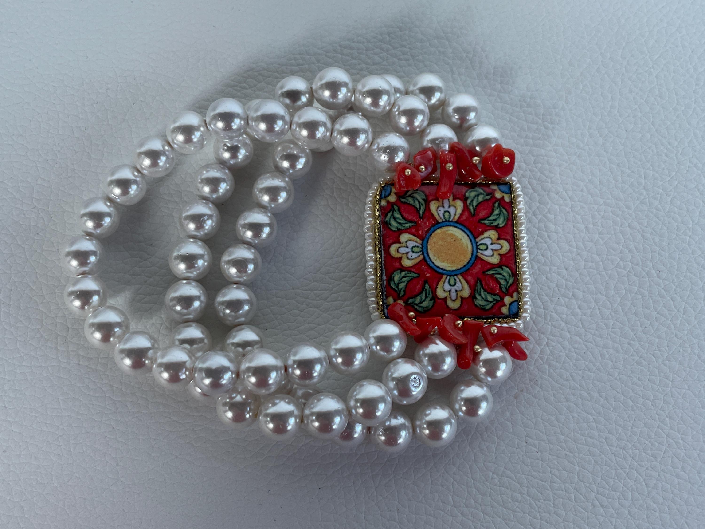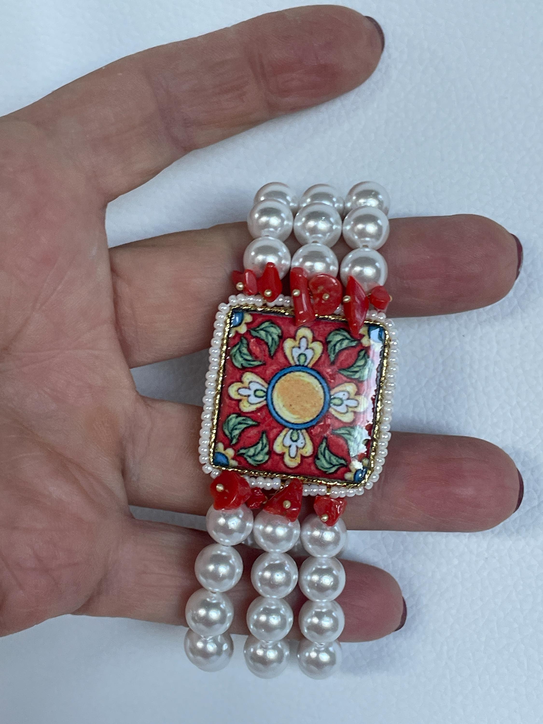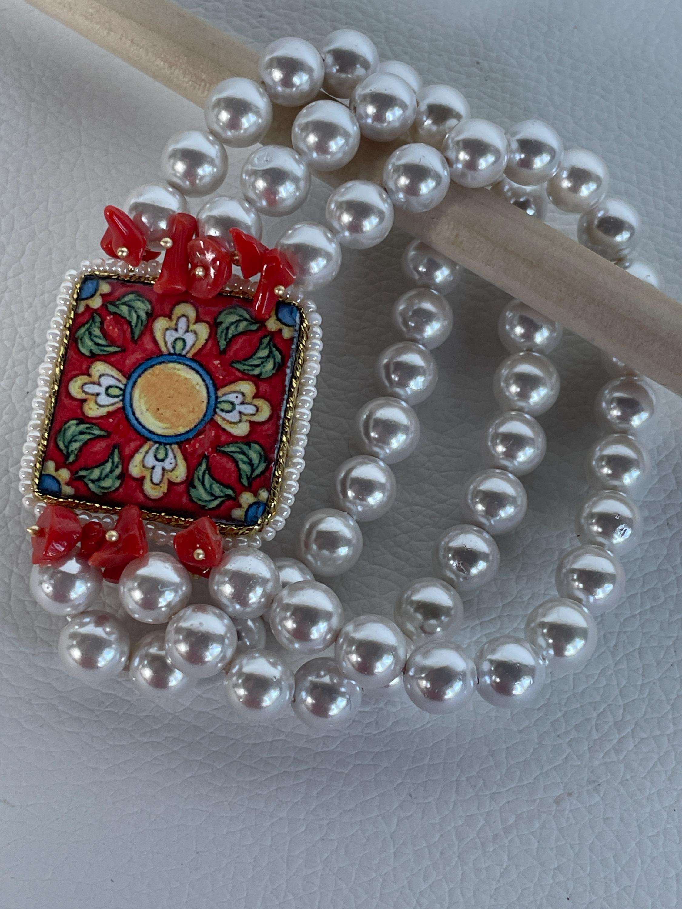 Composto da tre fili di perle Maiorca, mattonella in ceramica di Caltagirone e chips di corallo rosso.