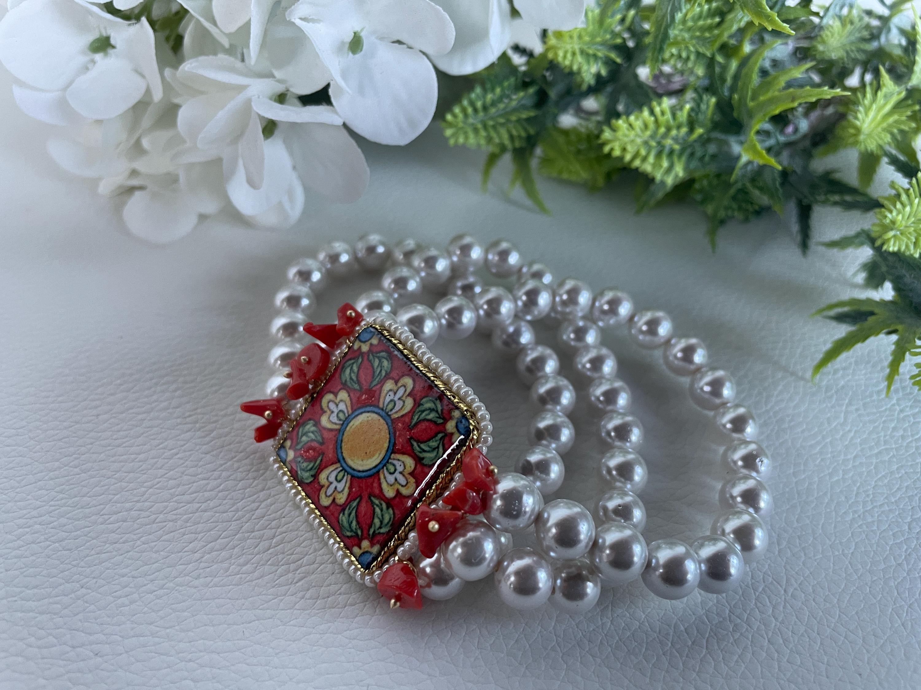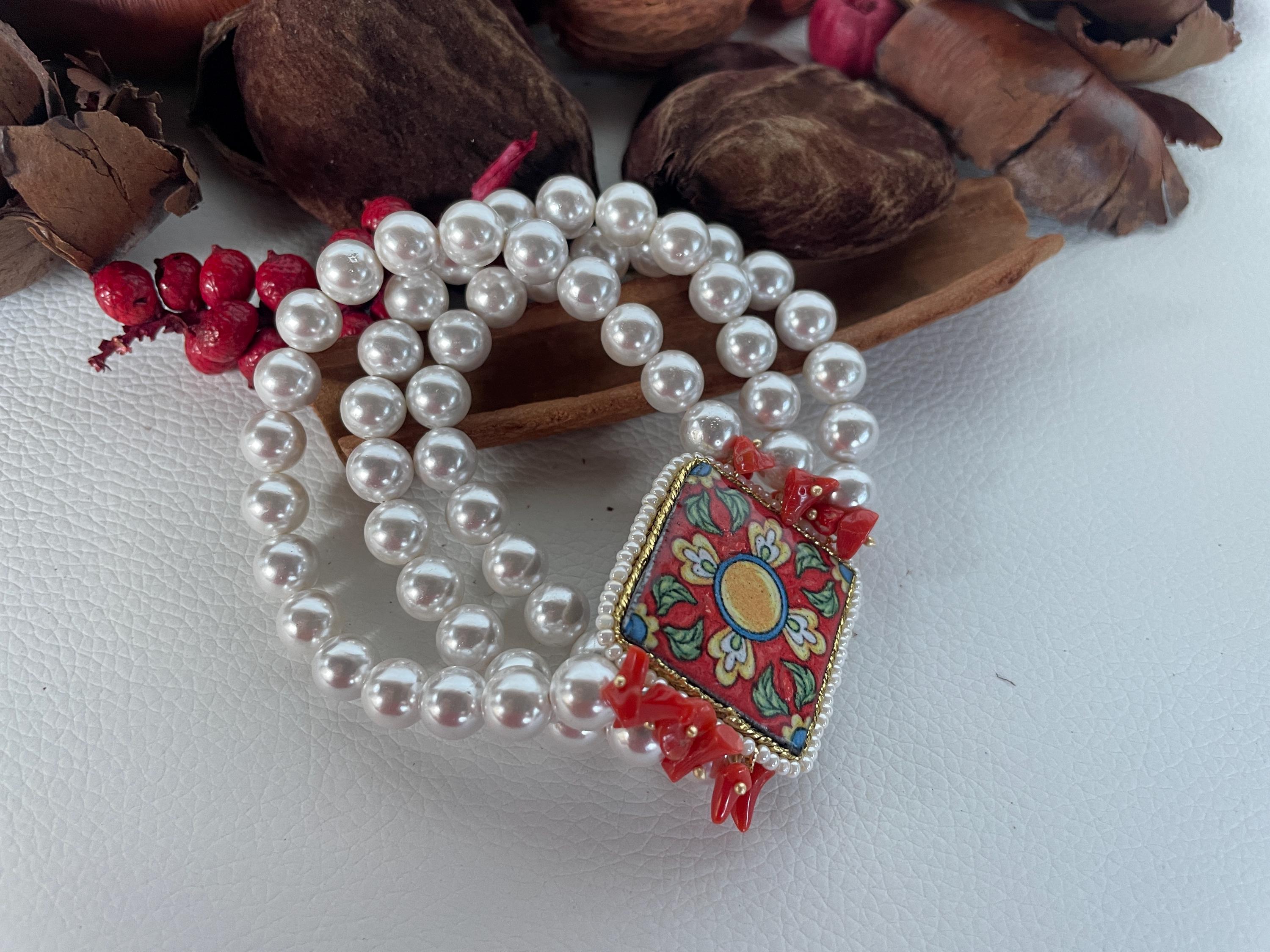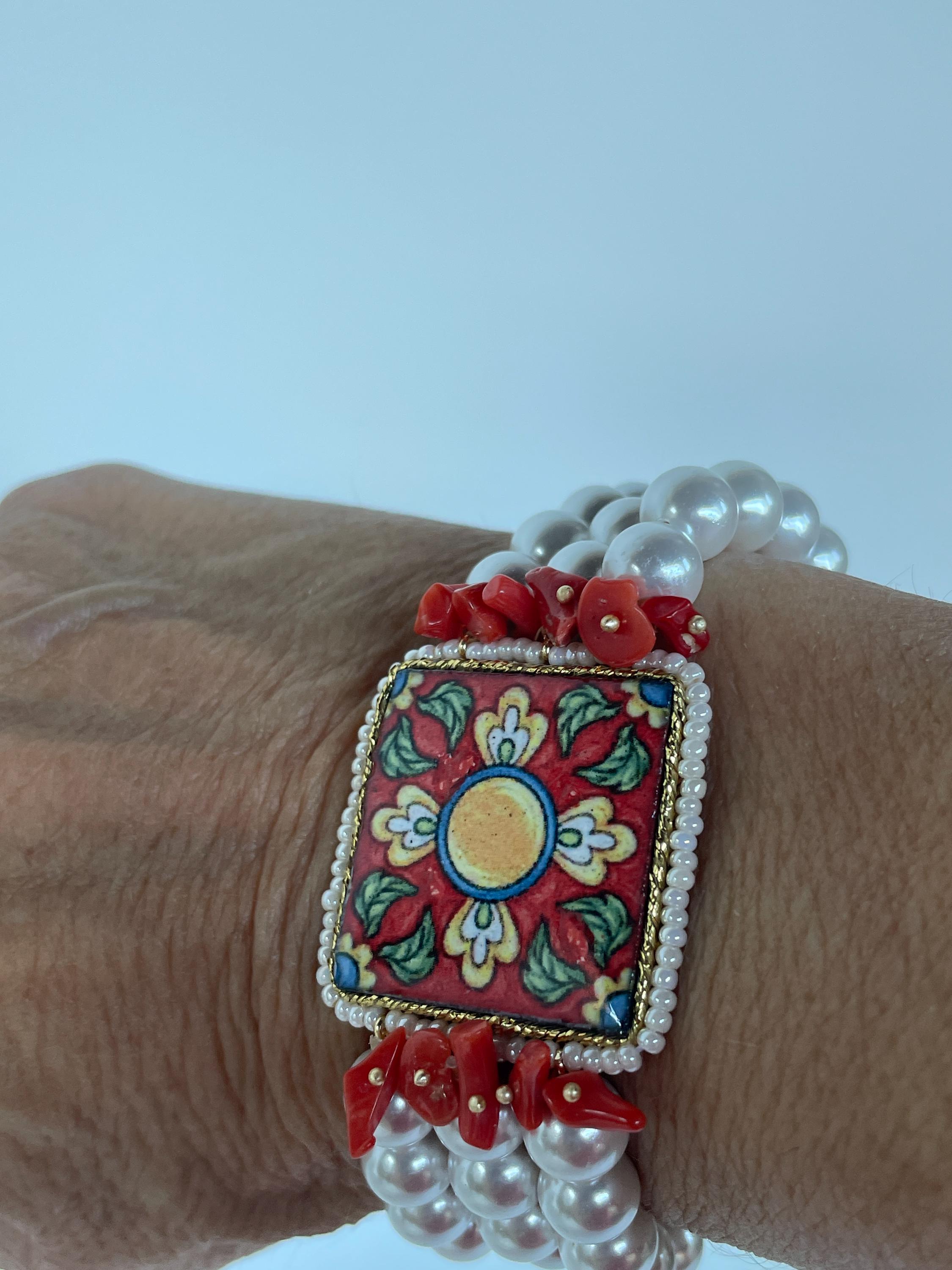 Composto da tre fili di perle Maiorca, mattonella in ceramica di Caltagirone e chips di corallo rosso.
