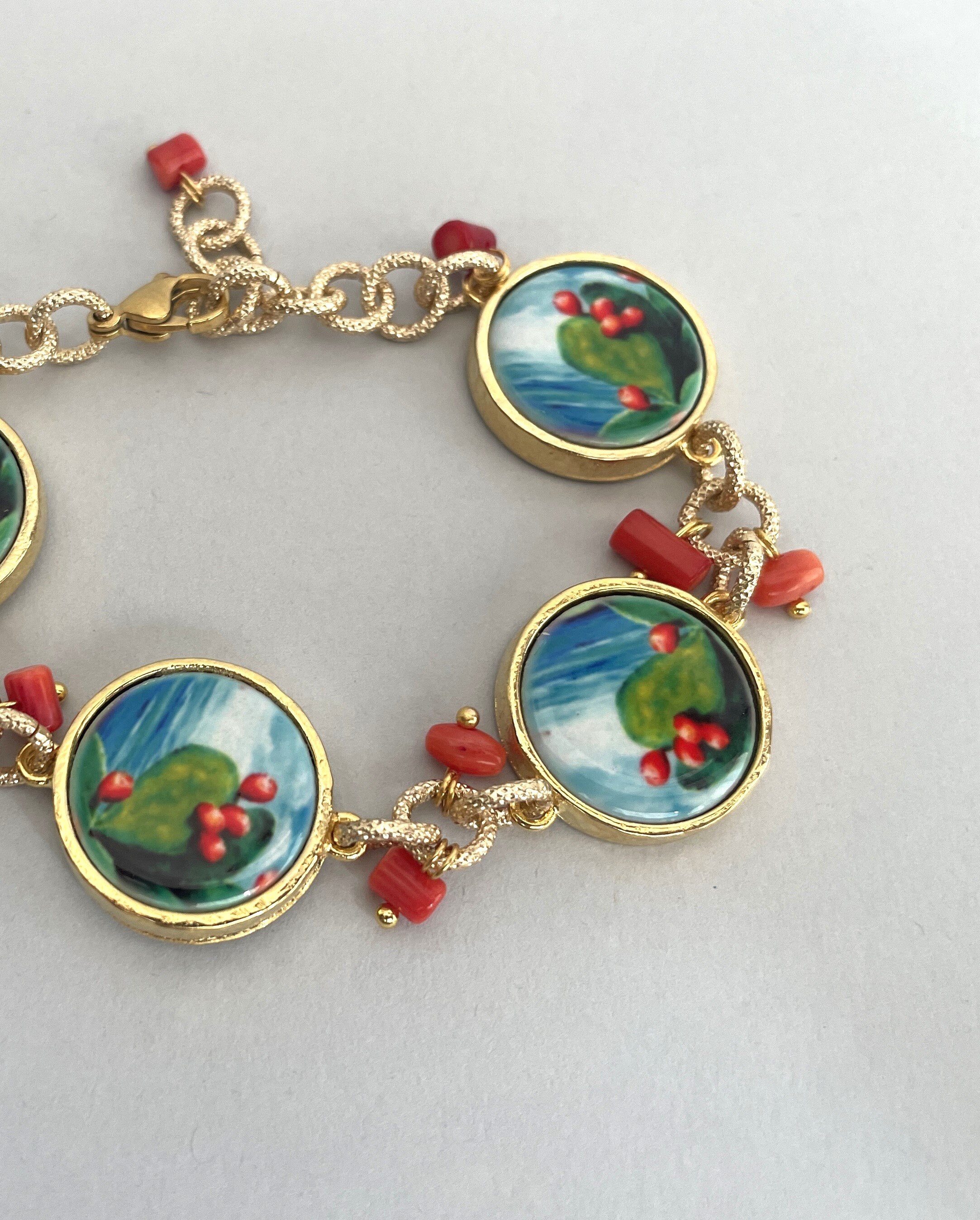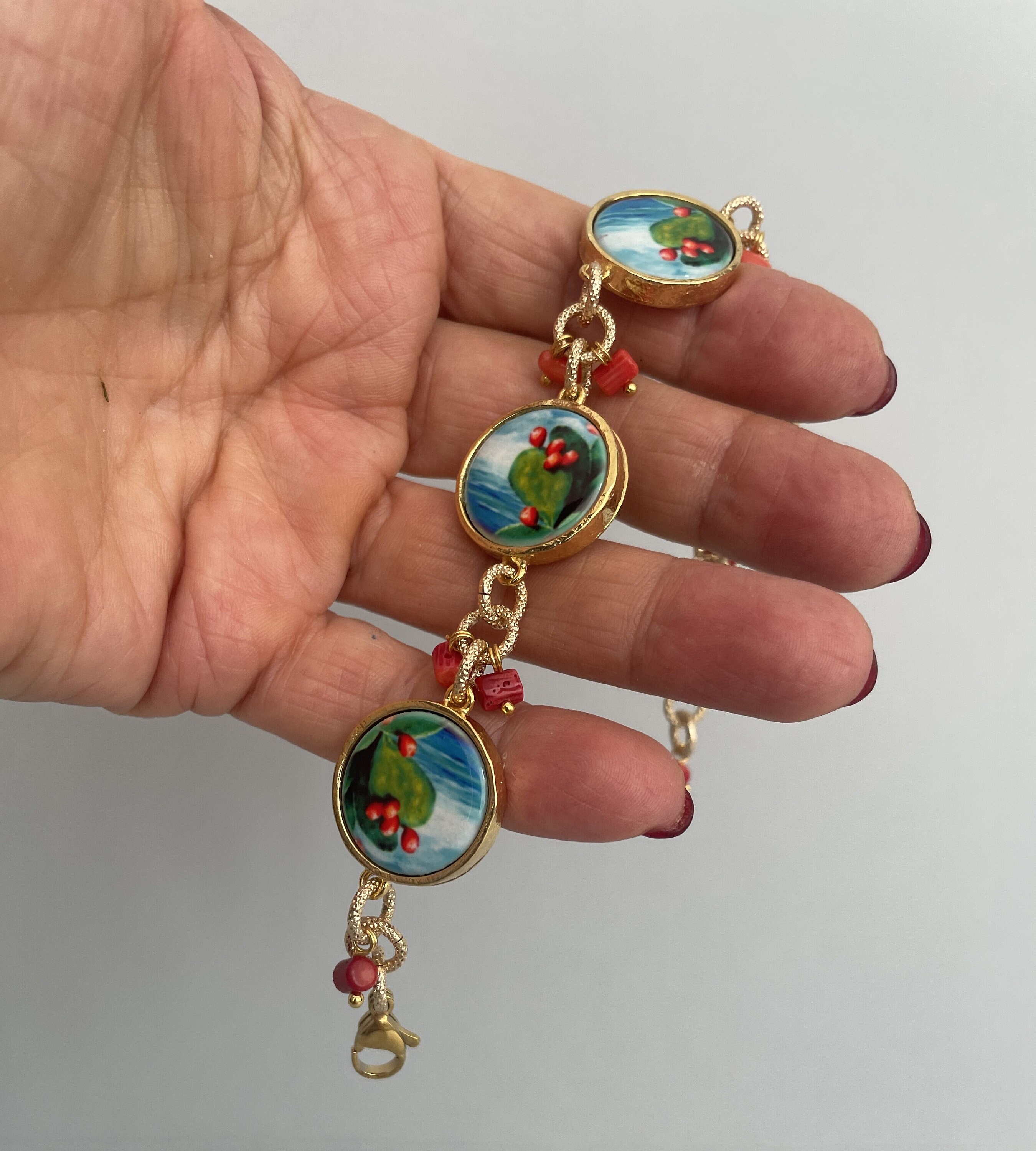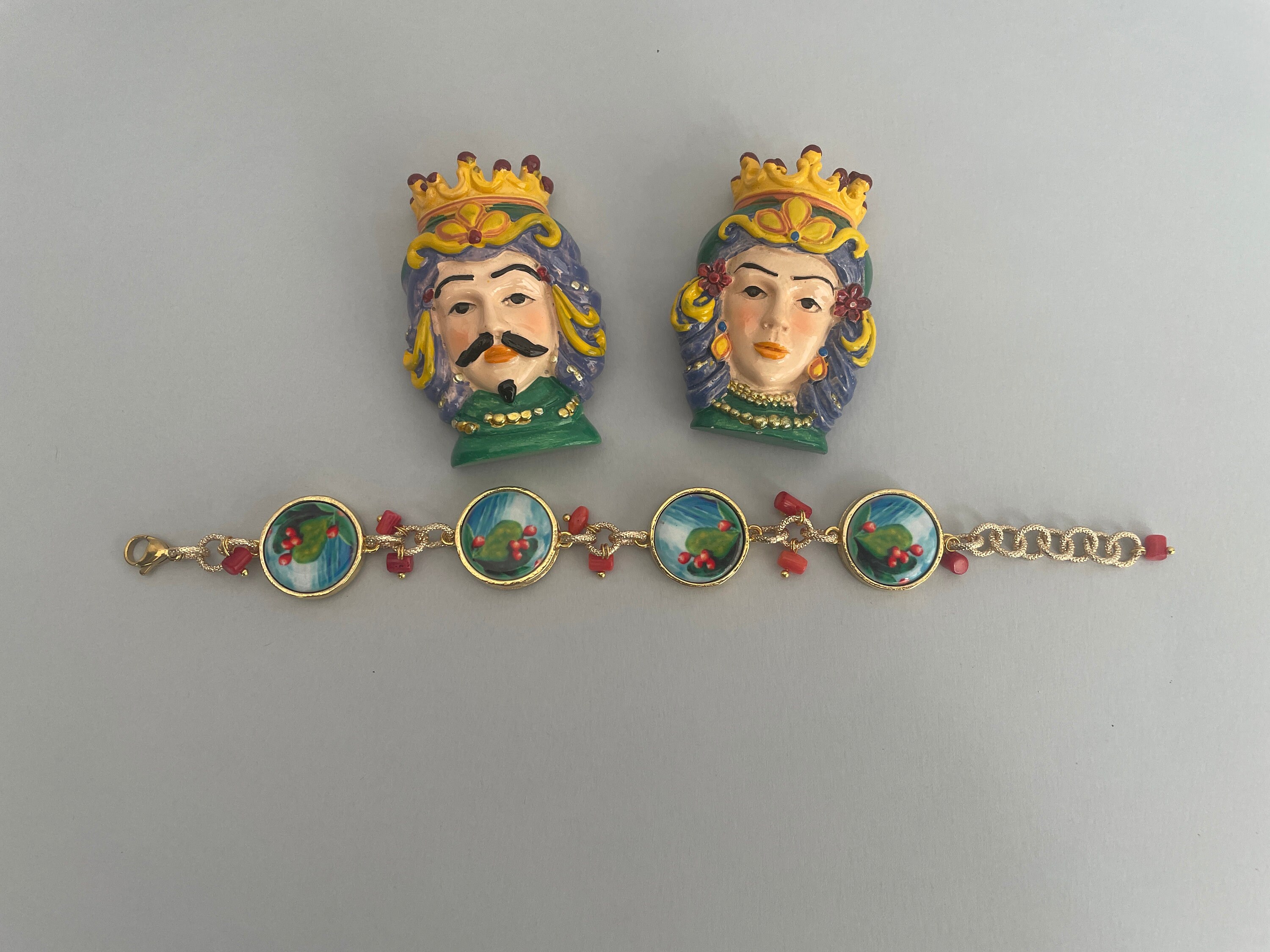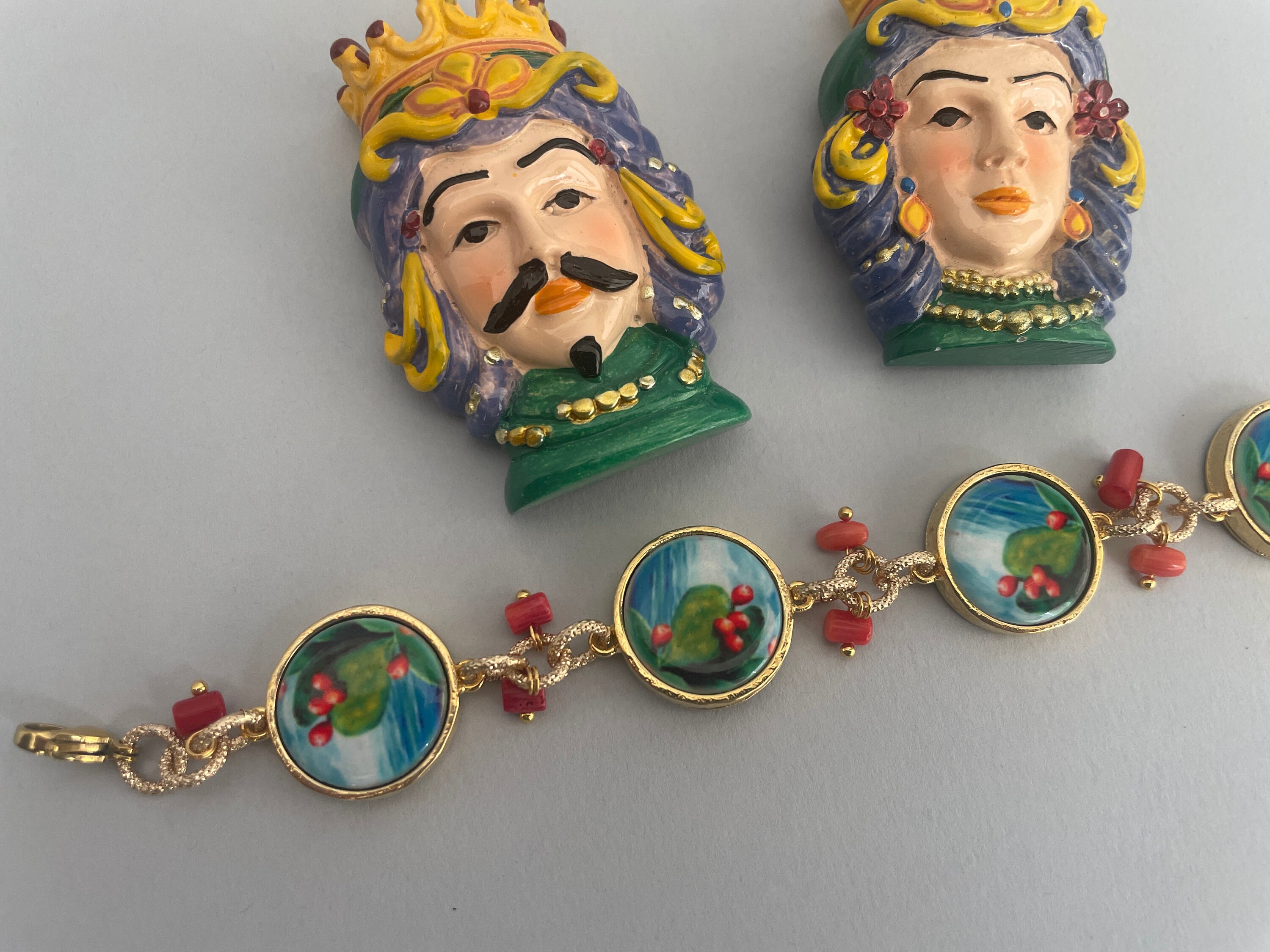 Bracciale dallo stile siciliano, realizzato con quattro mattonelle tonde di ceramica di Caltagirone.