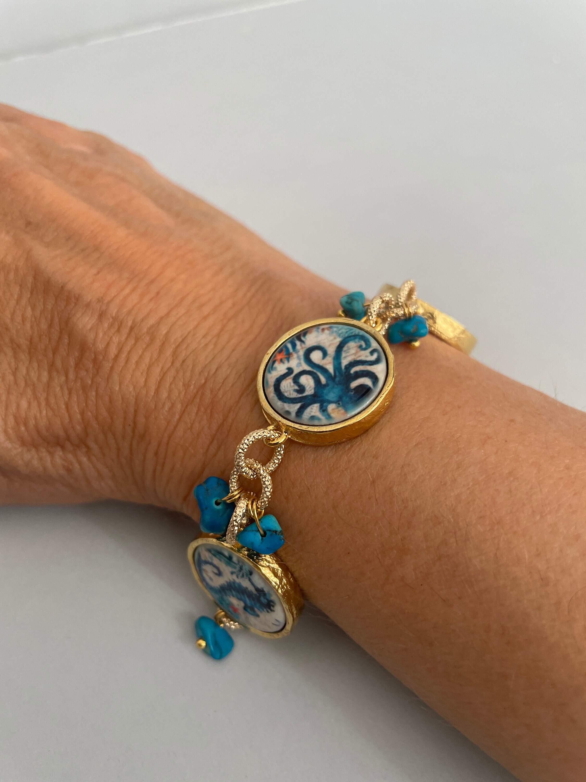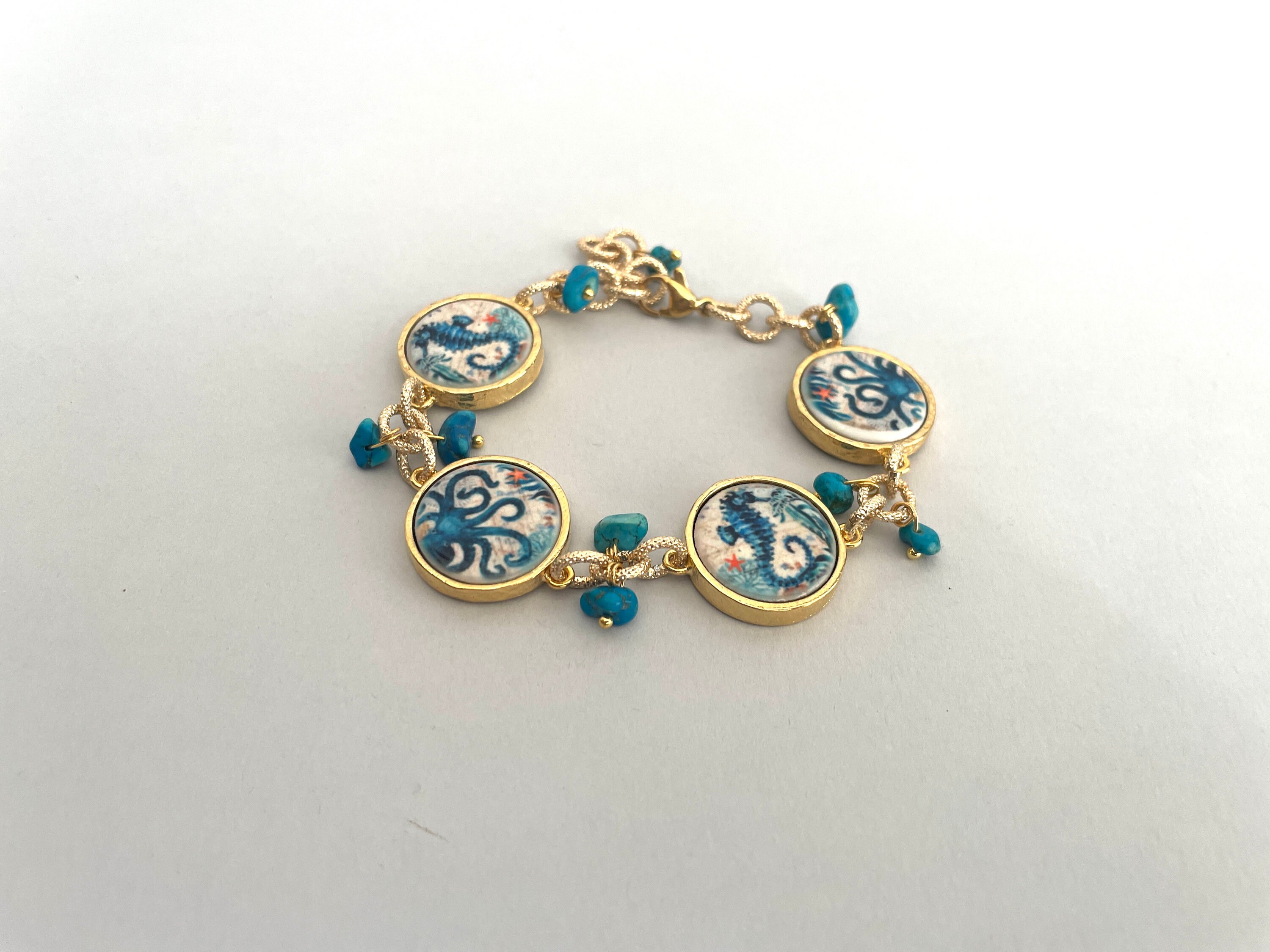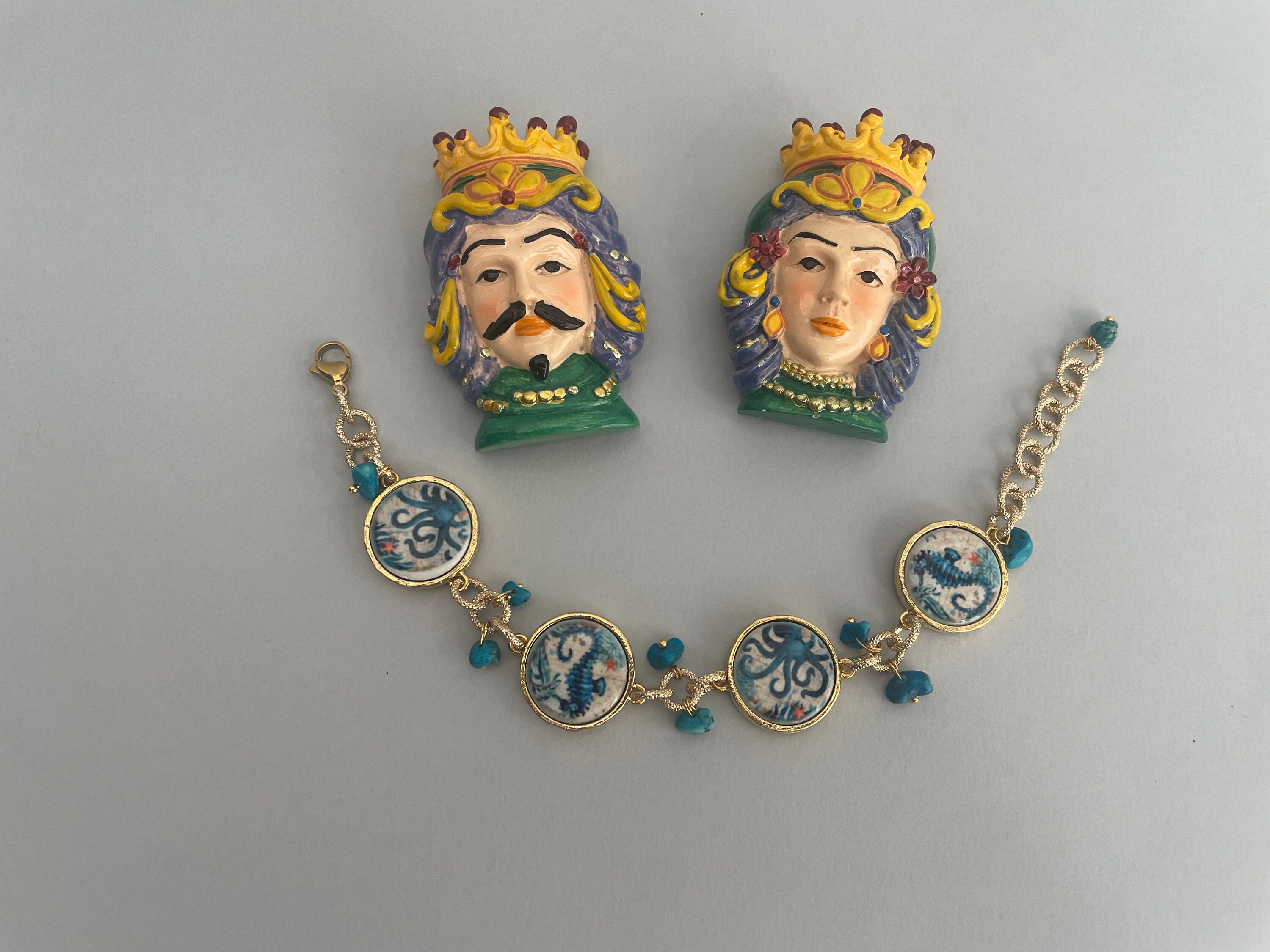 Bracciale dallo stile siciliano, realizzato con quattro mattonelle tonde di ceramica di Caltagirone.