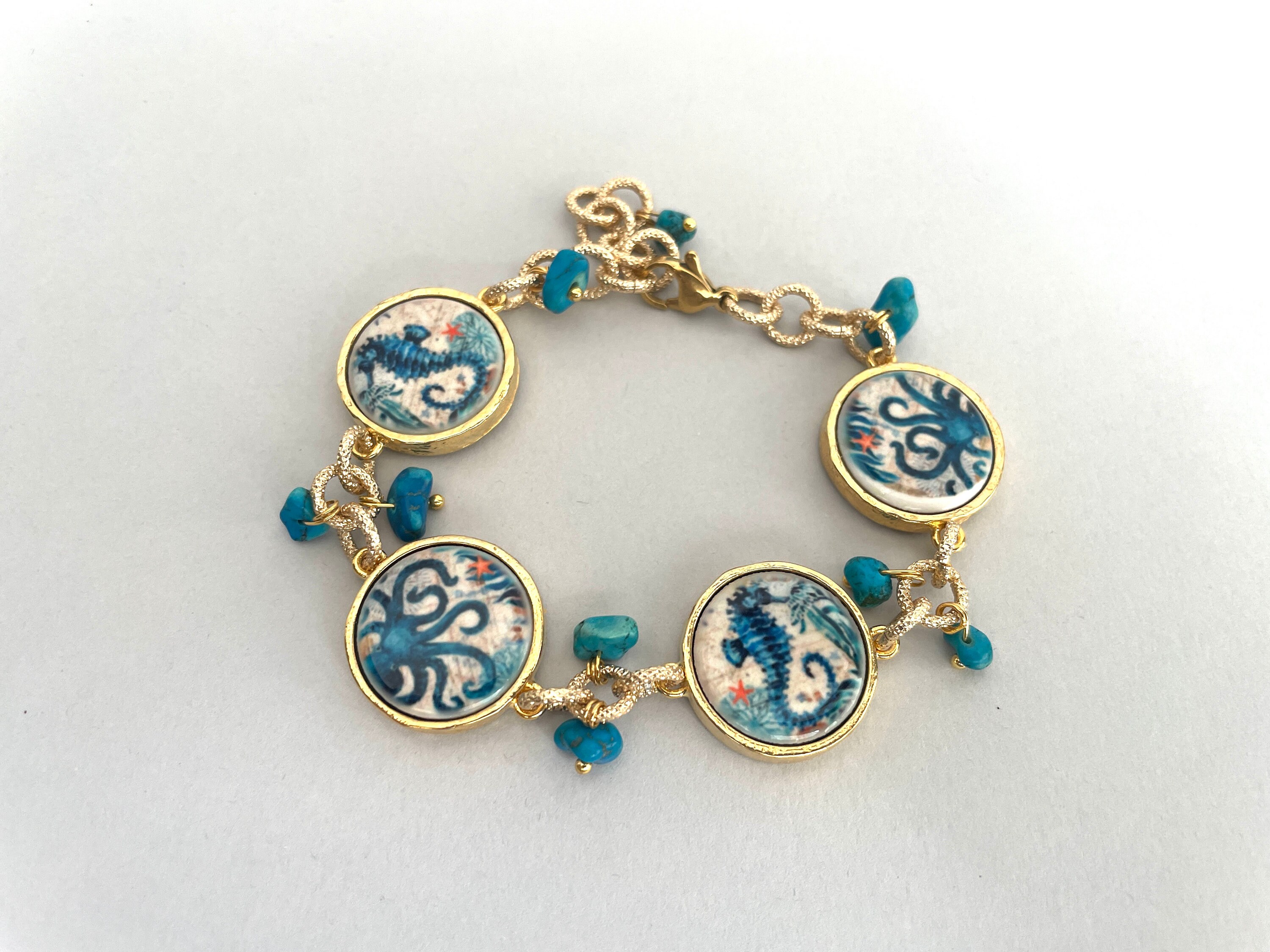 Le mattonelle, incastonate su una base di ottone lucido, sono decorate con Polipi e Cavallucci marini.