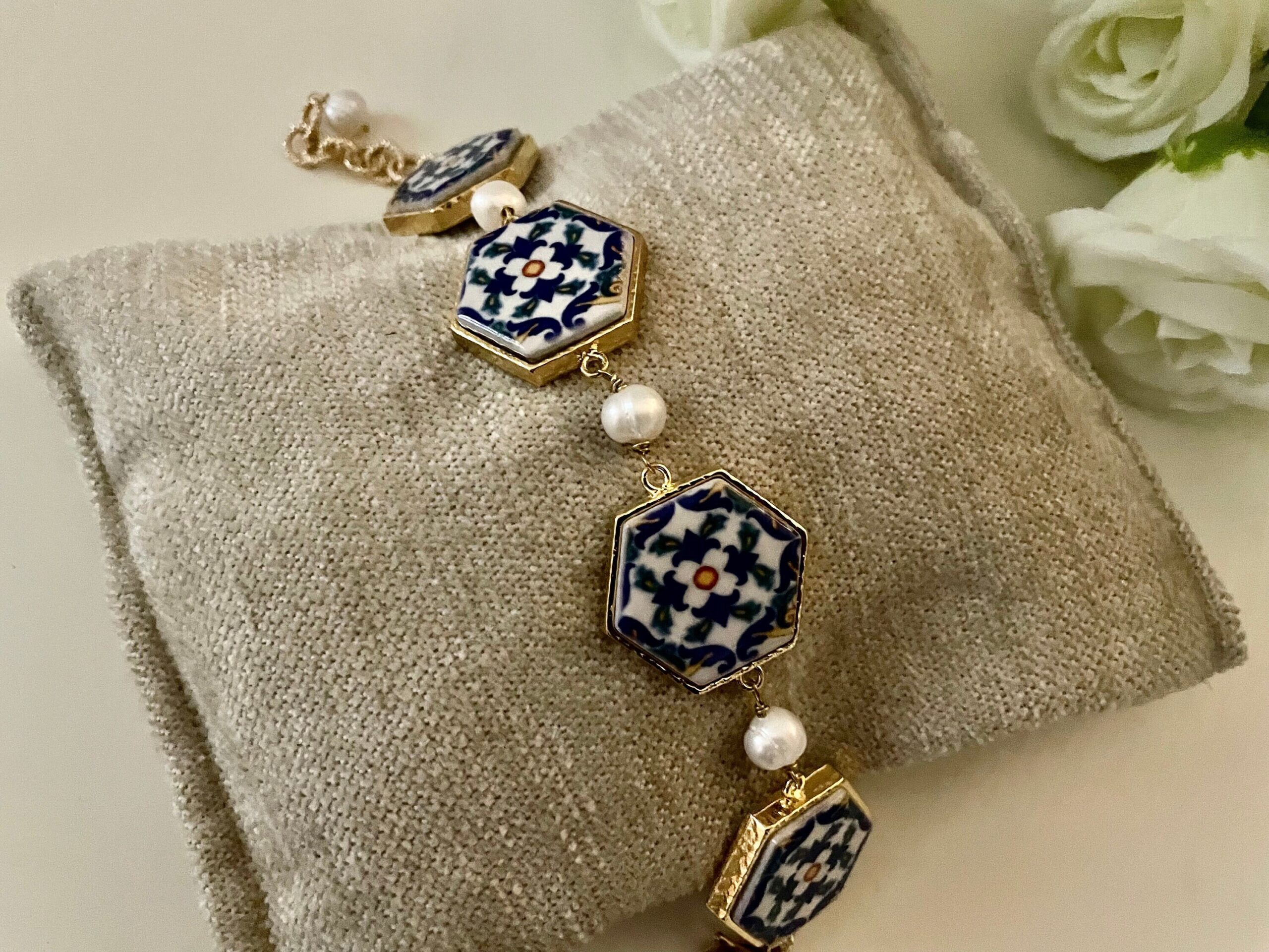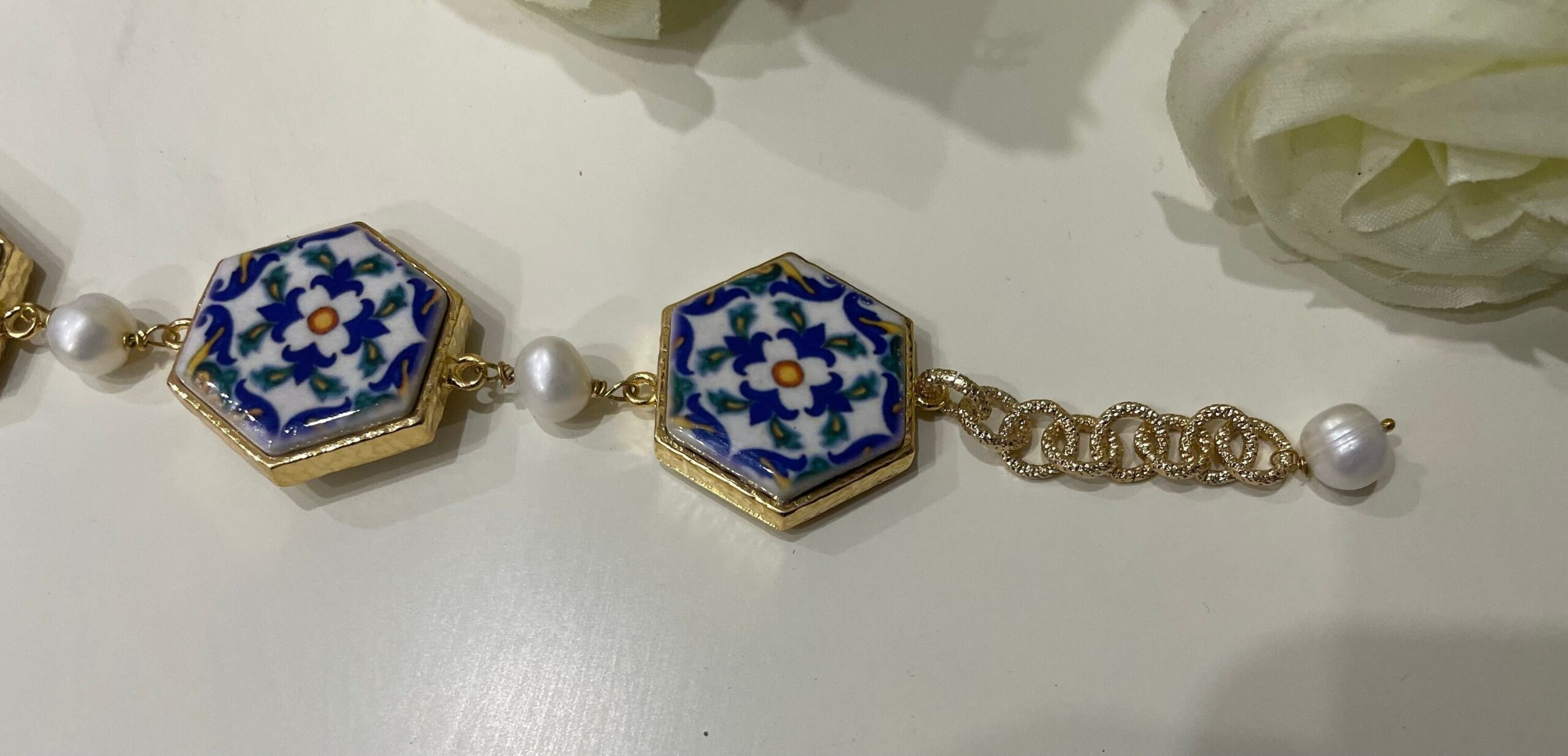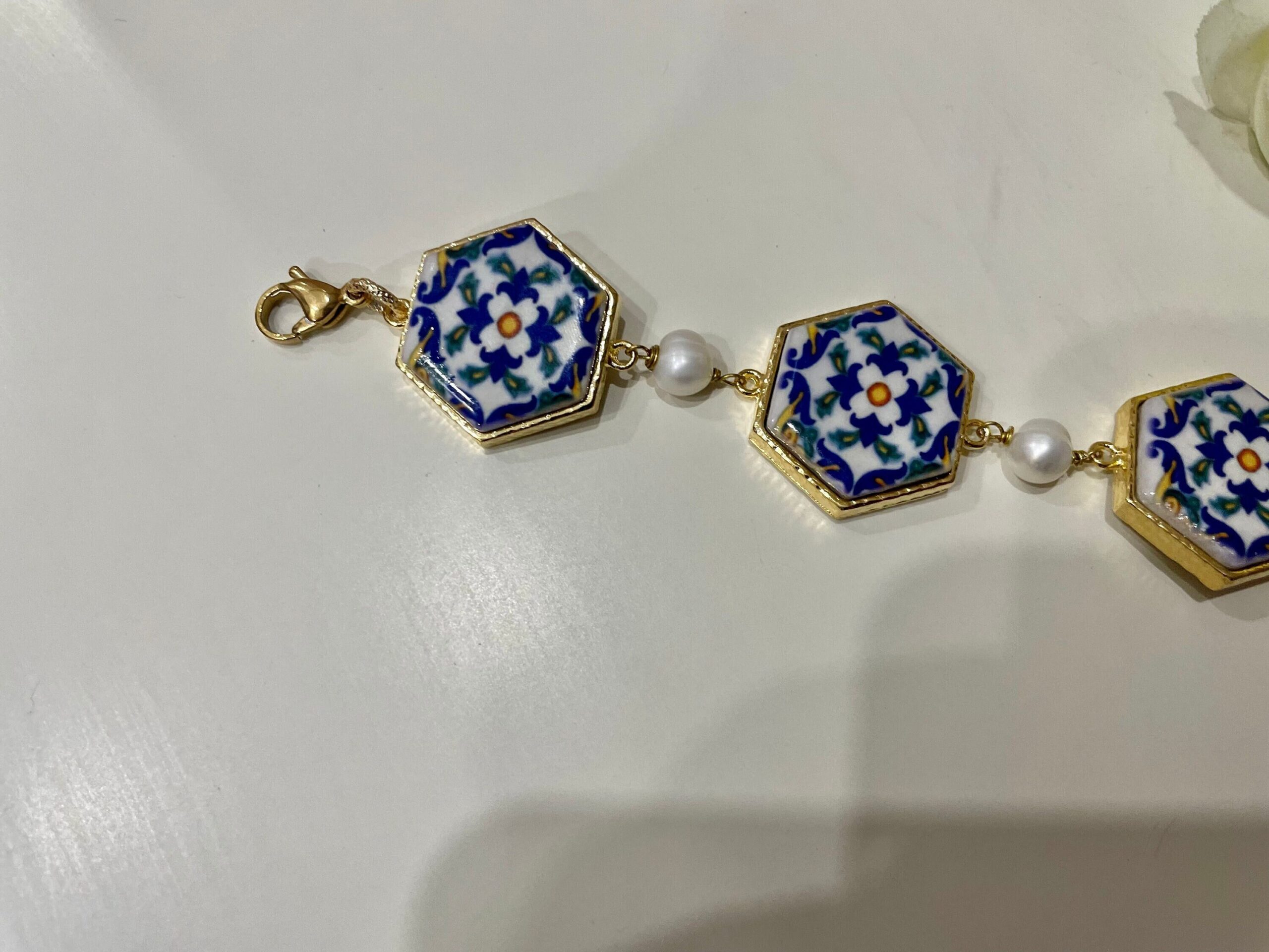 Bracciale dallo stile siciliano, realizzato con quattro mattonelle esagonali di ceramica di Caltagirone.