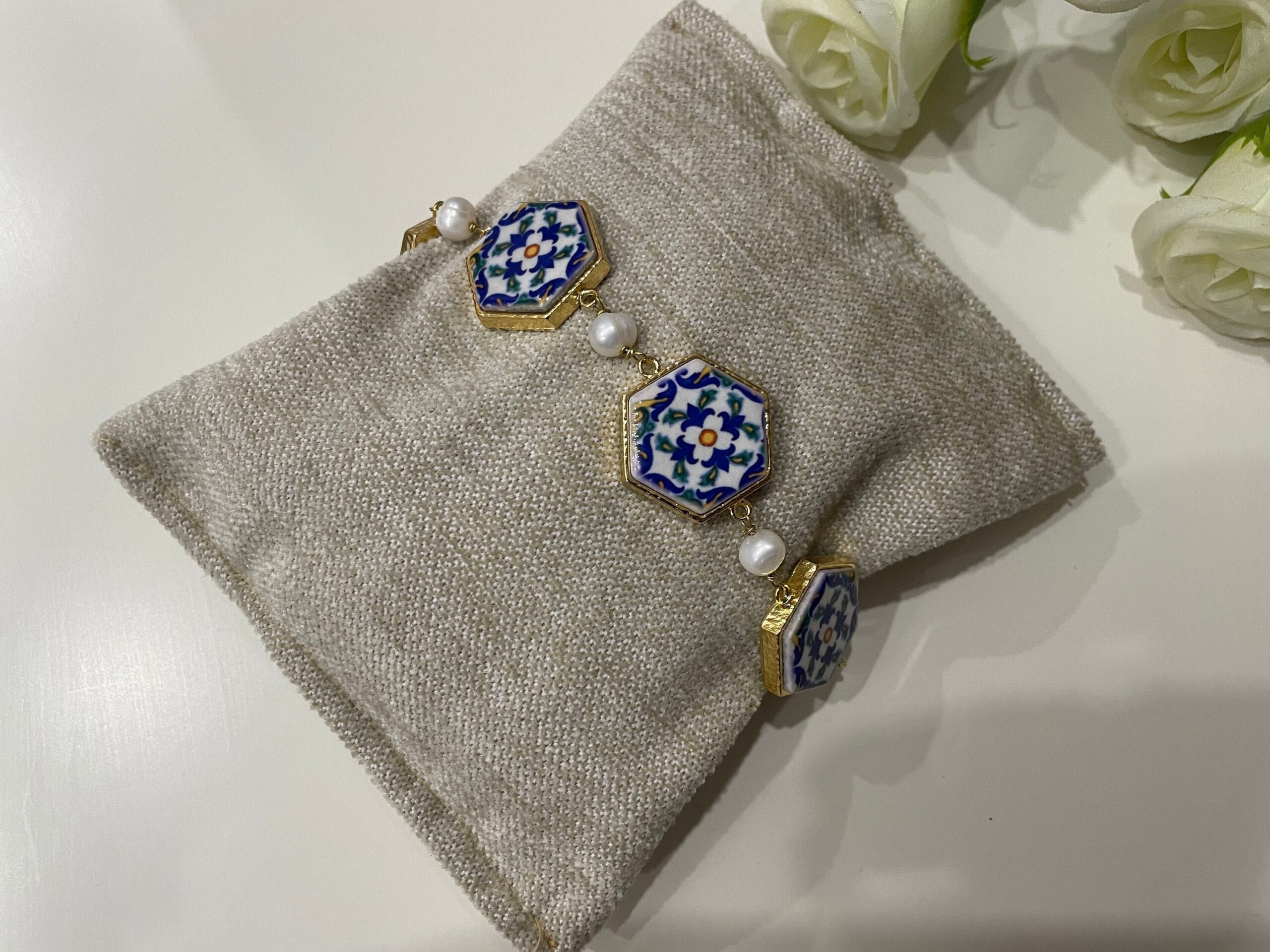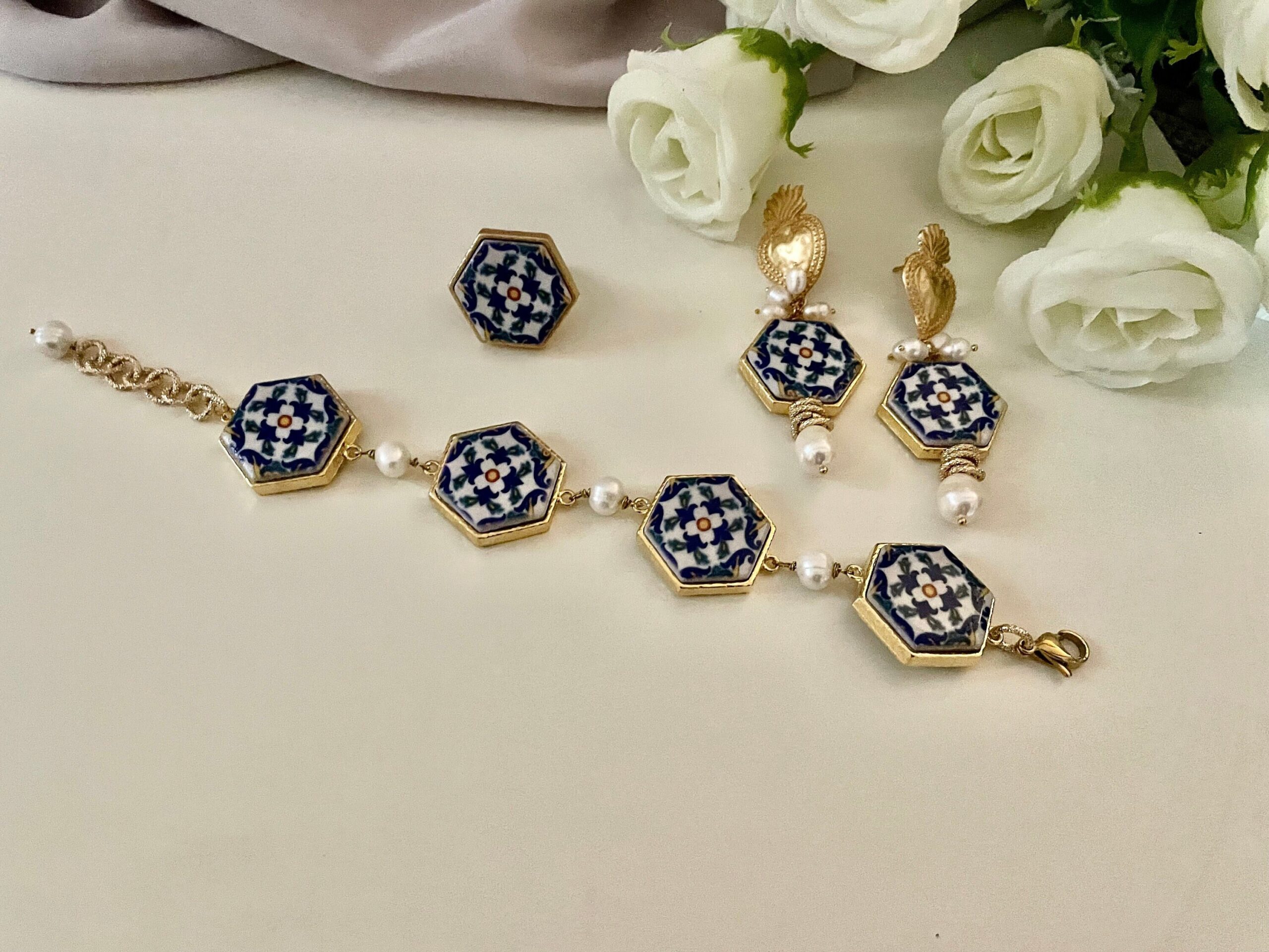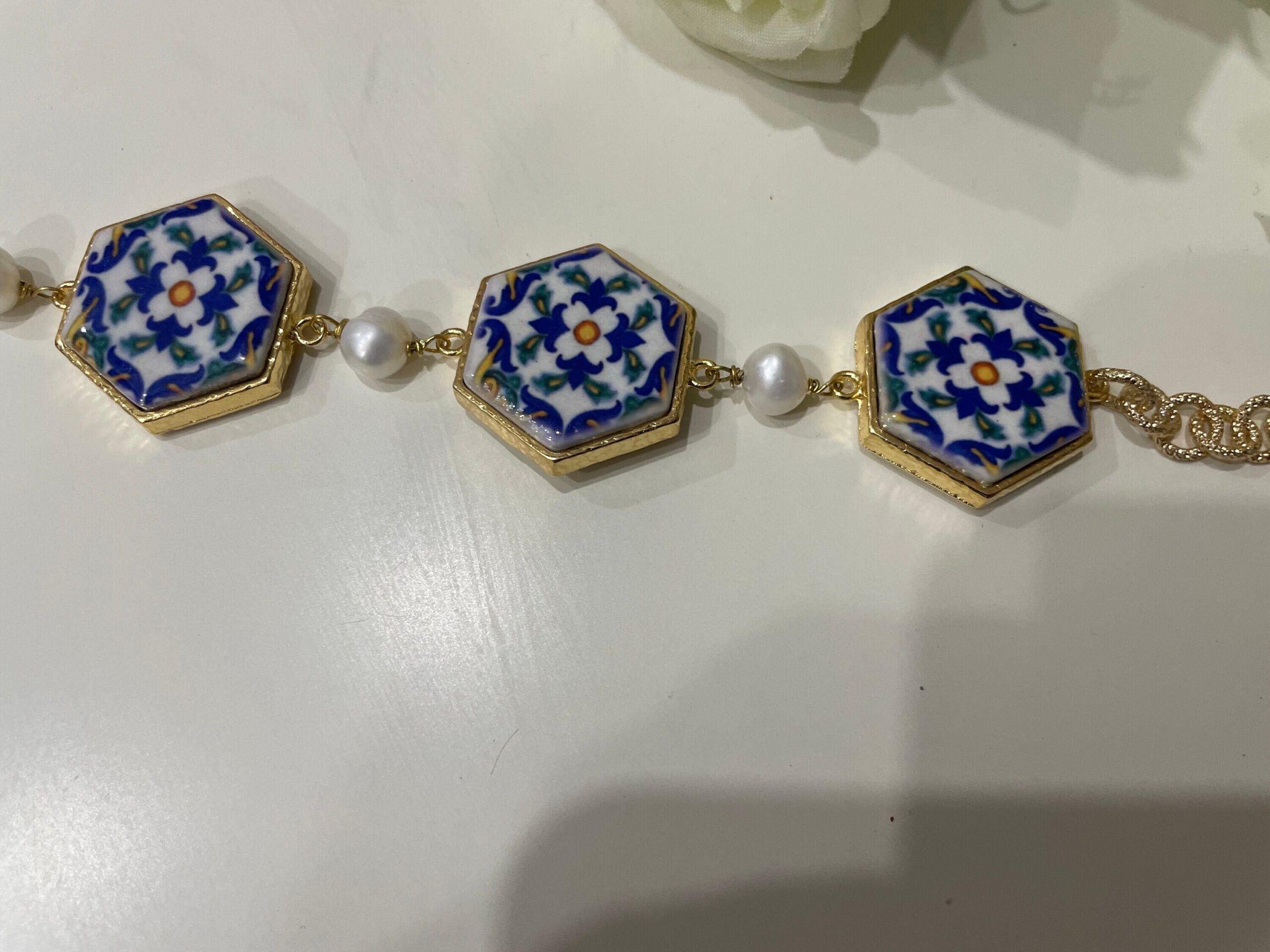 Bracciale dallo stile siciliano, realizzato con quattro mattonelle esagonali di ceramica di Caltagirone.