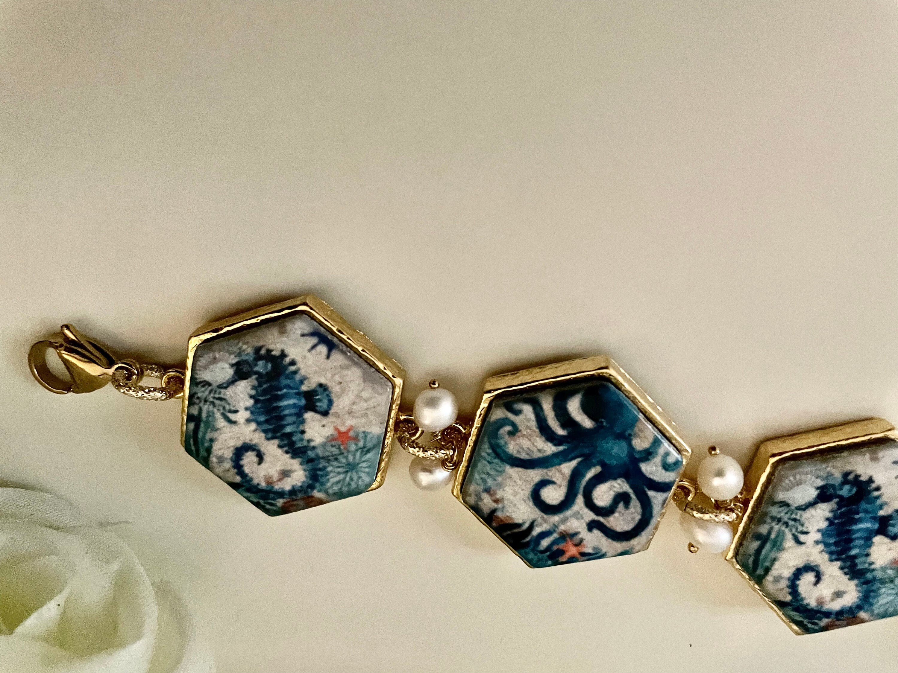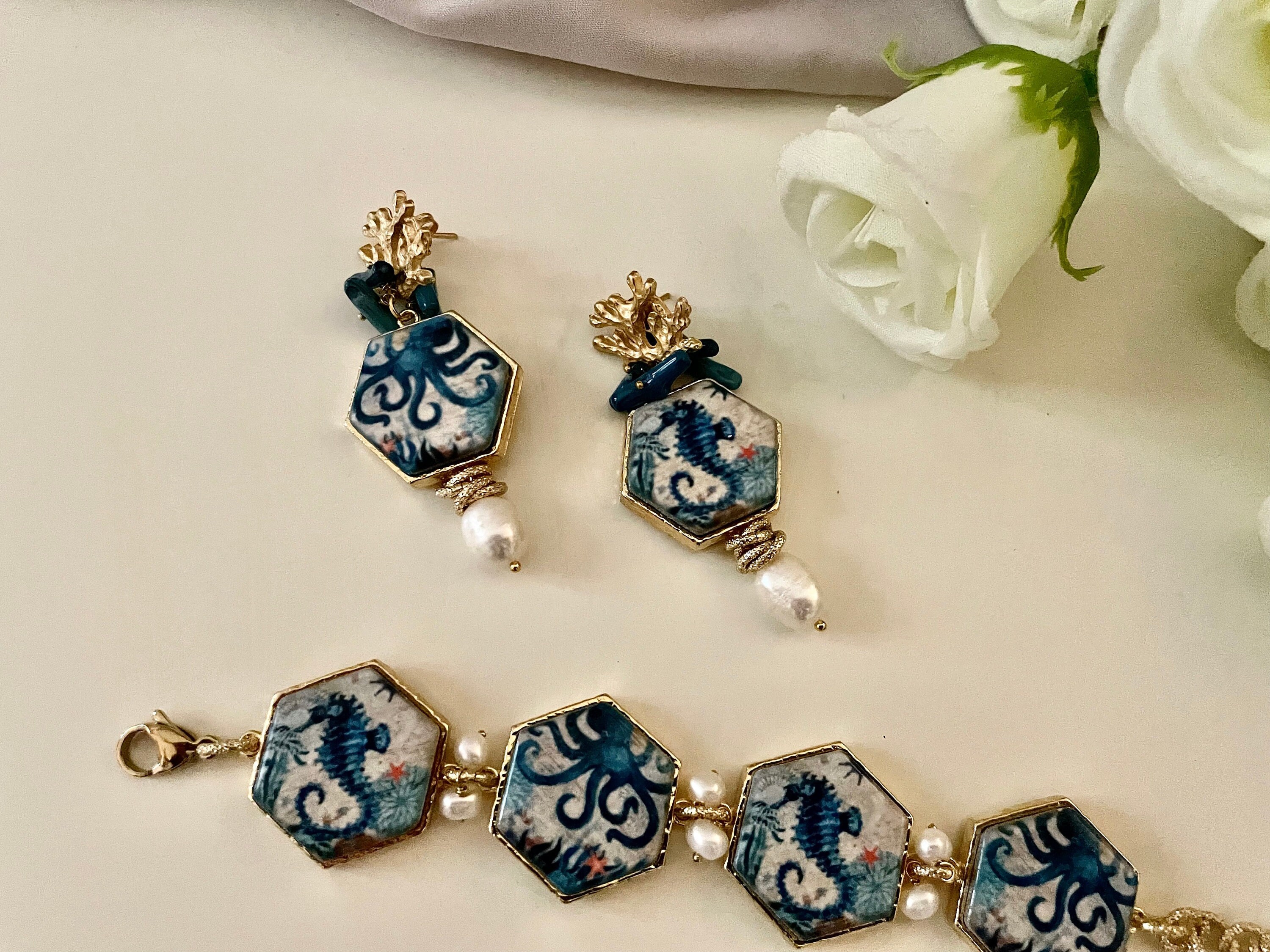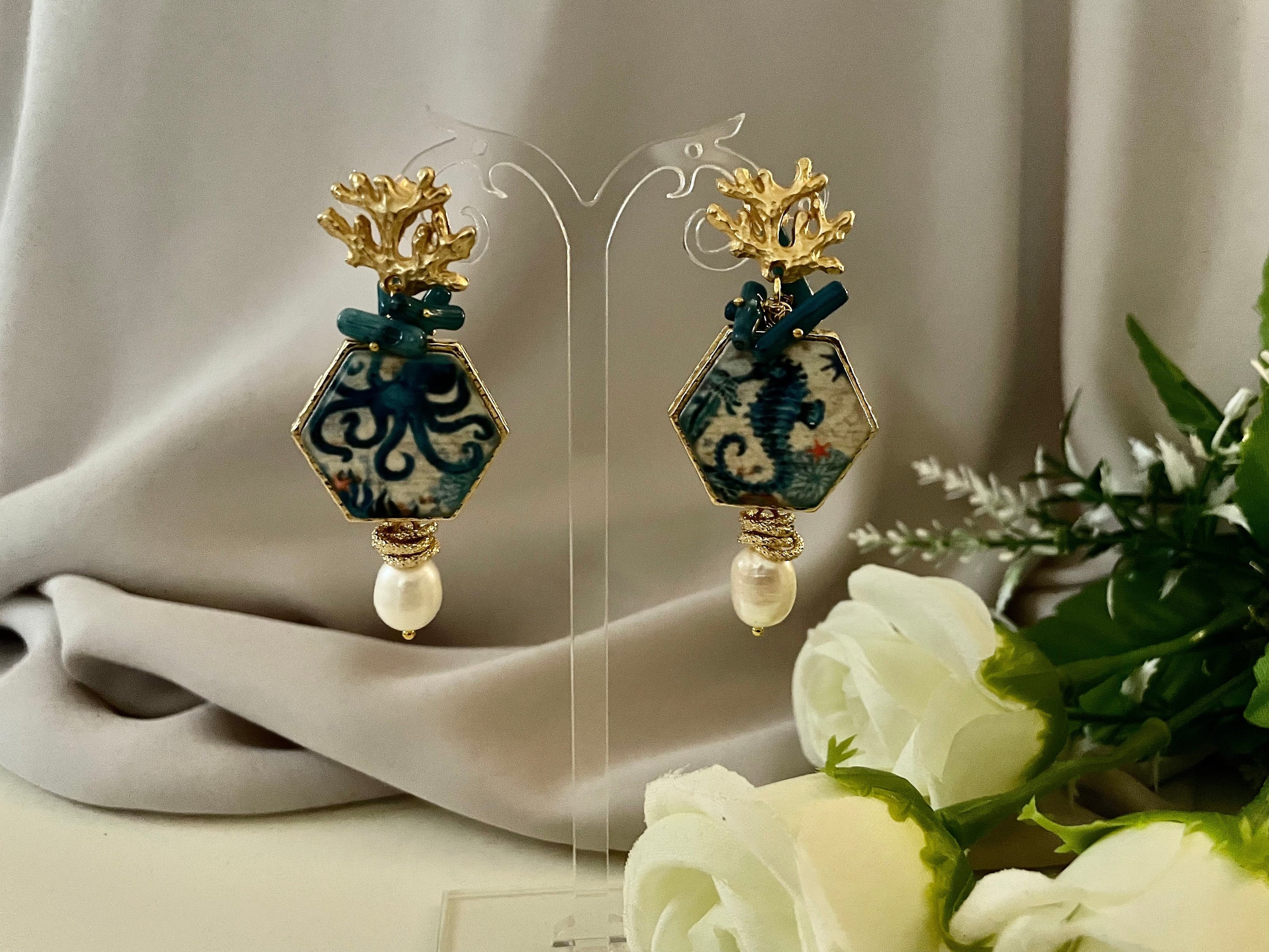 – mattonelle esagonali di ceramica di Caltagirone stampate in superficie con Polipo e Cavalluccio marino;