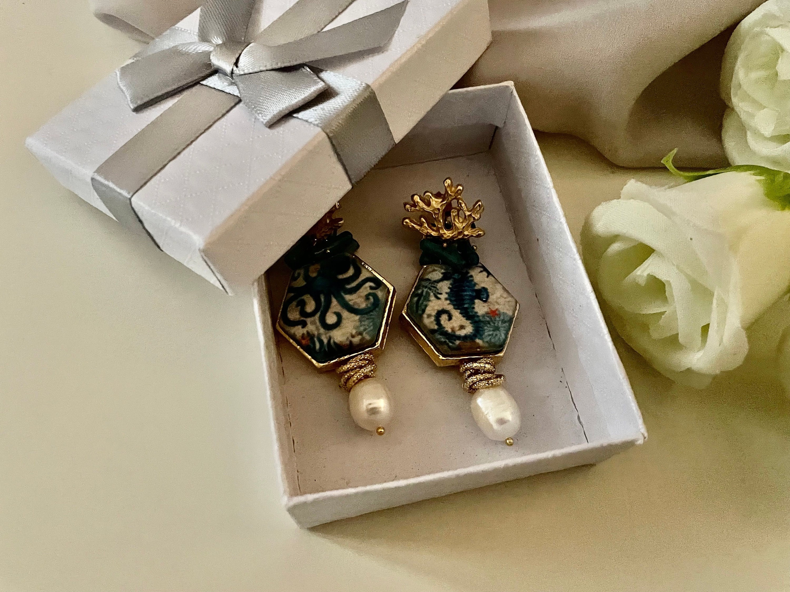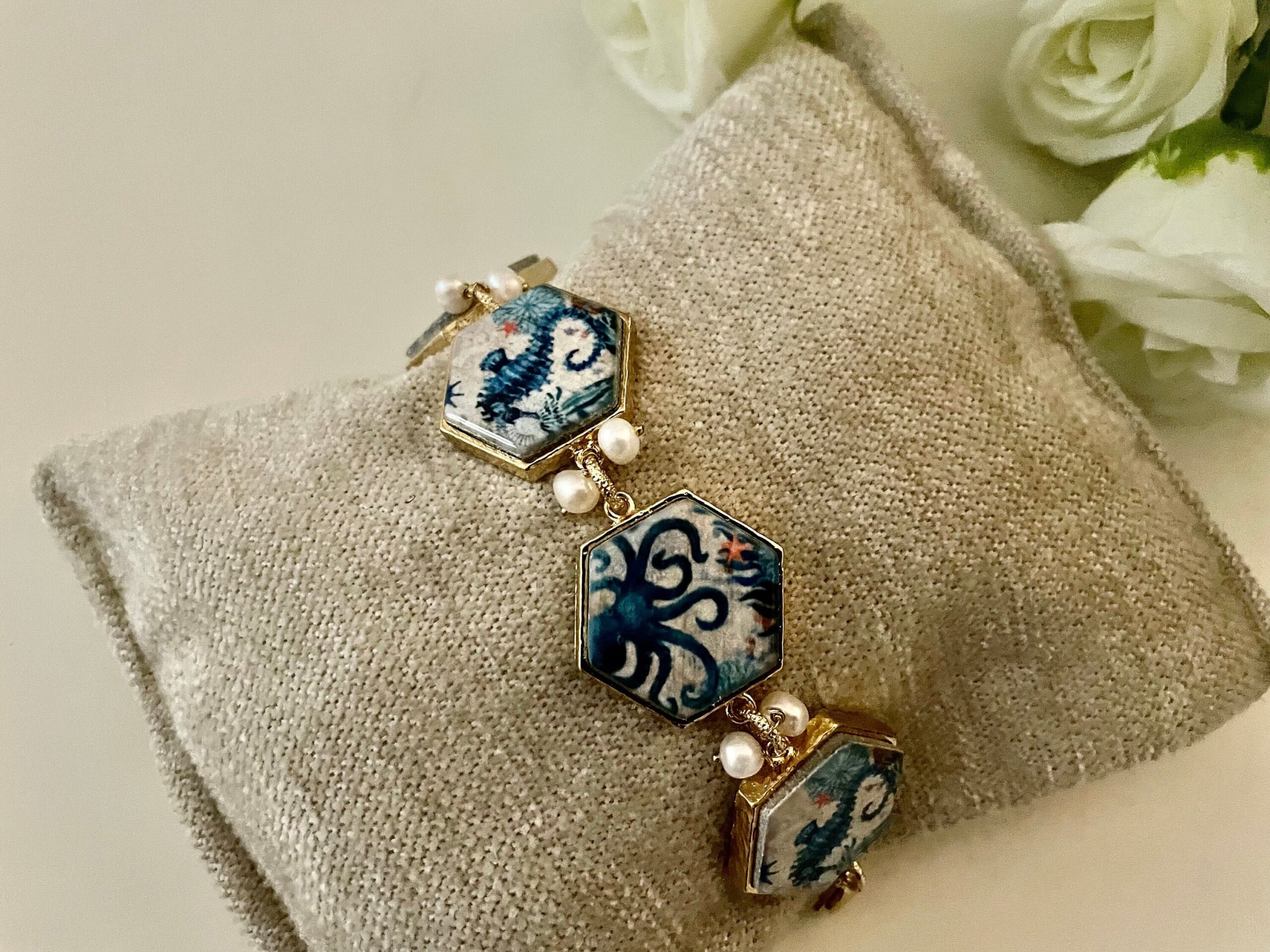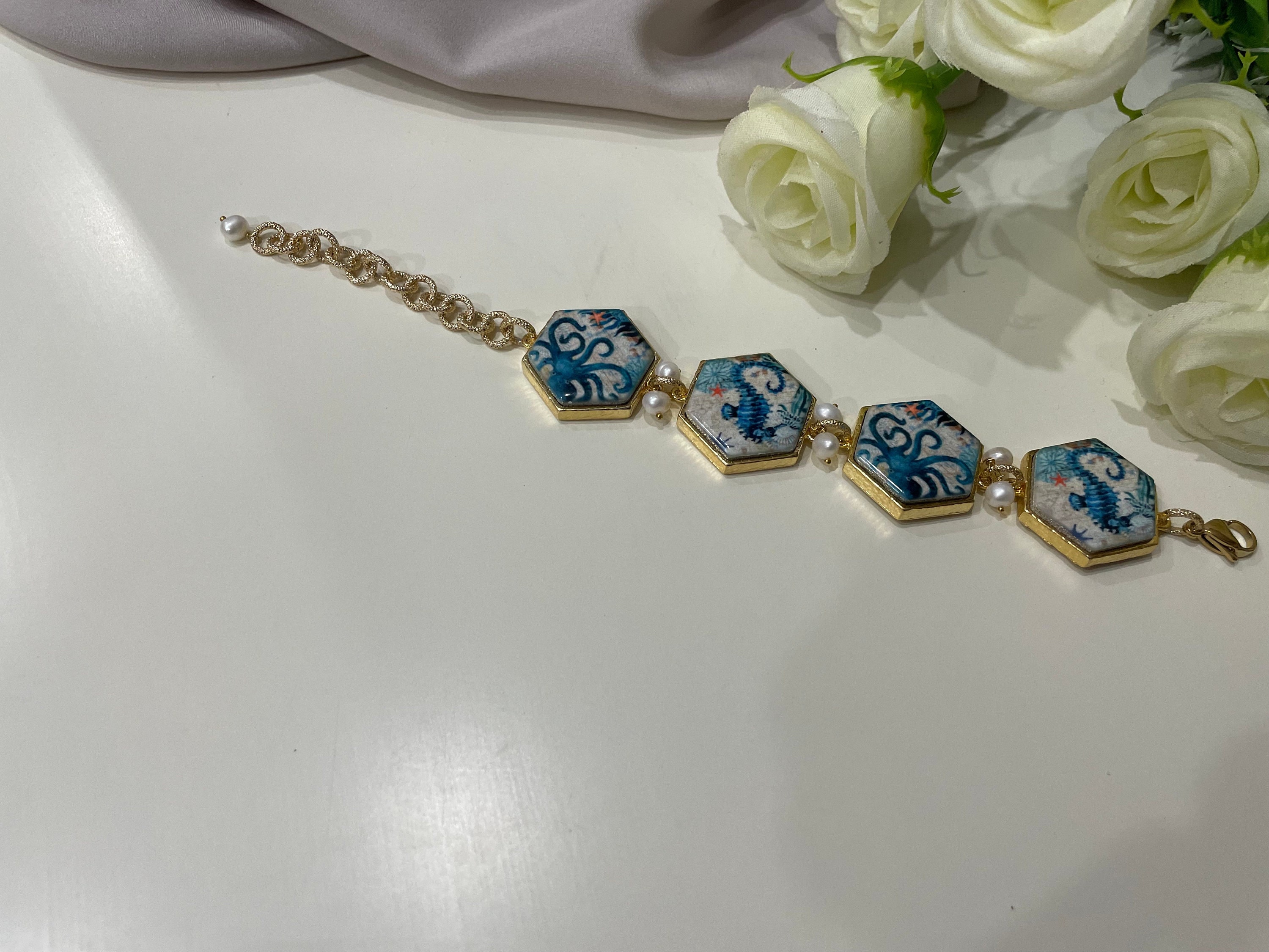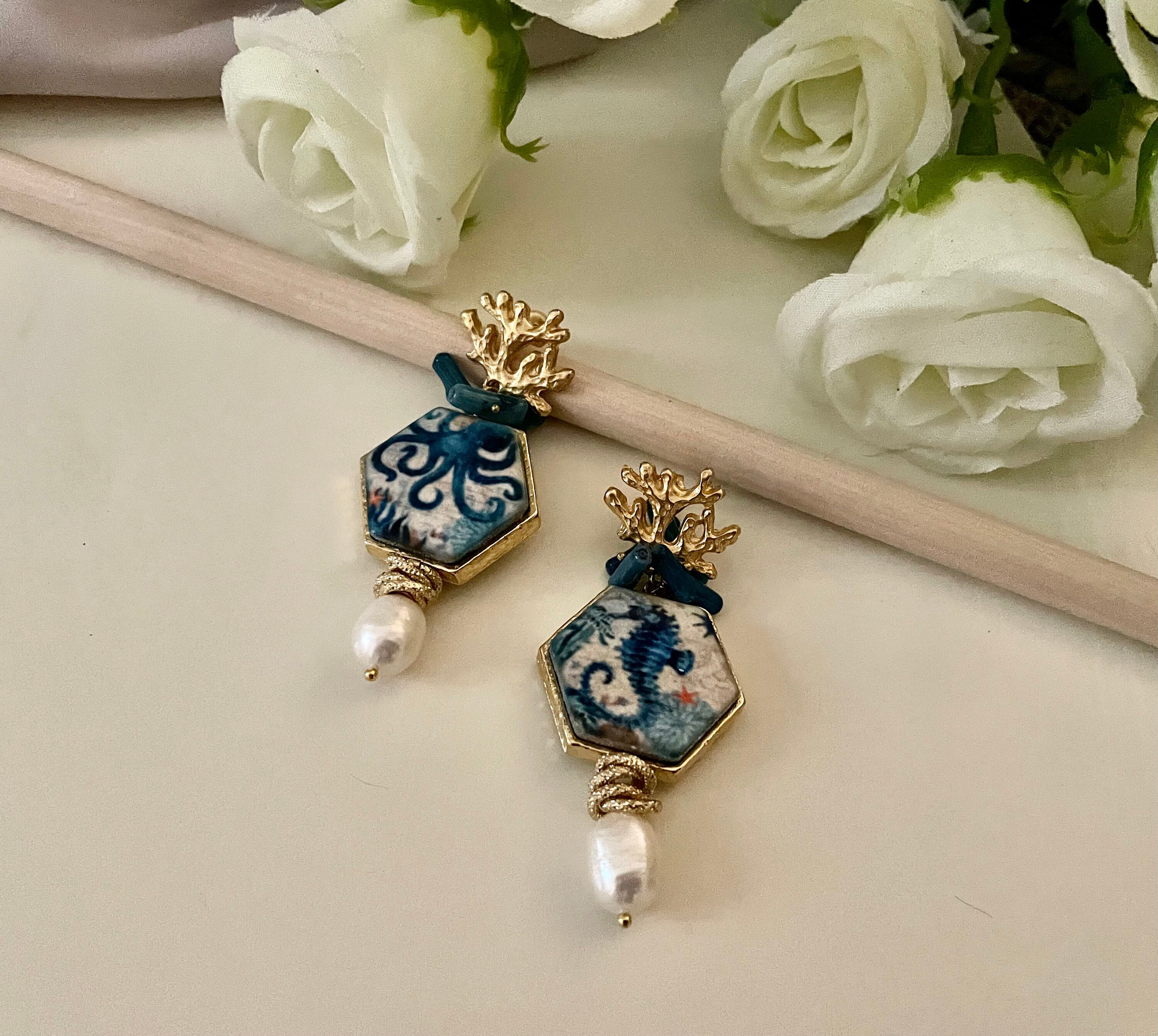 – mattonelle esagonali di ceramica di Caltagirone stampate in superficie con Polipo e Cavalluccio marino;
