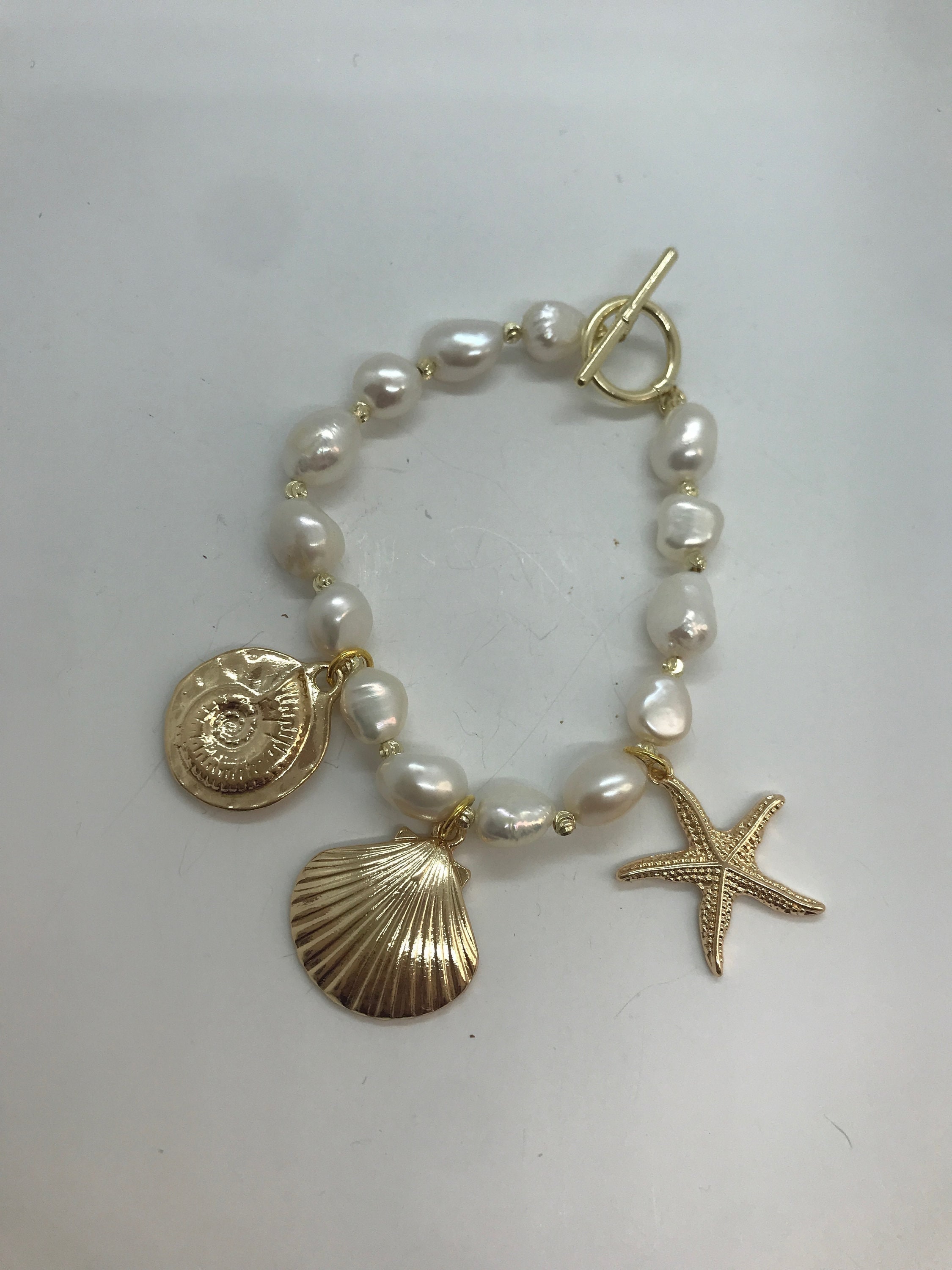 La chiusura a T bar, e gli charms rendono il bracciale molto contemporaneo, creando una piacevole contrapposizione con la classicità delle perle.