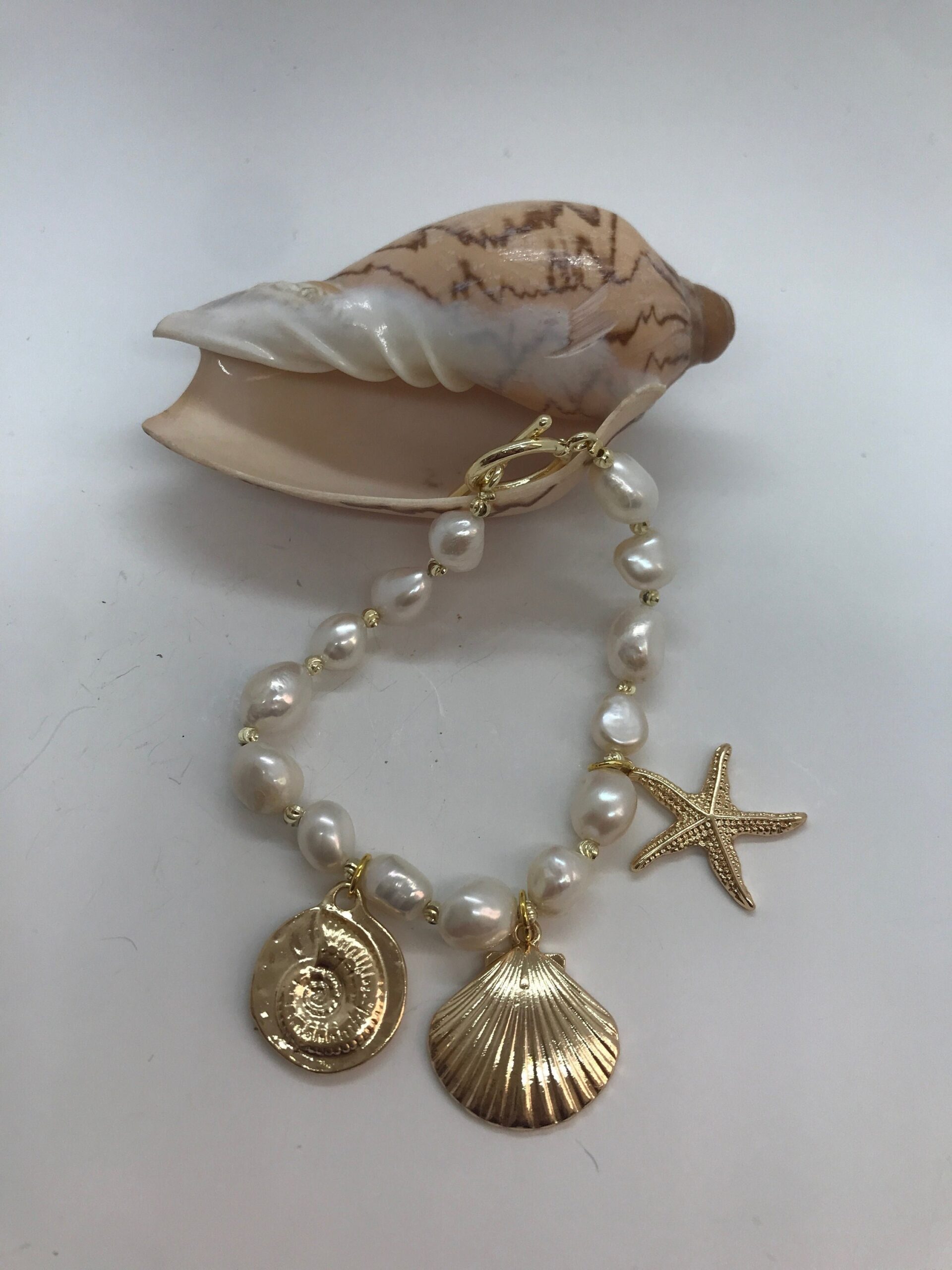Bracciale perle barocche e piccole perle dorate, bracciale con charms assortiti.