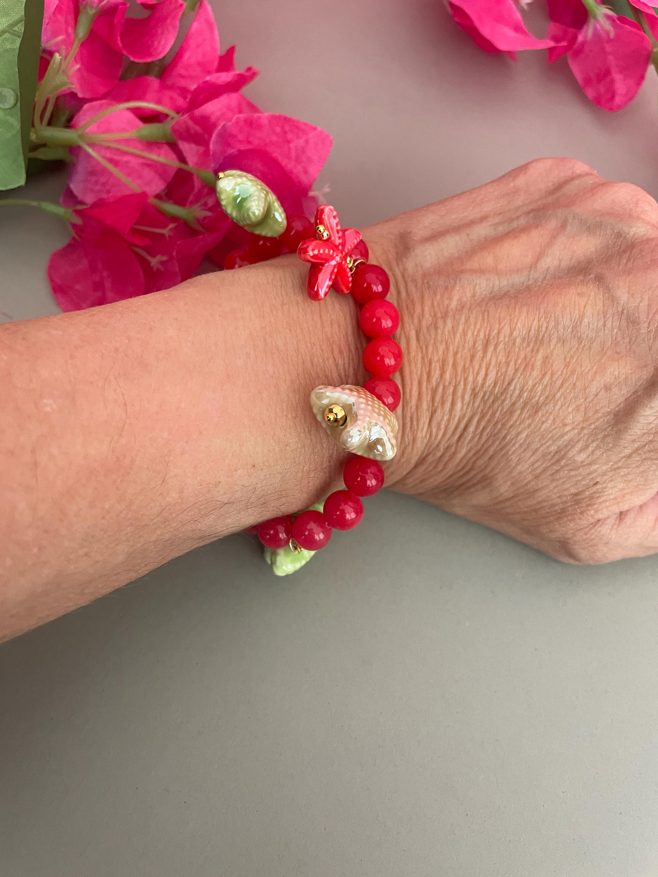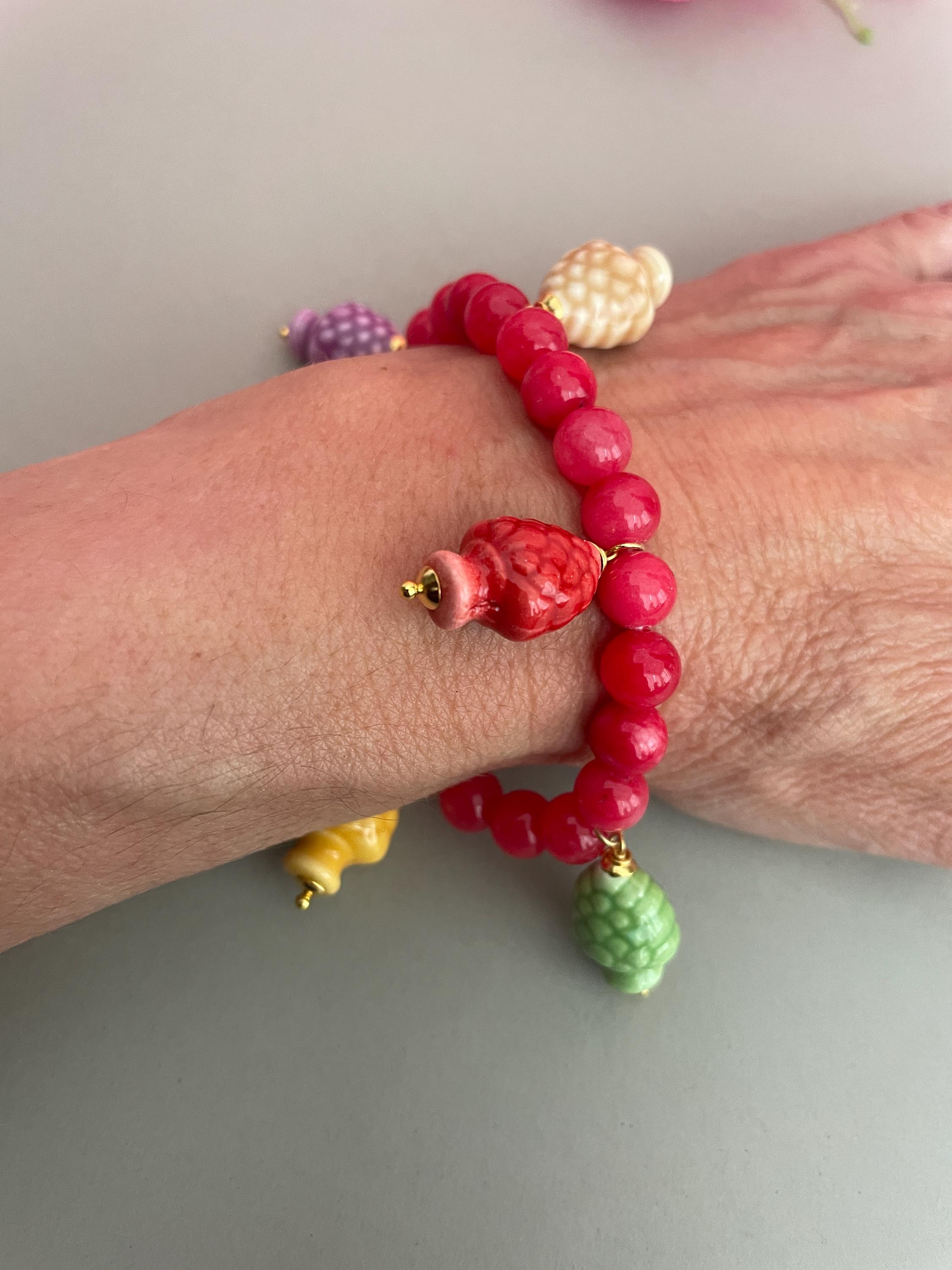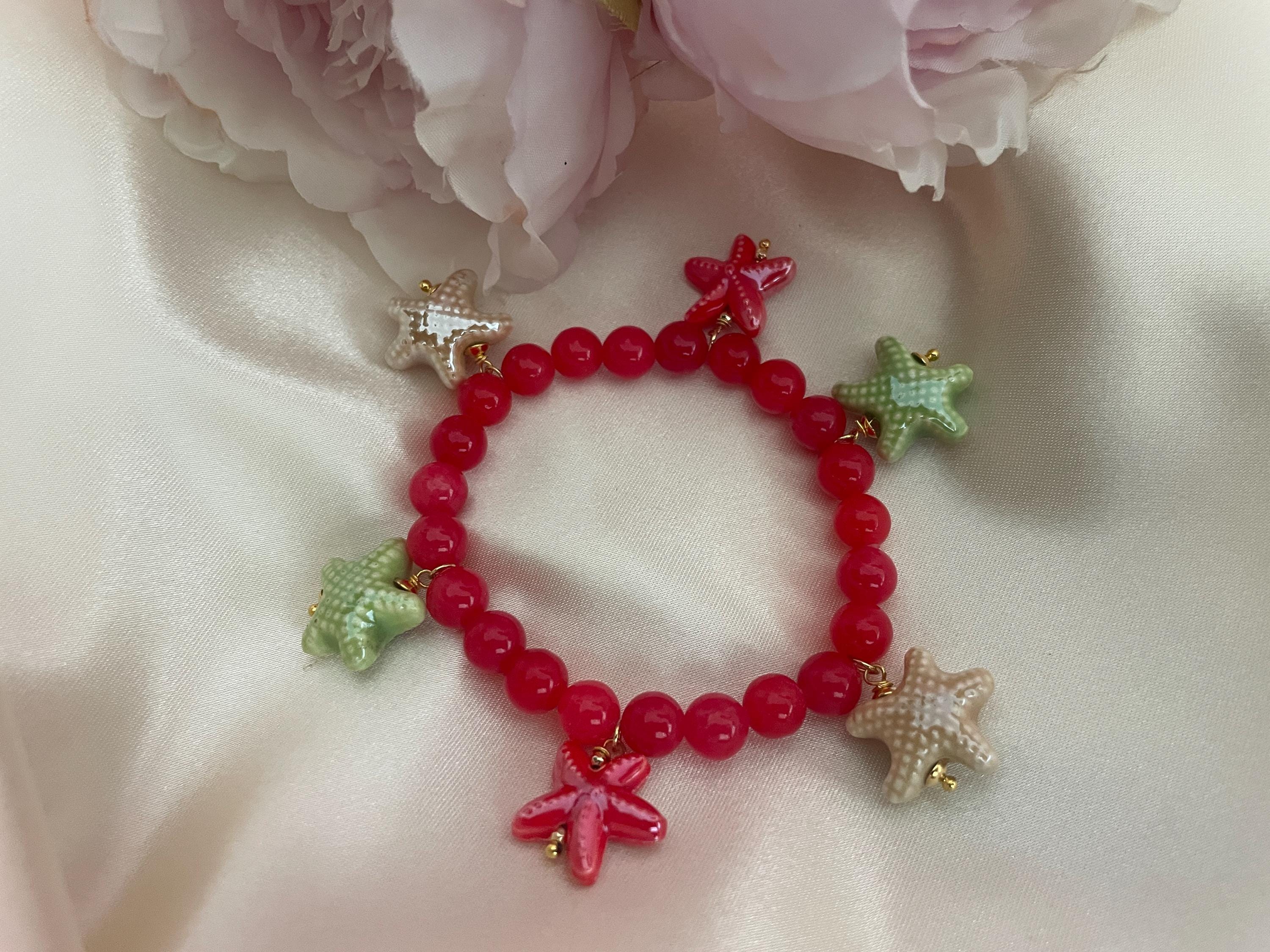 Si tratta di un bracciale elastico realizzato con perle di Giada Rosa.