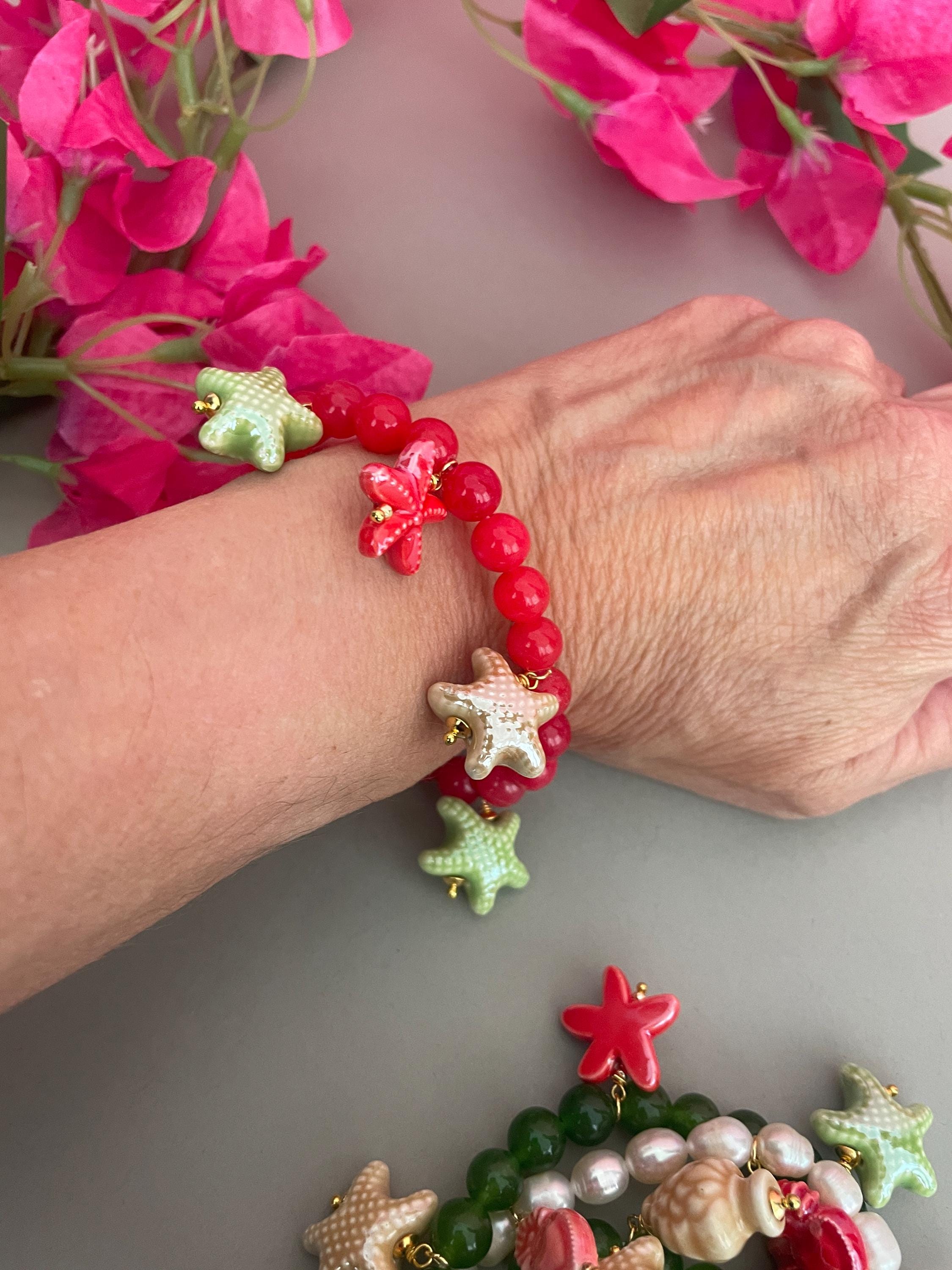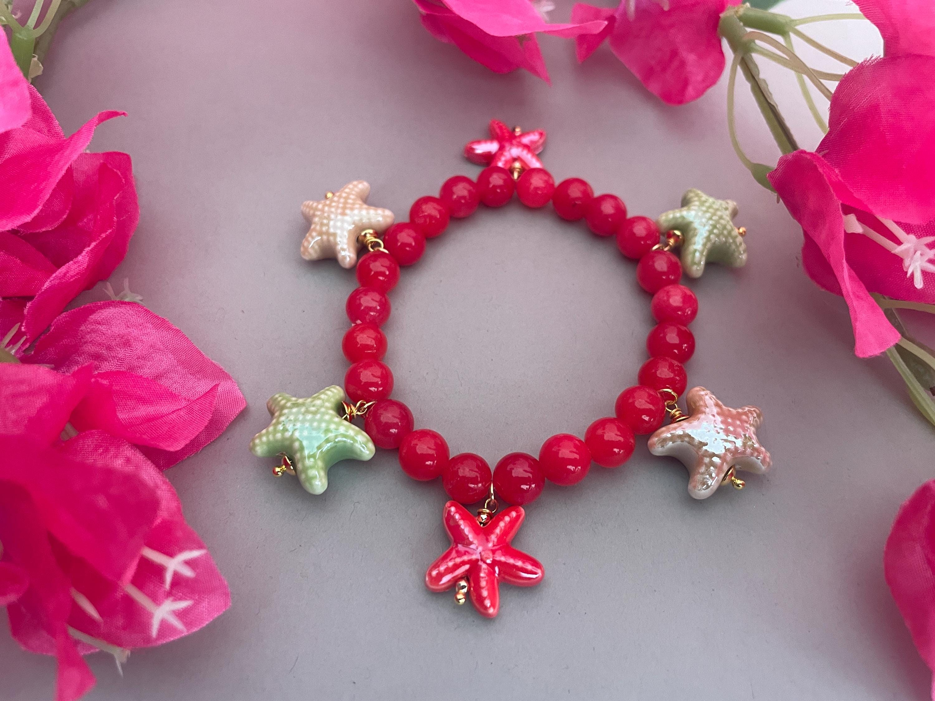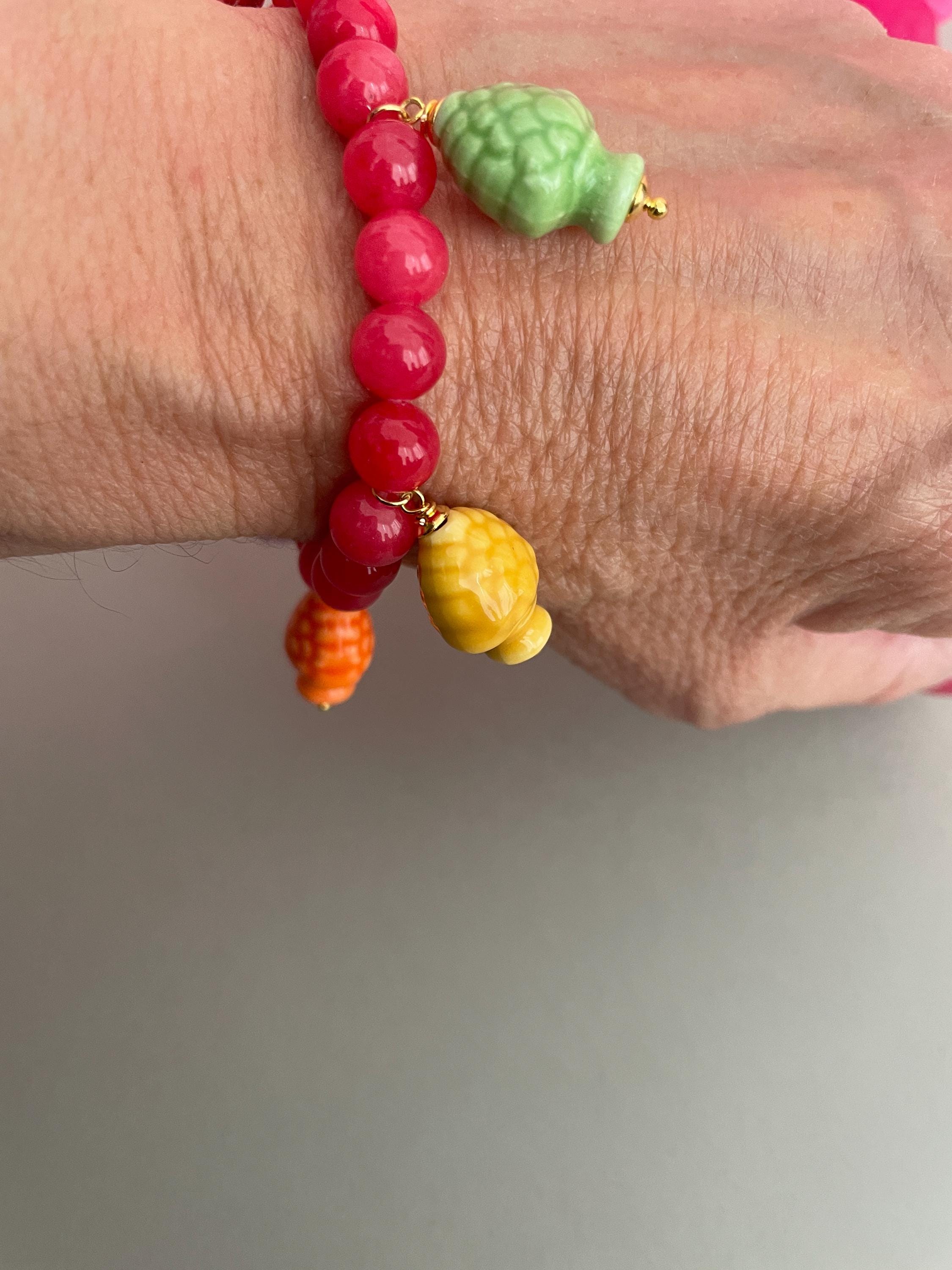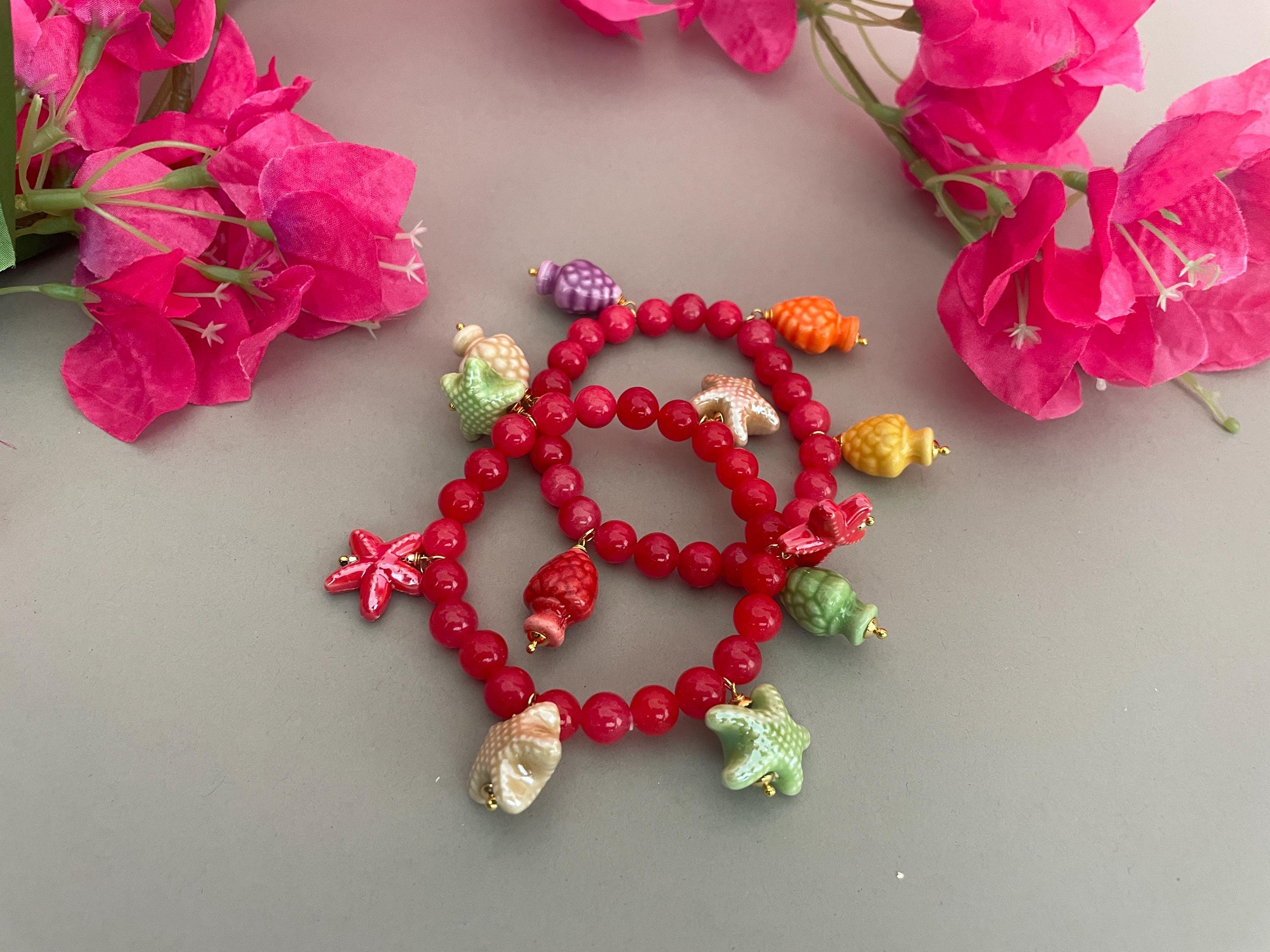 E’ arricchito da 6 charms assortiti in ceramica di Caltagirone, Pigne o Stelle, dipinti a mano.