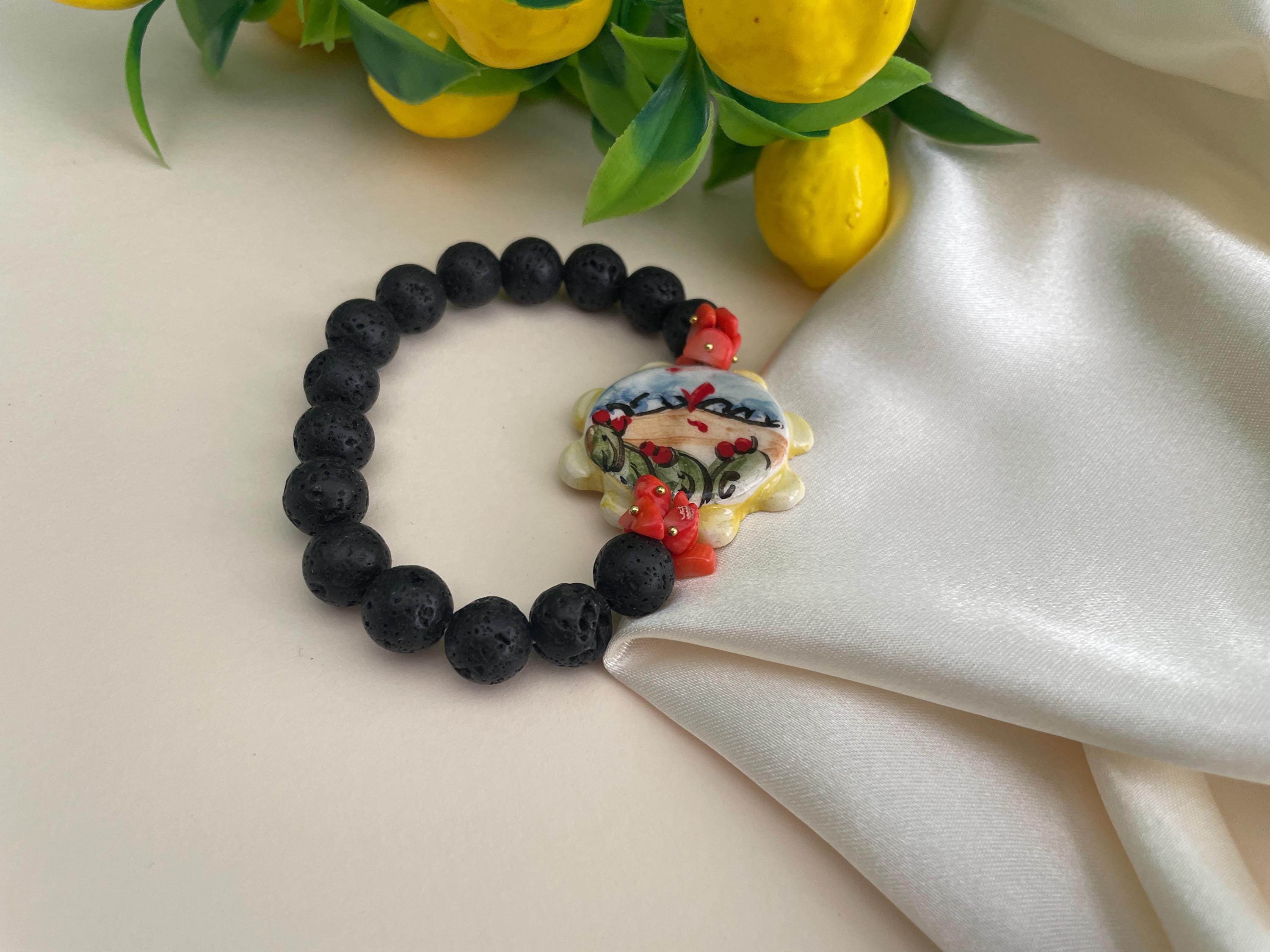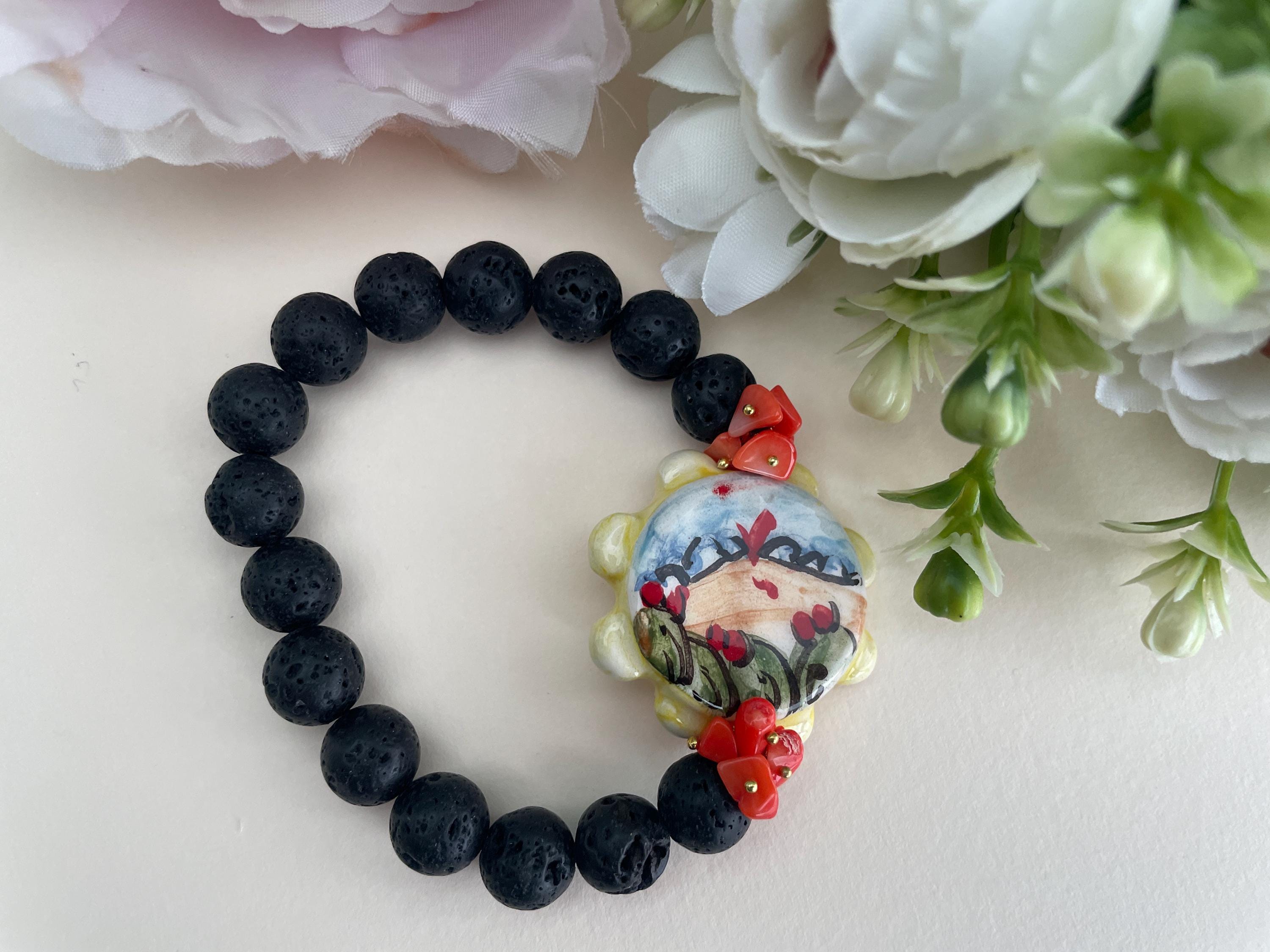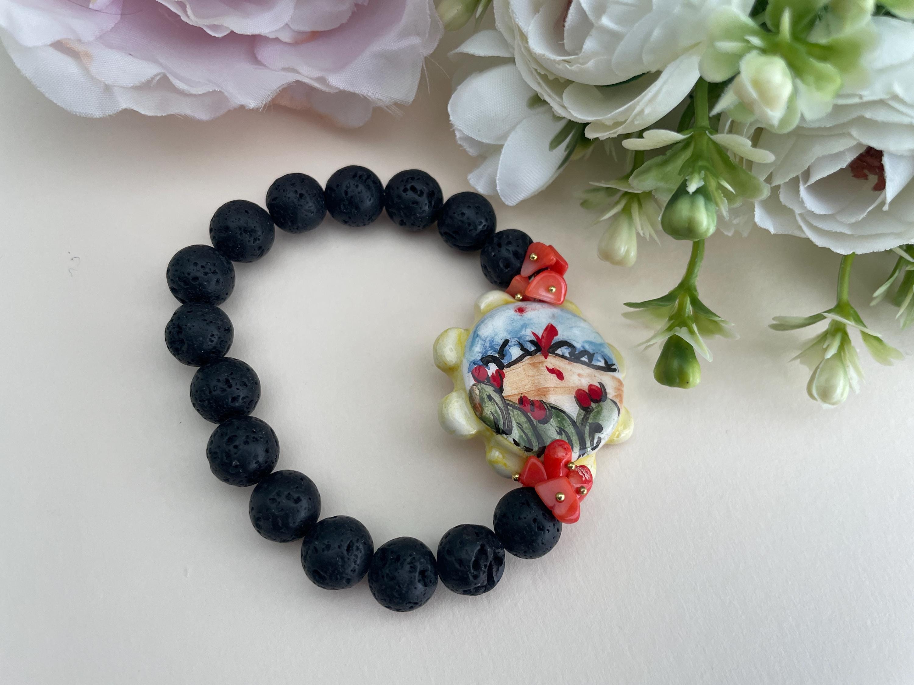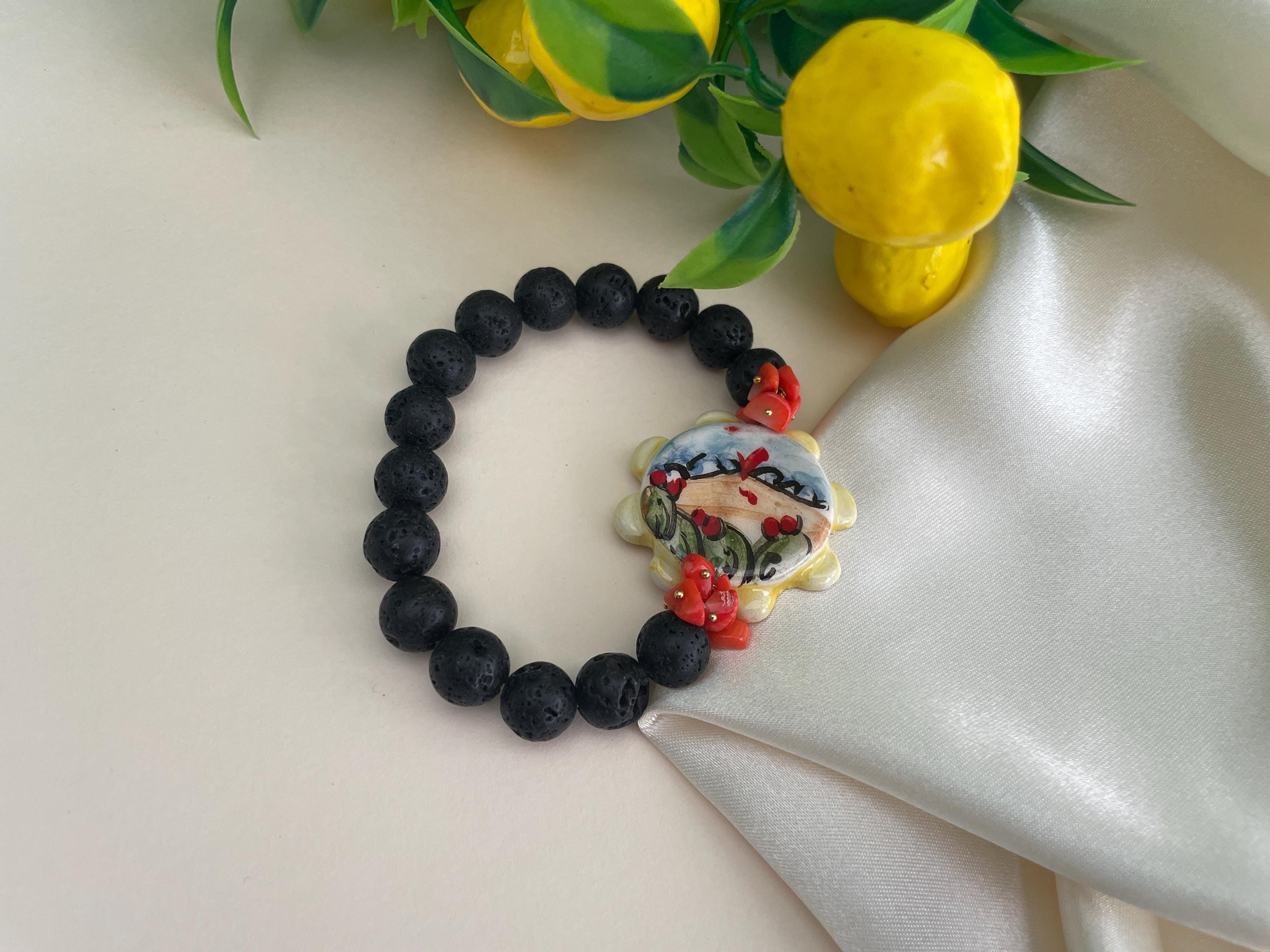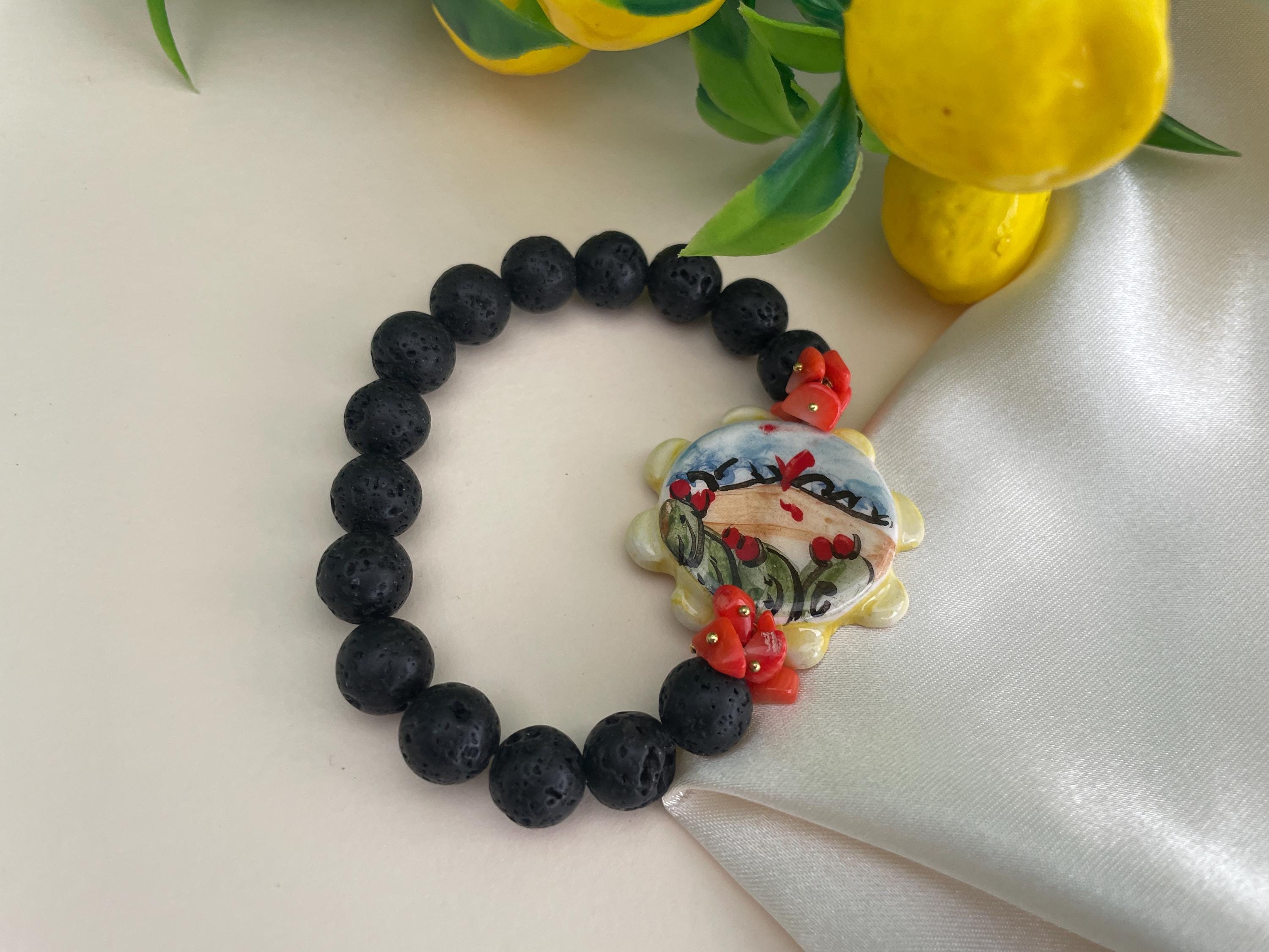 Realizzato con perle di pietra lavica dell’Etna e un Tamburello di ceramica di Caltagirone dipinto a mano con motivi tipici della maiolica siciliana.