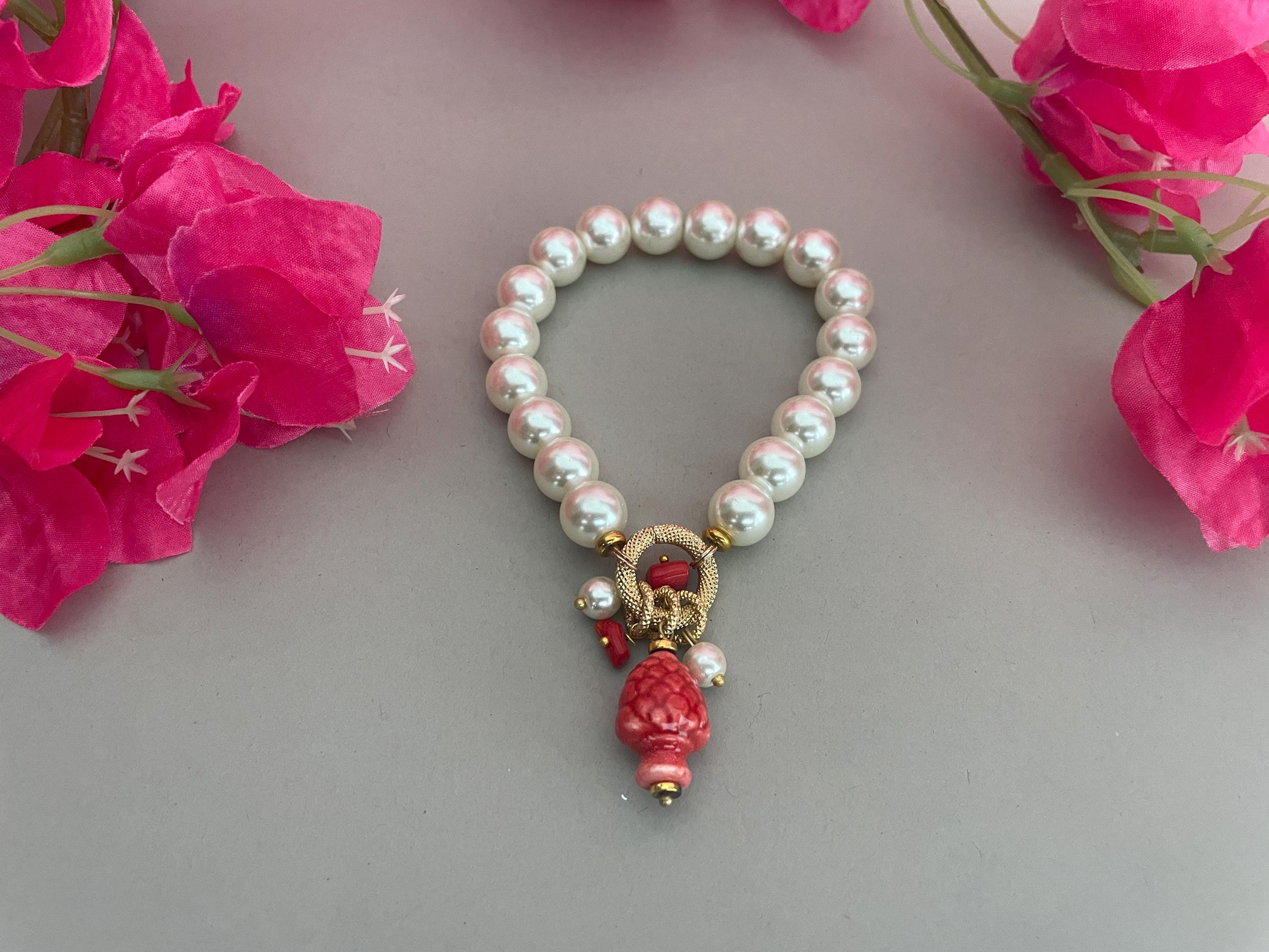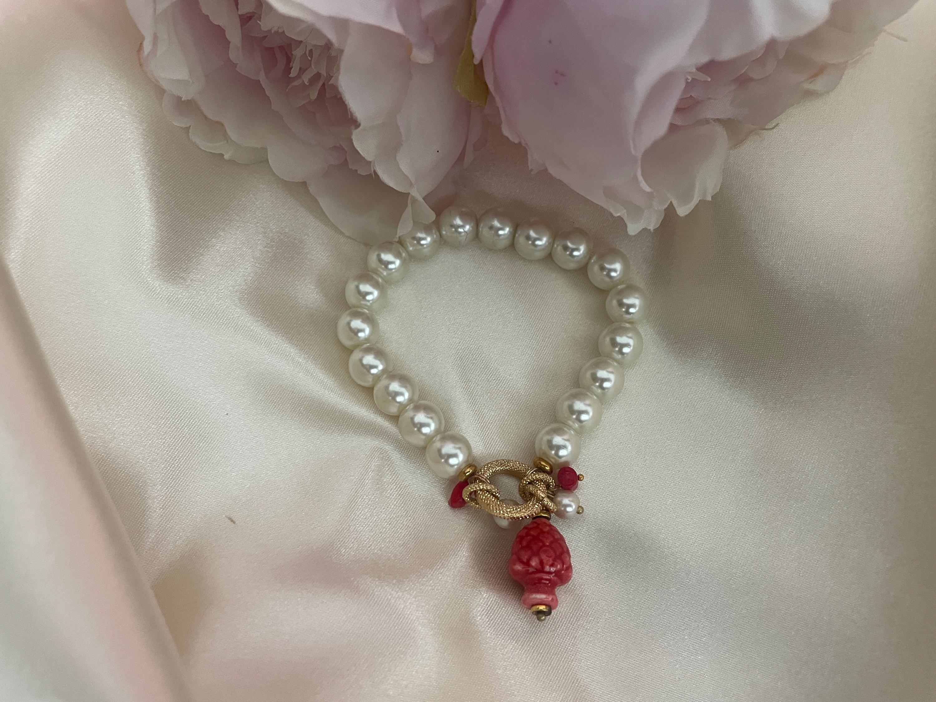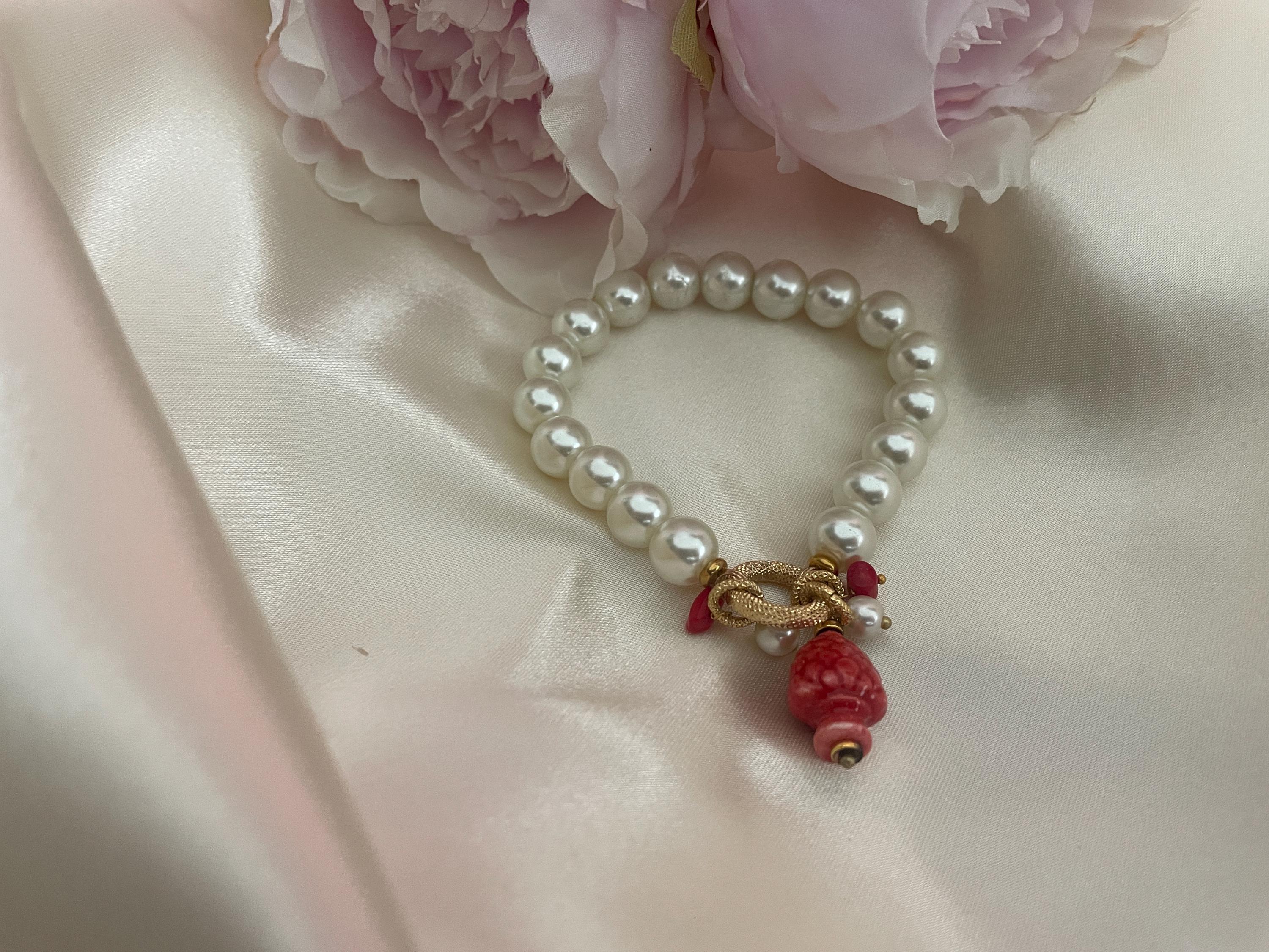 Composto da un giro di grandi boules di perle Maiorca, da cui pendono una Pigna di ceramica di Caltagirone, perle di fiume e chips di Corallo Bambou.