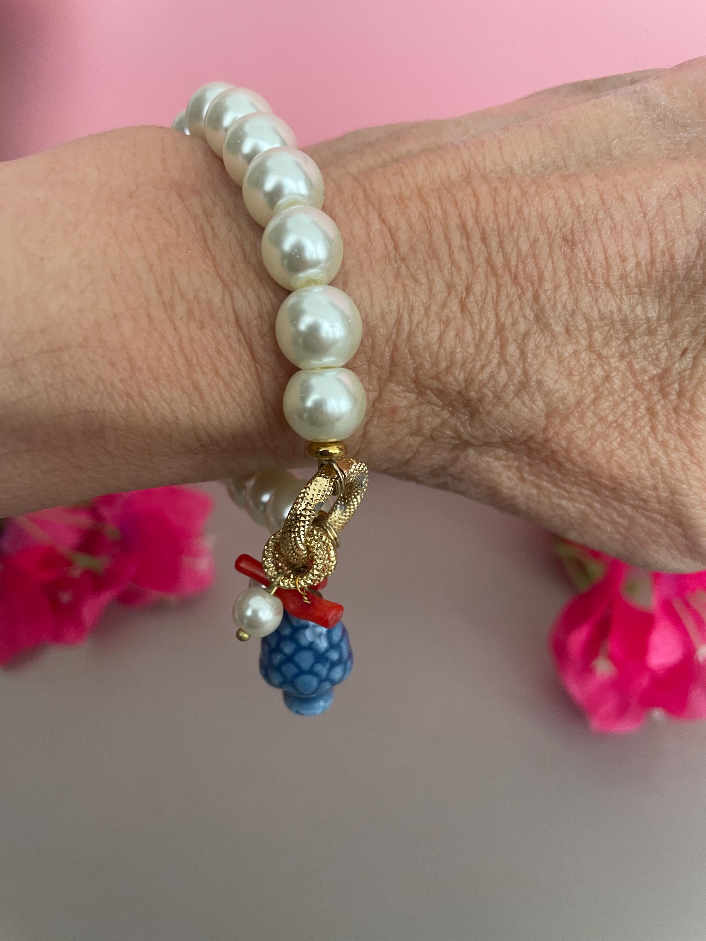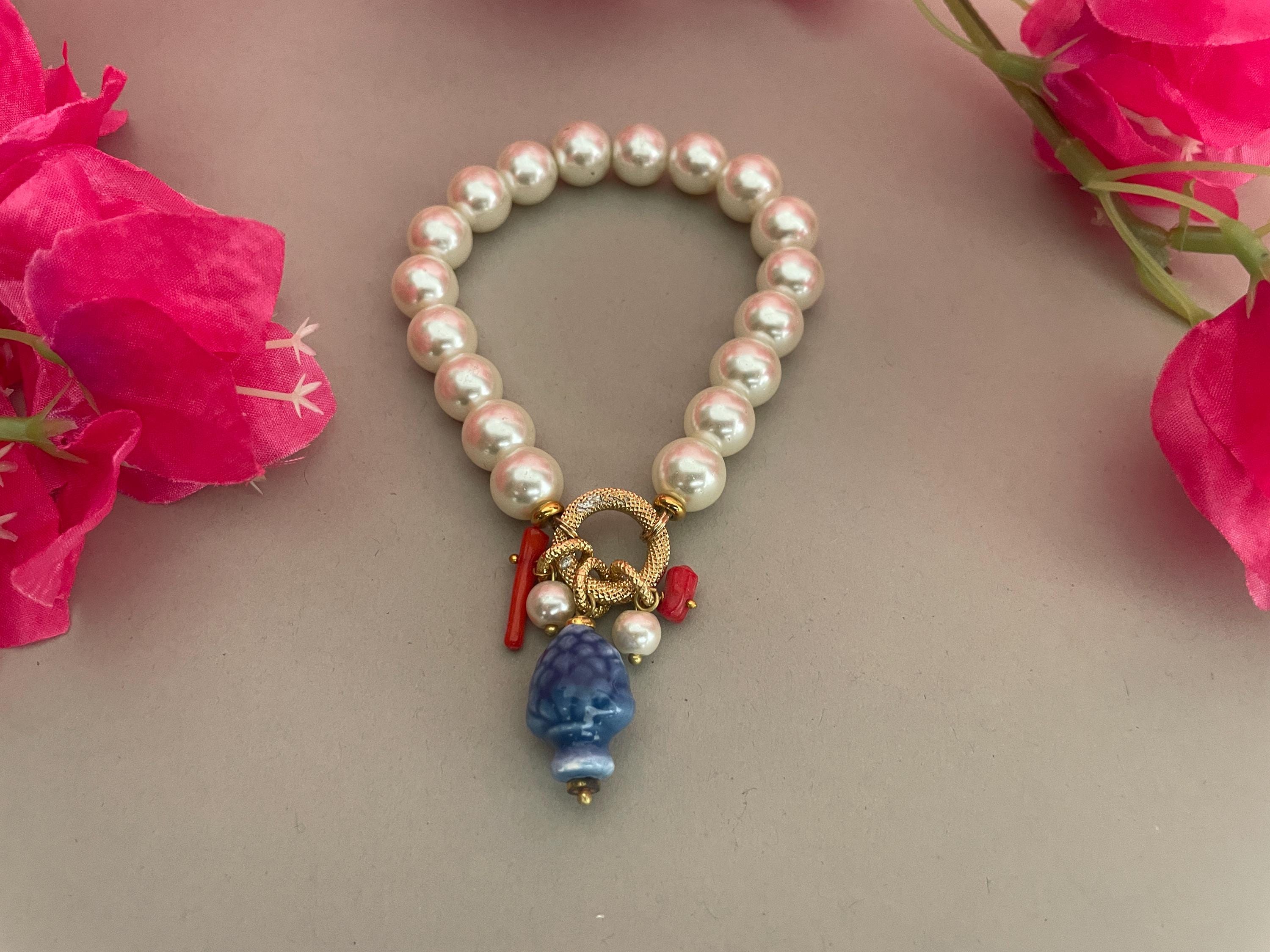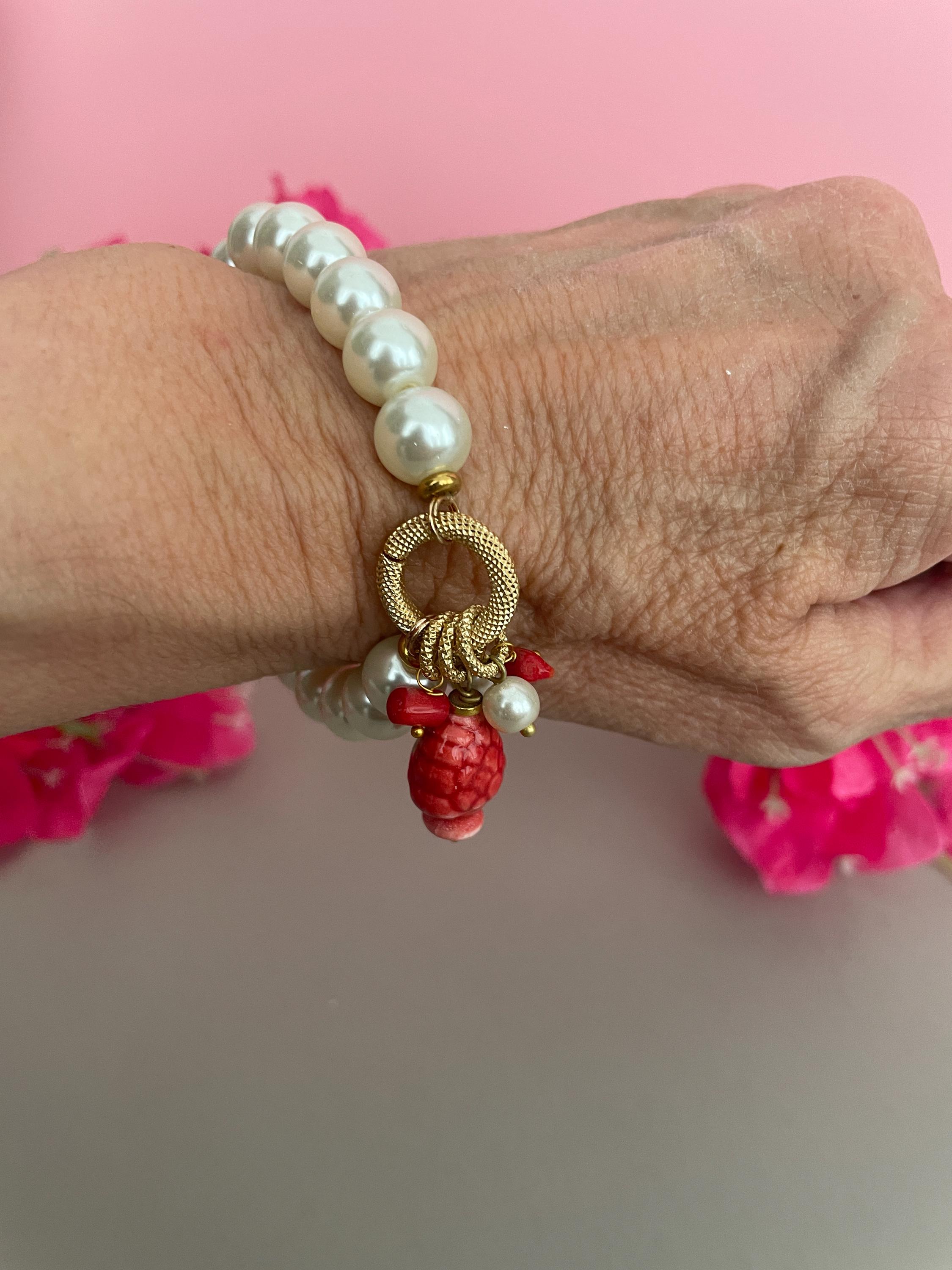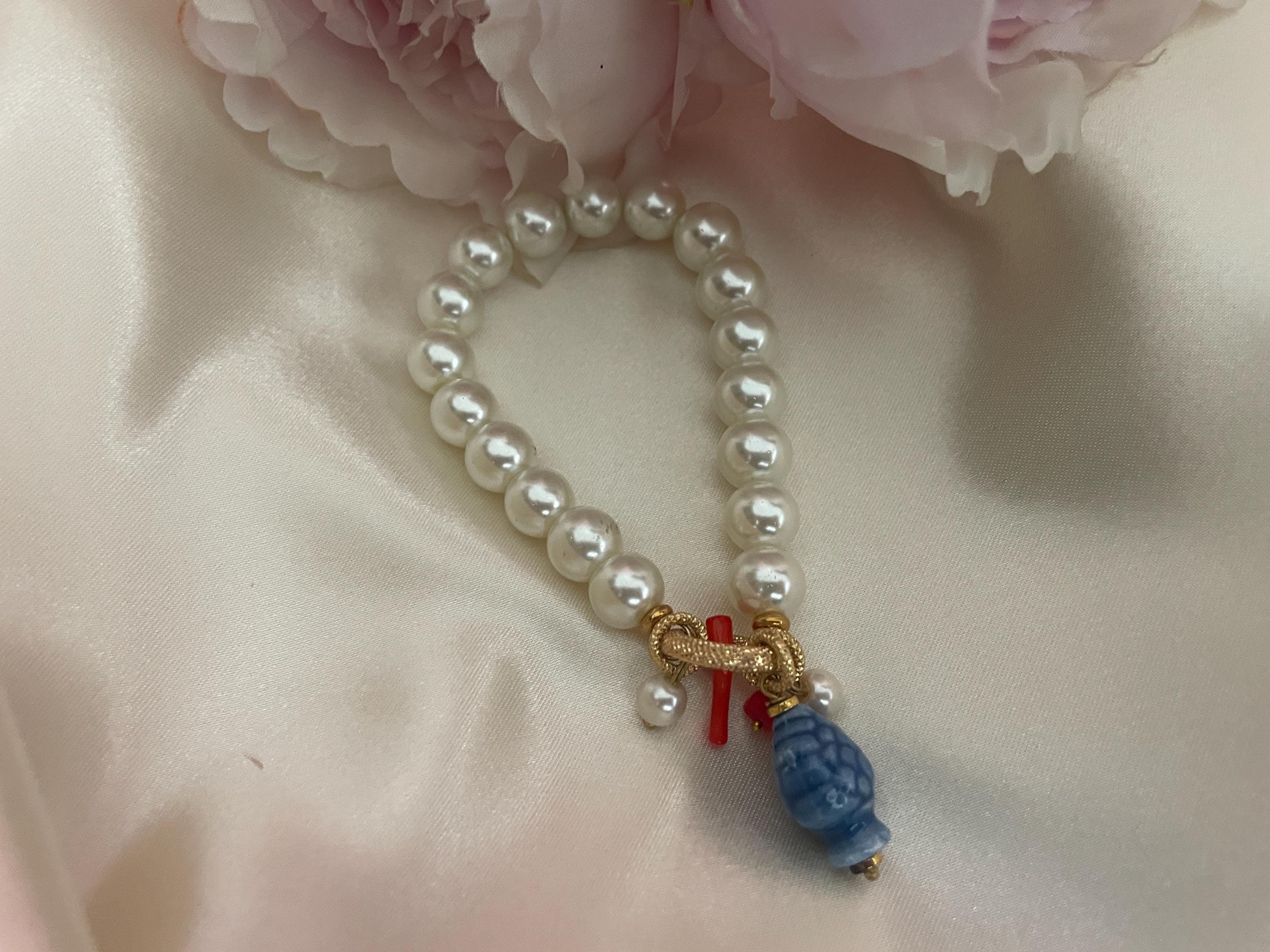 Composto da un giro di grandi boules di perle Maiorca, da cui pendono una Pigna di ceramica di Caltagirone, perle di fiume e chips di Corallo Bambou.