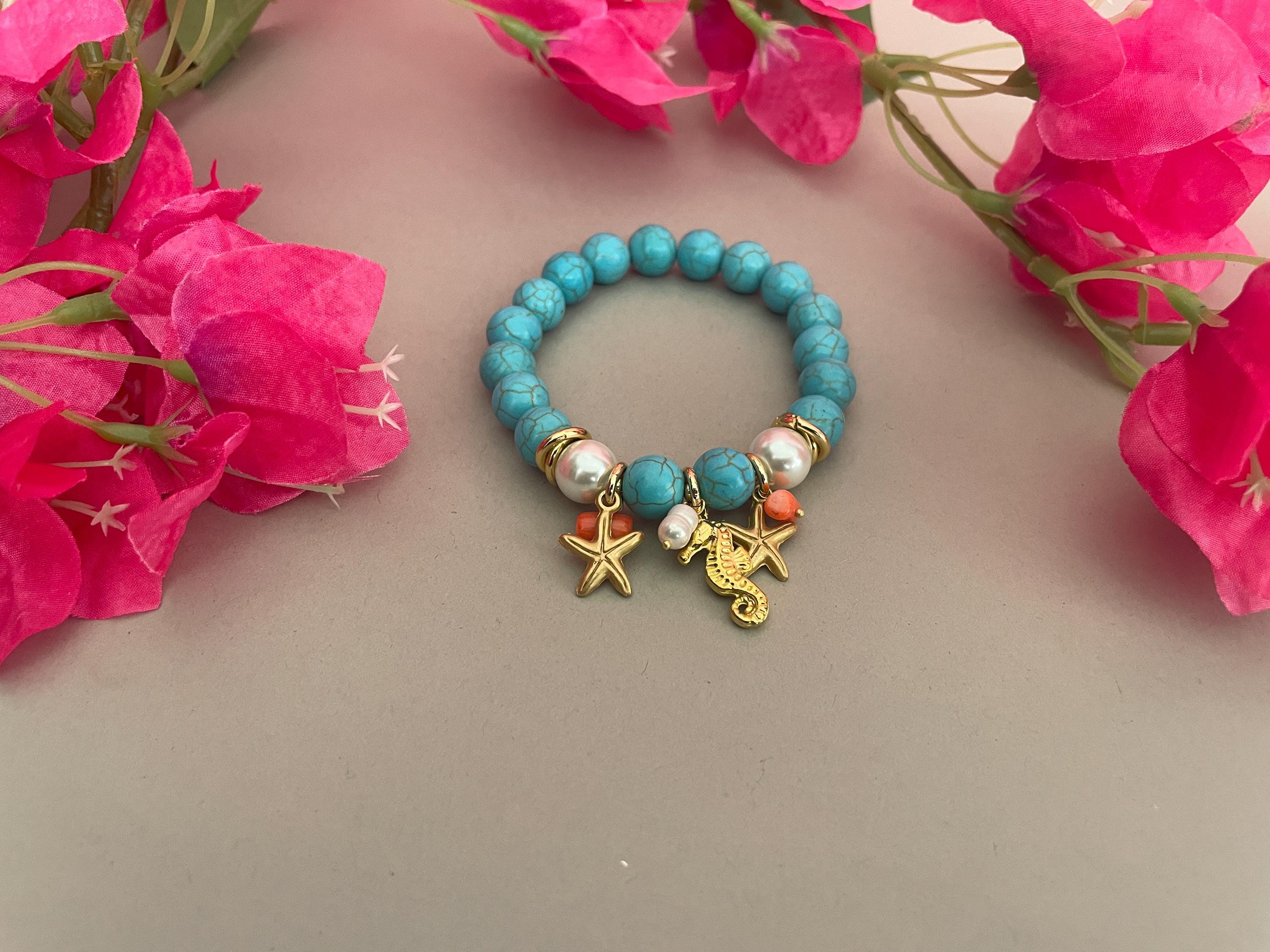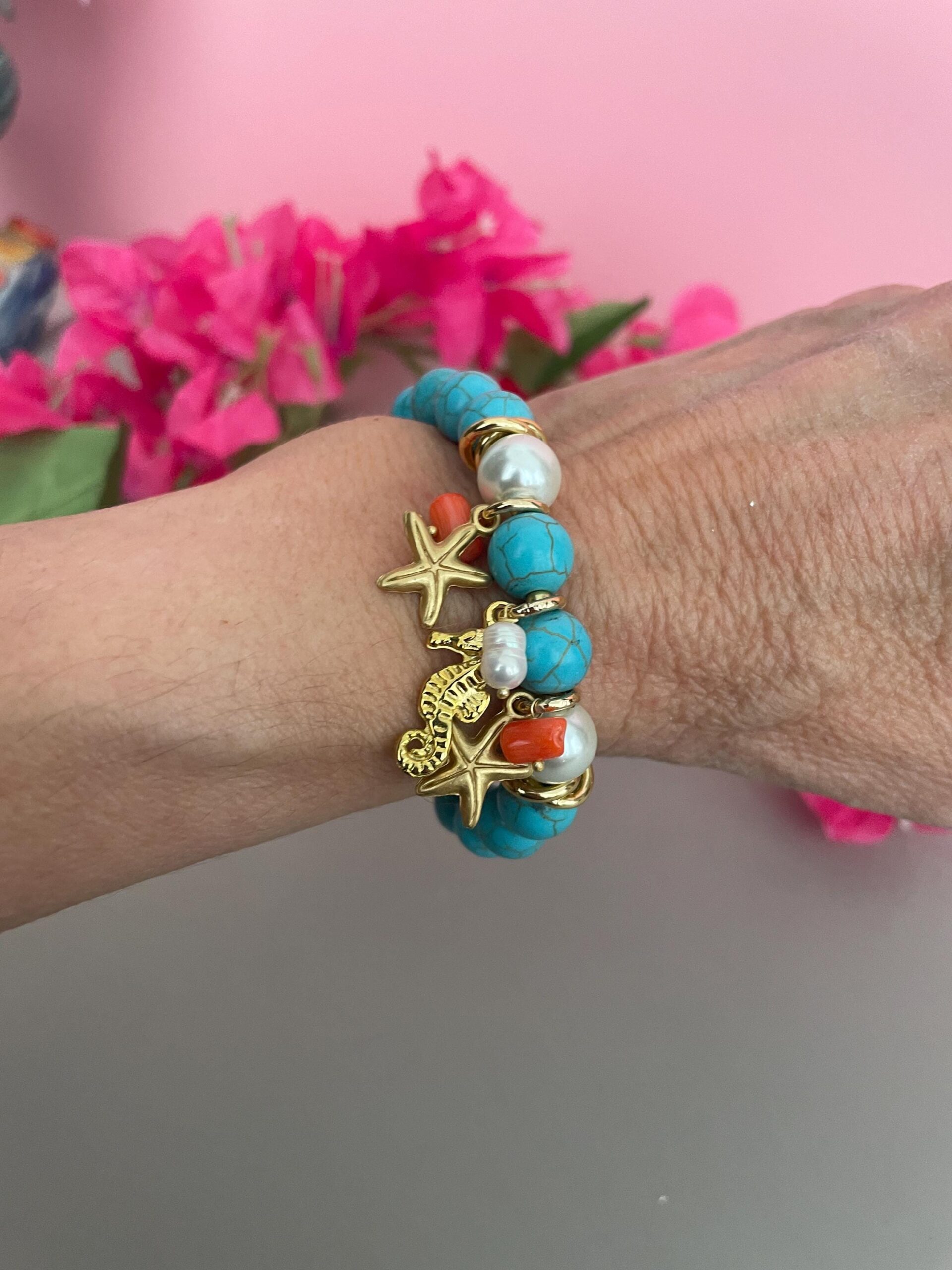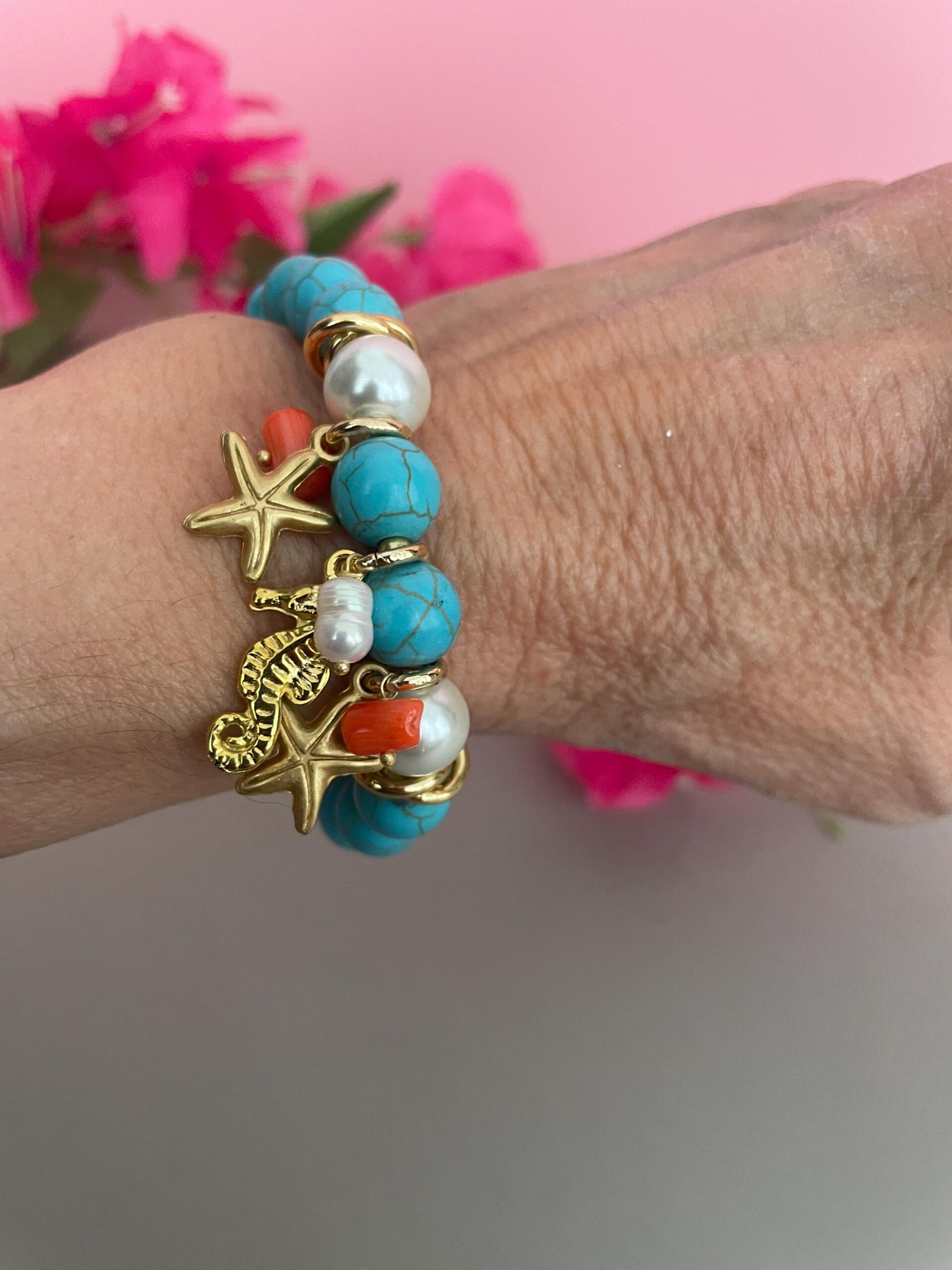 Composto da grandi boules di pasta di turchese, due perle Maiorca, charms marini e chips di corallo bambou.