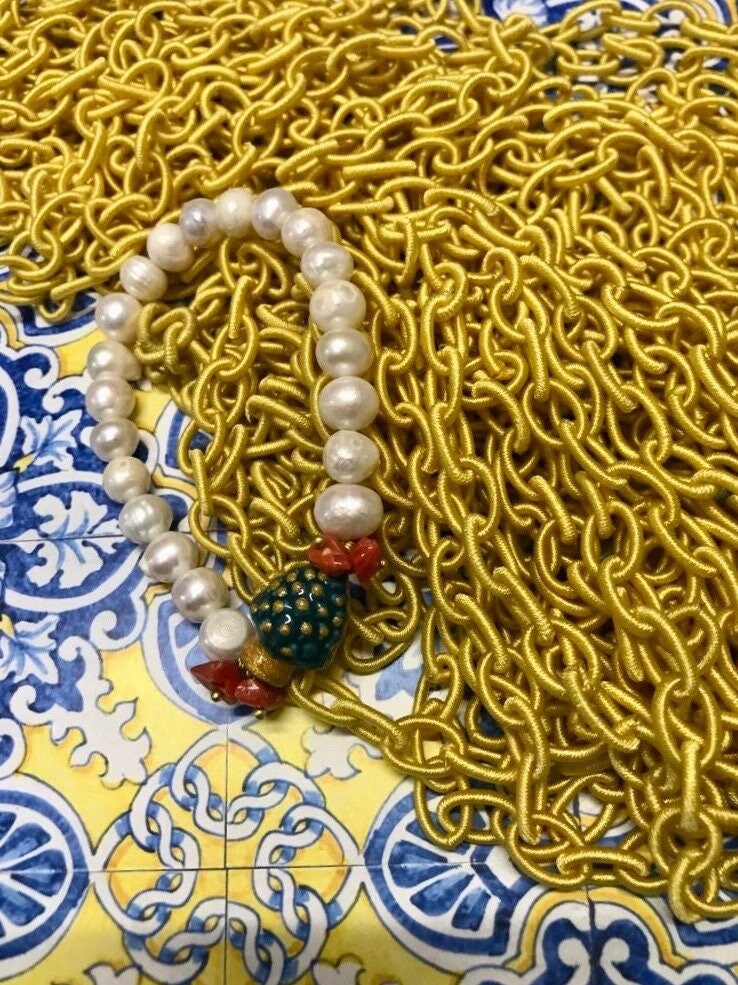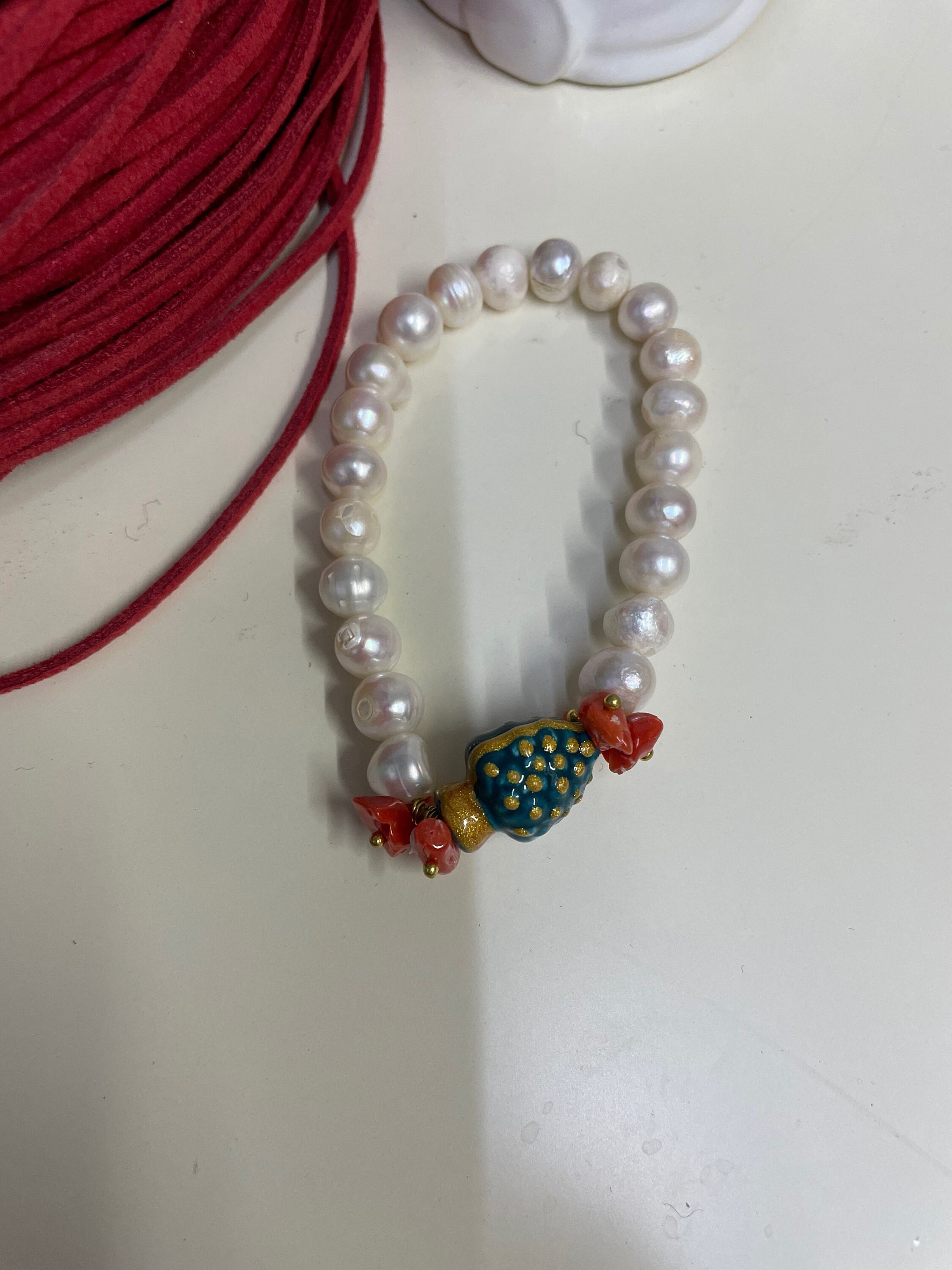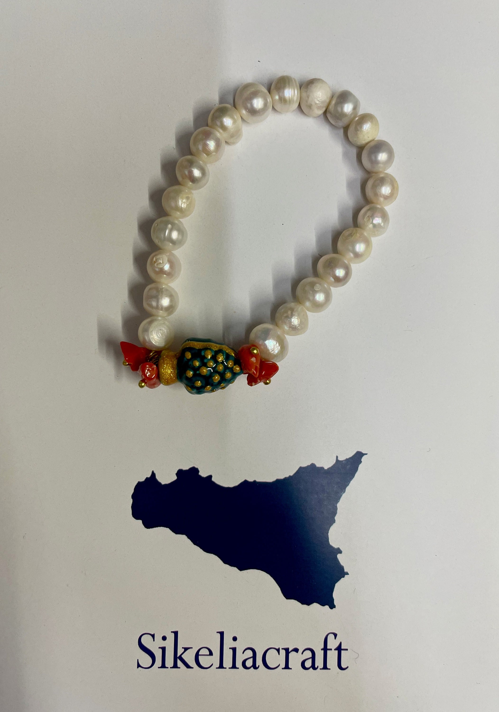 Realizzato con perle di fiume, Pigna in ceramica di Caltagirone dipinta a mano blu e oro e chips di corallo rosso.